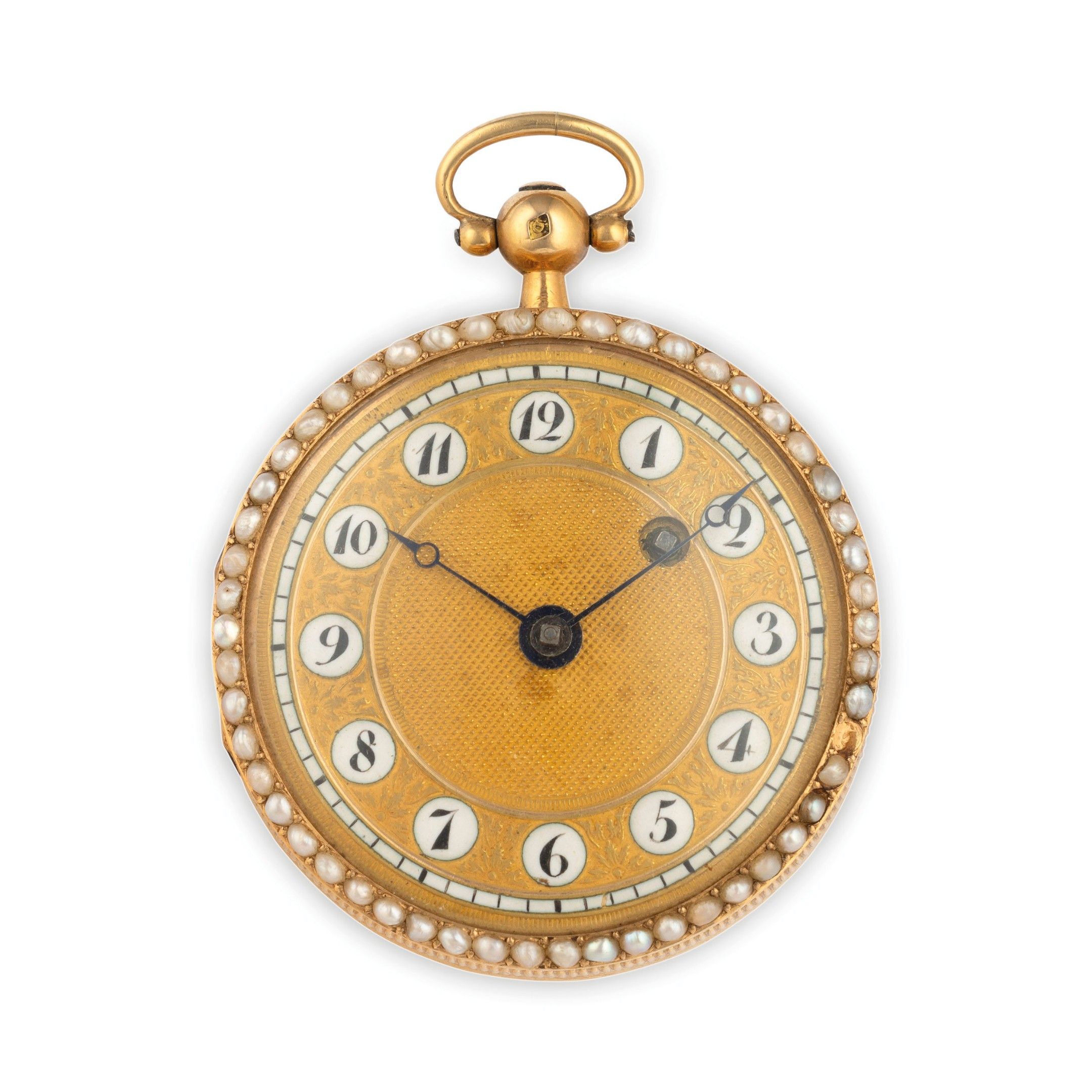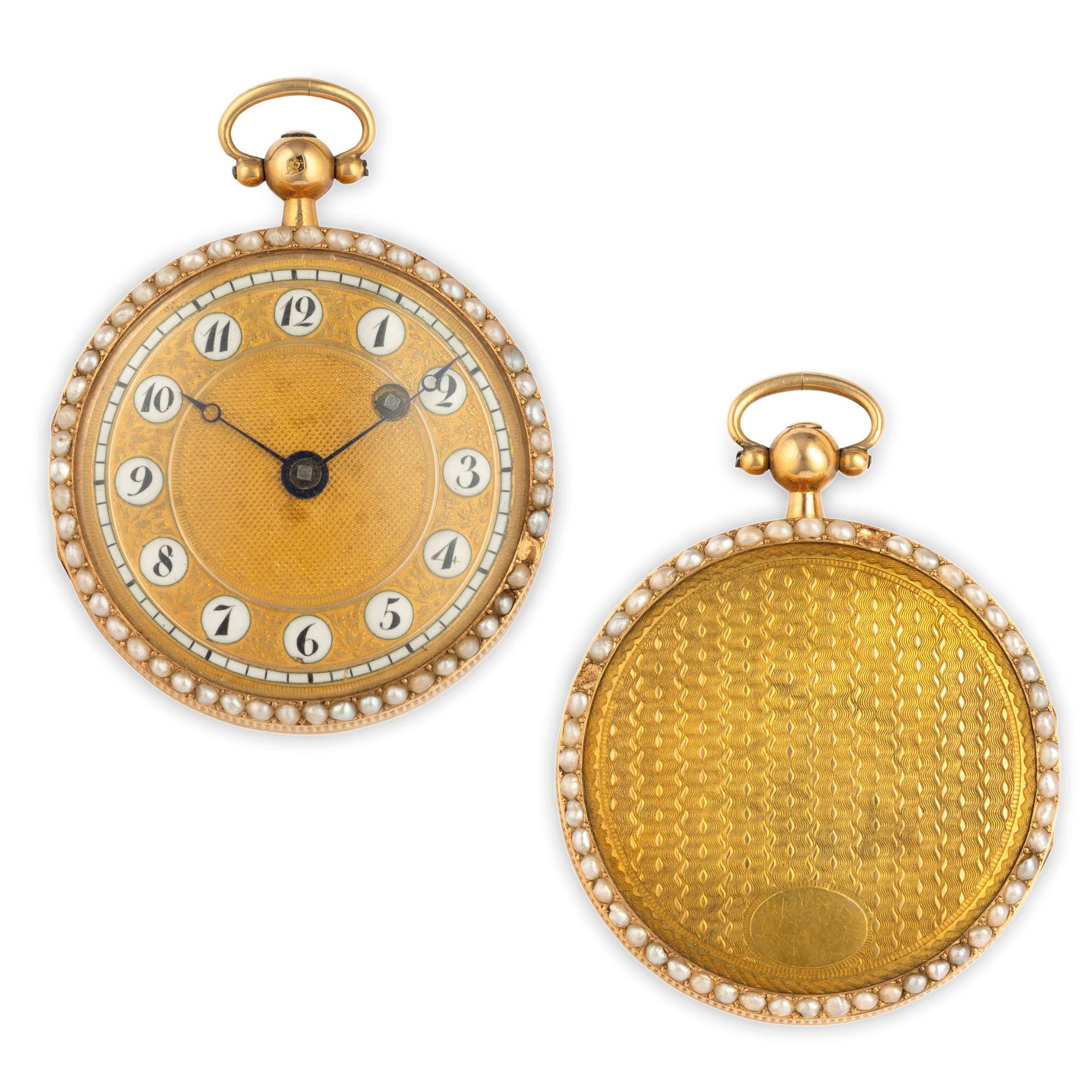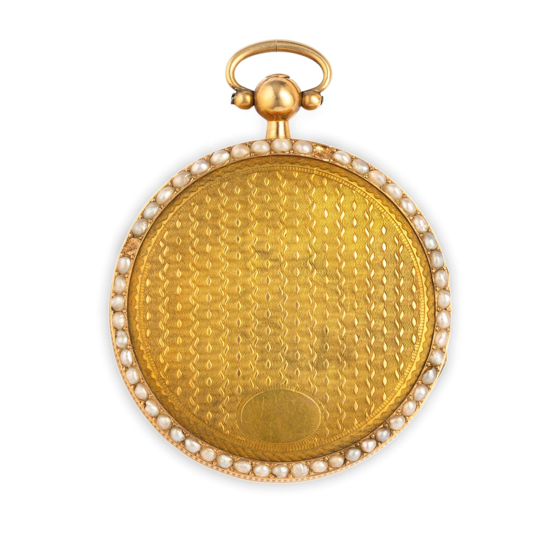 35 mm diameter yellow gold case, decorated on the front with a necklace of river micro-pearls (1 missing), dial in tapisserie yellow gold, with enamel cartouches with Arabic numerals, Breguet-style hands, carrure decorated with parallel-pencil motif, case back with fabric decoration, with belt of river micro-pearls (2 missing). Movement with verge escapement, signed. Watch with 19th century case and winding key. Watch currently running. Weight 28.4 g.