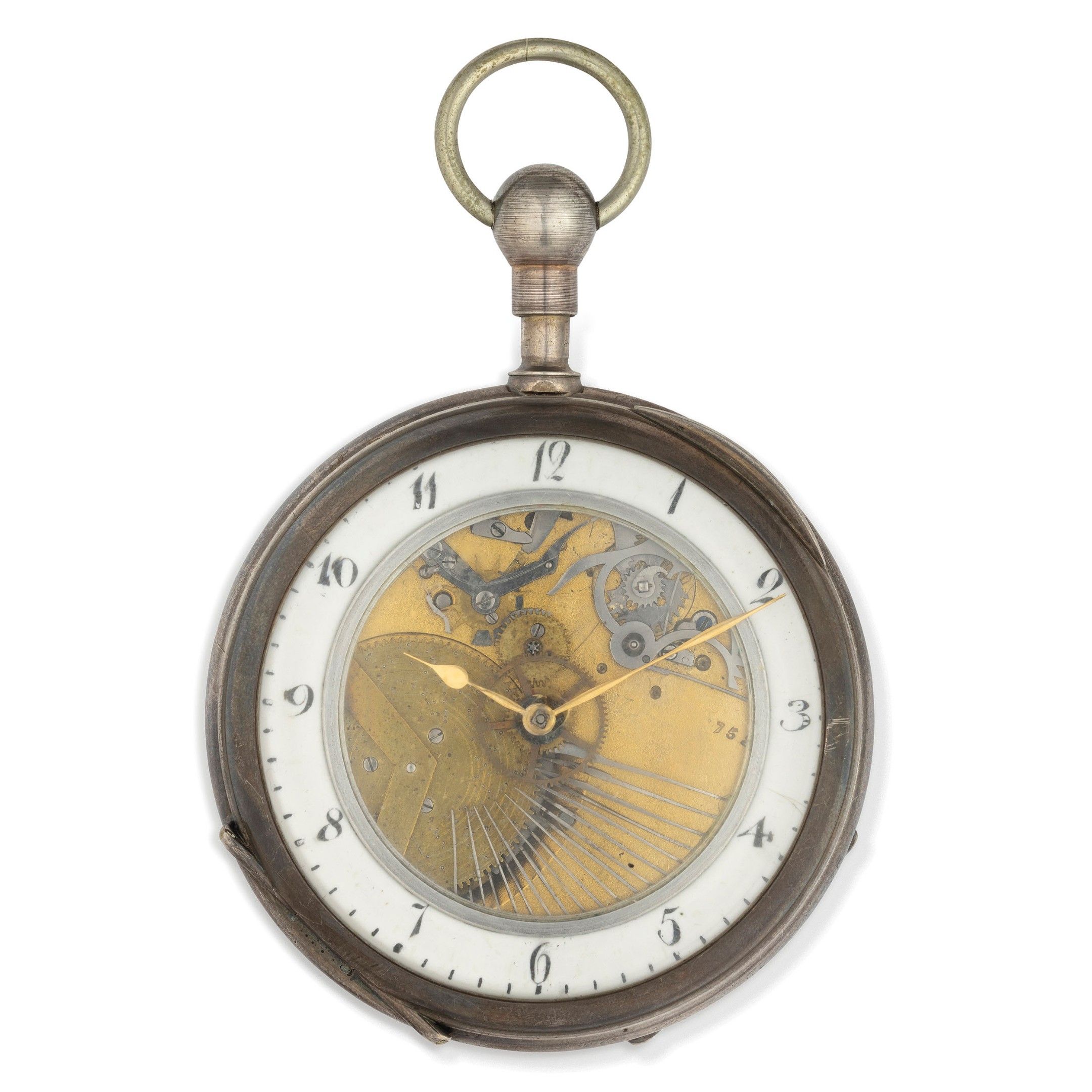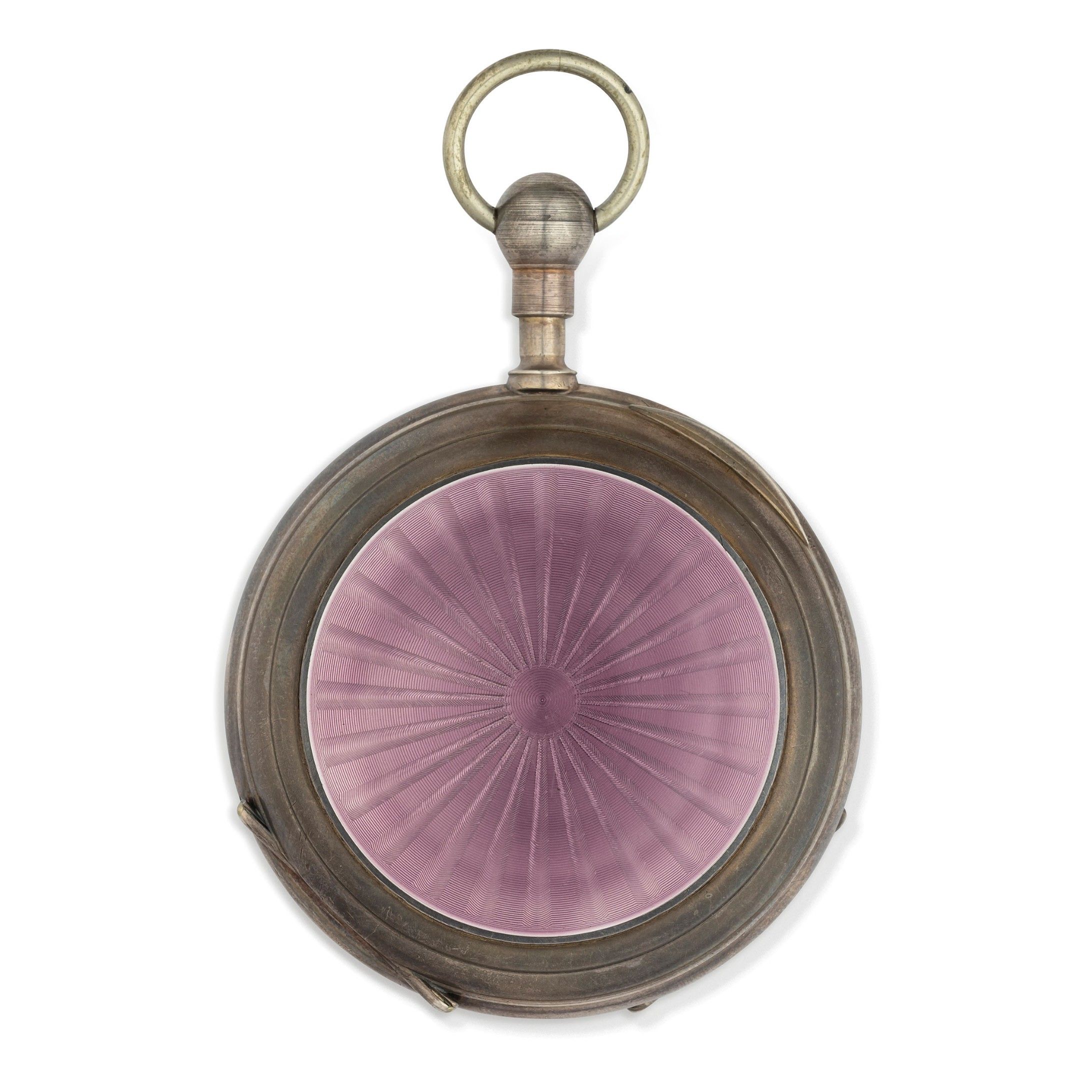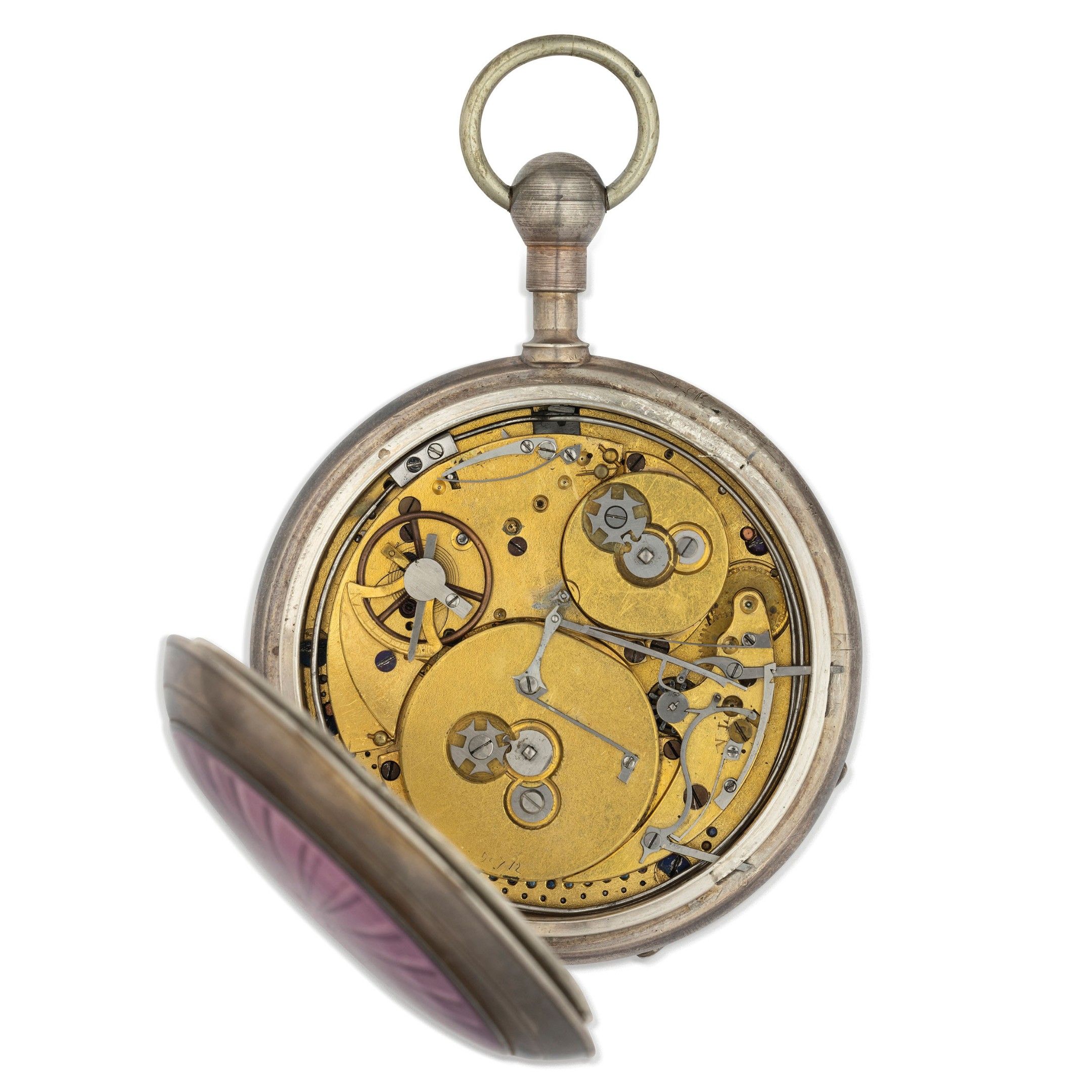 Silver case, 64 mm in diameter, white enamel band dial with Arabic numerals, glazed centre allowing the carillon to be seen, yellow gold pear-shaped hands, guilloché soleil case back with translucent violet enamel, important gilt movement with two barrels, with hour and quarter chime on gong, and rotating carillon with blades visible on the front. Watch currently in working order, winding key present.