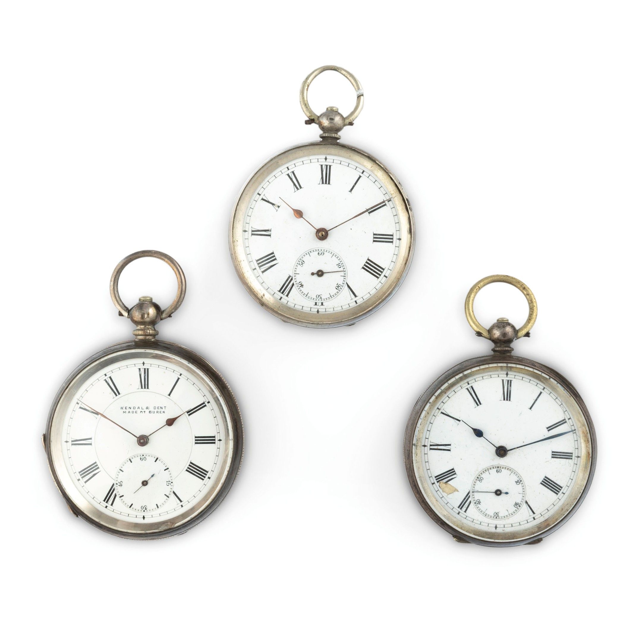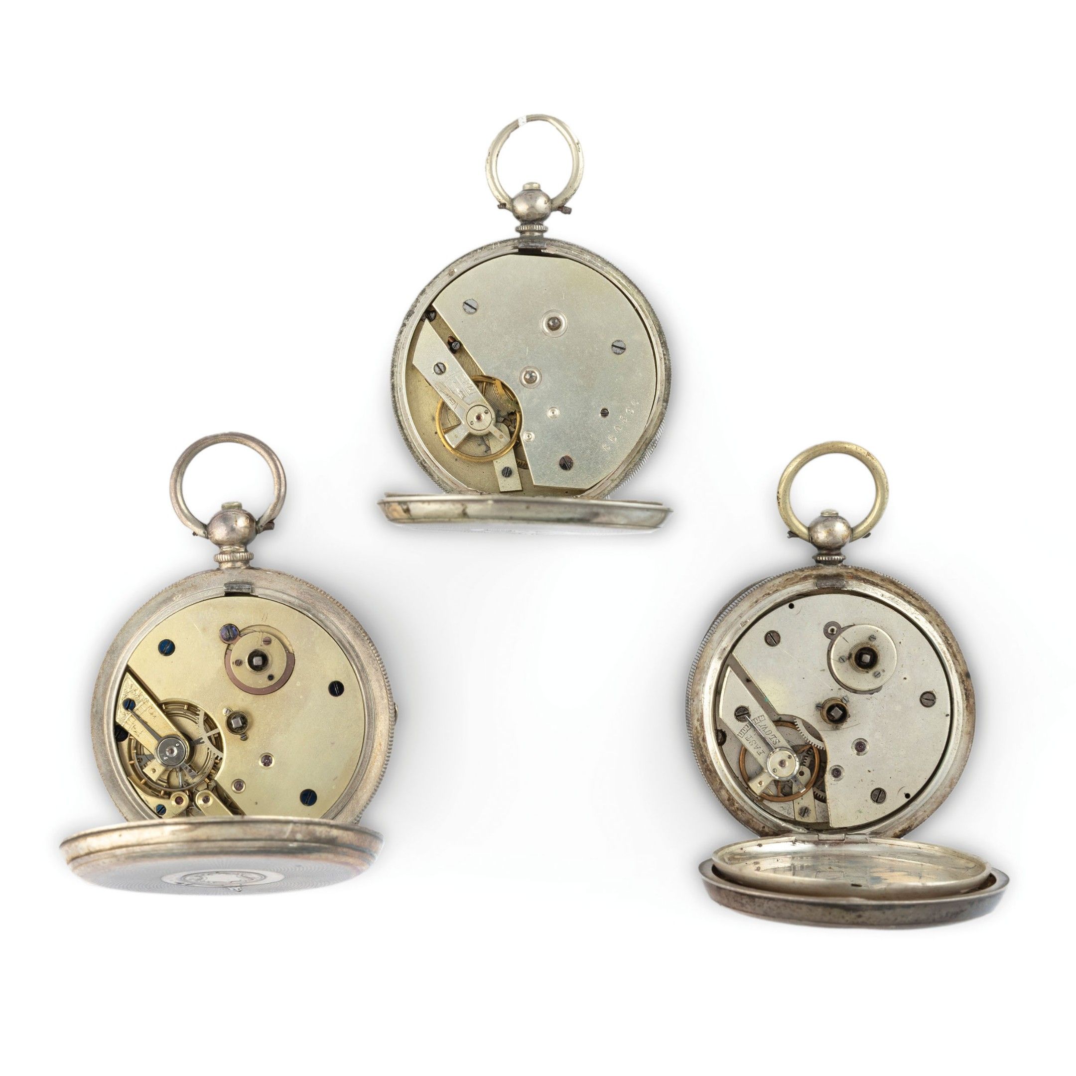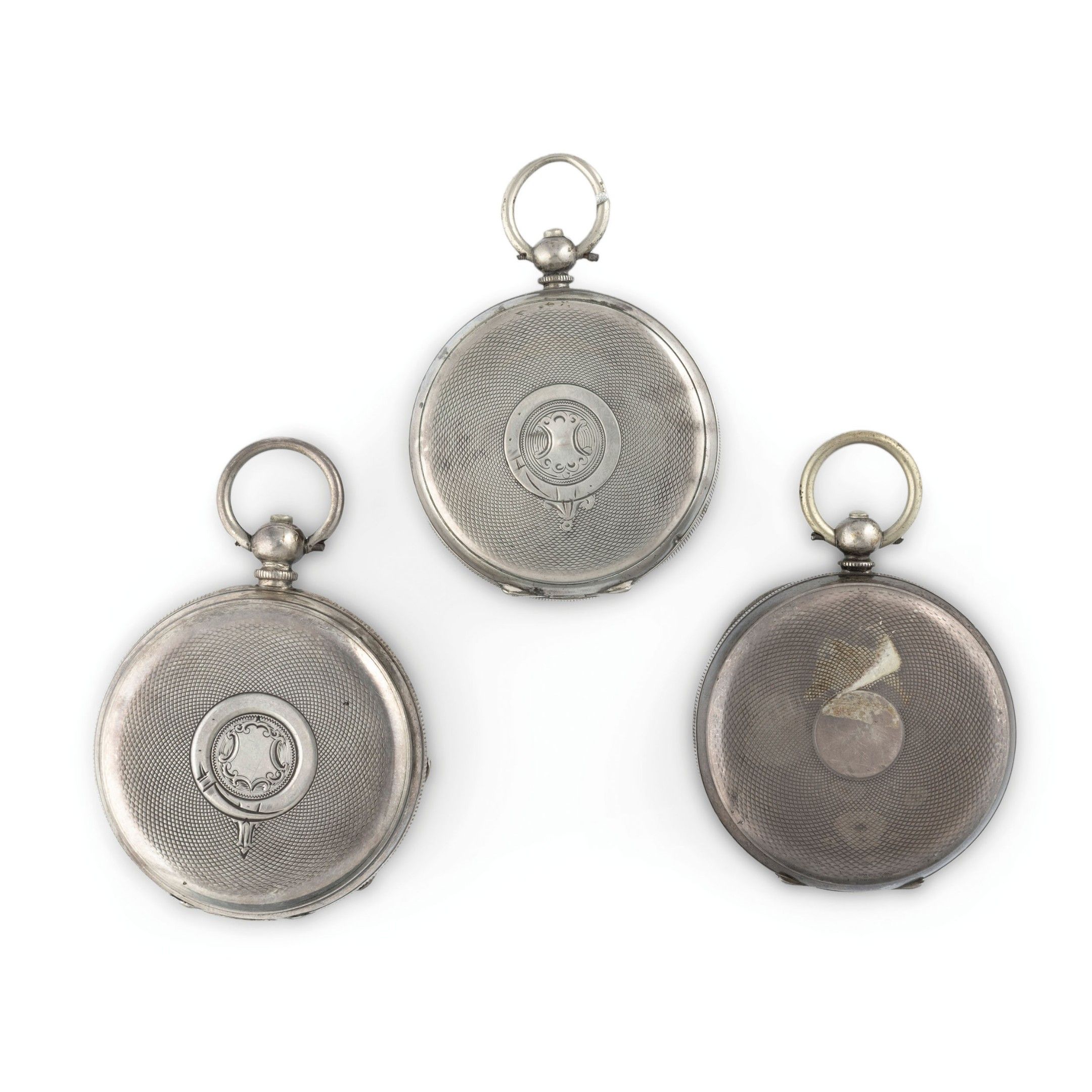 lot consisting of three pocket watches, silver cases diameter 50-50-52 mm, white enamel dials with Roman numerals. Movements with English anchor escapement. Case backs can be opened by means of a button in the pendant. Watches currently in working order. Winding keys absent.