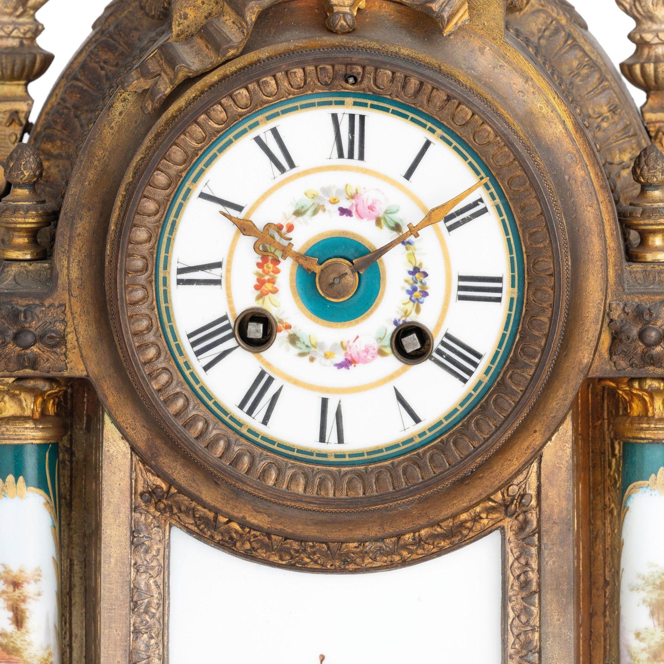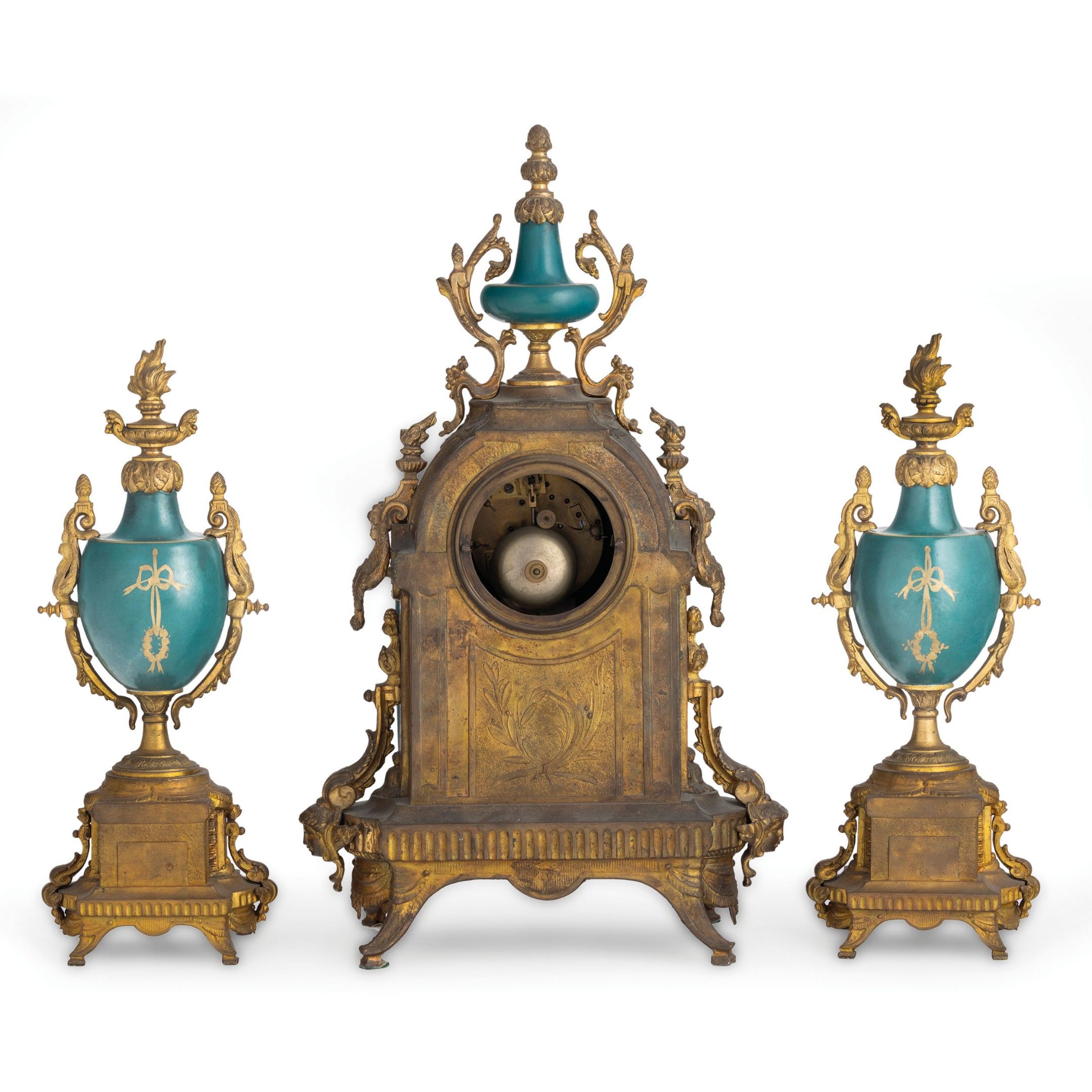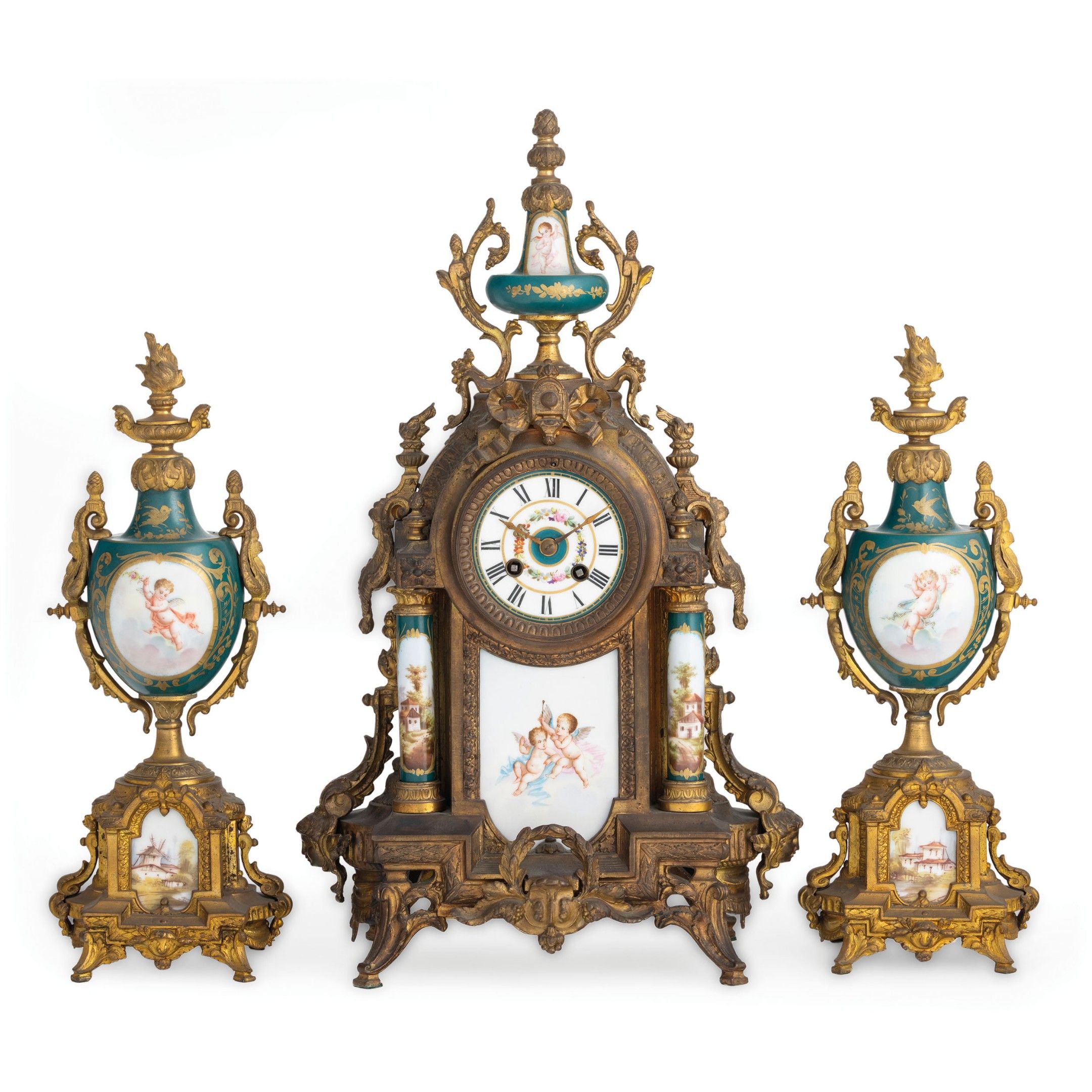 mantelpiece triptych composed of a large clock with gilt bronze frame, centred by a large polychrome painted porcelain plaque, on an emerald green background, at the sides two painted columns, depicting landscapes, painted porcelain dial, centred by a flowered garland, at the top decorates the clock a large green porcelain balsam bowl. Pendulum movement, with metal suspension, pendulum present, key absent, 15-day winding, hour and half-hour strike on bell, movement to be serviced. Accompanied by two large vase-shaped boxes in gilded bronze and painted green enamel. Dimensions; the clock: h. 51 cm, w. 30 cm, d. 15 cm, the cassolettes: h. 39 cm, w. 14 cm, d. 11 cm.