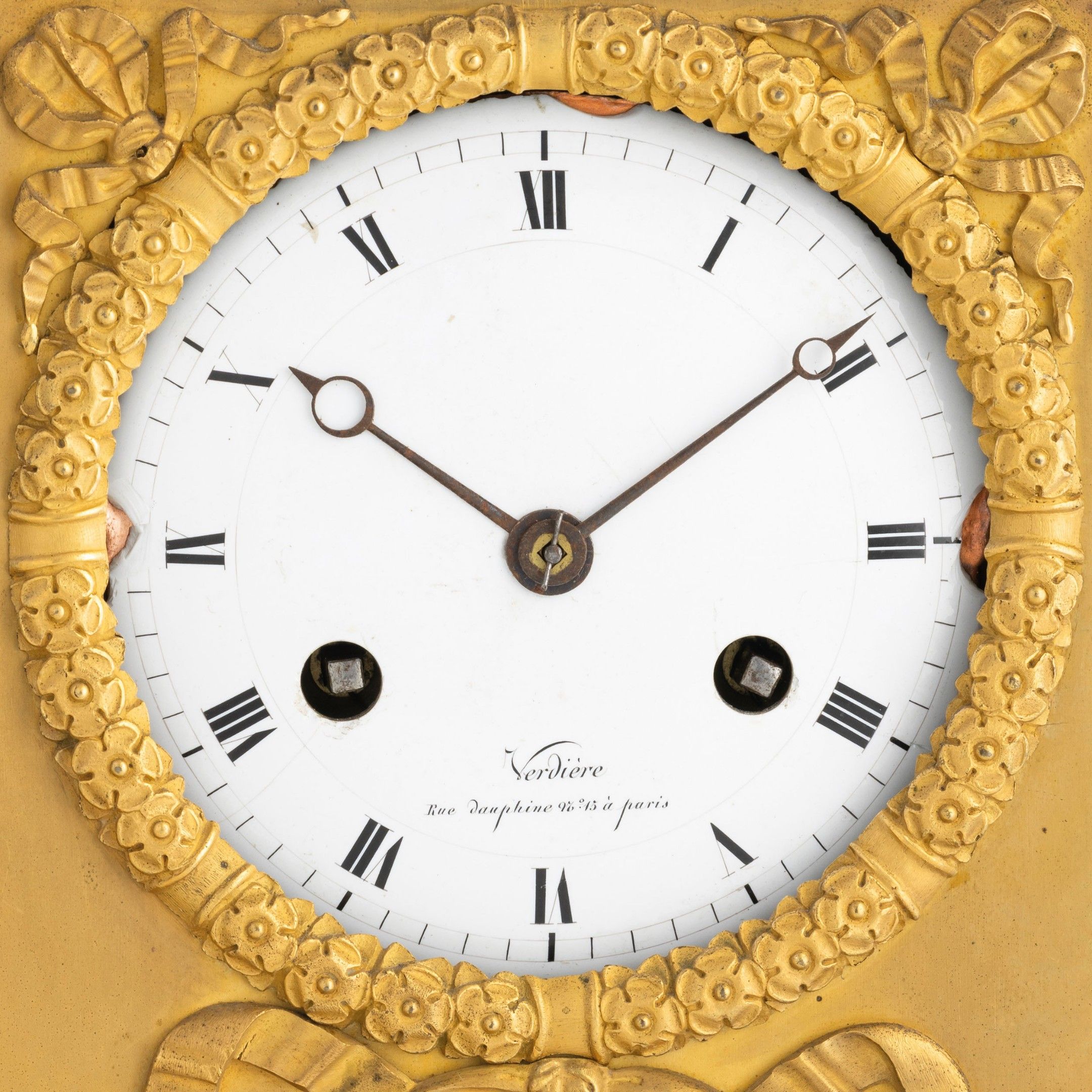 gilded bronze case, depicting an allegory of erotic poetry, with Erato crowning a small musical Eros, white enamel dial with Roman numerals signed Verdiere rue Dauphine no. 15 à Paris, Breguet-style hands, 15-day movement with silk-wire suspension, hour and half-hour strike on bell. Mechanism not working, to be serviced, pendulum lens present, rod absent. H 50 cm, W 36 cm, D 14 cm.
