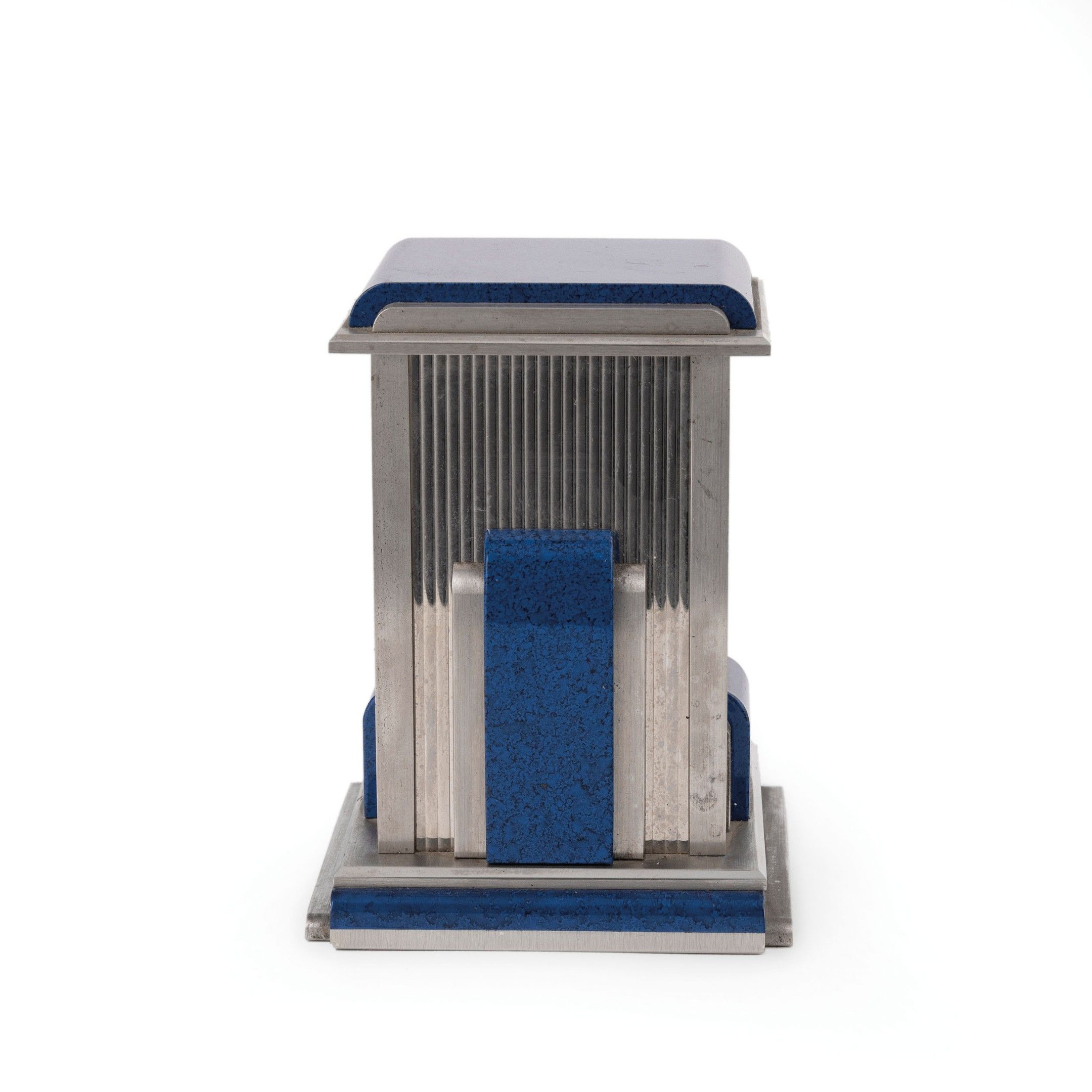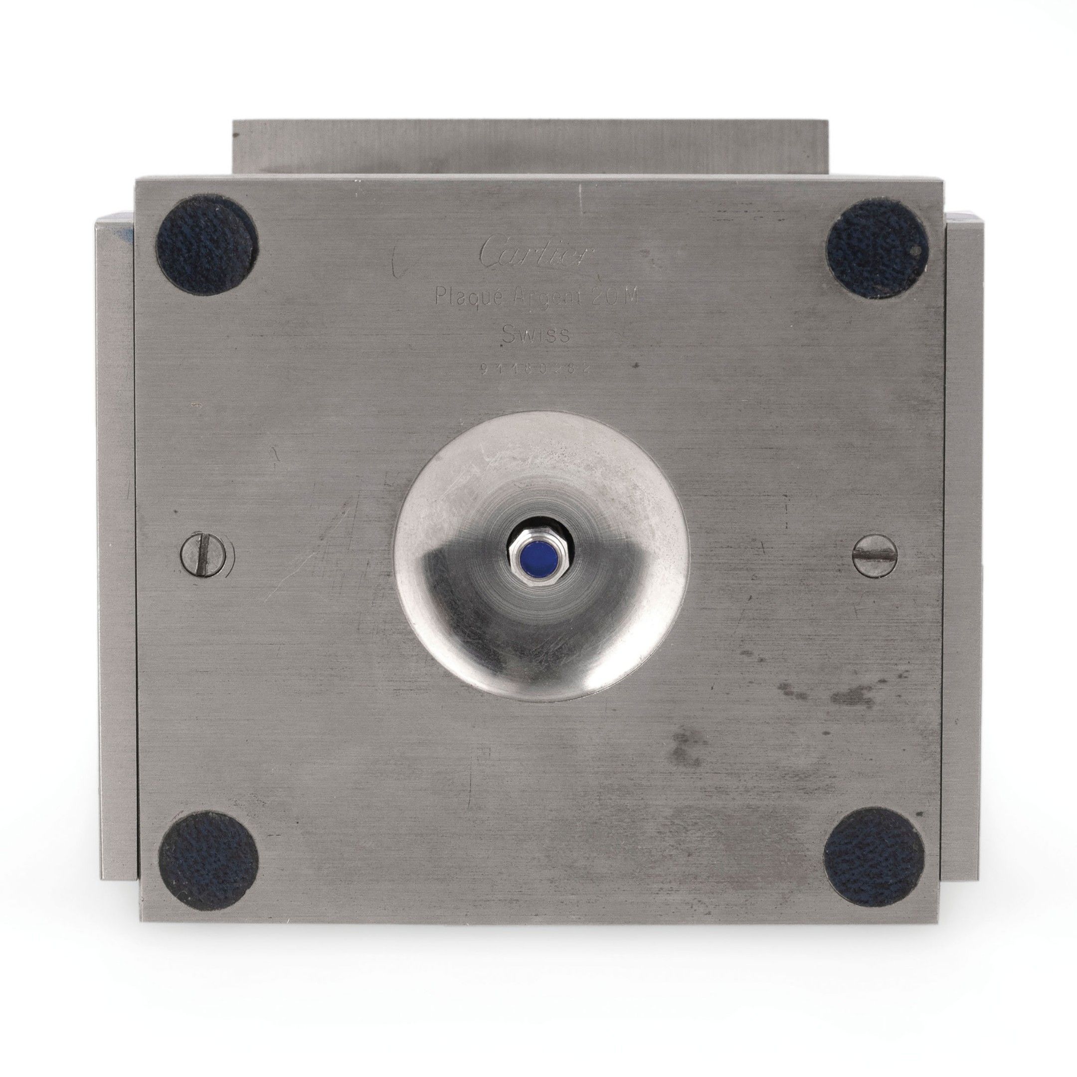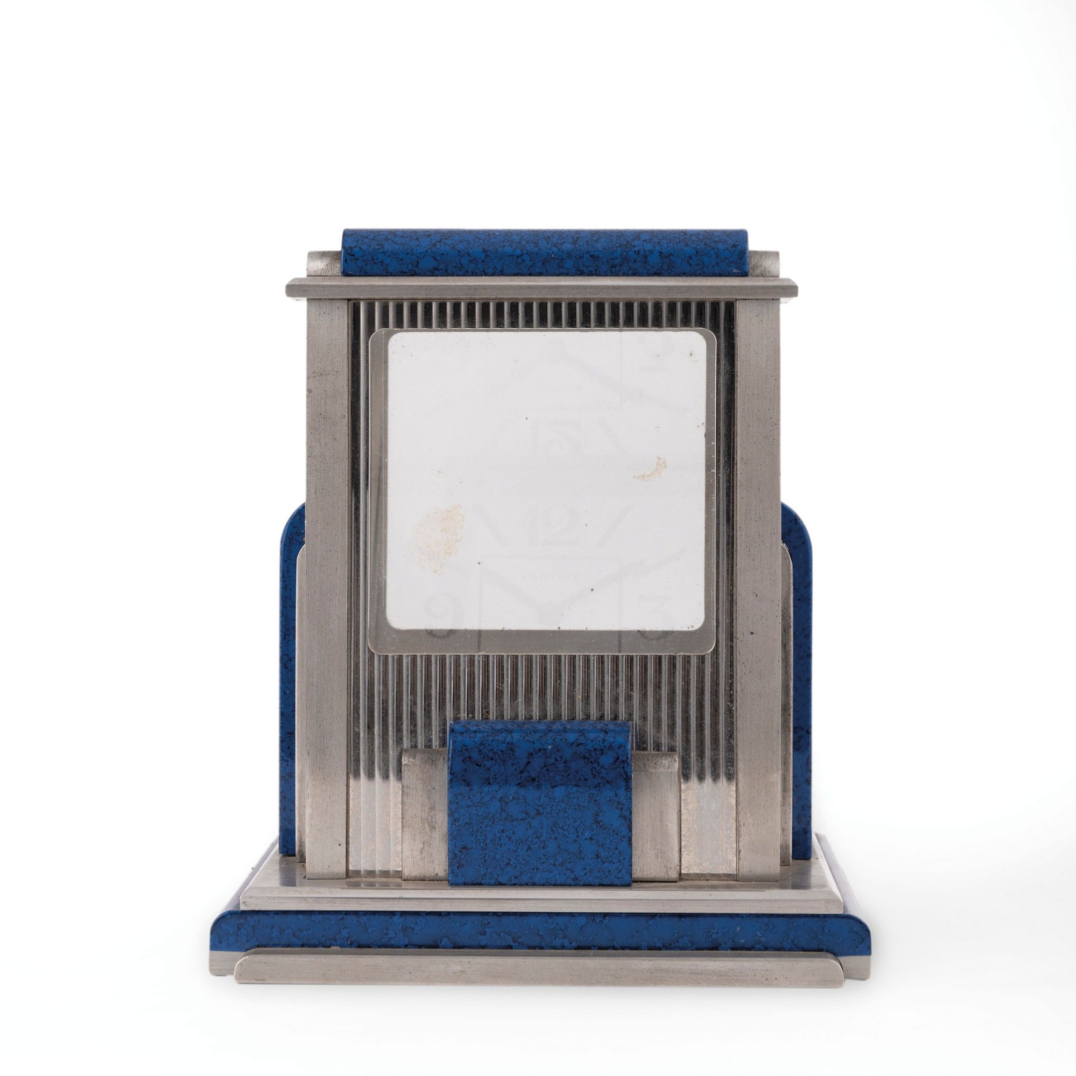 parallelepiped-shaped case in silvered metal embellished with elegant lapis lazuli plaques, crystal front dial, signed Cartier, quartz movement to test. H. 10.5 cm, W. 9 cm, D. 7.5 cm.