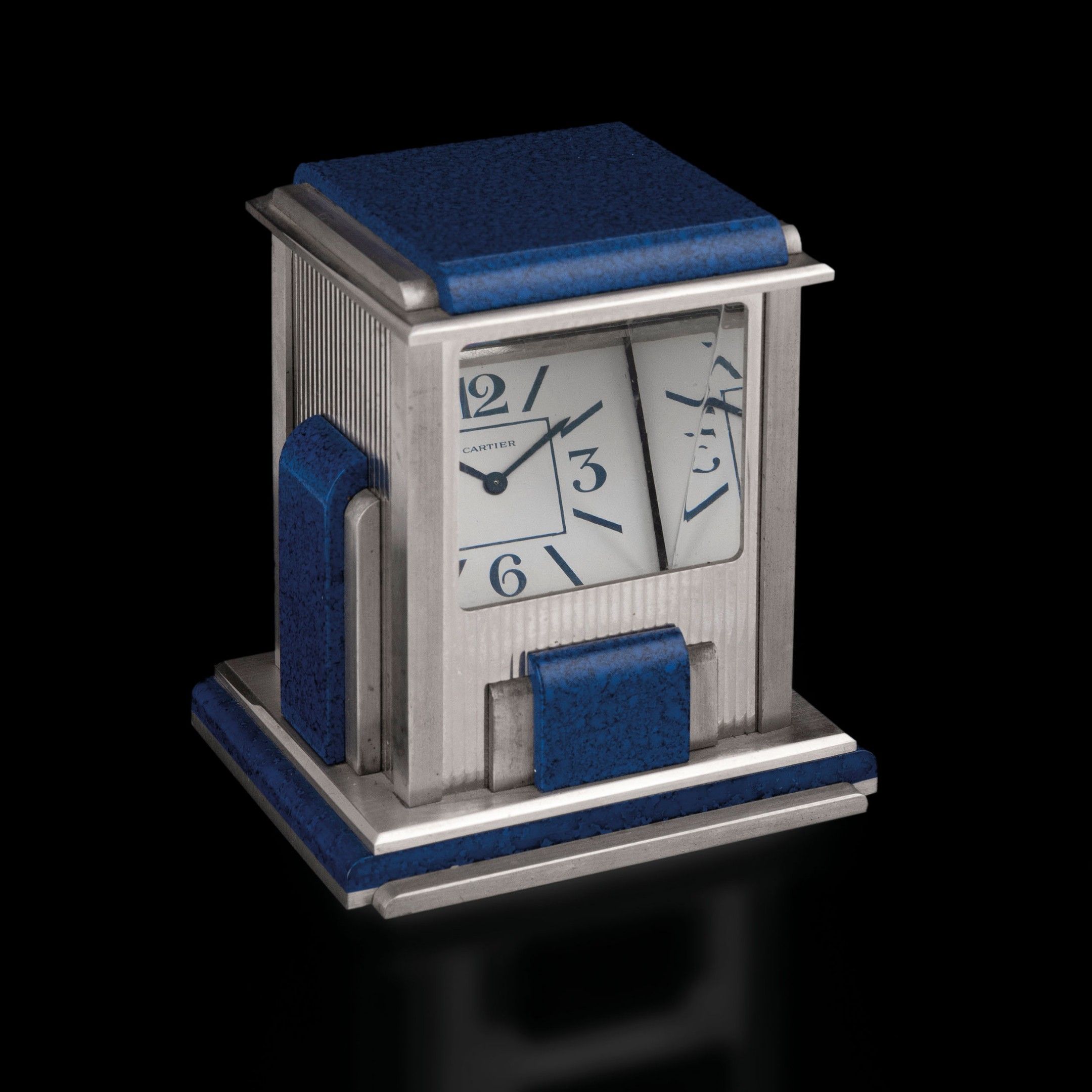 This mystery clock by Cartier, known as the 'prism' clock, is a work of exceptional engineering and fine art. Made in an elegant Art Deco style with lapis lazuli plaques, this prism clock features prisms and quartz crystal mirrors that allow the dial, which is hidden in the base, to become visible through the transparent window, but only from a certain angle. This ingenious design was first developed and patented in 1937 by Gaston Cusin, who was inspired by a periscope. Cartier has produced several prism watch models, many of them made from fine materials and elegant designs like this one.