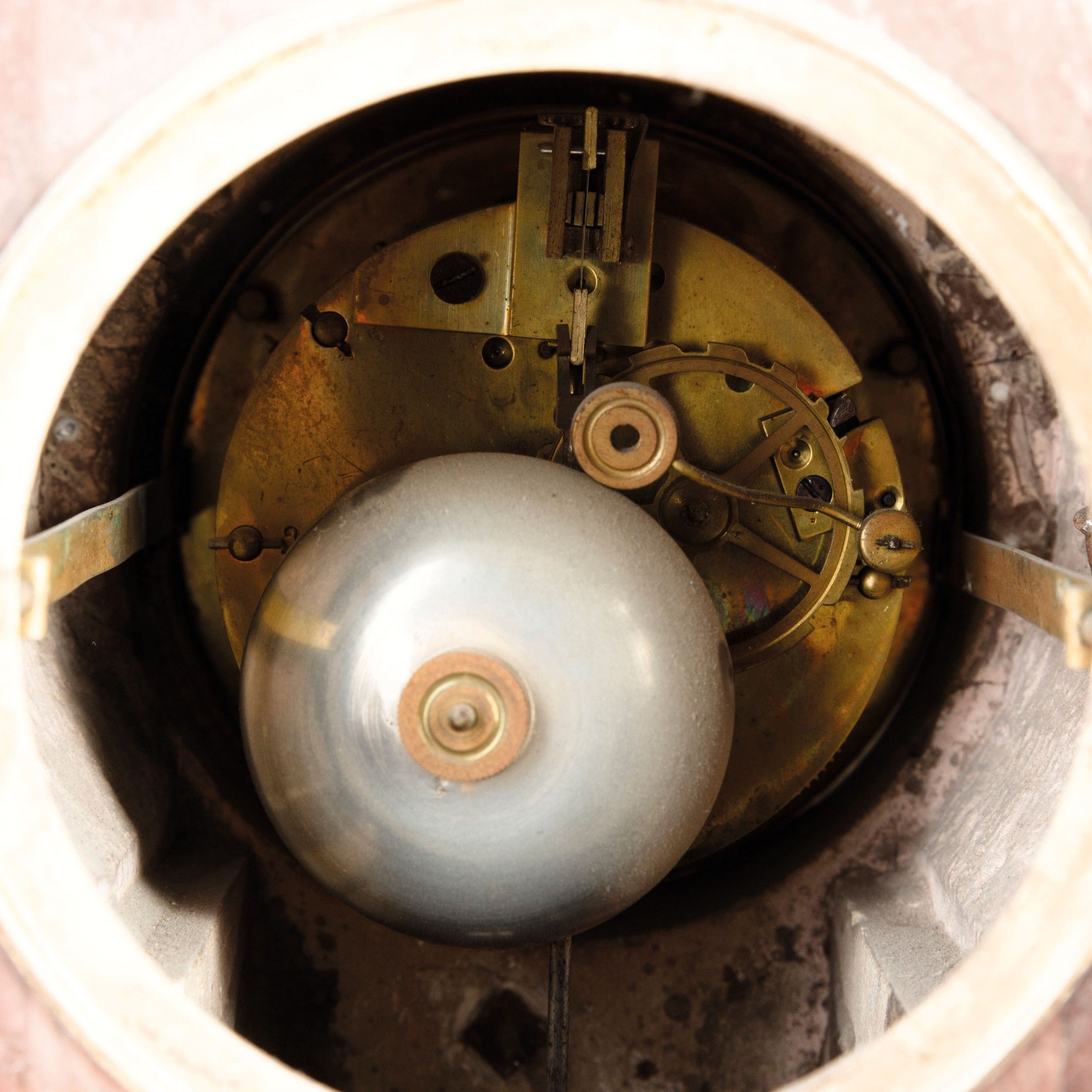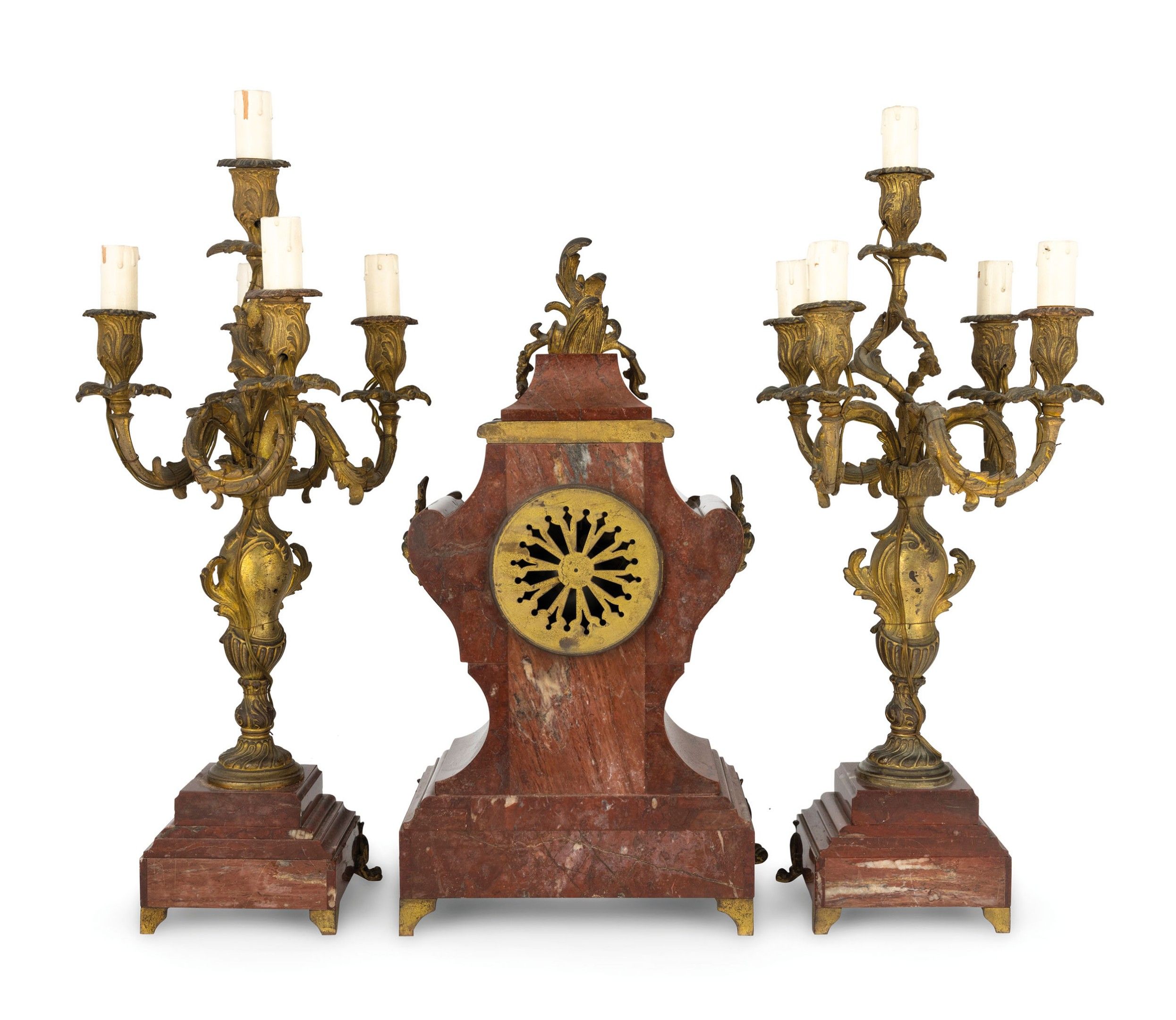 Important red porphyry triptych with large gilded bronze appliqués, white enamel dial with Roman numerals, gilded bronze hands, 15-day movement (to be overhauled) with hour and half-hour strike on bell, pendulum and key present, clock adorned with two electrified candelabra, 5-flame. The clock: h. 48 cm, w. 30 cm, d. 18 cm, the candelabra: h. 58 cm, w. 20 cm
