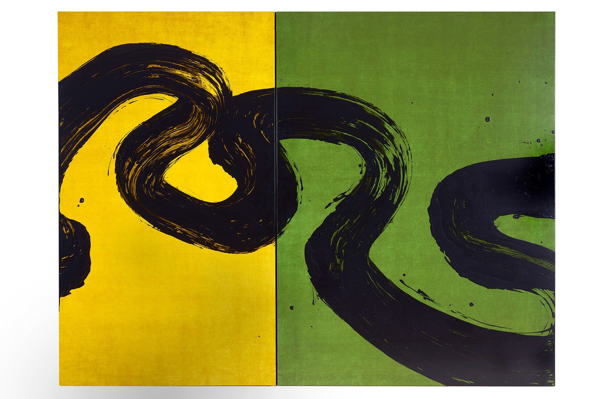 Ink, pigments and varnish on canvas mounted on panel, signed, titled, located and dated L'Atelier, Autumn 2011; horizontal bichrome diptych in yellow and green