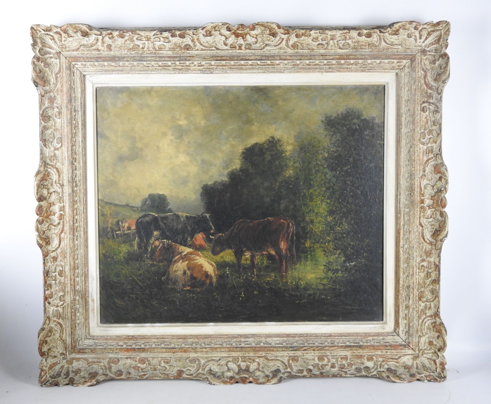 Jean Justin GABRIEL (1837 - 1923): Cows. Oil on canvas. Signed lower left. 65 x 54 cm. Bug hole. Slight lack.