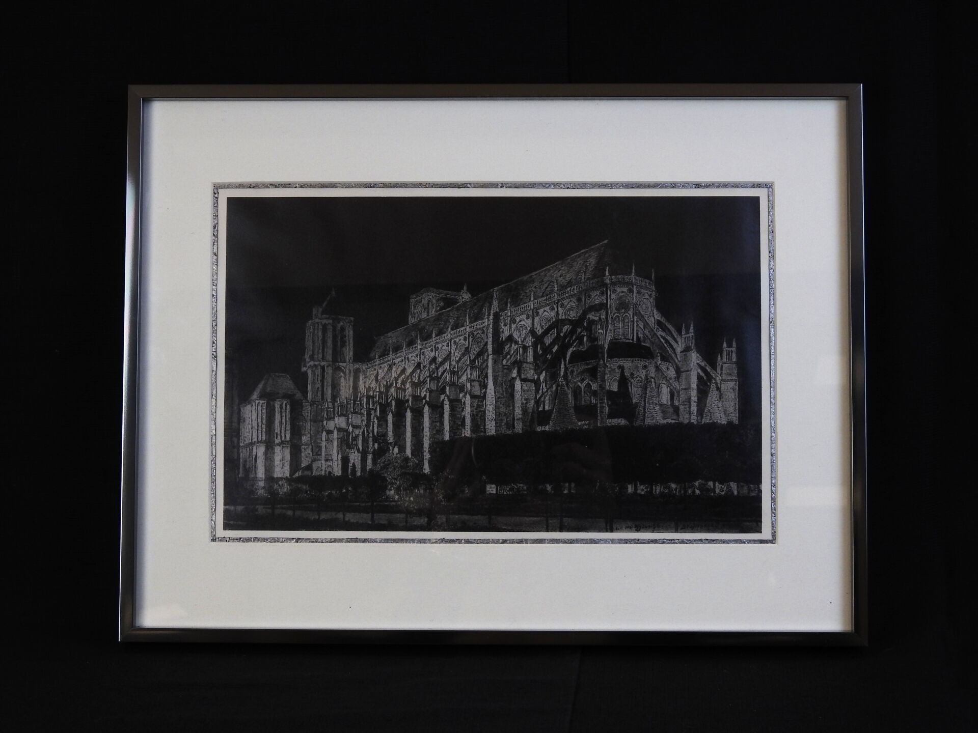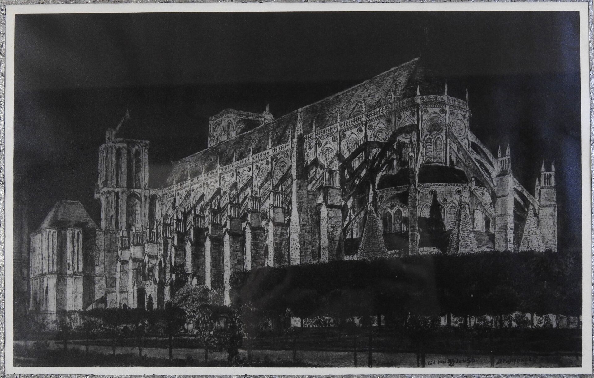 Marcel BASCOULARD (1913-1978): Saint Etienne's Cathedral, Bourges, view of the archbishop's garden, night view. Ink and wash. Signed in Cyrillic and dated 56. 30 x 19 cm. Size (Nielsen frame): 40 x 30 cm.