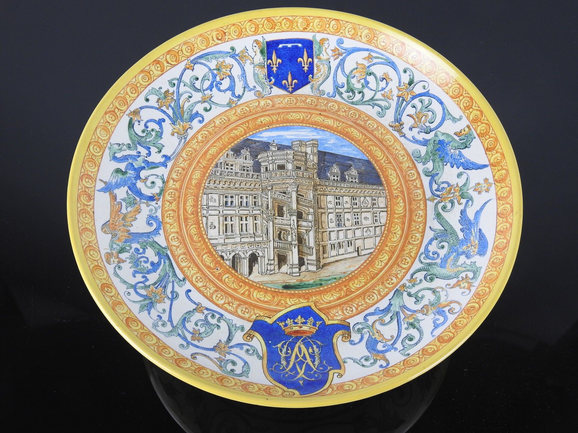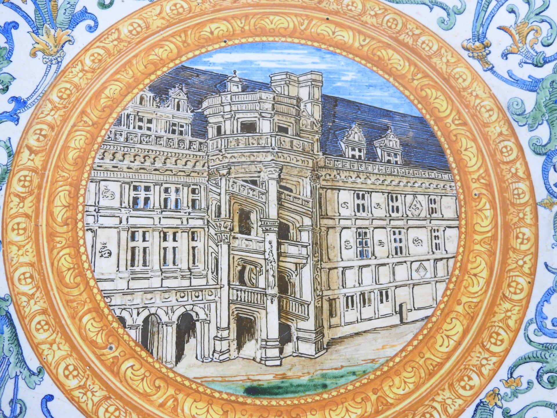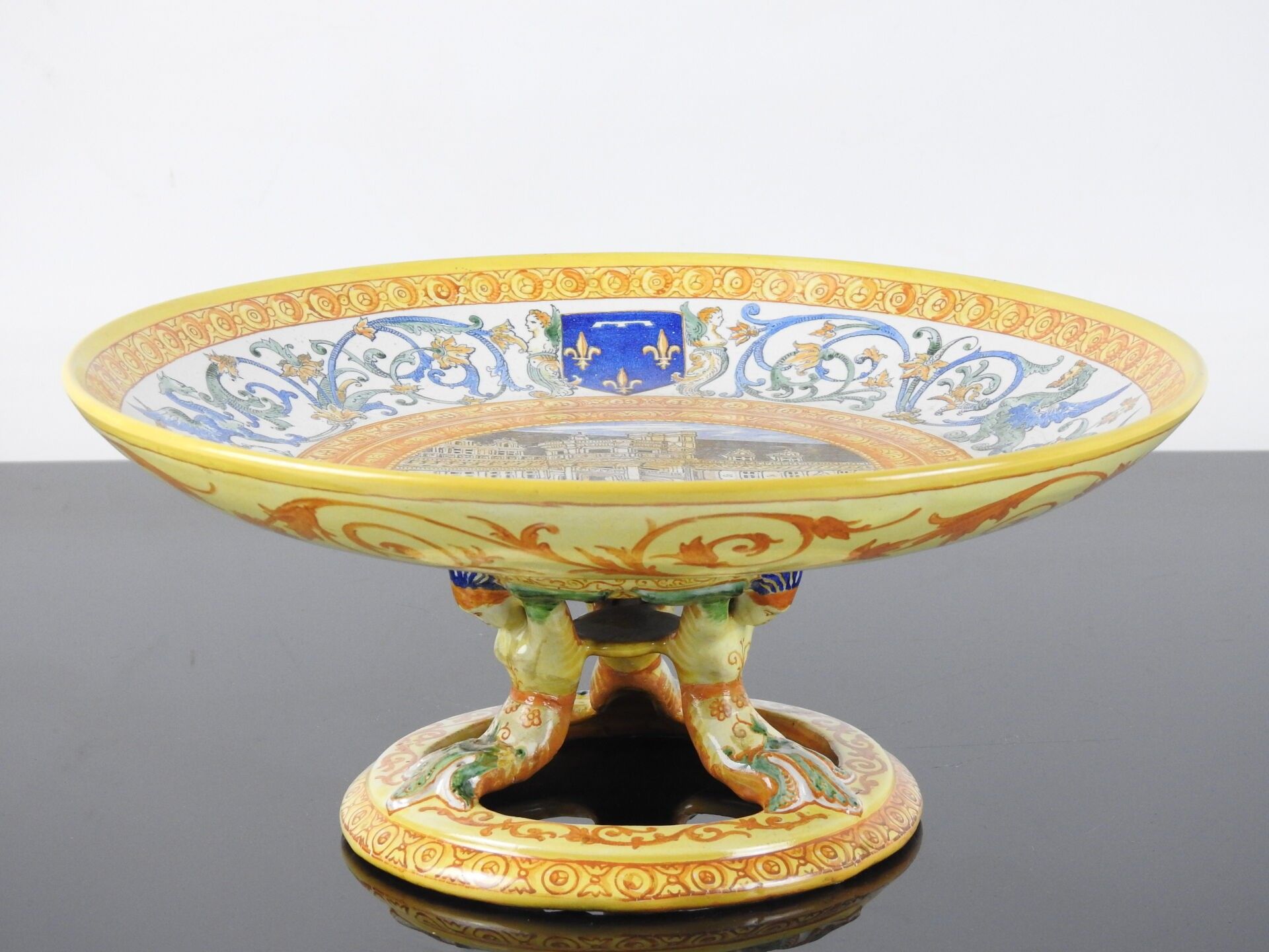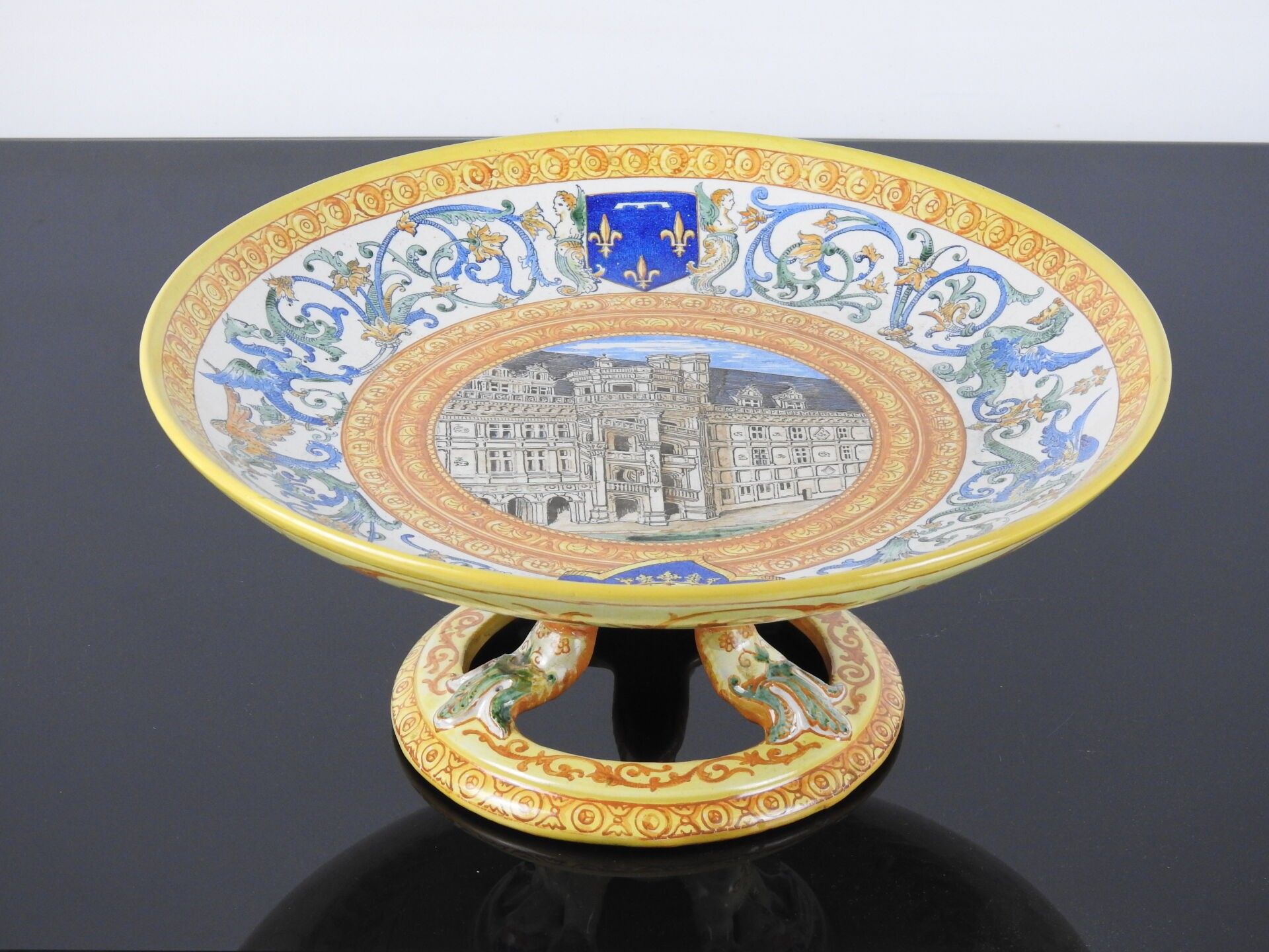 Ulysse BESNARD dit ULYSSE (1826-1899) - Blois : Important bowl resting on a foot made up of three earthenware tritons, the bowl decorated in a medallion with the François Ier facade with the famous staircase of the castle of Blois. Signed Ulysse and dated 1864. H: 14 - Diam. 32.5 cm (damage).