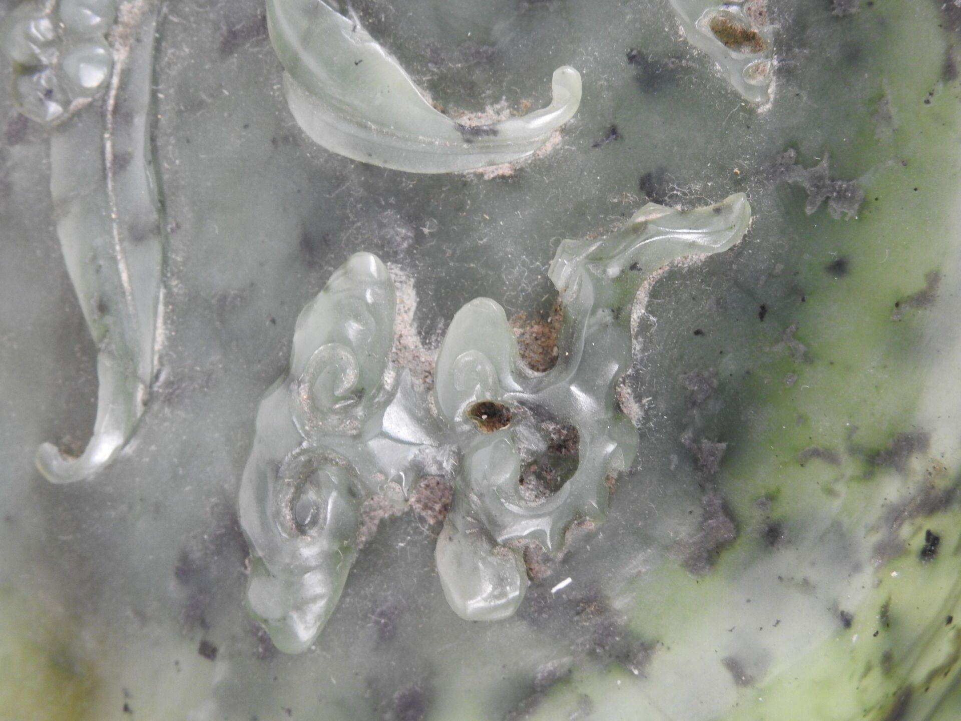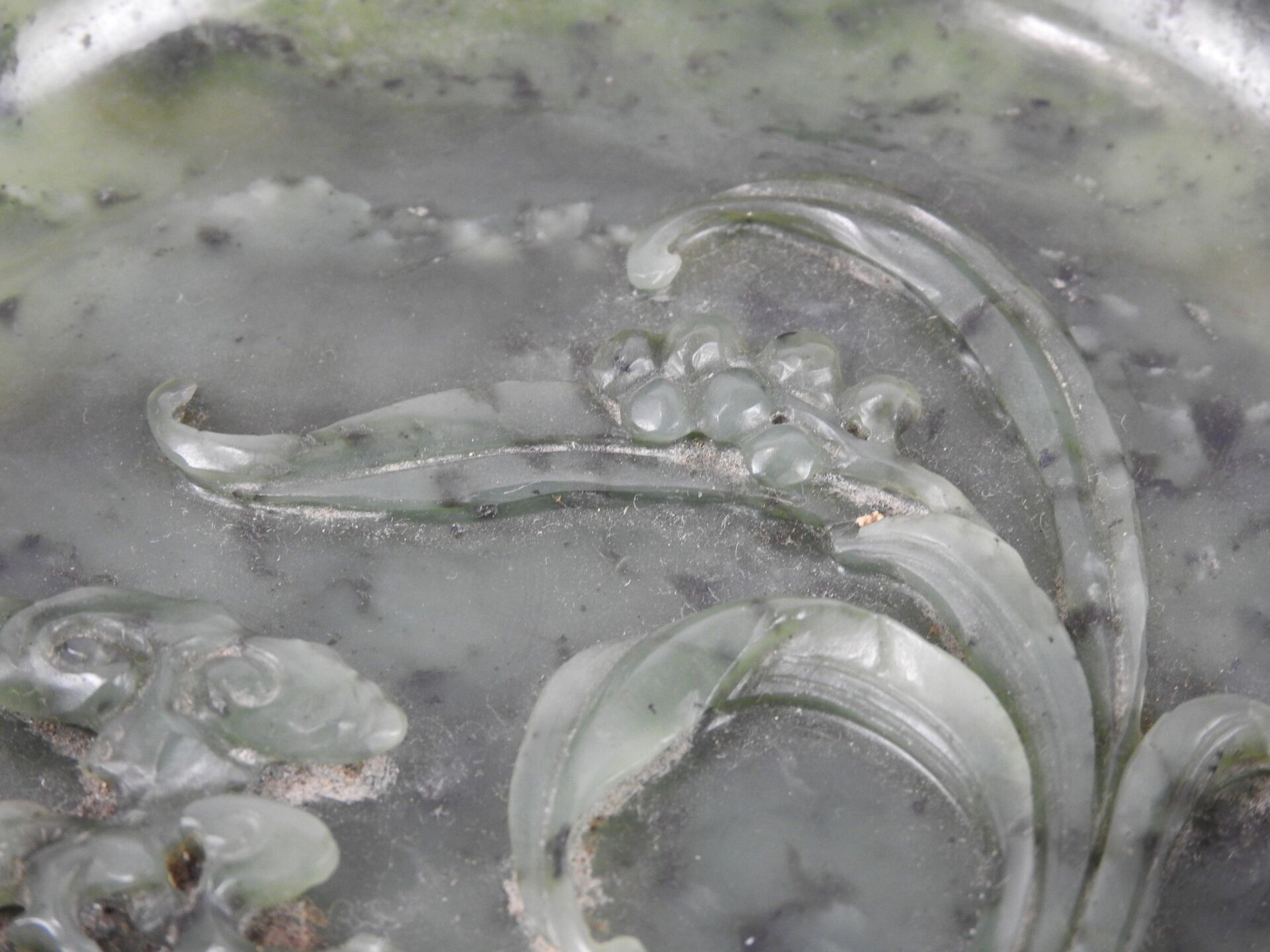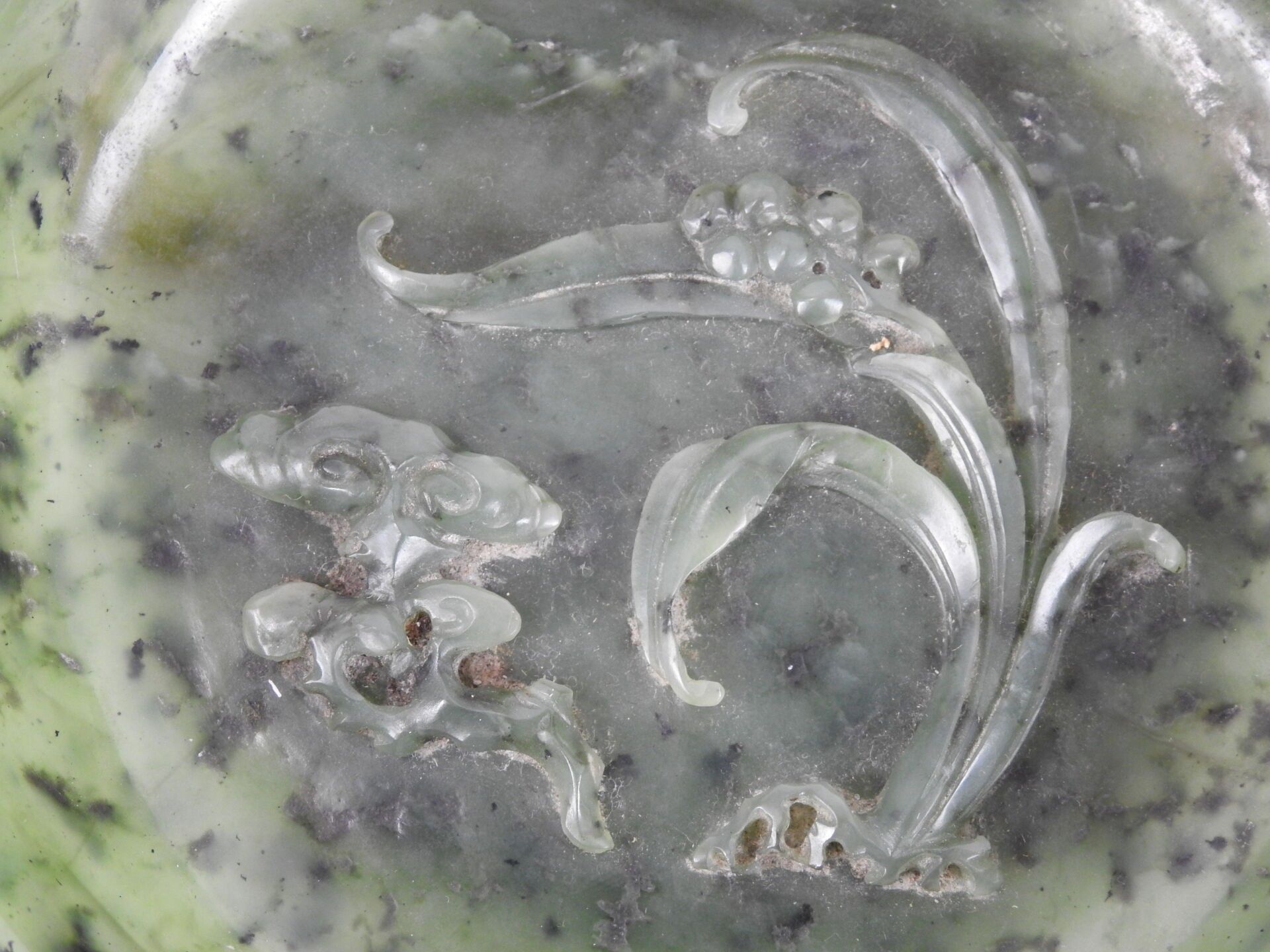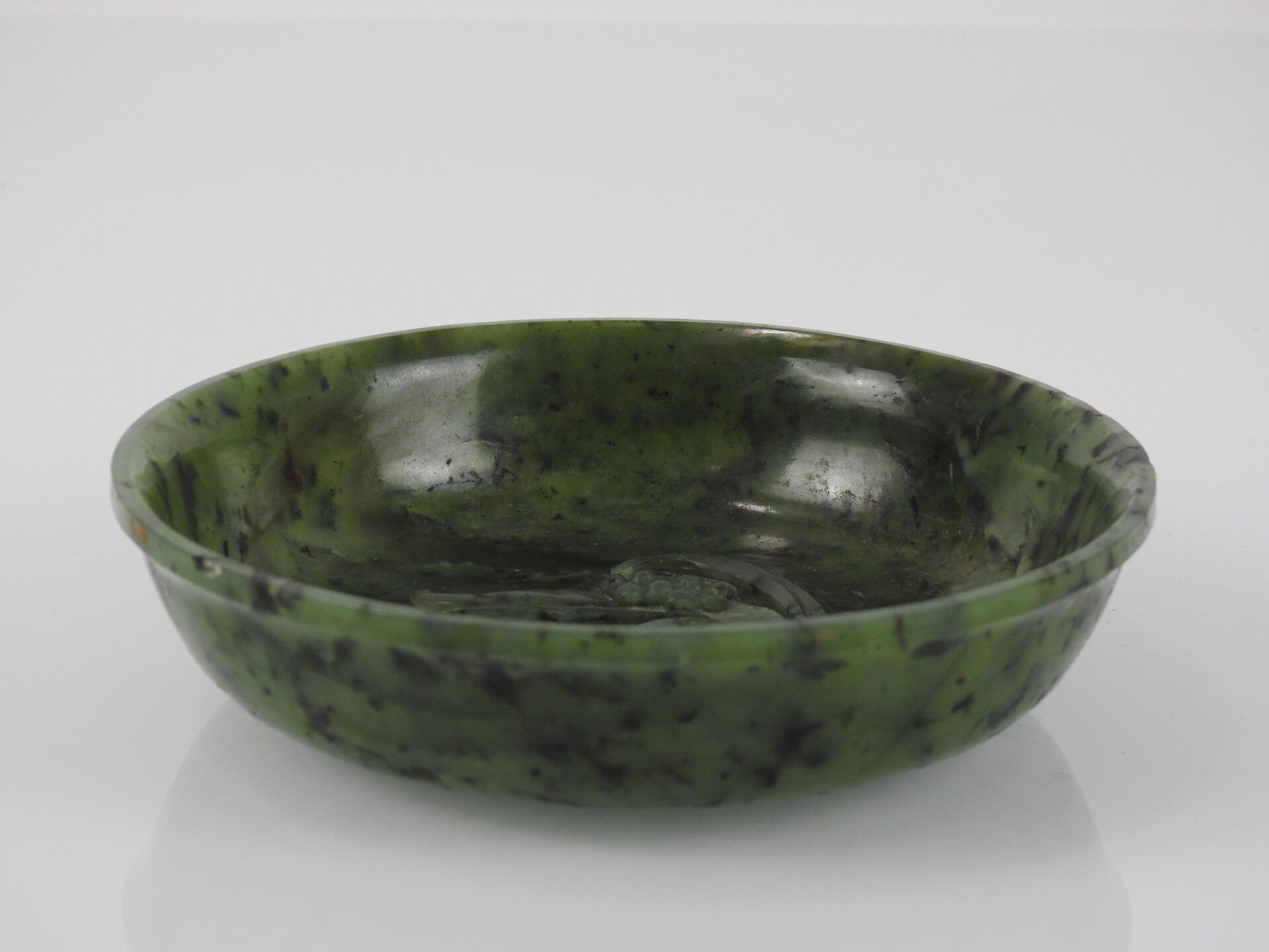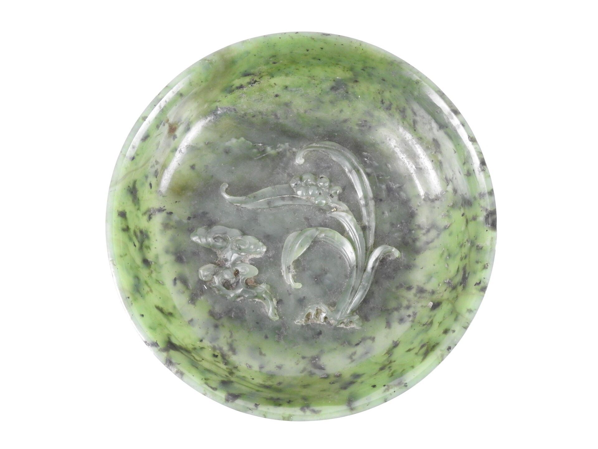 CHINA - 18th century : Spinach jade bowl of circular form, with carved decoration in relief of a lingzhi mushroom and a flowering lily of the valley stem. H: 3 - Diameter: 14.5 cm