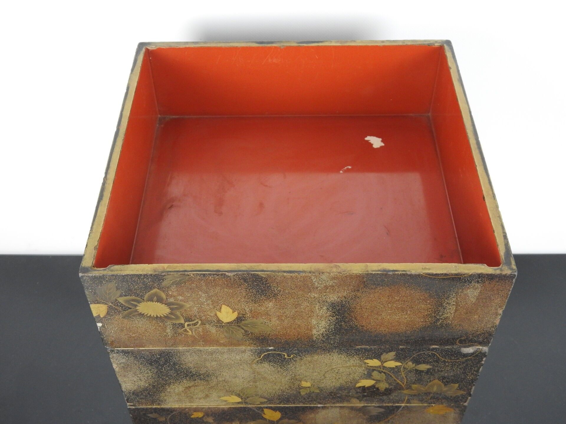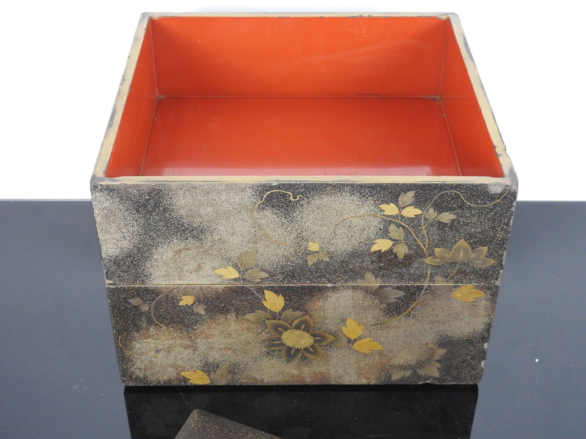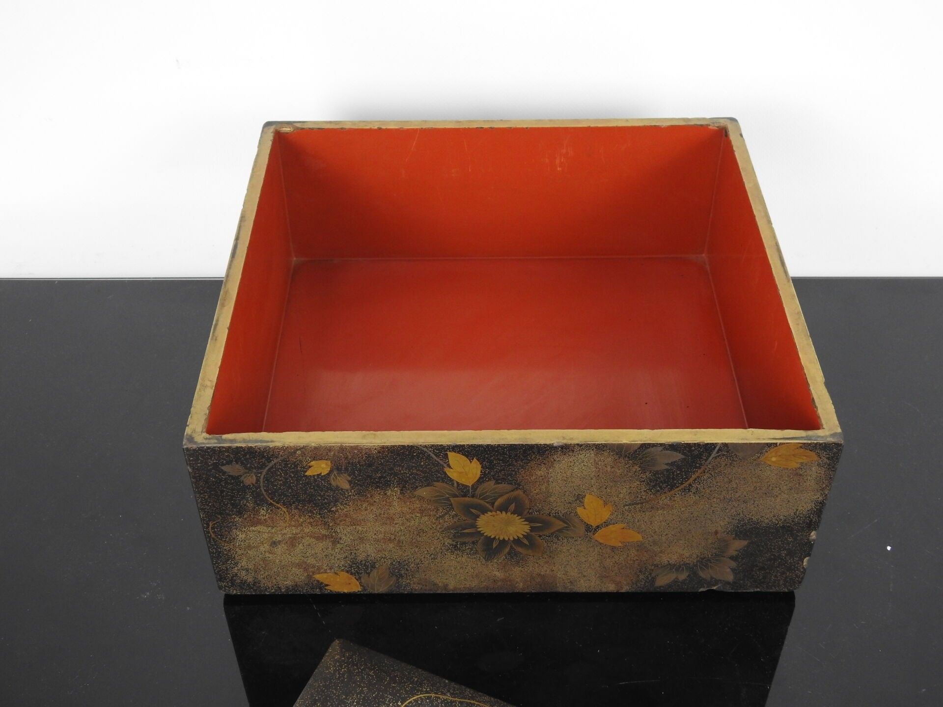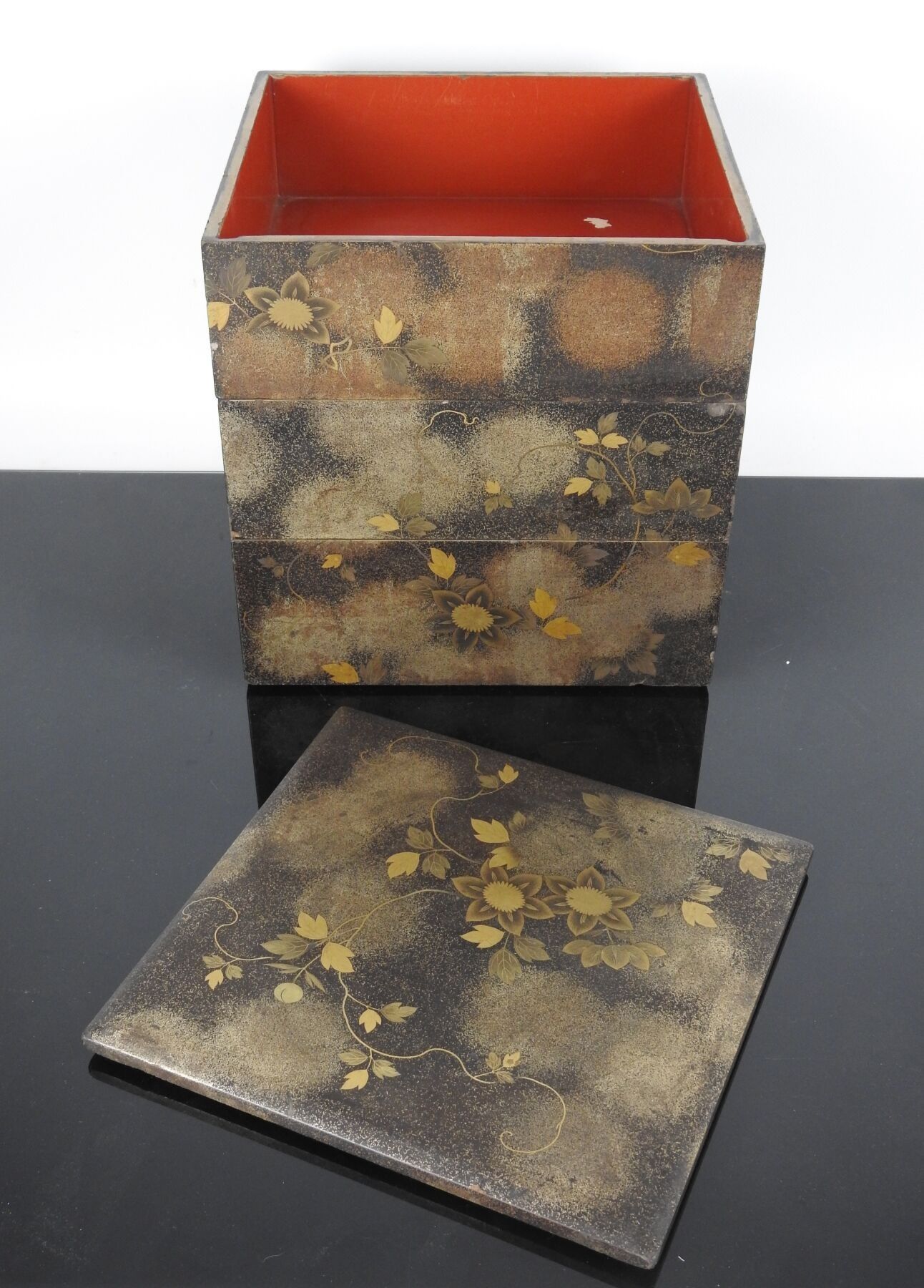 Lacquer box with three compartments decorated in hira maki-e in gold lacquer with flowers in leafy tendrils on a black background sprinkled with kimpun. The inside is red lacquered. The interior is red lacquered (damaged, chips, wear, one compartment missing). Dim. H. 27,5 W. 26 D. 24,5 cm Expert : Cabinet Portier