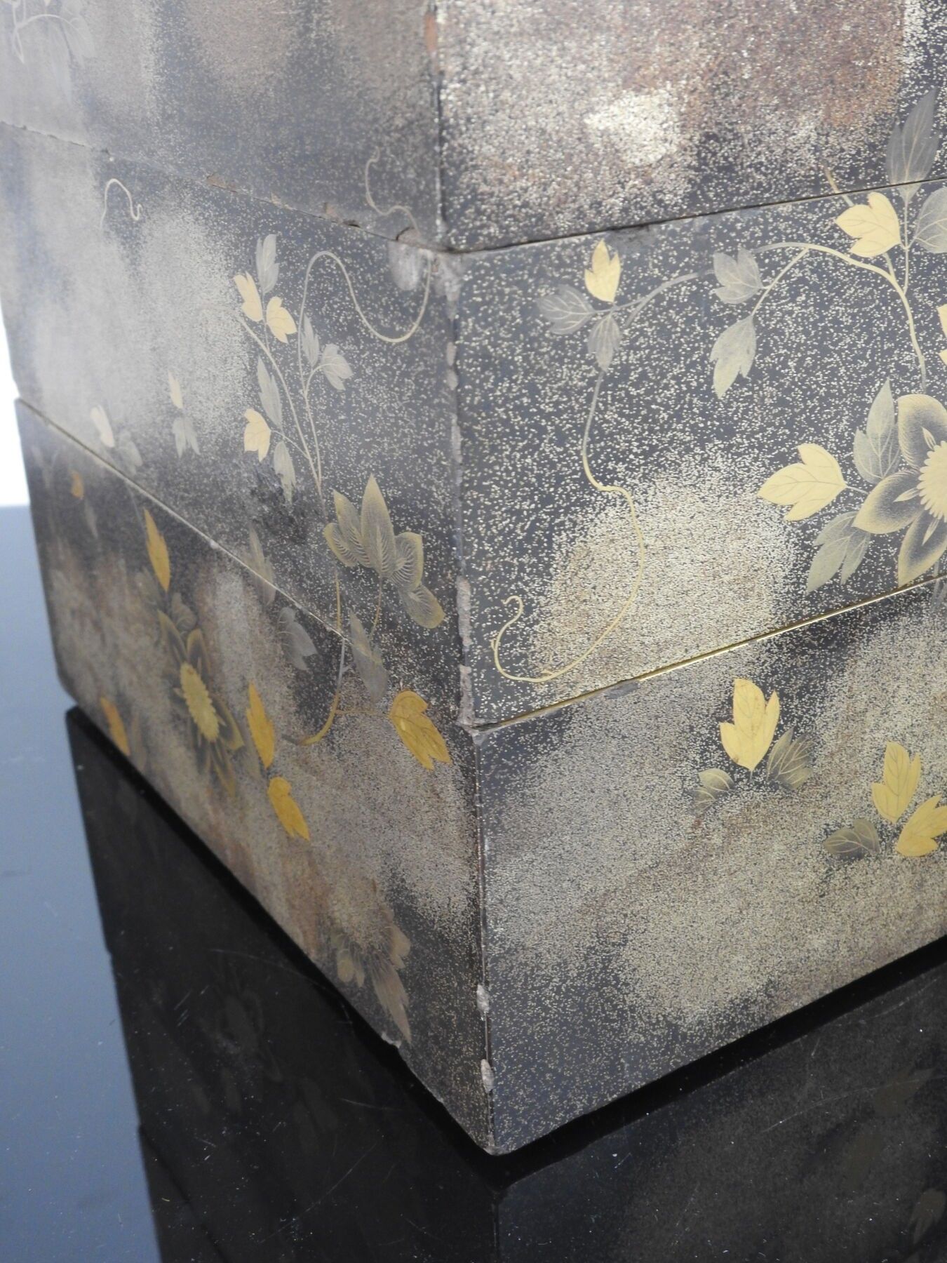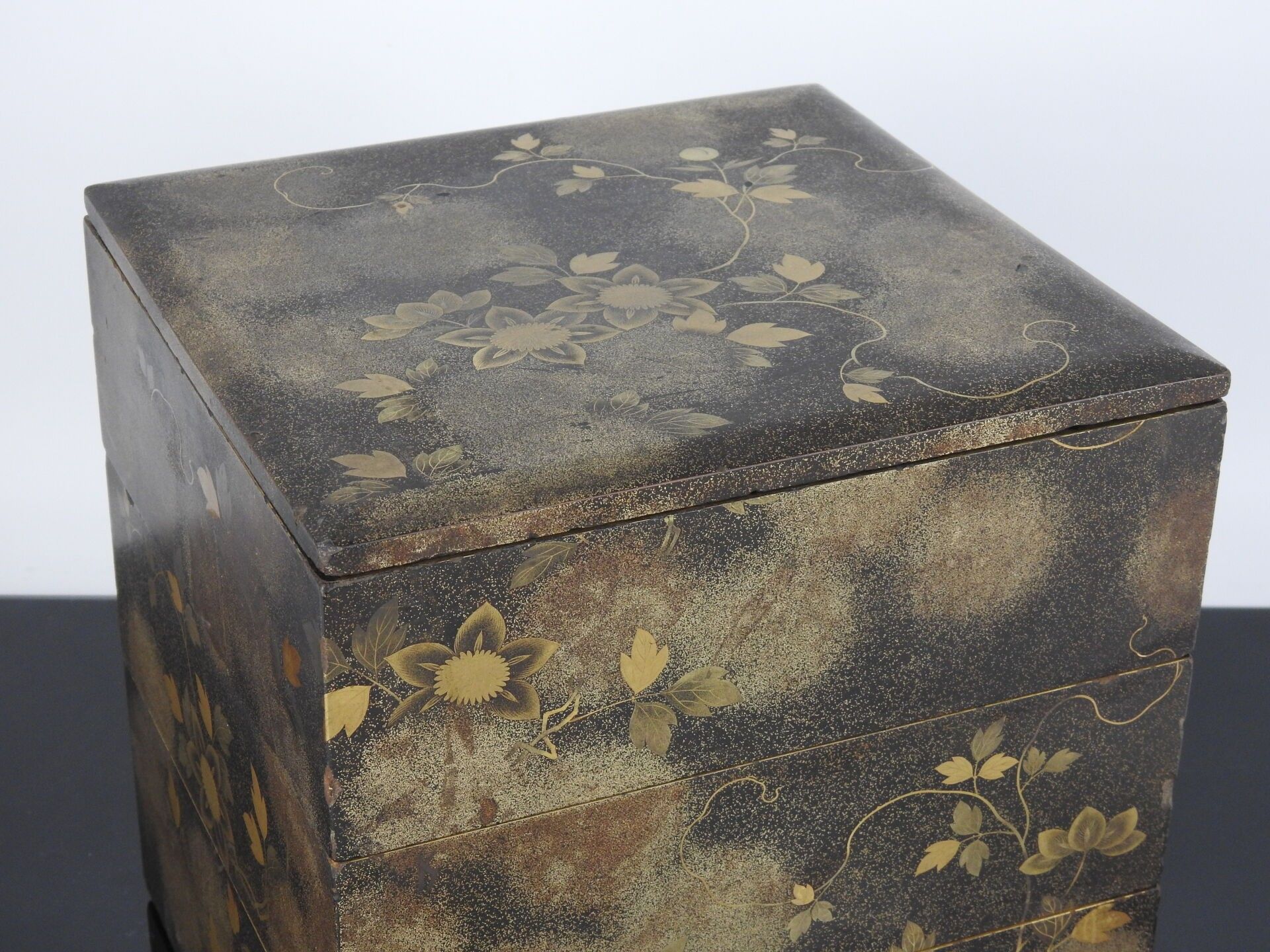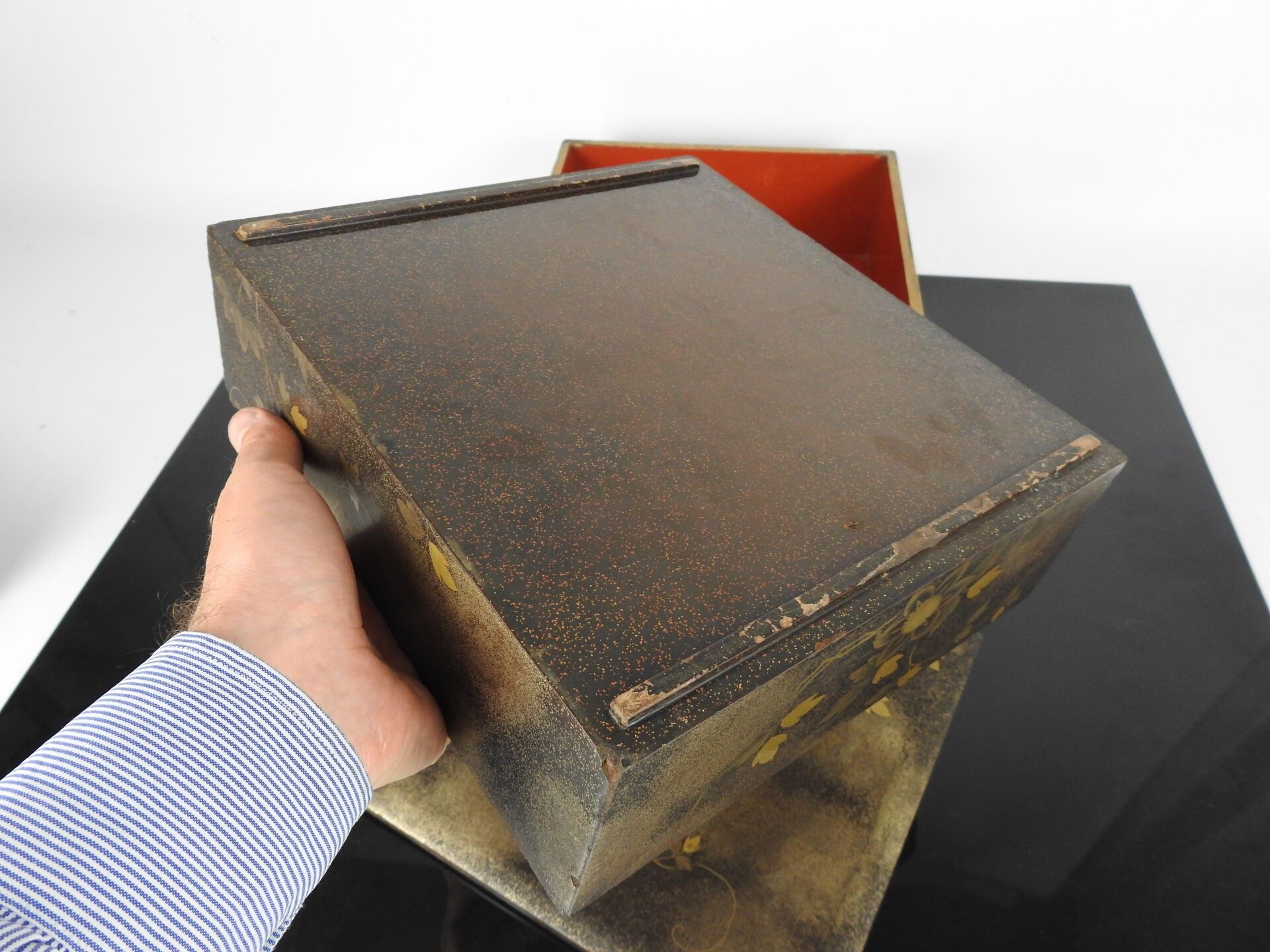 Lacquer box with three compartments decorated in hira maki-e in gold lacquer with flowers in leafy tendrils on a black background sprinkled with kimpun. The inside is red lacquered. The interior is red lacquered (damaged, chips, wear, one compartment missing). Dim. H. 27,5 W. 26 D. 24,5 cm Expert : Cabinet Portier