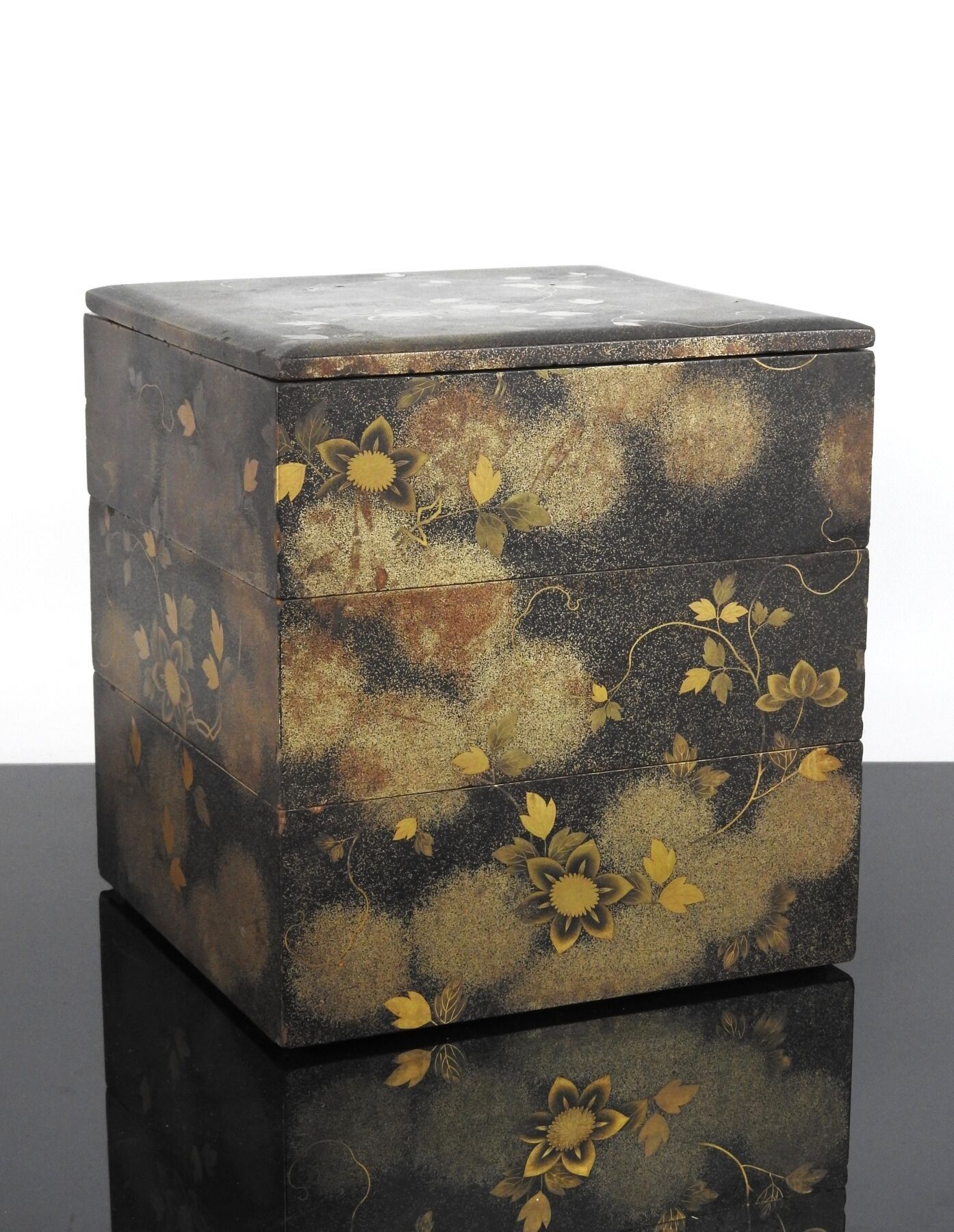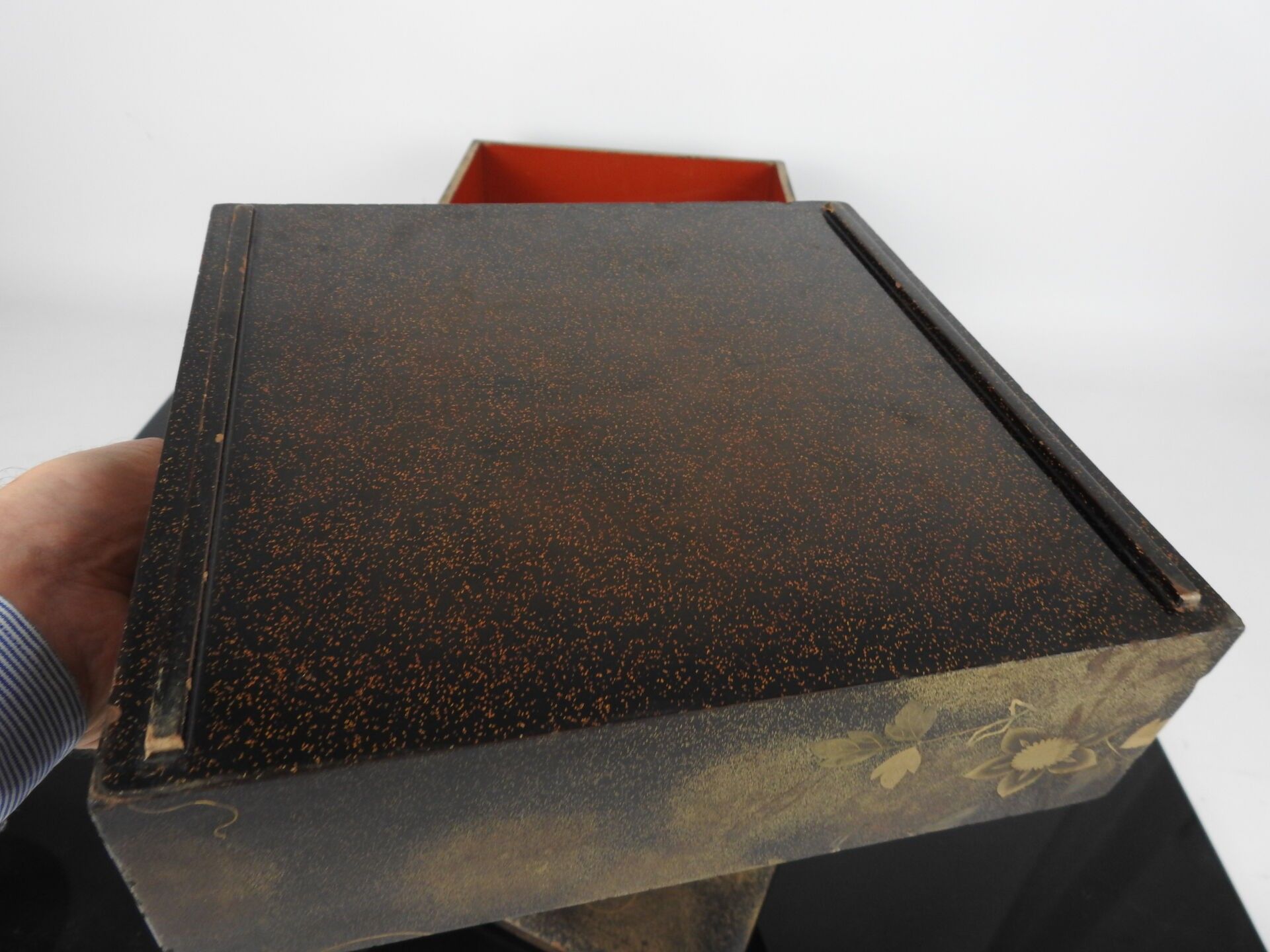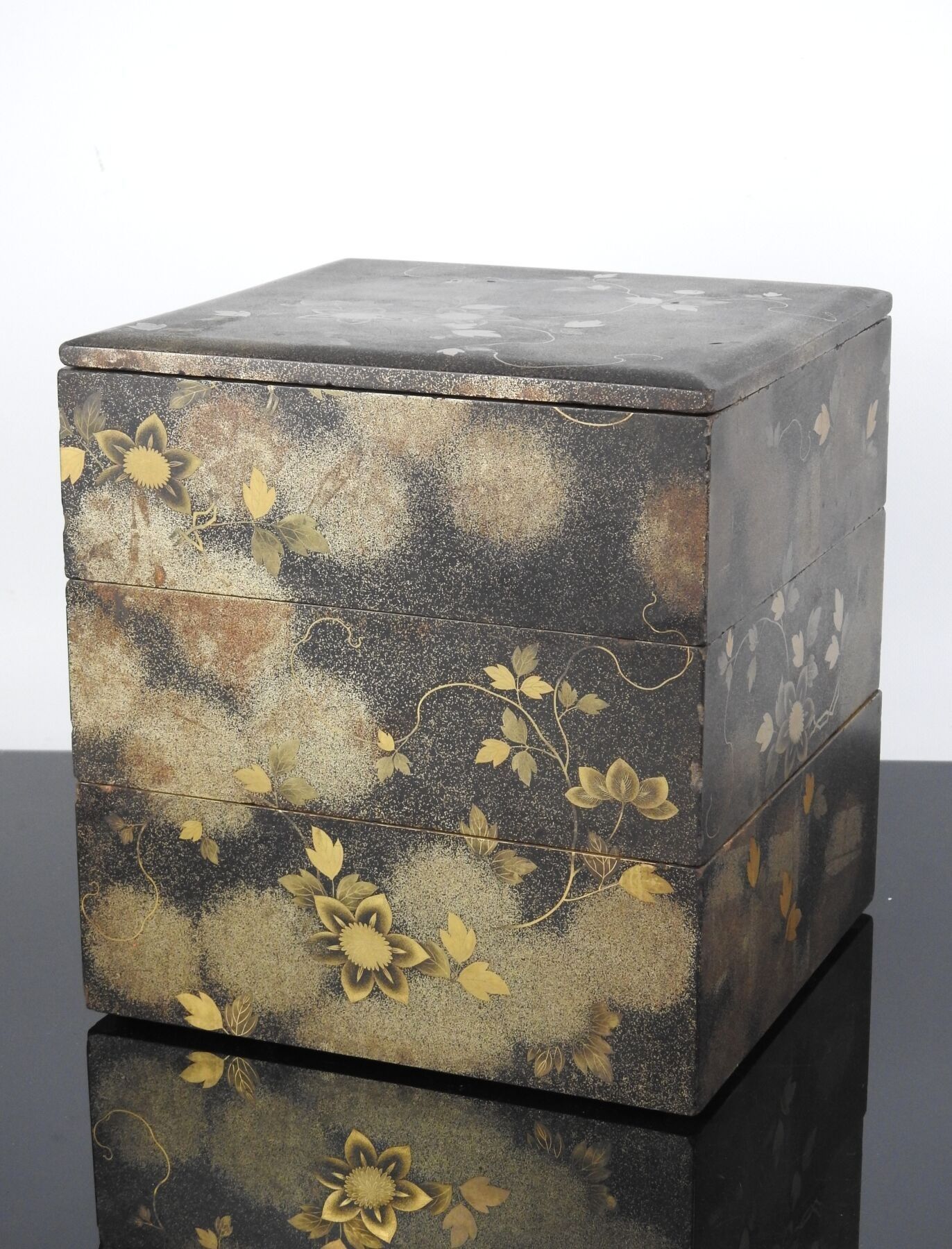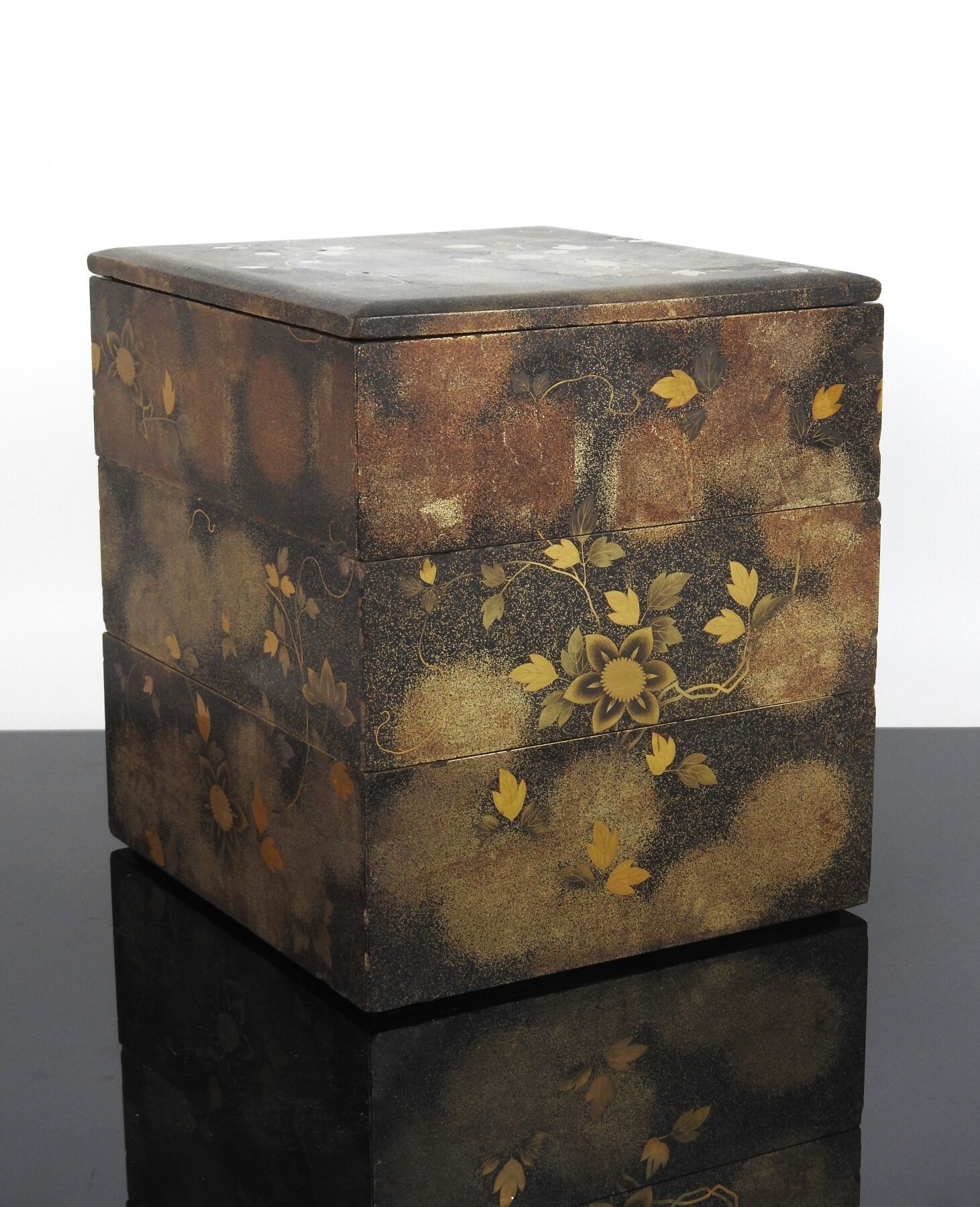 Lacquer box with three compartments decorated in hira maki-e in gold lacquer with flowers in leafy tendrils on a black background sprinkled with kimpun. The inside is red lacquered. The interior is red lacquered (damaged, chips, wear, one compartment missing). Dim. H. 27,5 W. 26 D. 24,5 cm Expert : Cabinet Portier