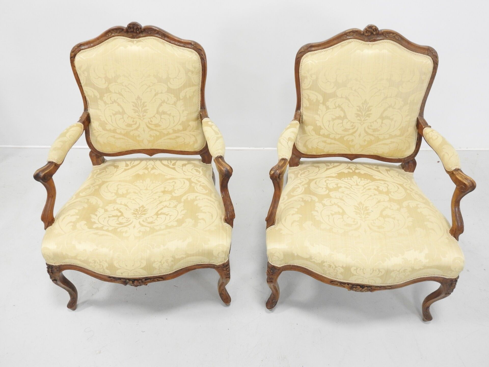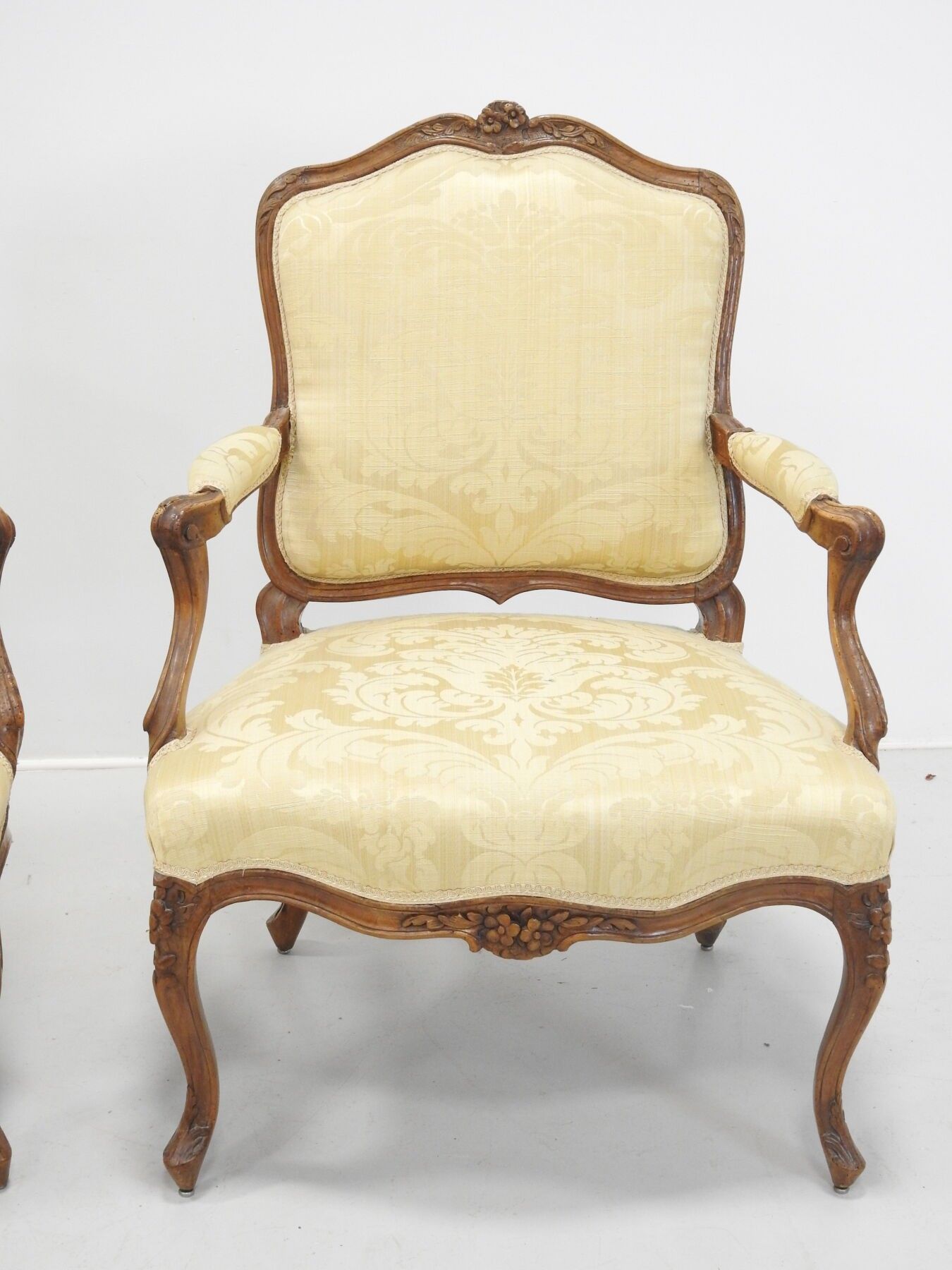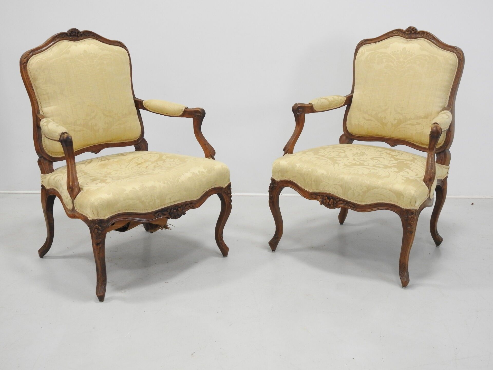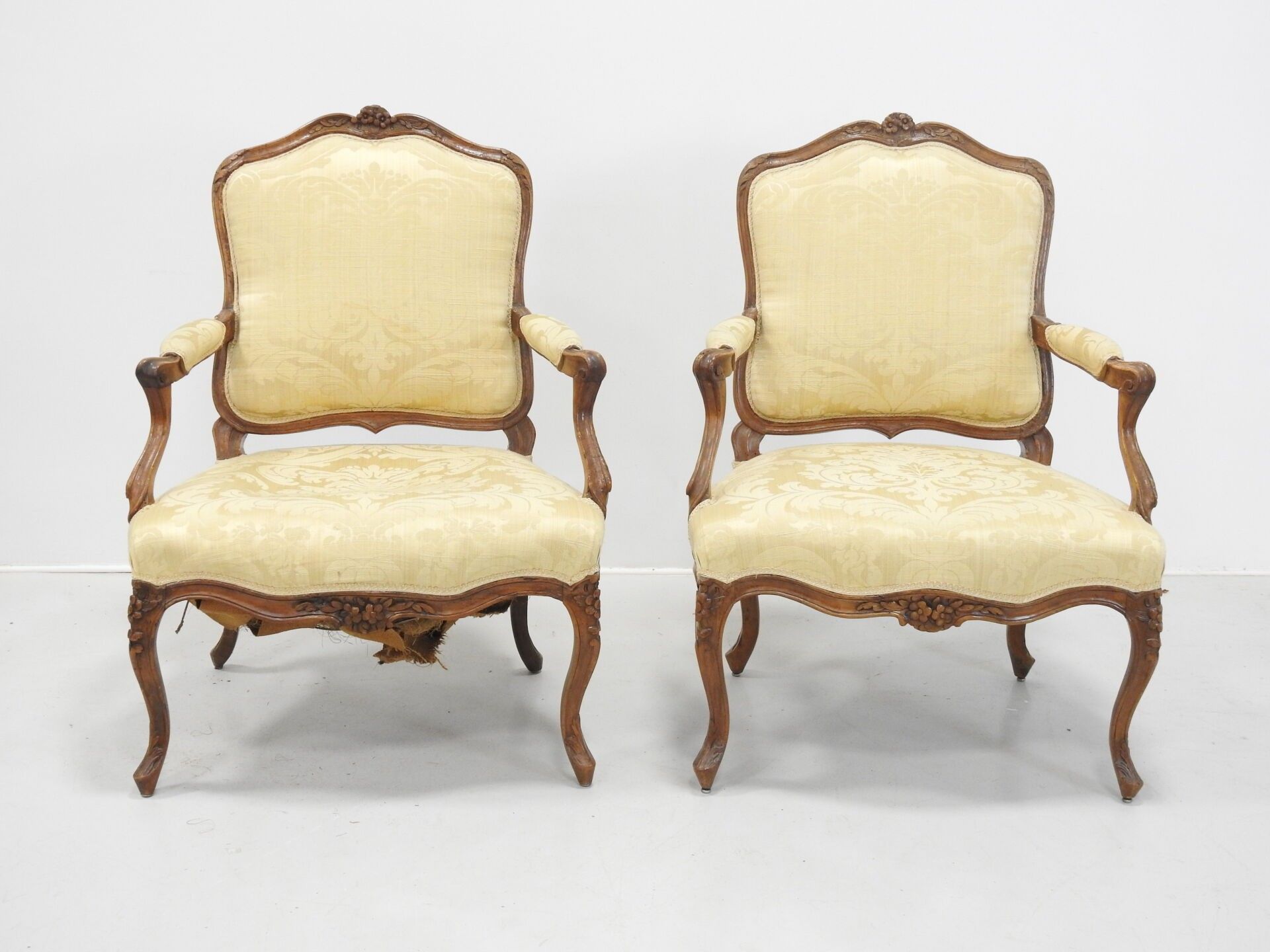 A PAIR OF FLAT-BACKED ARMCHAIRS in moulded natural wood carved with flowers. Louis XV period. 94 x 68 x 52 cm (wear, accident to one armrest and restorations to the legs).