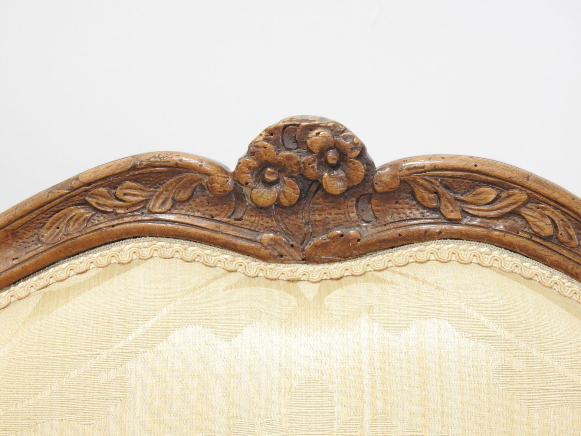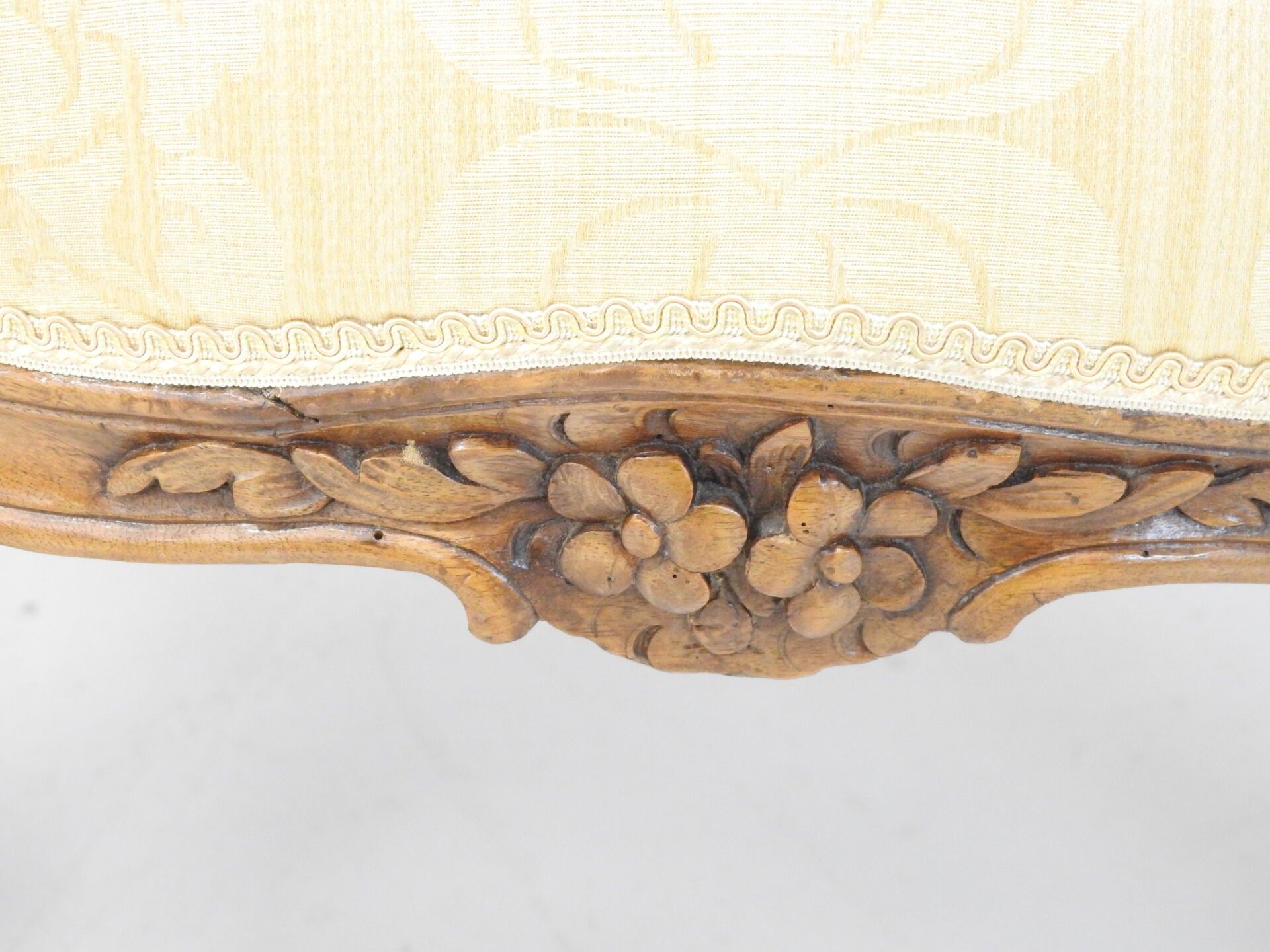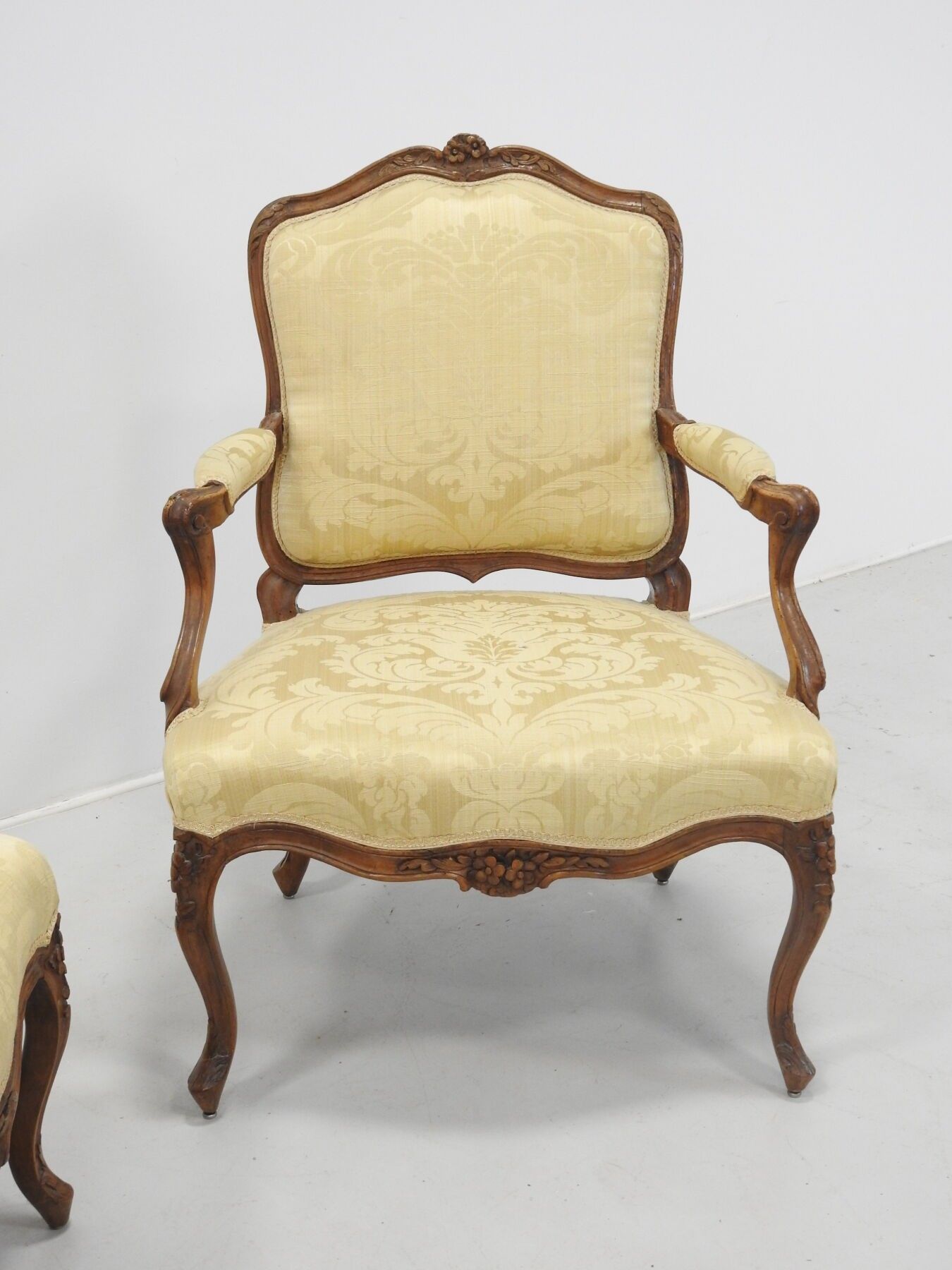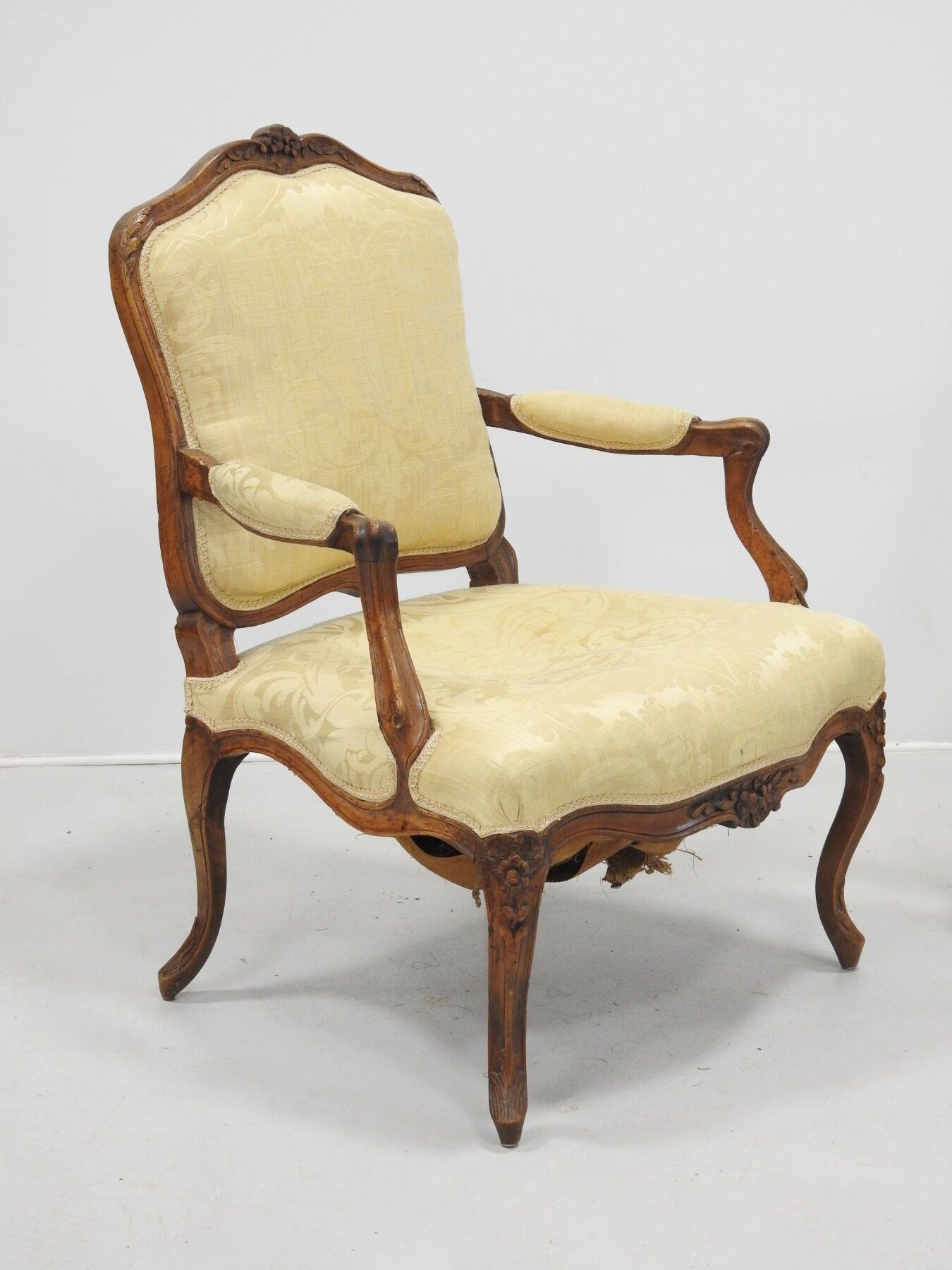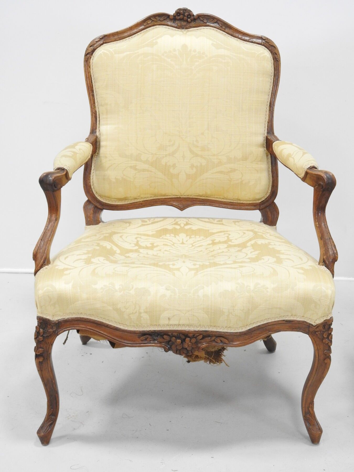 A PAIR OF FLAT-BACKED ARMCHAIRS in moulded natural wood carved with flowers. Louis XV period. 94 x 68 x 52 cm (wear, accident to one armrest and restorations to the legs).