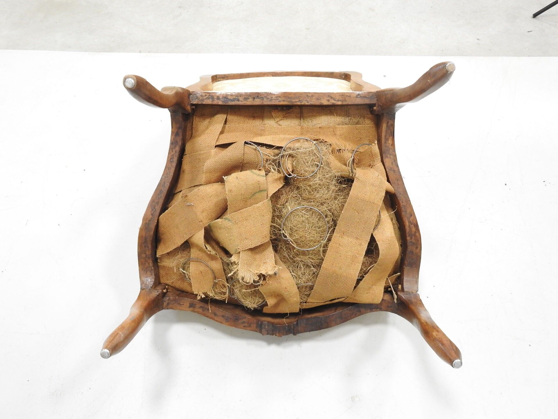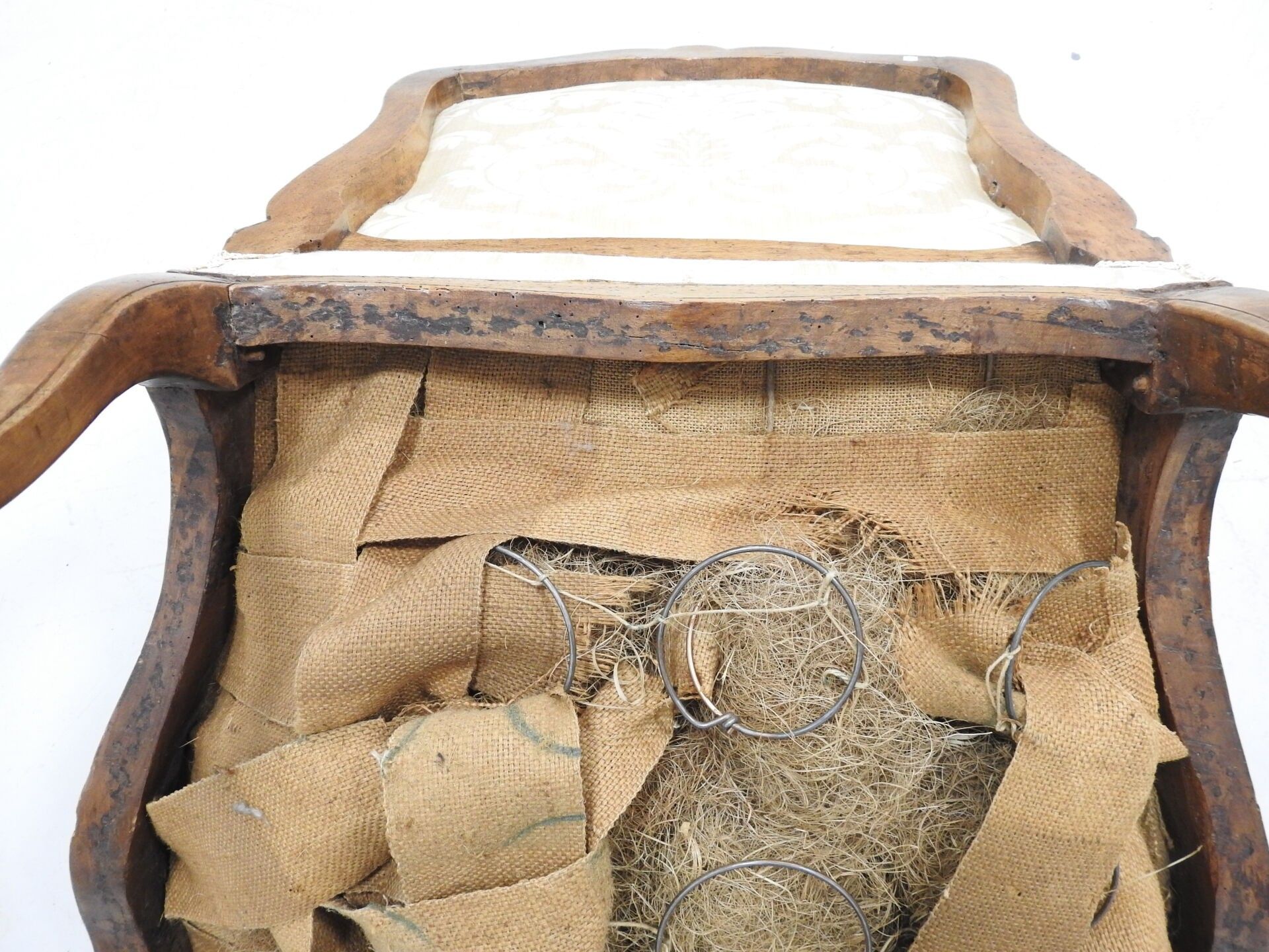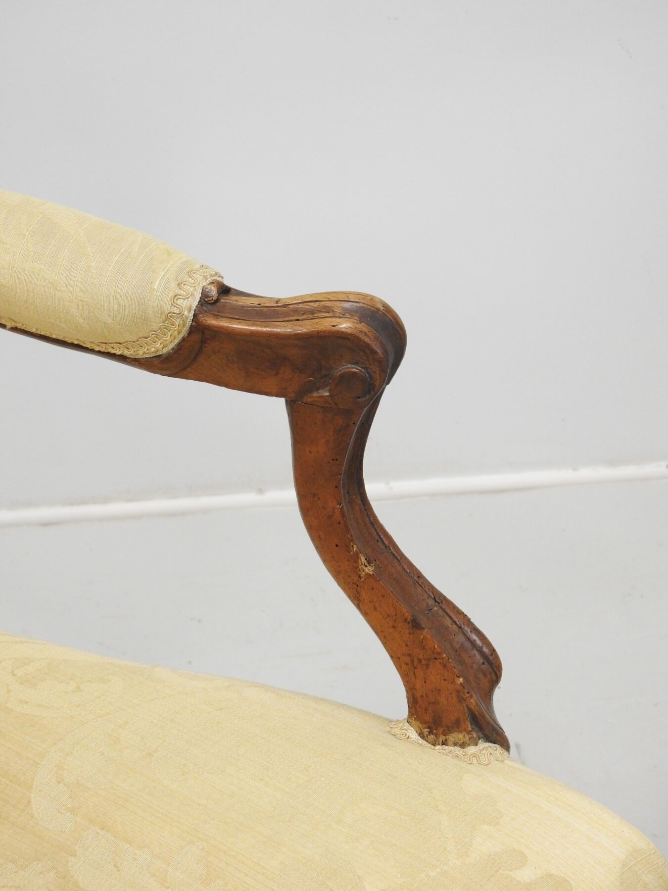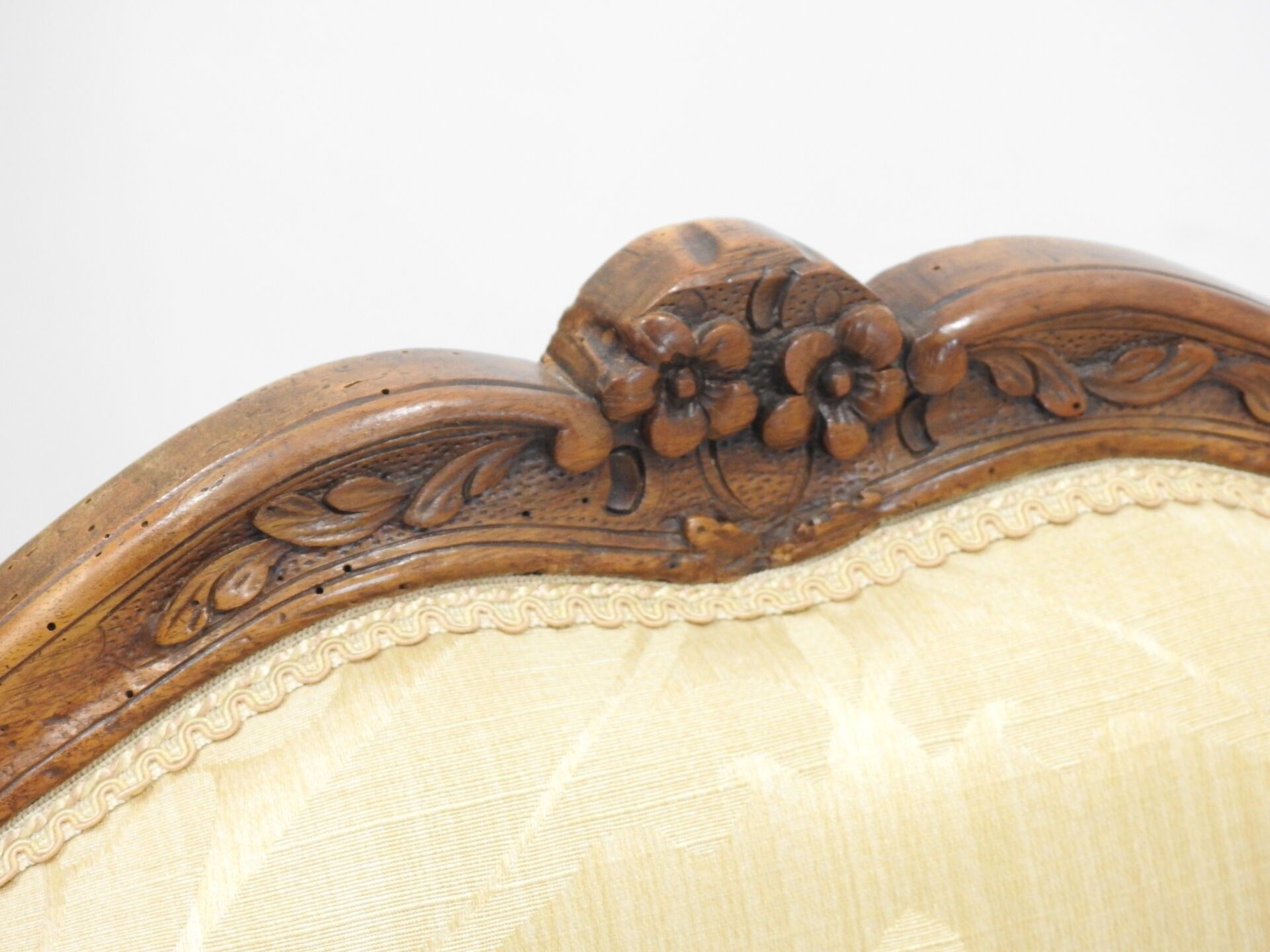 A PAIR OF FLAT-BACKED ARMCHAIRS in moulded natural wood carved with flowers. Louis XV period. 94 x 68 x 52 cm (wear, accident to one armrest and restorations to the legs).