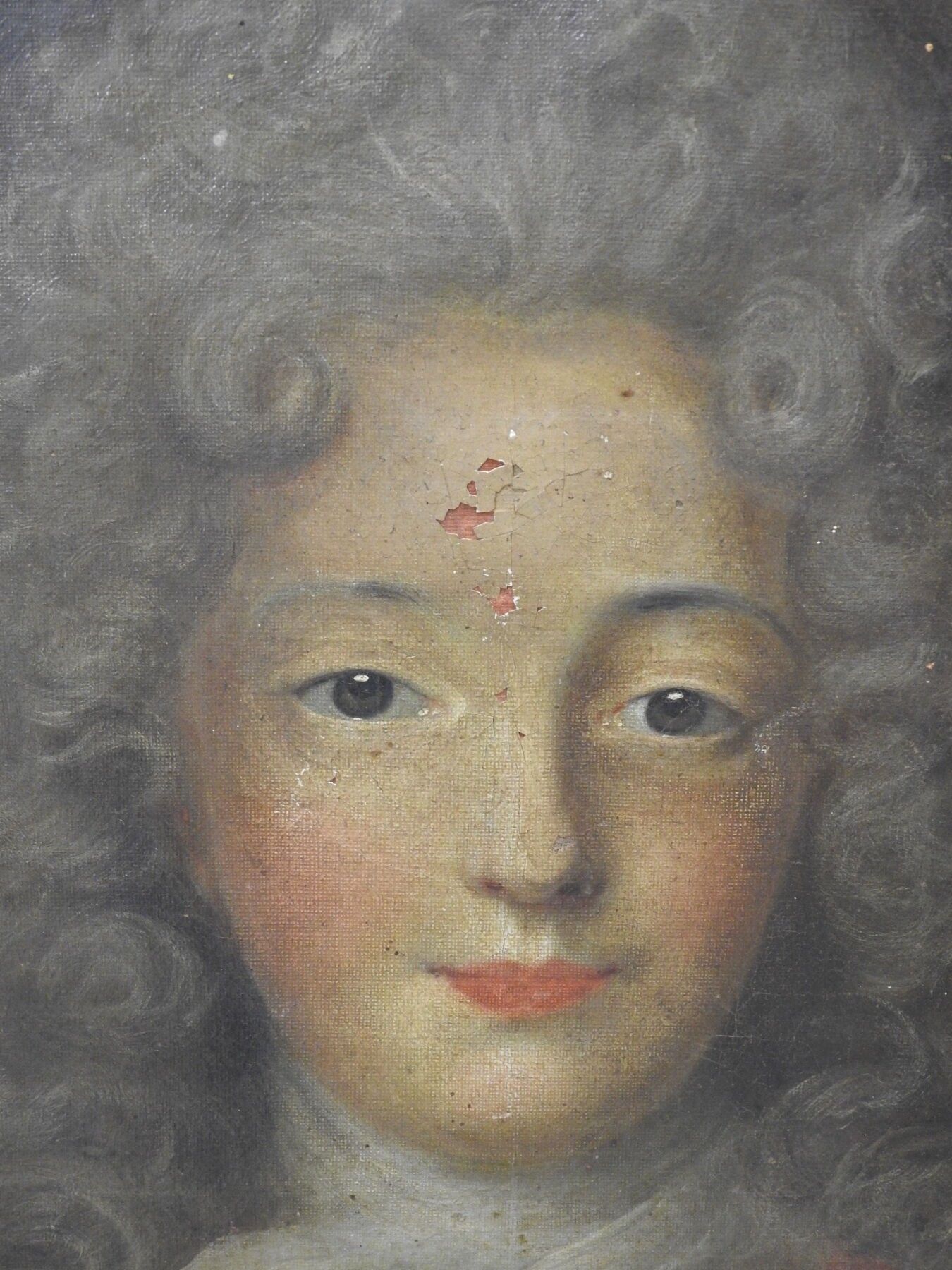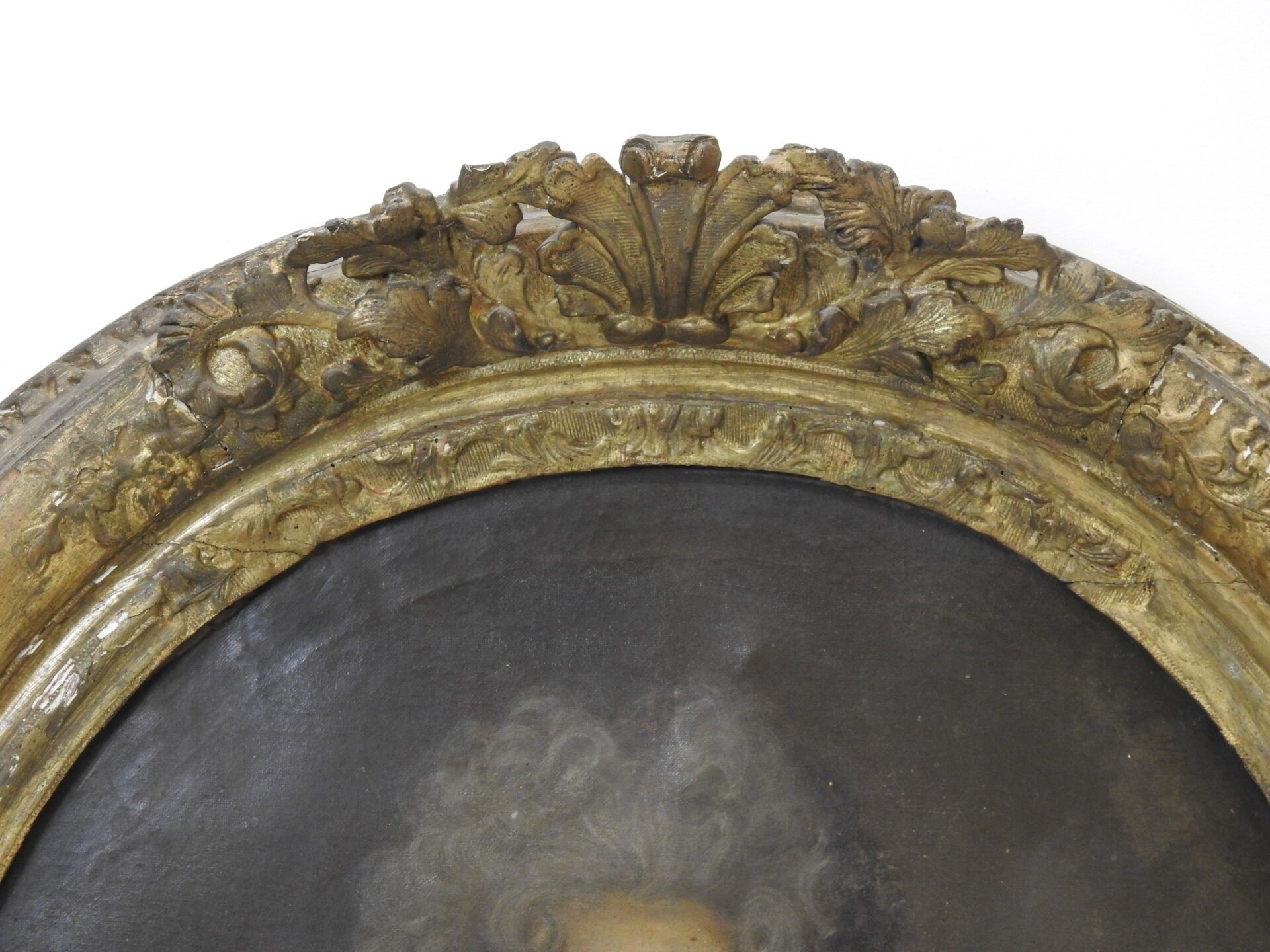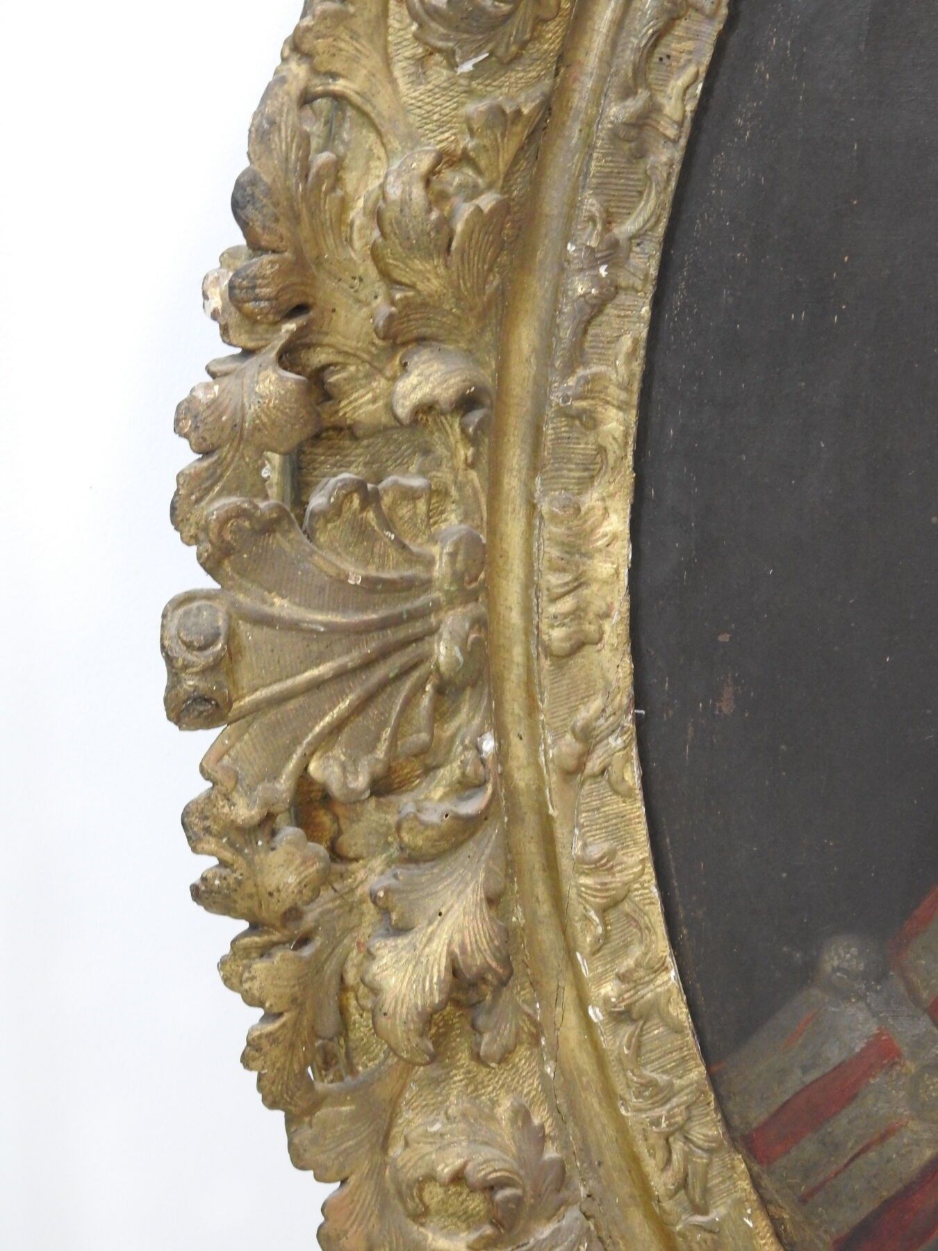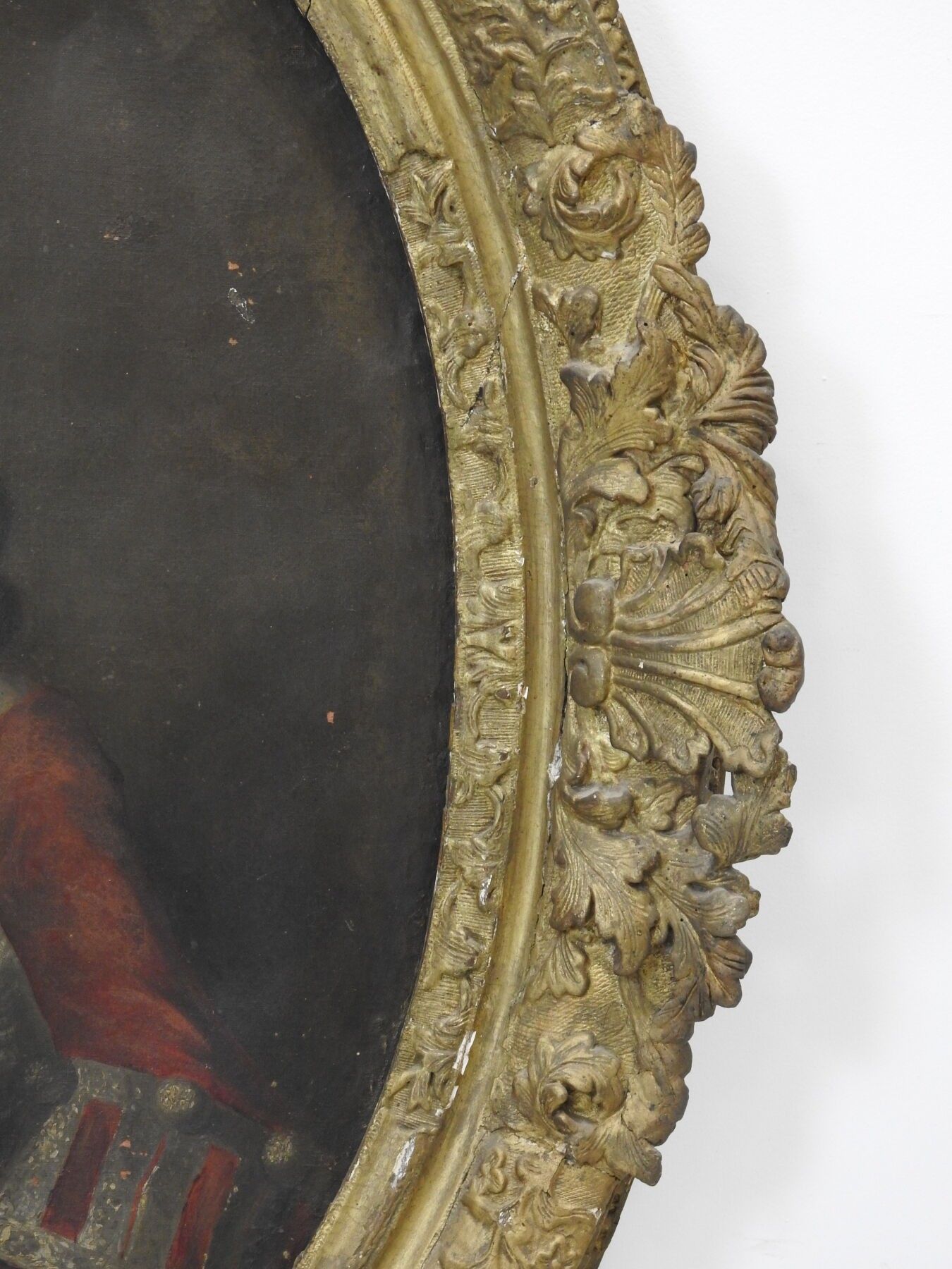 Early 18th century FRENCH school. Portrait of Girault III de Planchoury. Oil on canvas with oval view. Marked annotation at the top. 81.5 x 67 cm. Gilded wood frame decorated with shells from the XVIIIth century. 106 x 90 cm (wear and small lacks to the canvas)