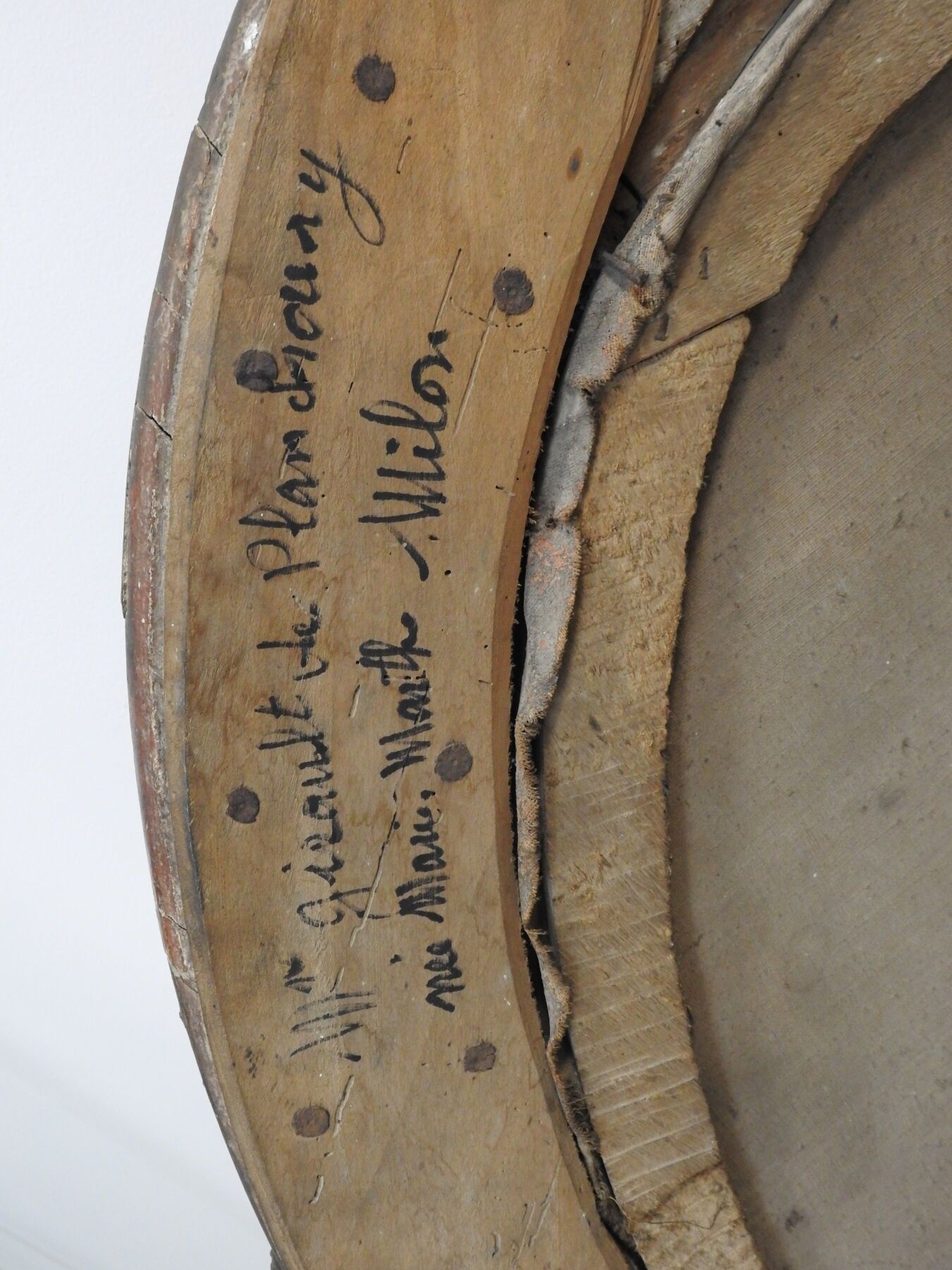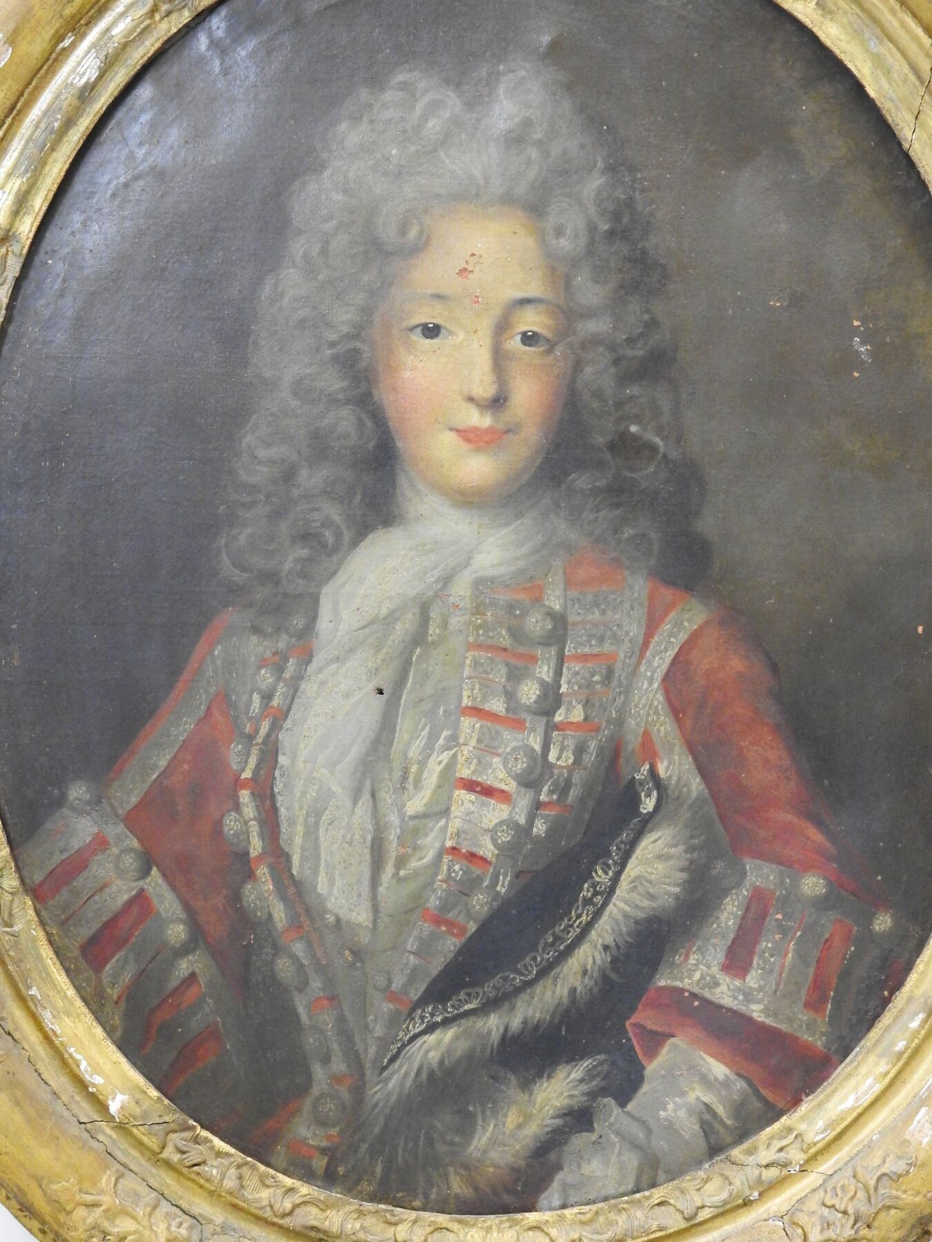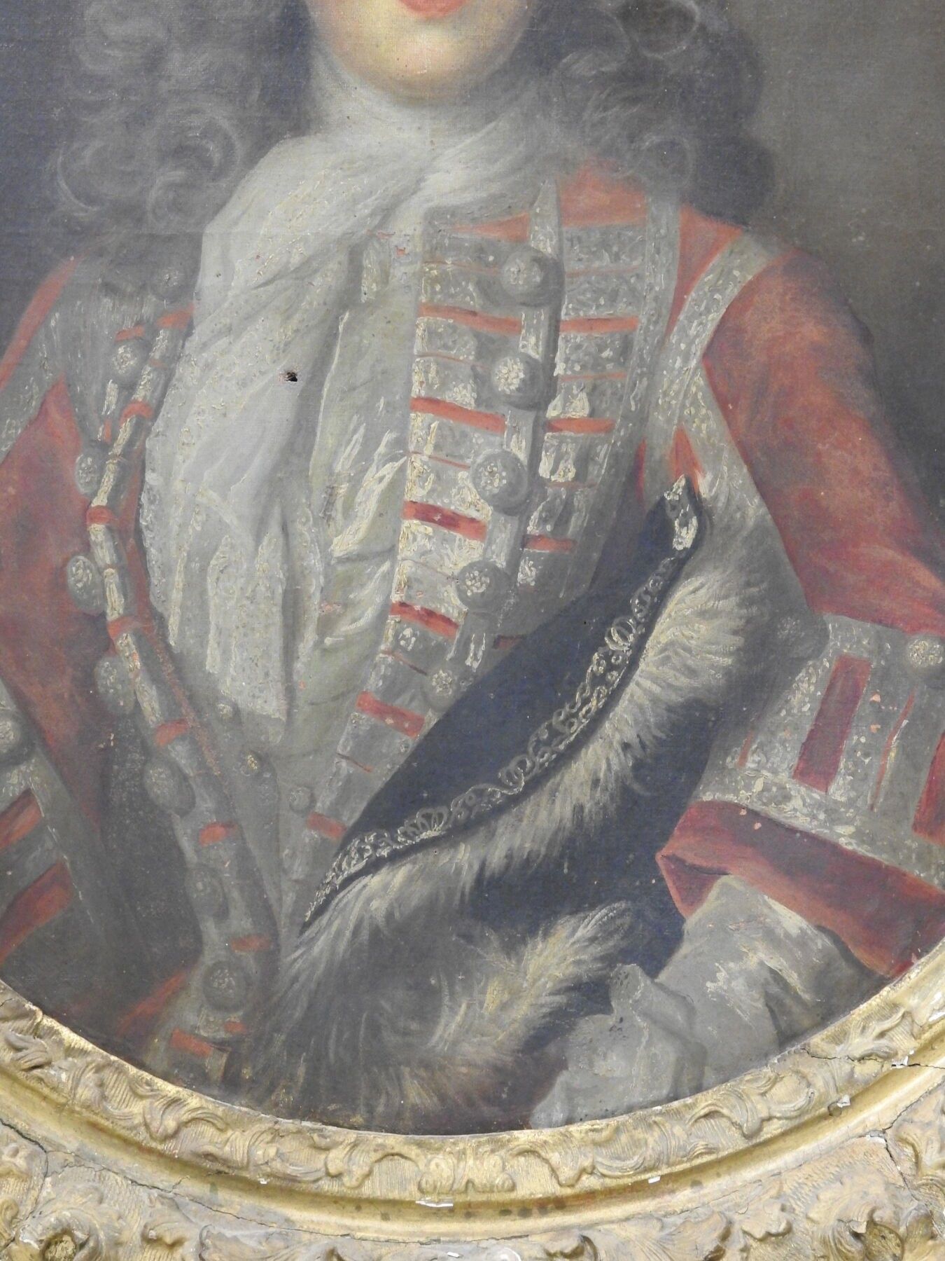 Early 18th century FRENCH school. Portrait of Girault III de Planchoury. Oil on canvas with oval view. Marked annotation at the top. 81.5 x 67 cm. Gilded wood frame decorated with shells from the XVIIIth century. 106 x 90 cm (wear and small lacks to the canvas)