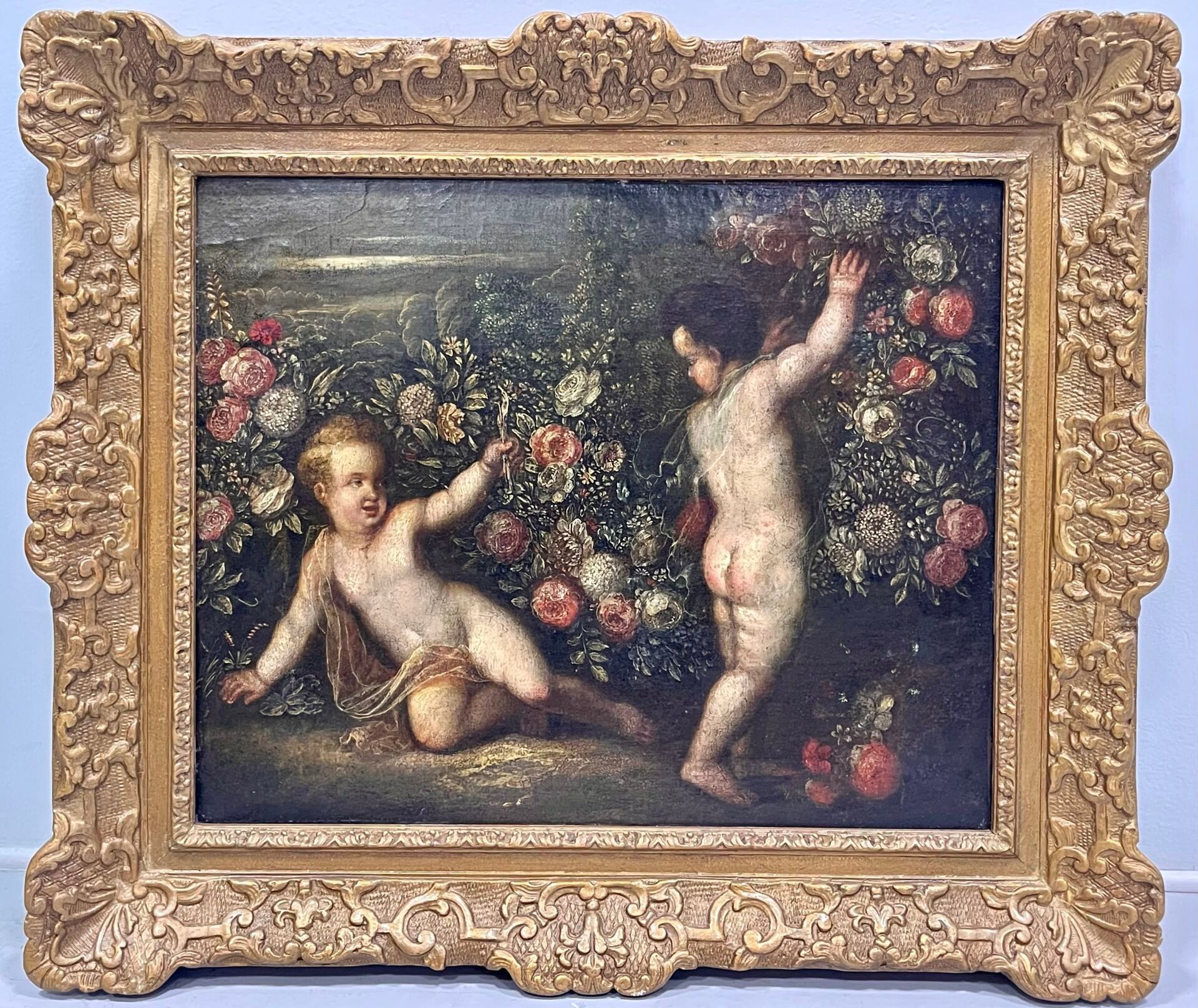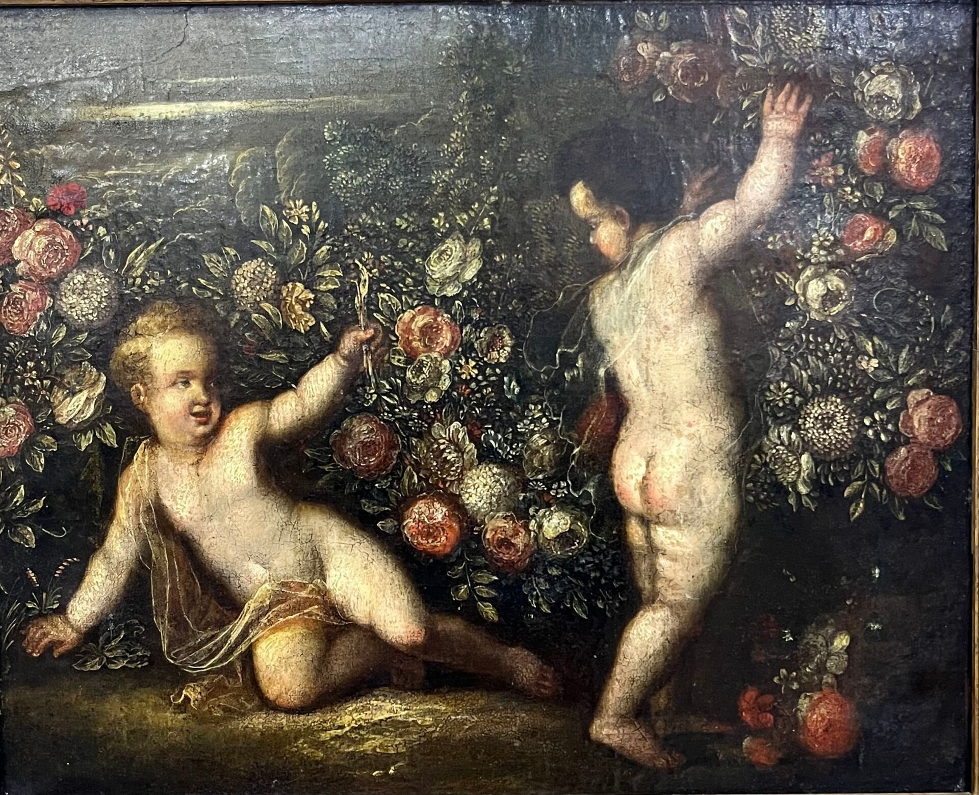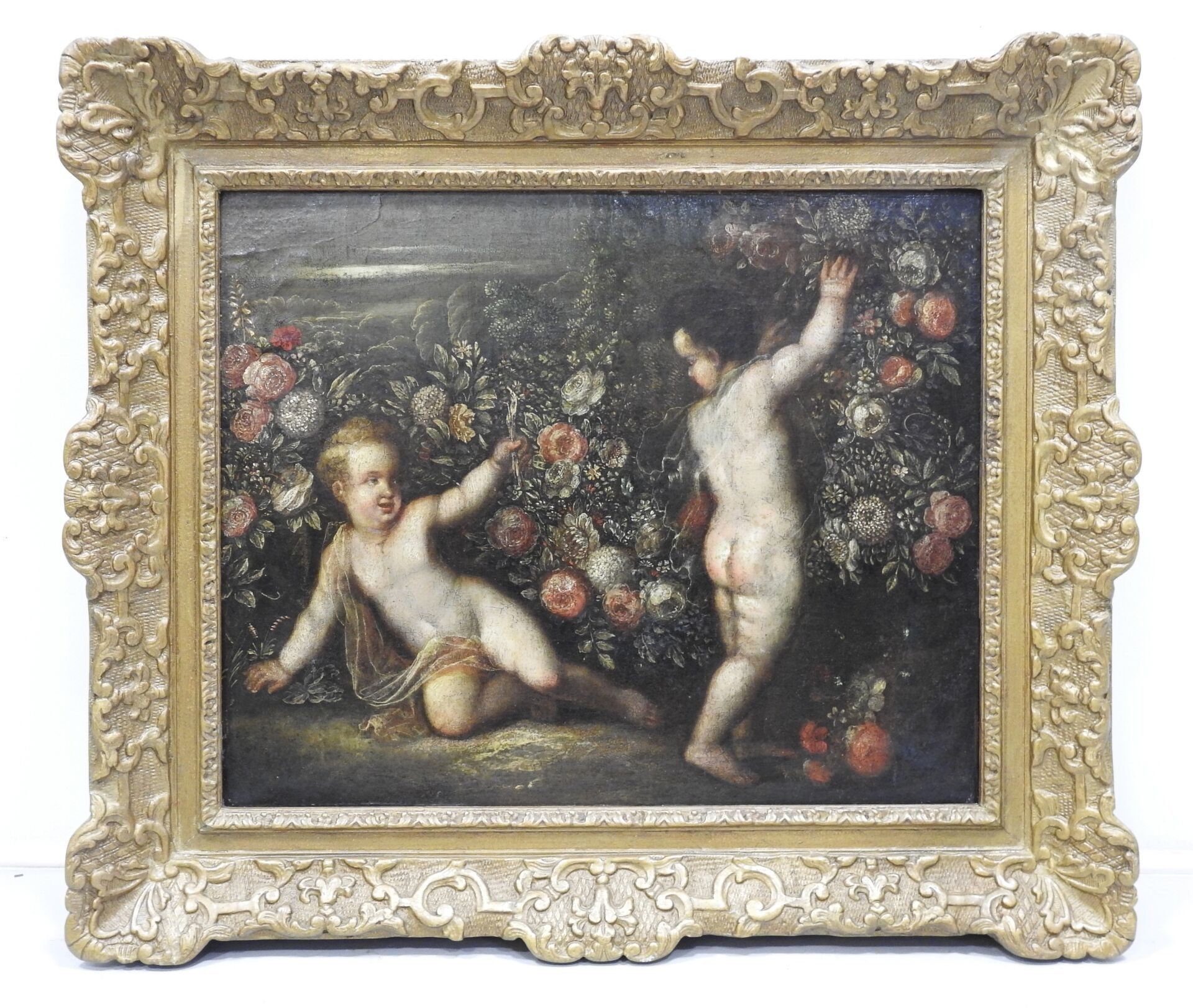 FLEMISH SCHOOL circa 1700: Two putti in front of a flowering grove. Canvas. Old label on the reverse. 39 x 48 cm.