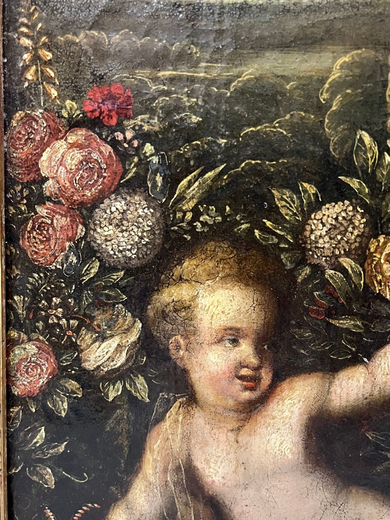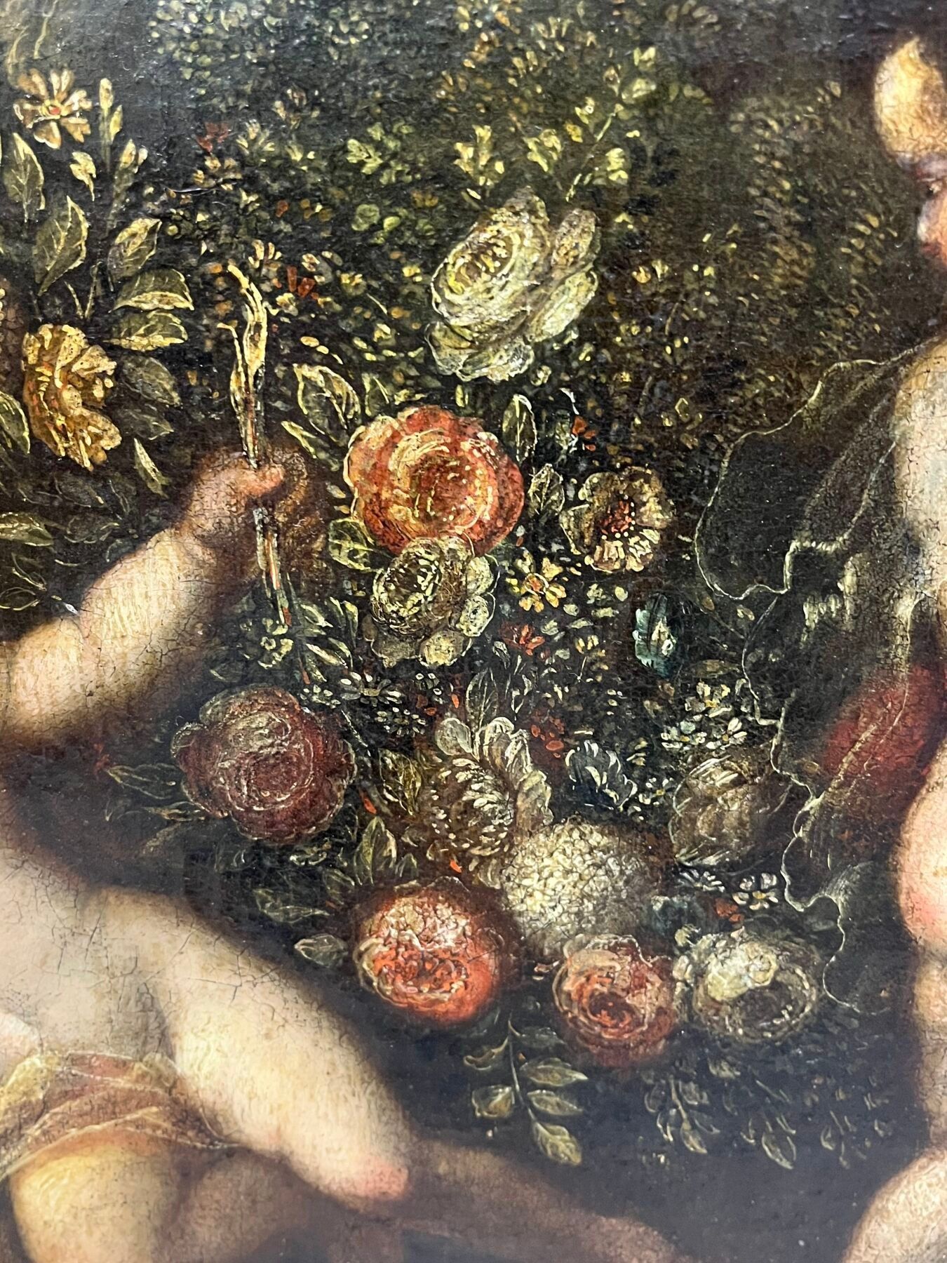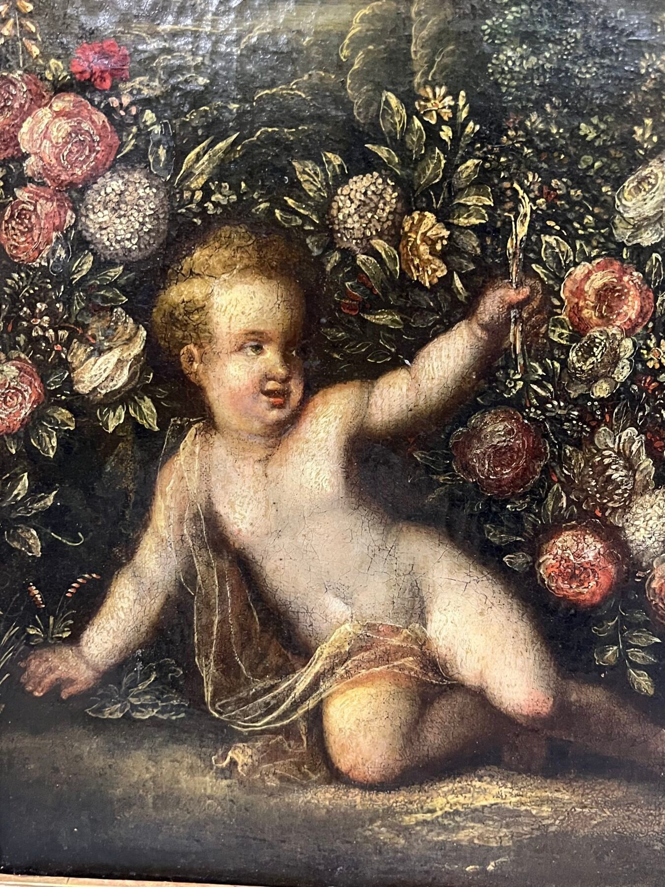 FLEMISH SCHOOL circa 1700: Two putti in front of a flowering grove. Canvas. Old label on the reverse. 39 x 48 cm.