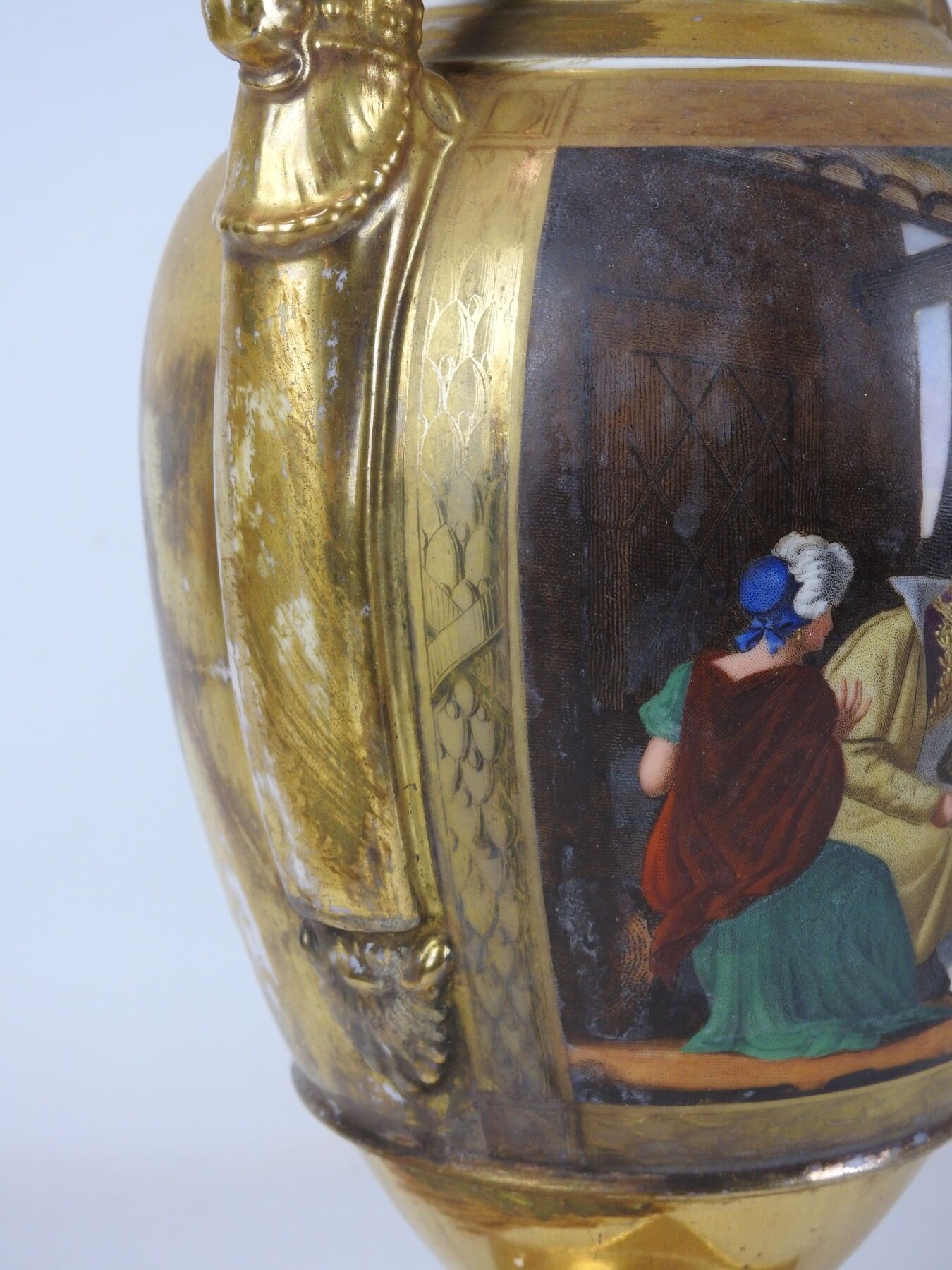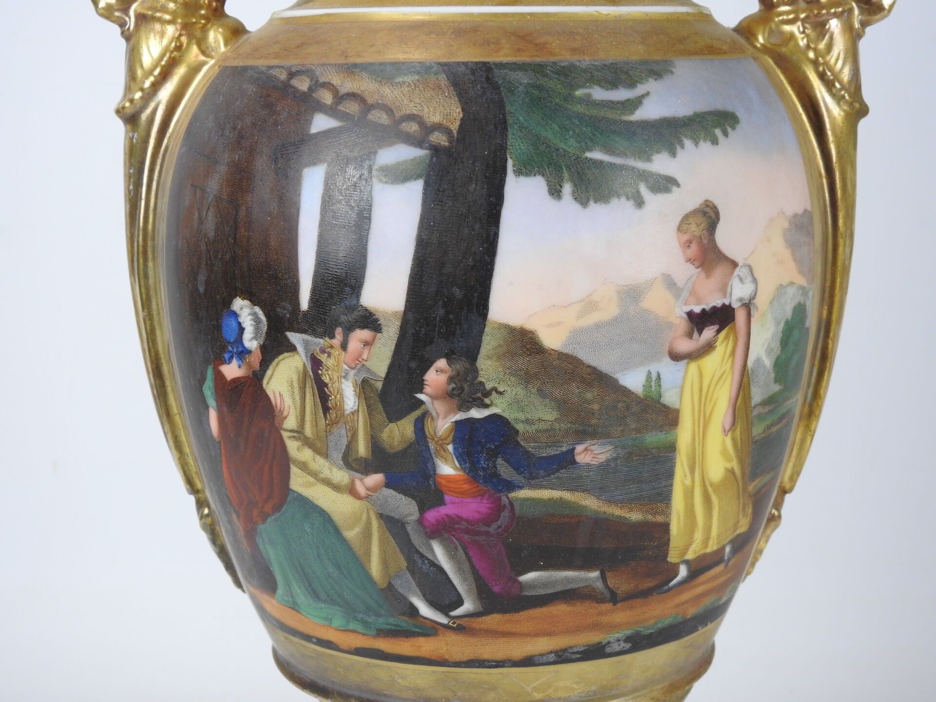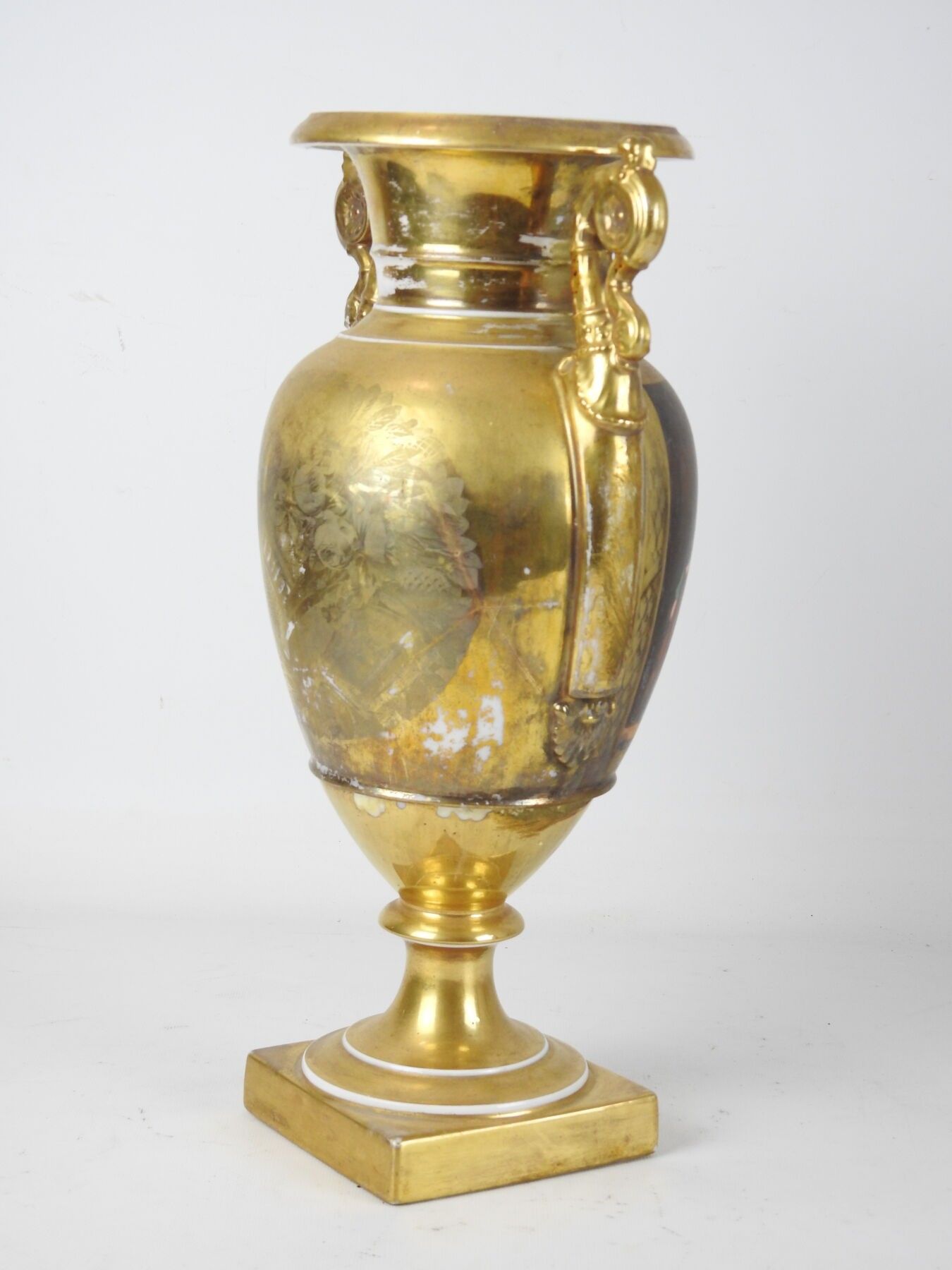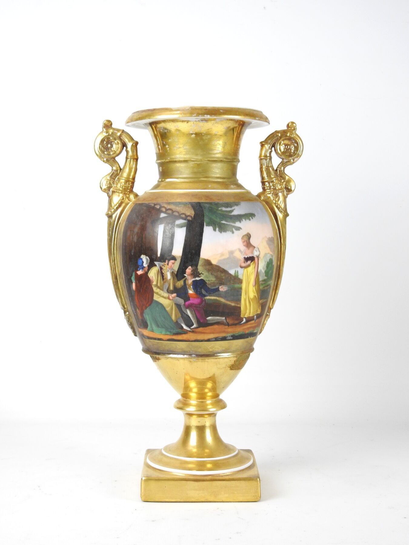 PARIS : Porcelain baluster vase on pedestal, the handles with scrolls, the body with polychrome decoration of a scene of characters on gilded bottom. Circa 1840. Height 42 cm. Worn, restored and missing.