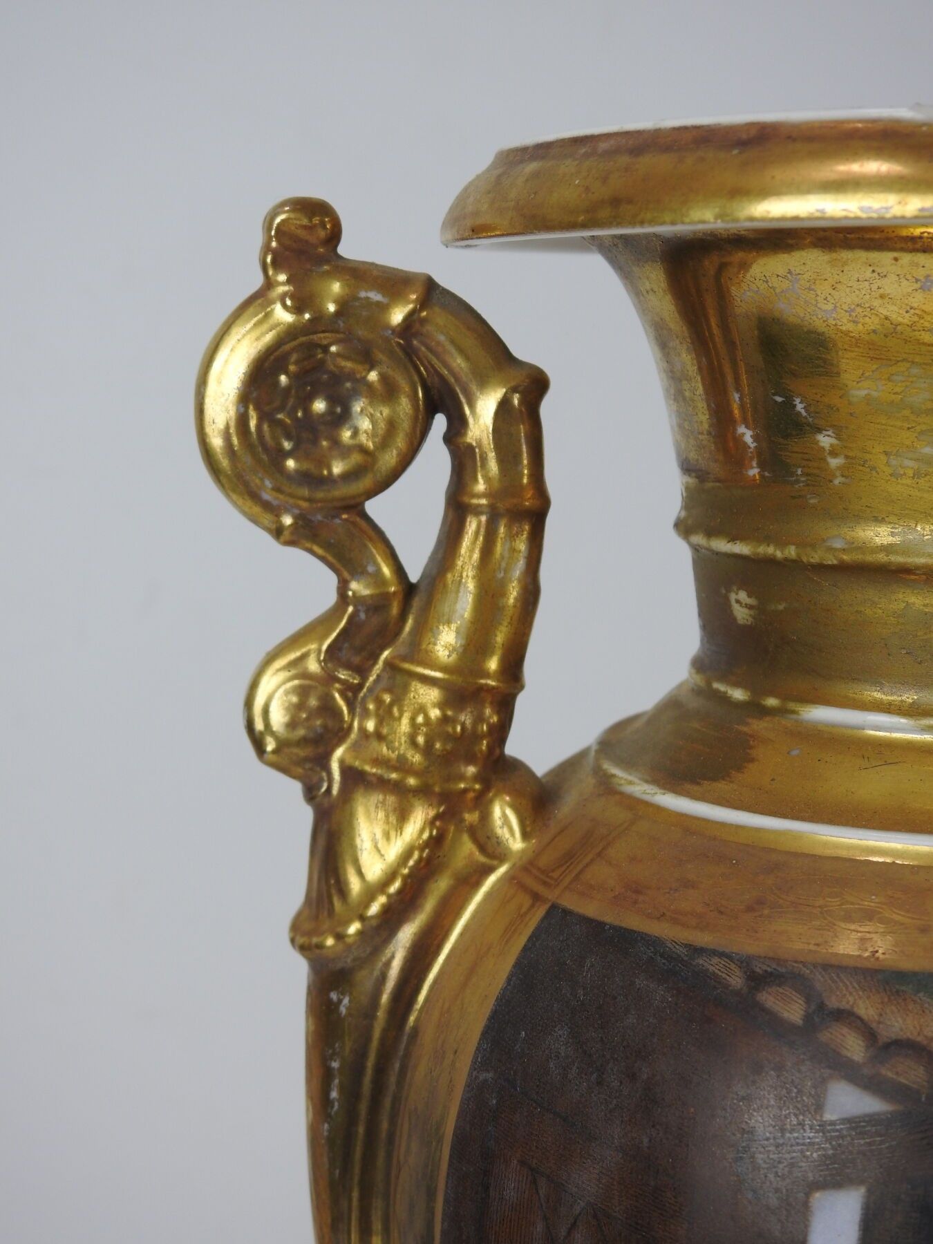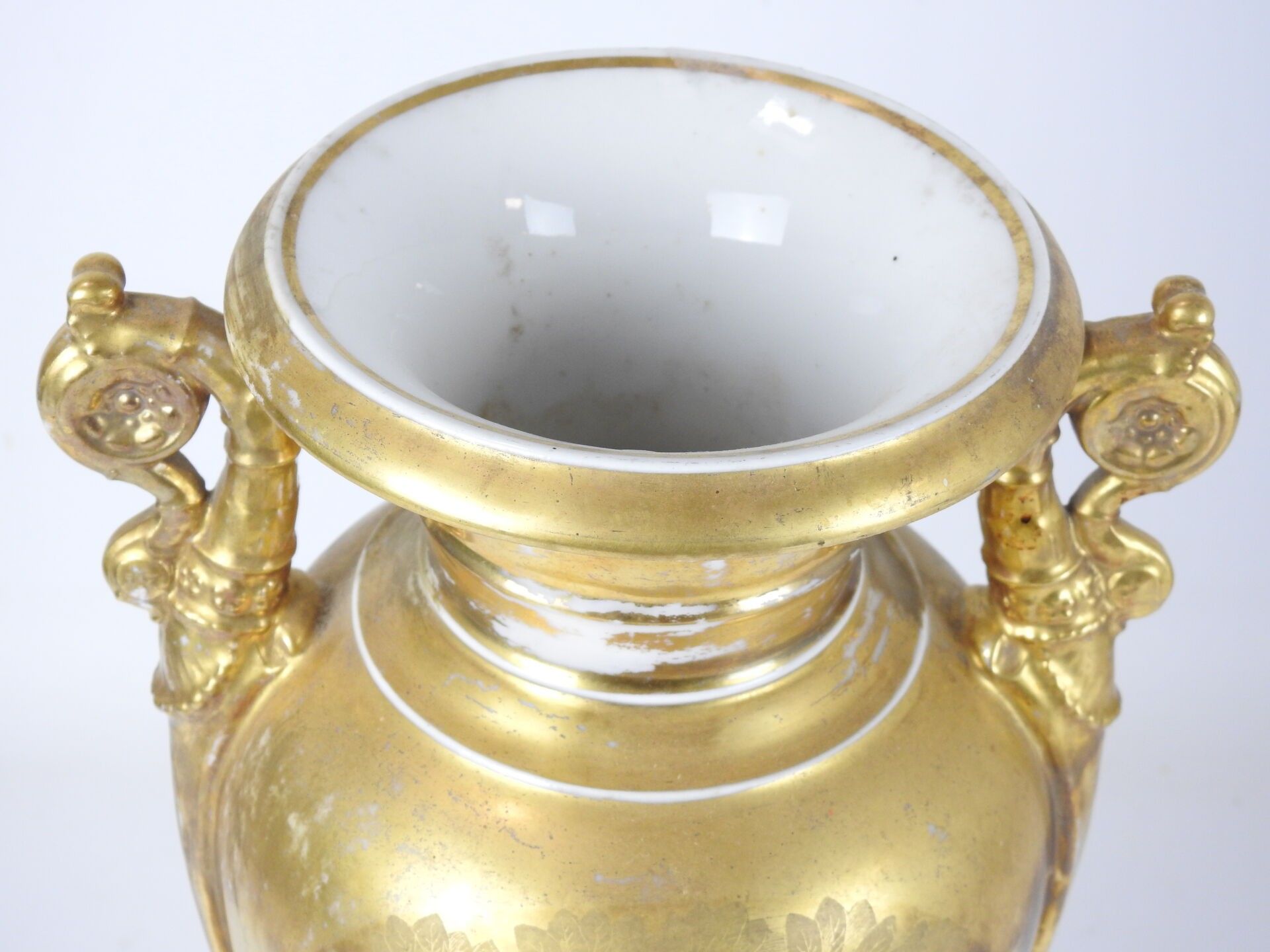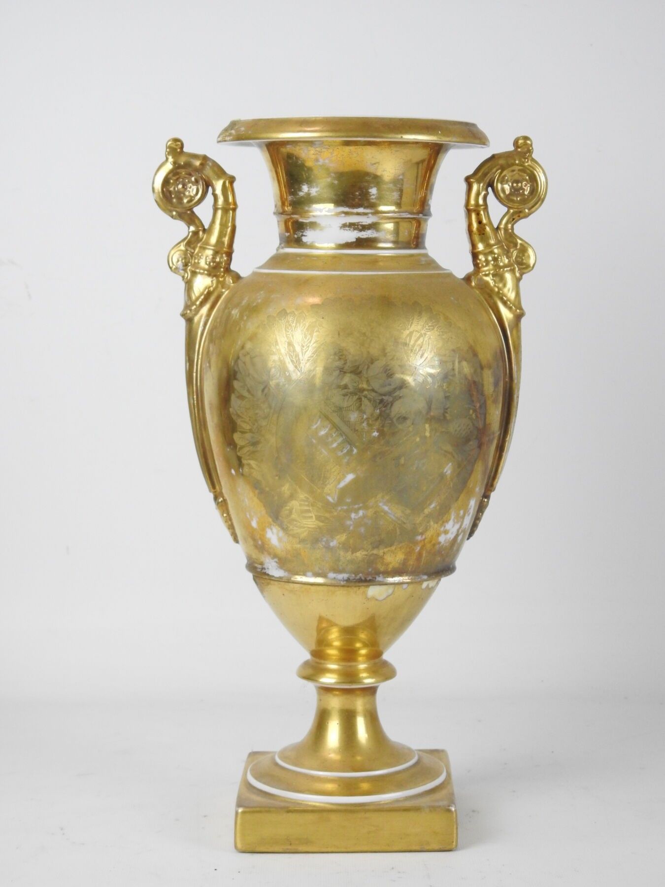 PARIS : Porcelain baluster vase on pedestal, the handles with scrolls, the body with polychrome decoration of a scene of characters on gilded bottom. Circa 1840. Height 42 cm. Worn, restored and missing.