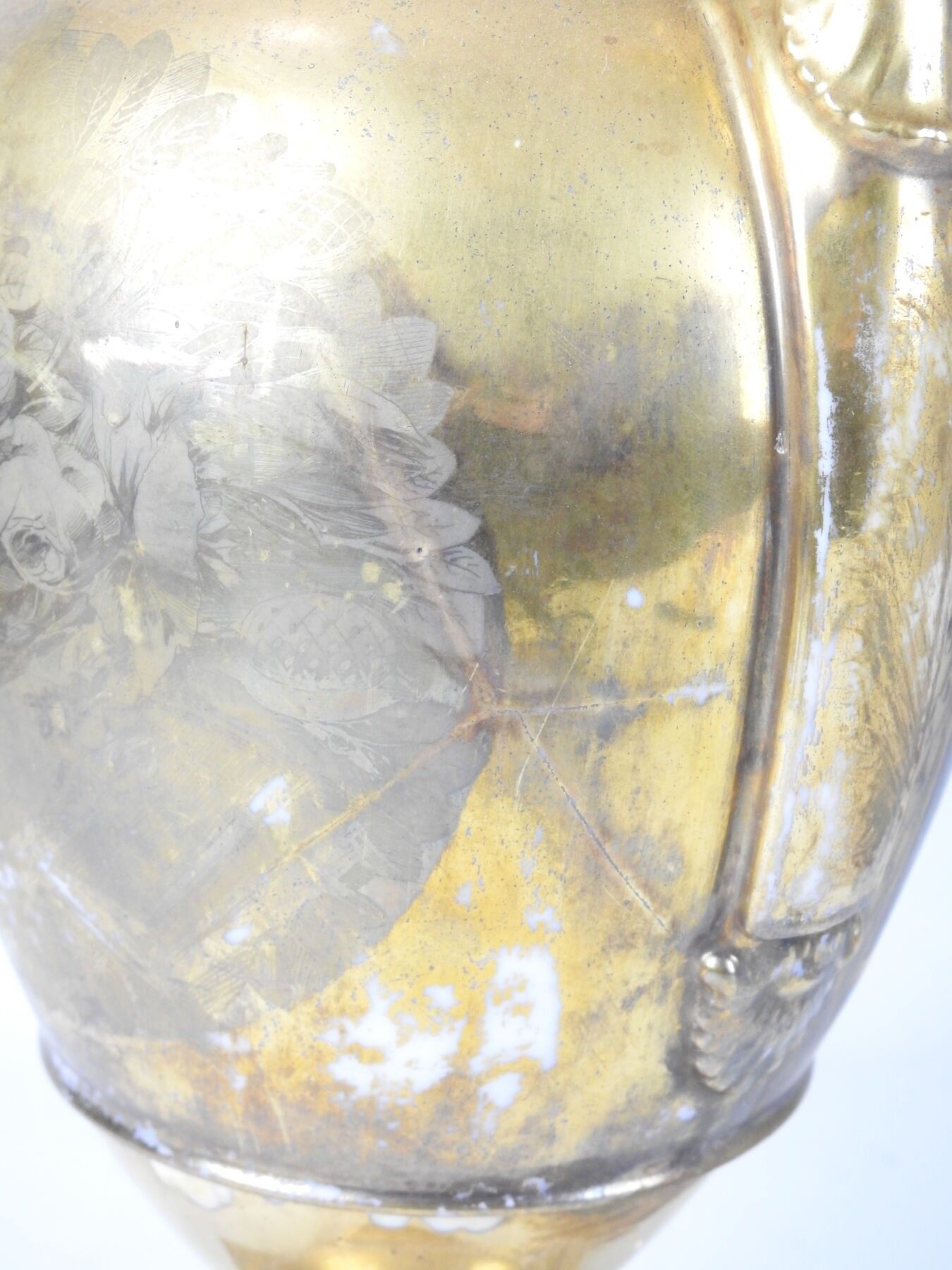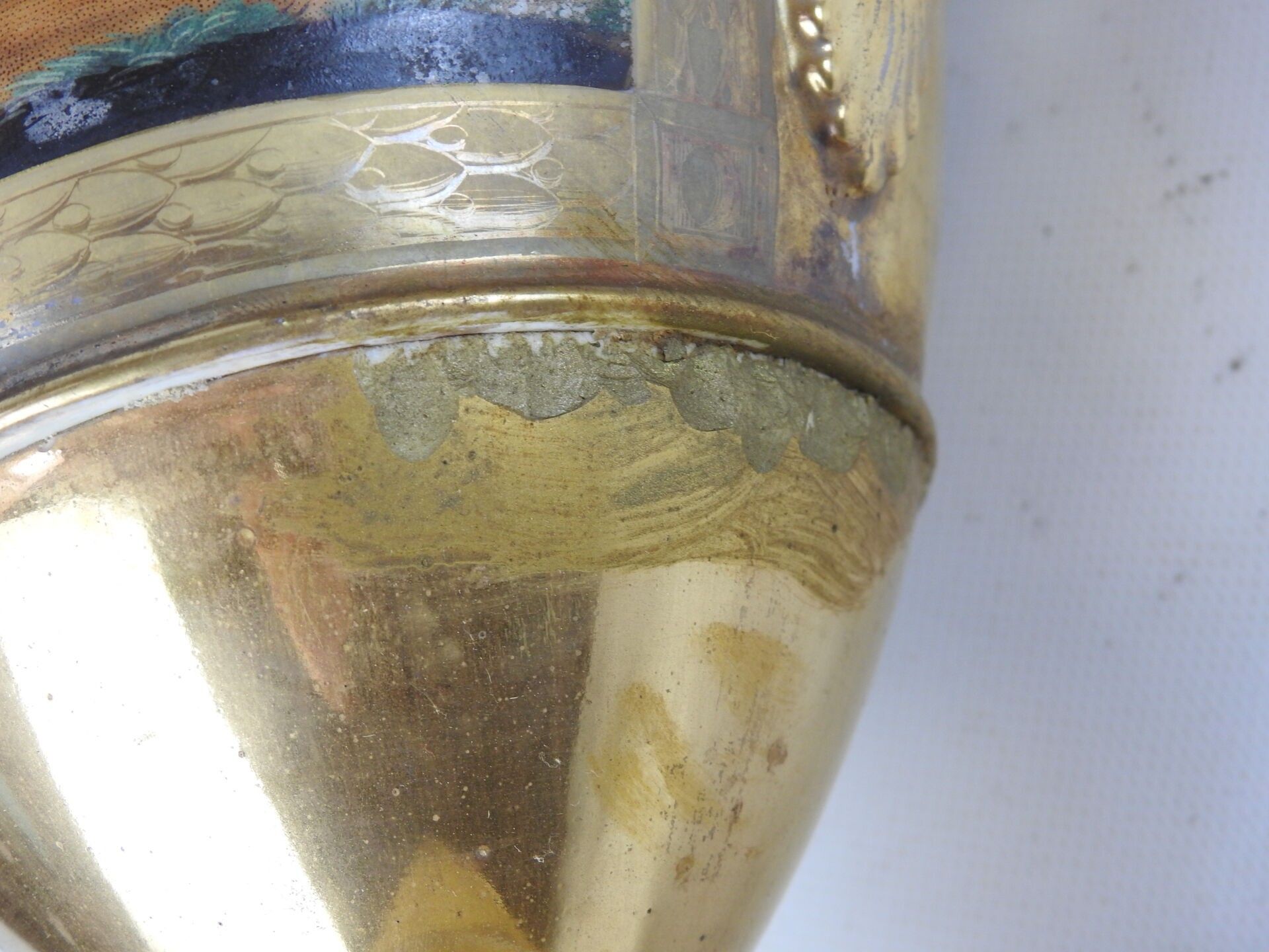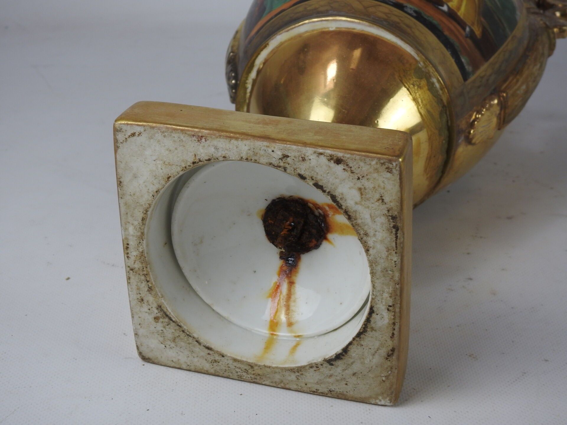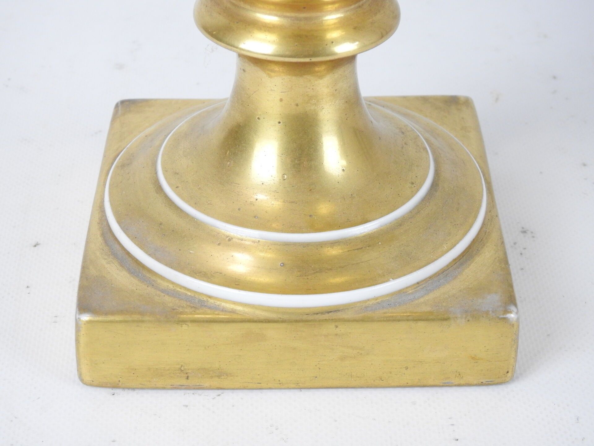 PARIS : Porcelain baluster vase on pedestal, the handles with scrolls, the body with polychrome decoration of a scene of characters on gilded bottom. Circa 1840. Height 42 cm. Worn, restored and missing.