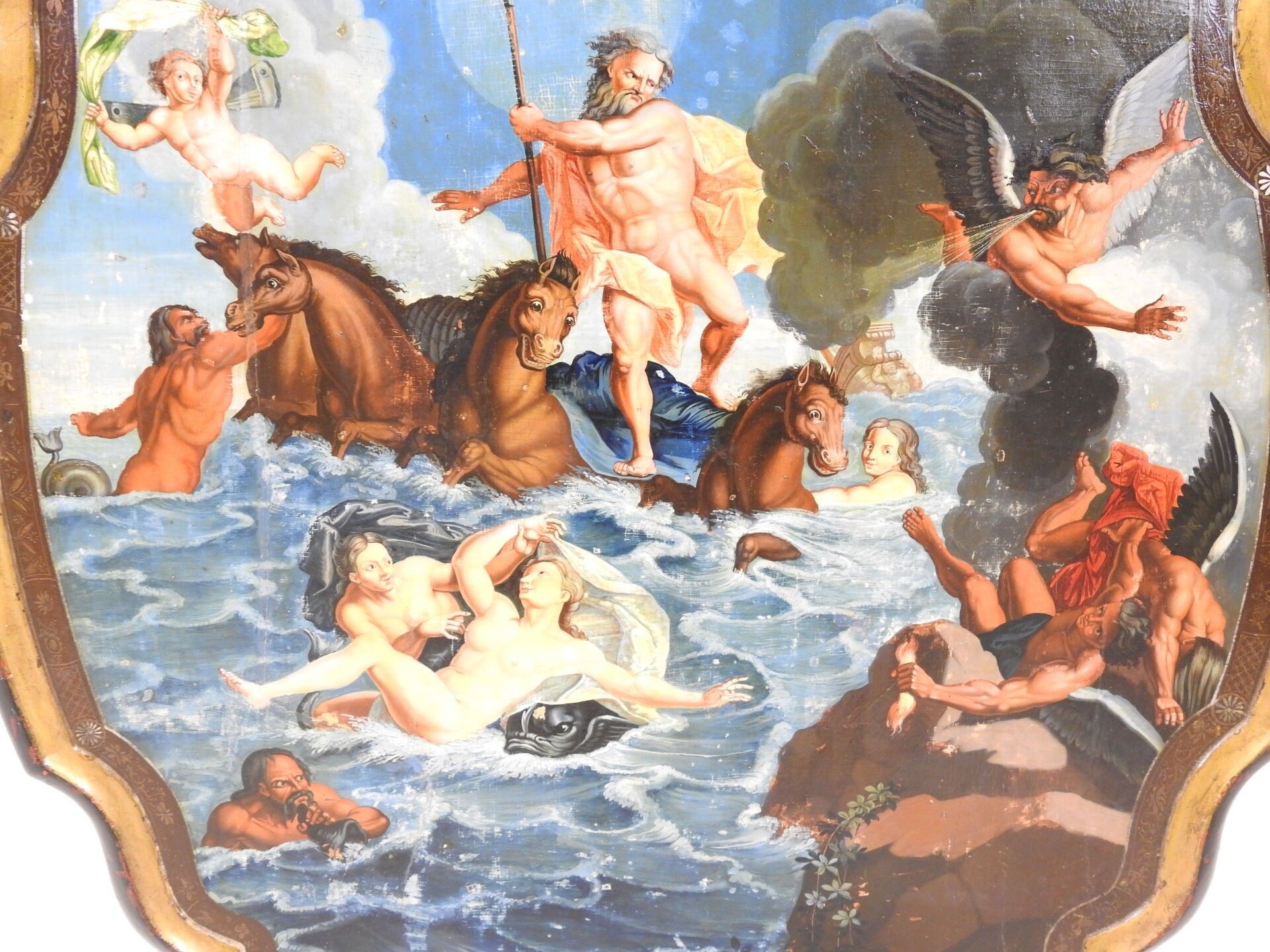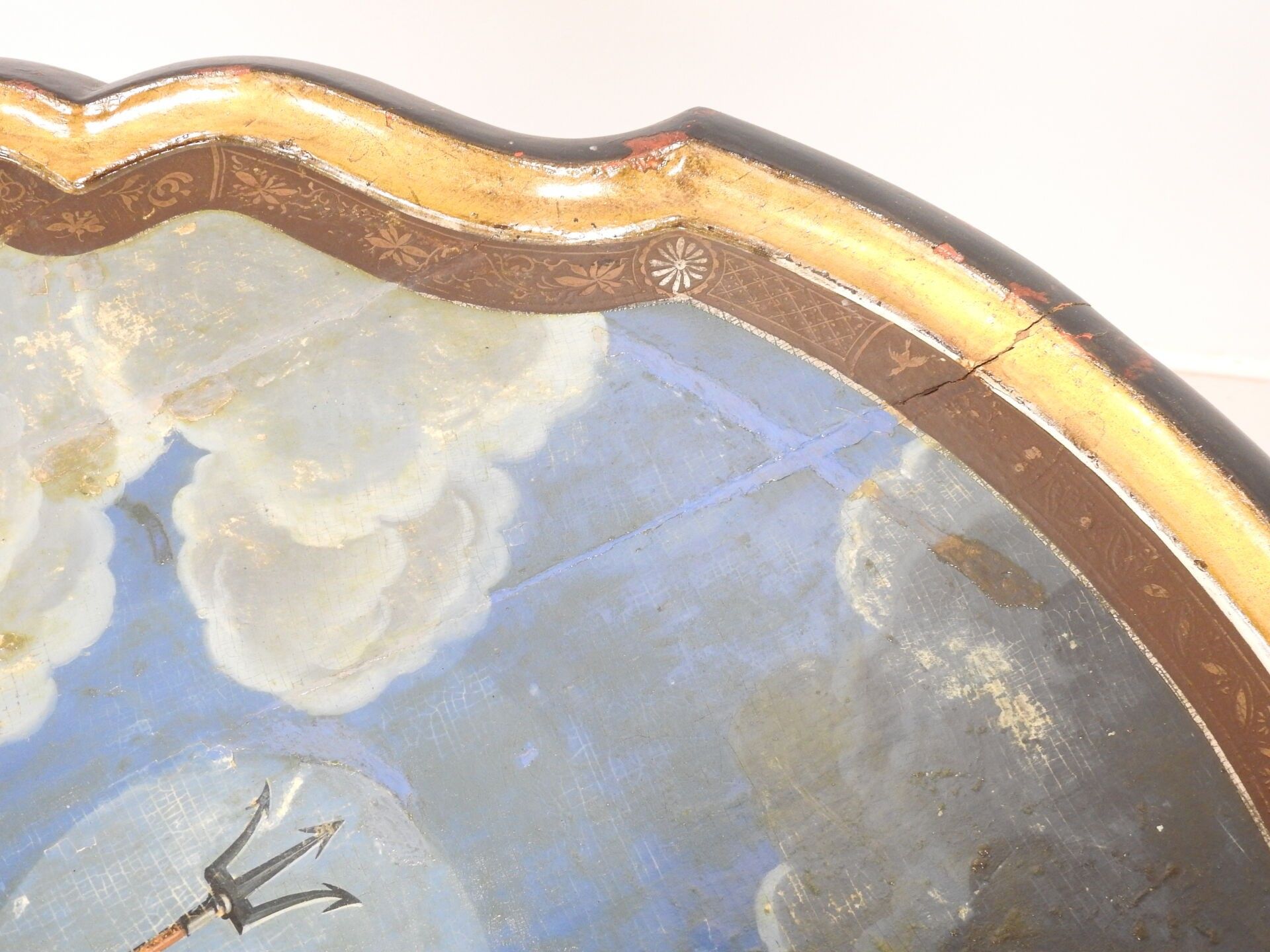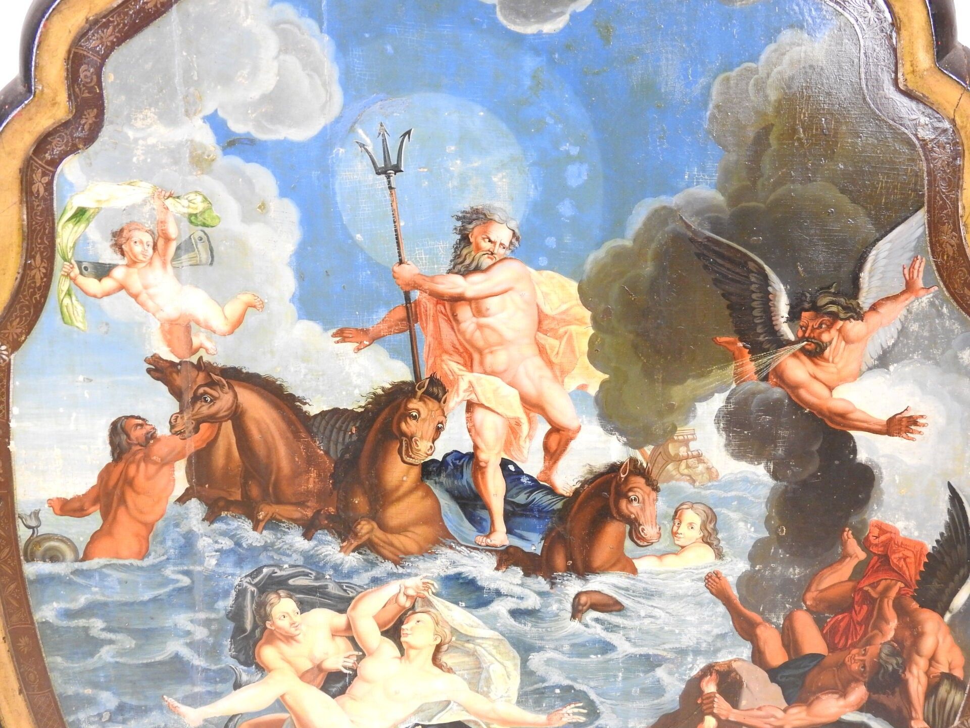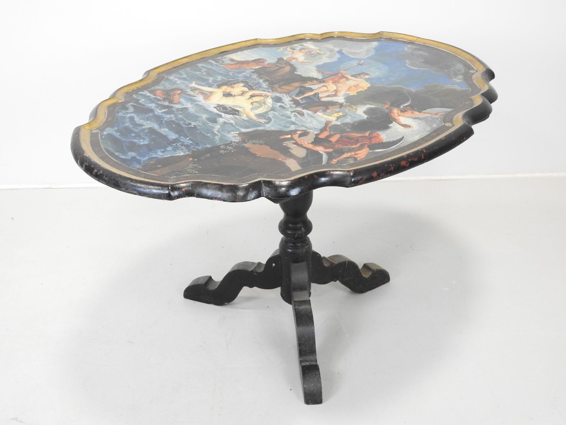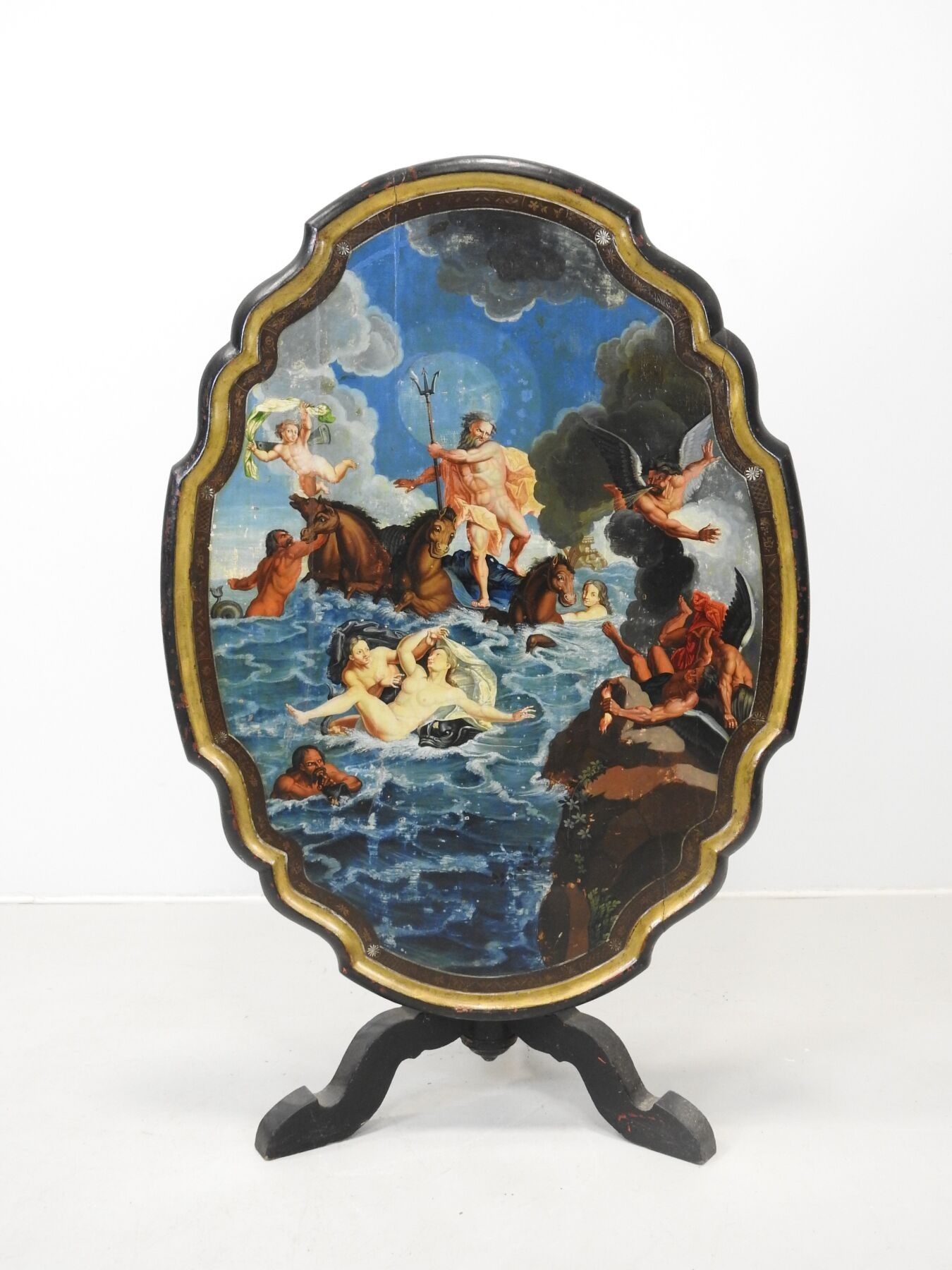 A three-legged scrolled tilt-top GUERIDON with a painted mythological scene depicting Neptune and Venus. Late 19th century. 70 x 120 x 86 cm (wear)
