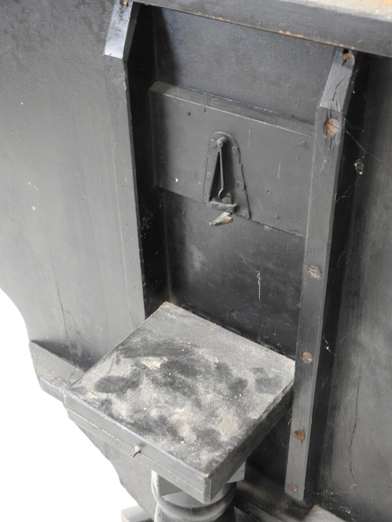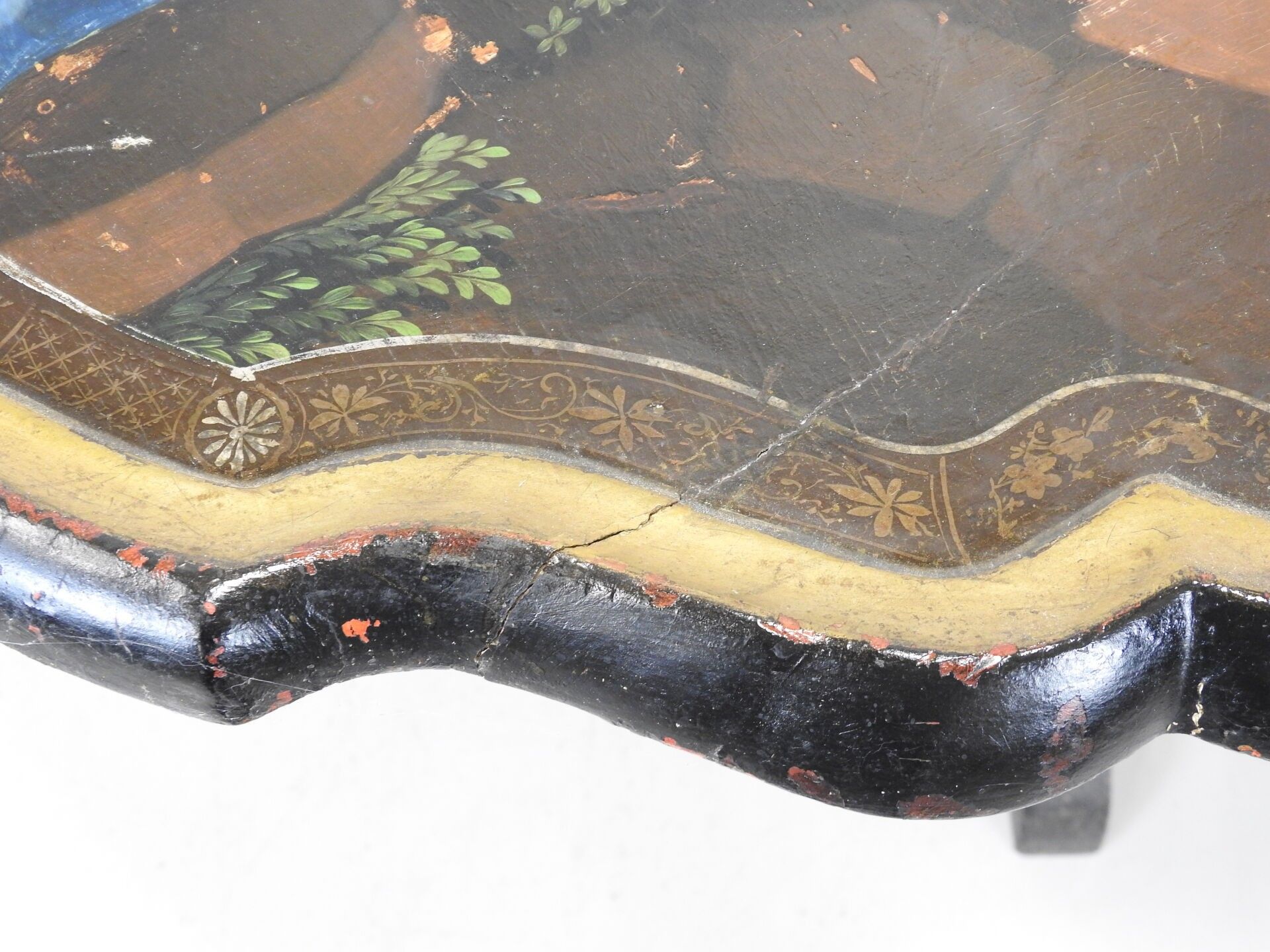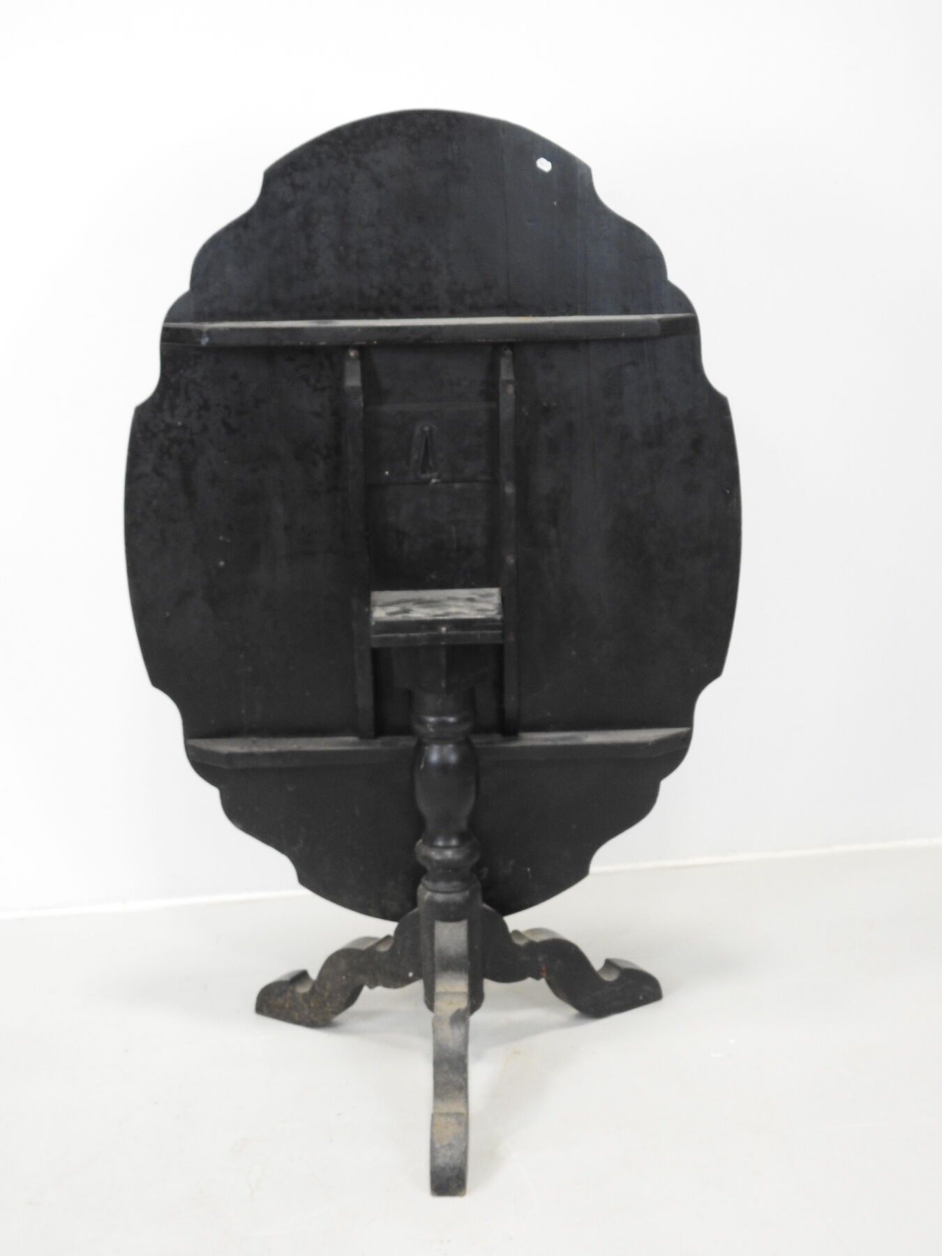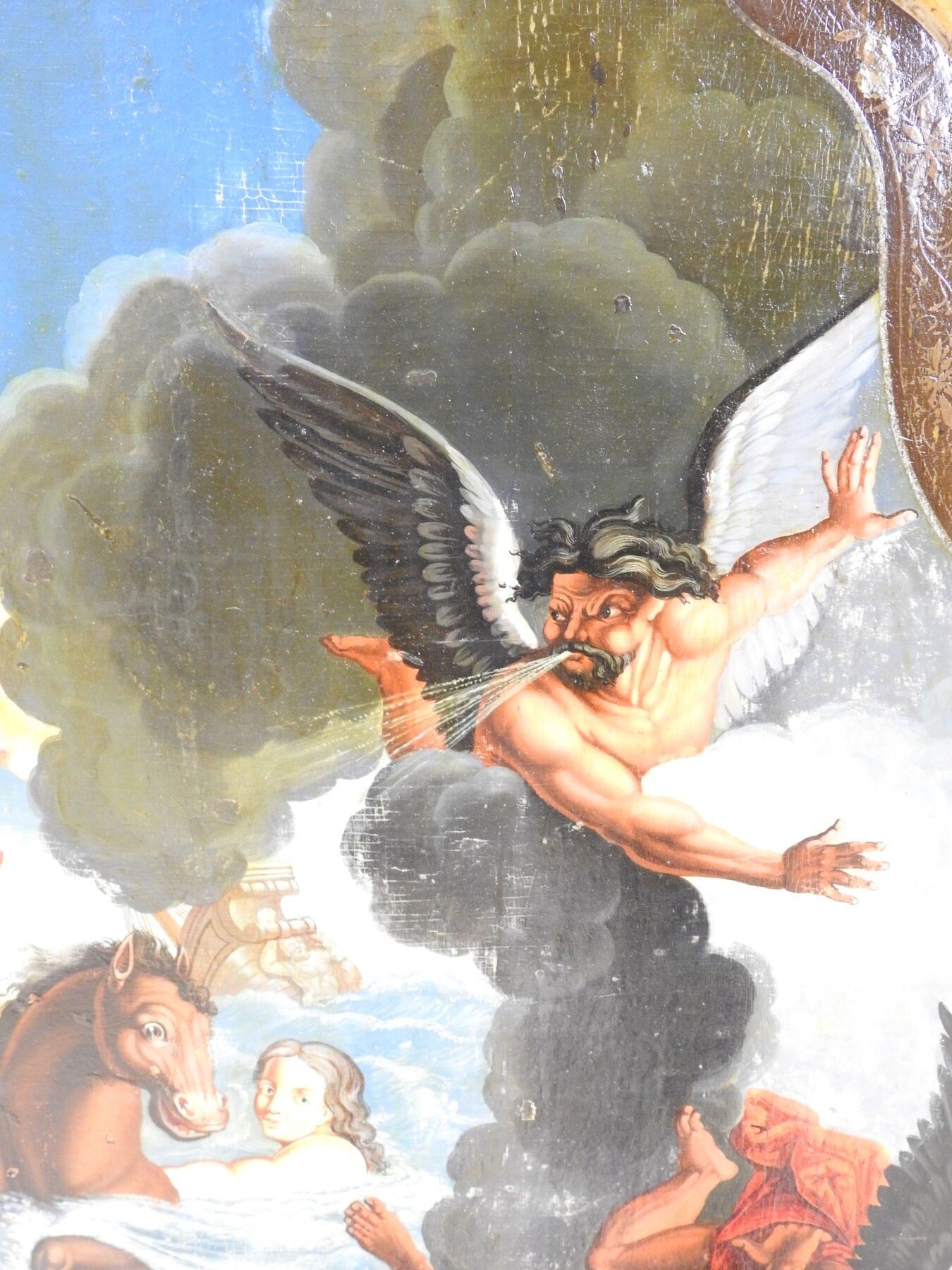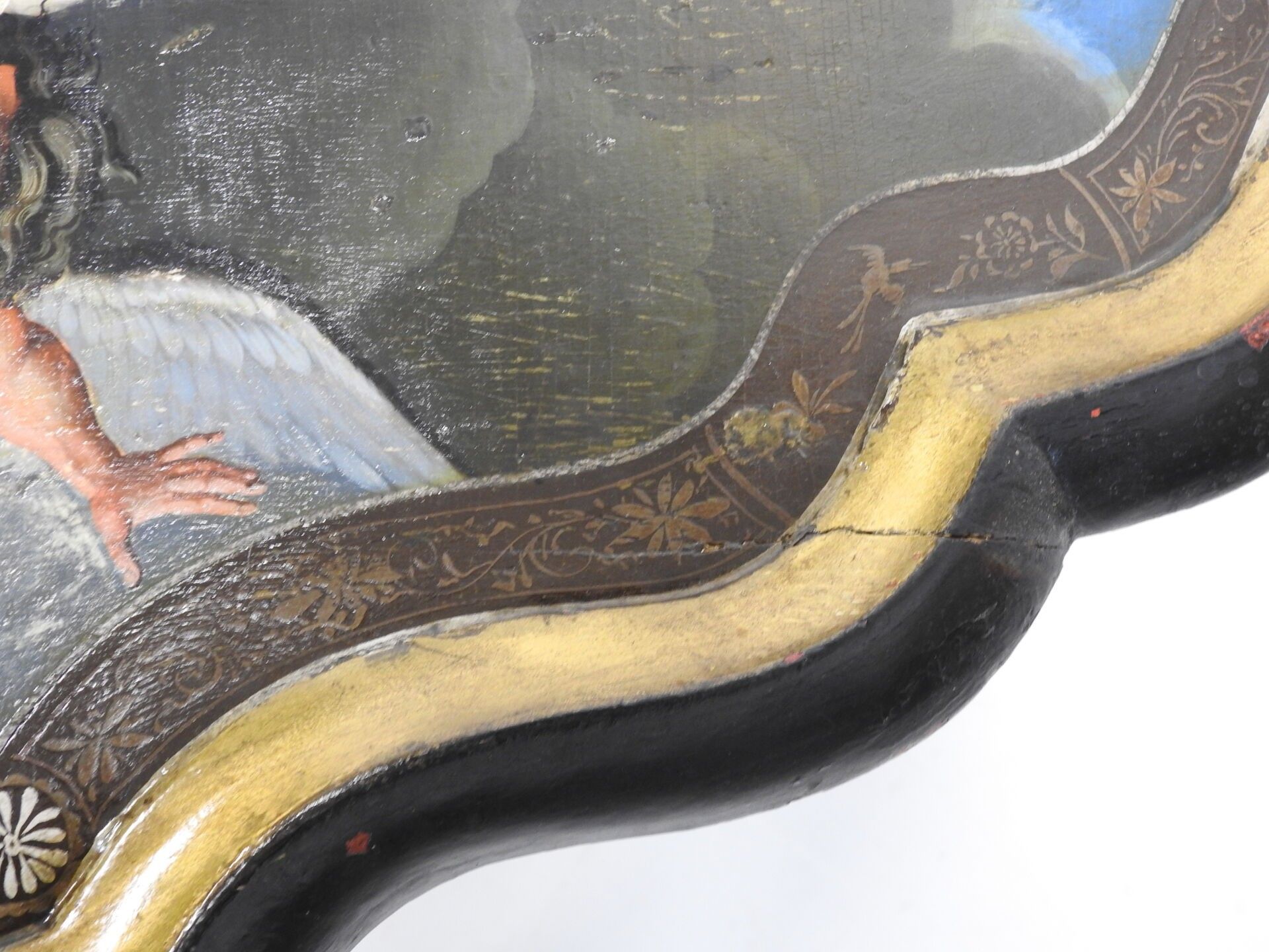 A three-legged scrolled tilt-top GUERIDON with a painted mythological scene depicting Neptune and Venus. Late 19th century. 70 x 120 x 86 cm (wear)