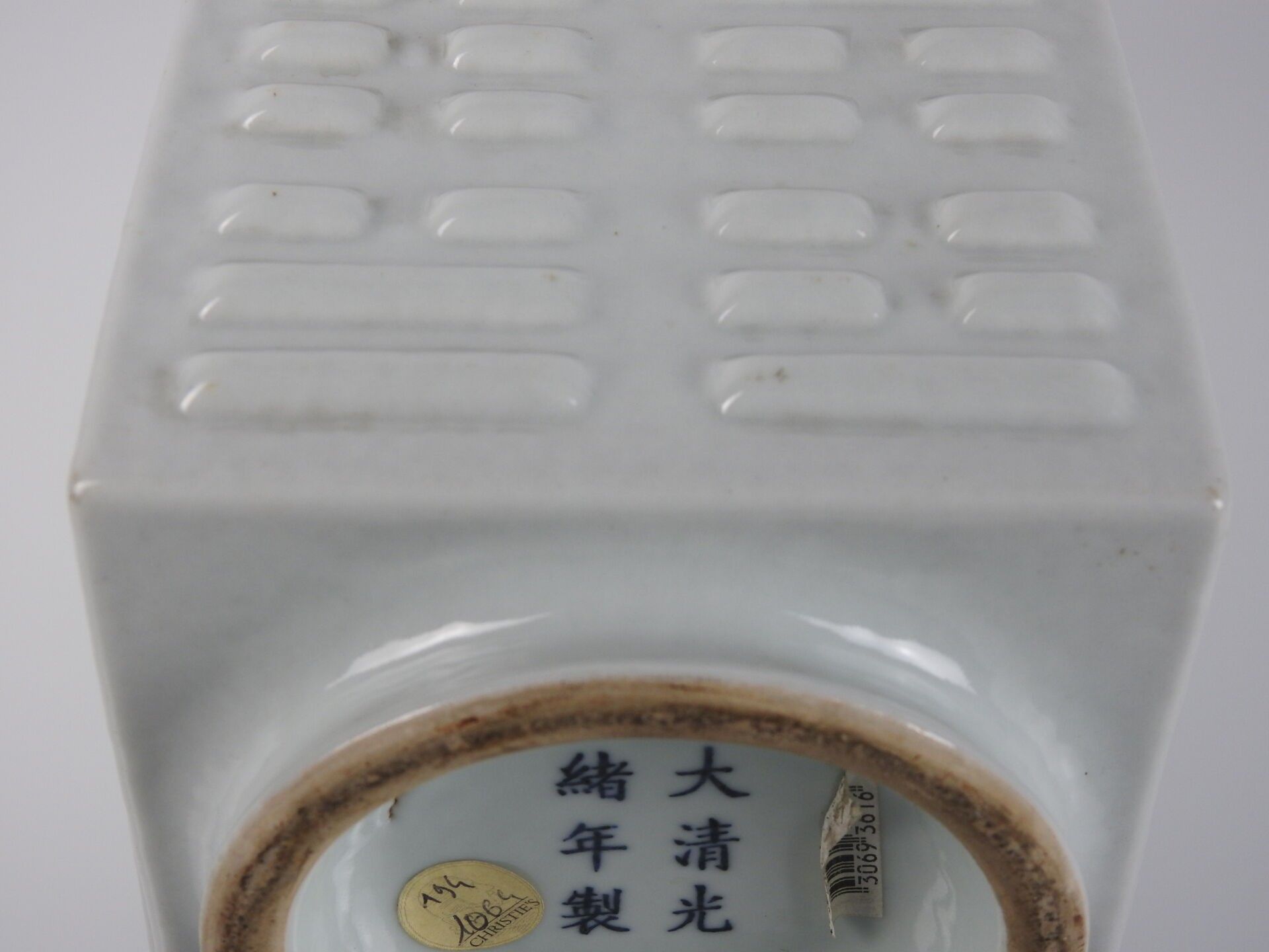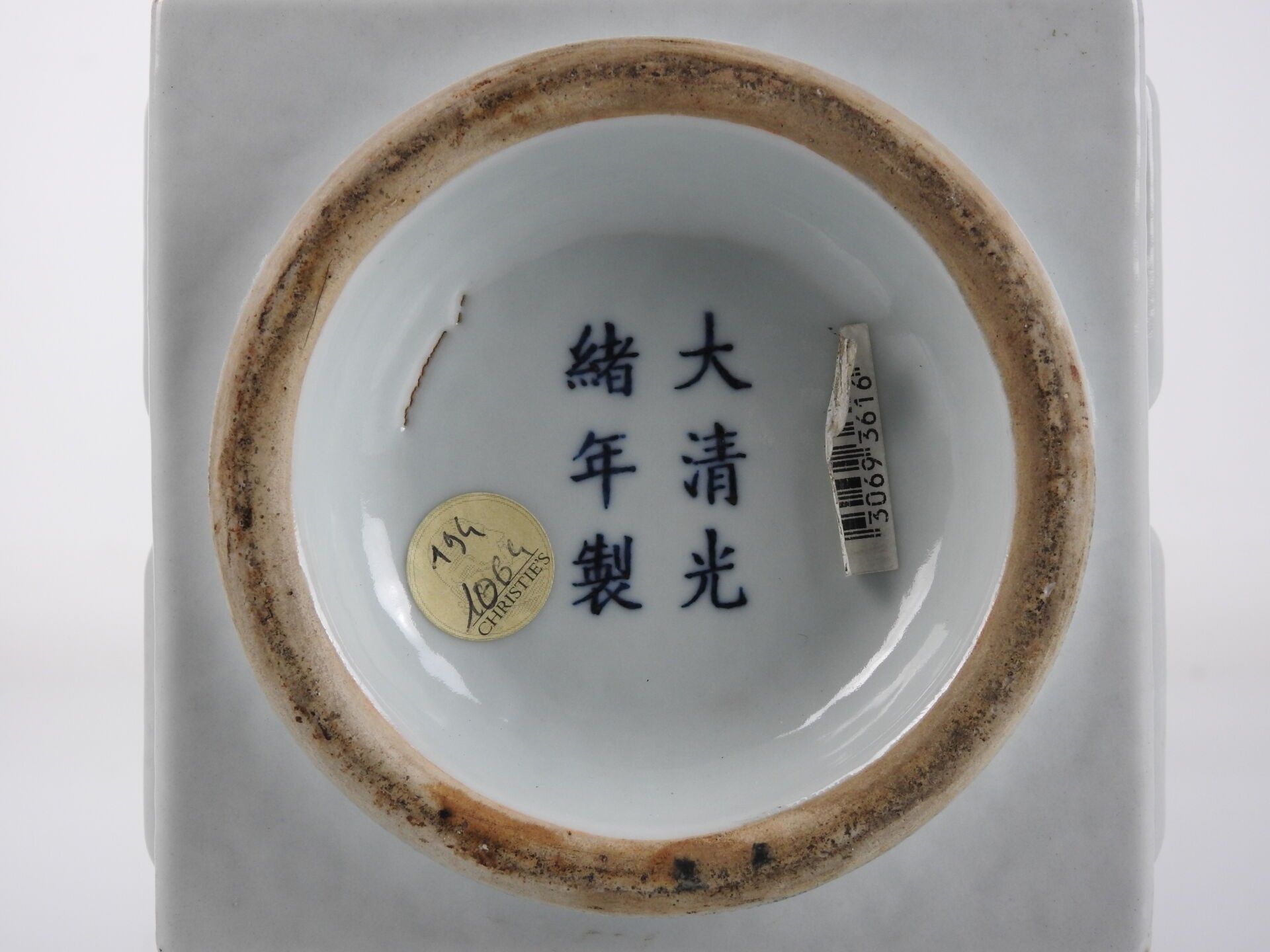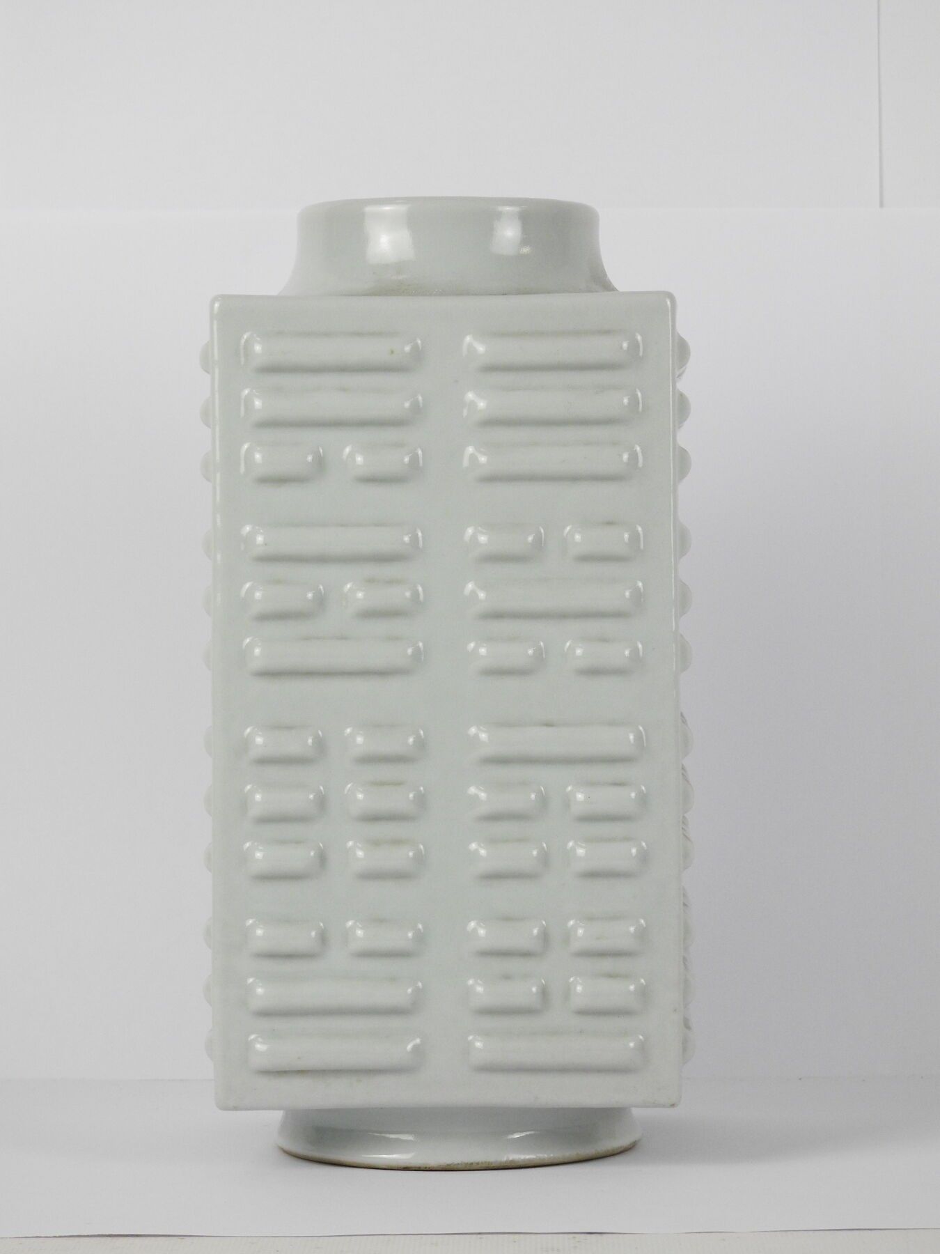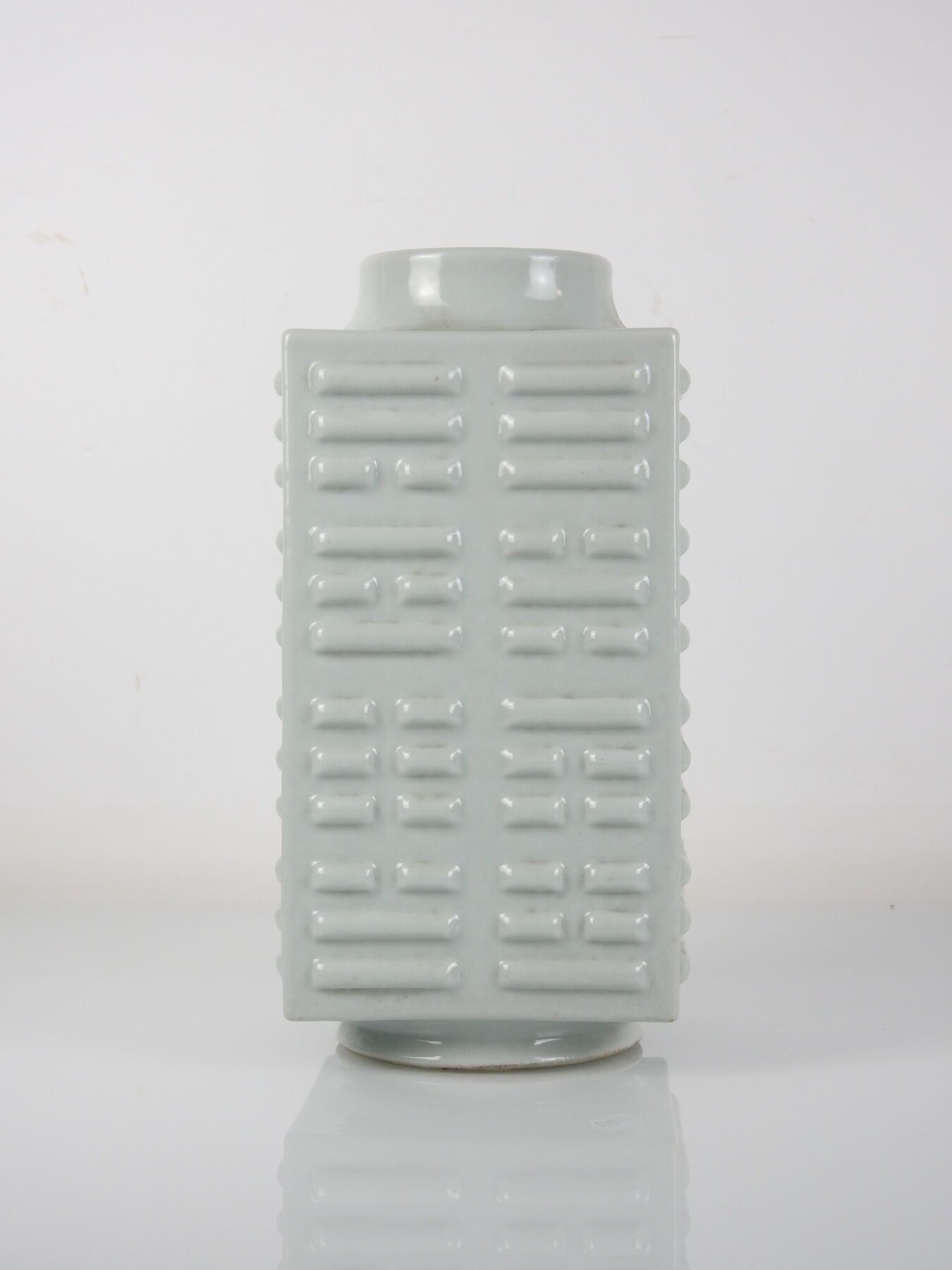 CHINA - Guangxu period (1875-1908) : A "guan" type celadon crackled enamelled porcelain Cong vase, each side decorated with eight "bagua" trigrams. Guangxu six-character mark in kaishu on the reverse of the base. Height: 27.5 cm. Width: 13 x 13 cm (formerly mounted as a lamp, small lack of glaze on the neck)