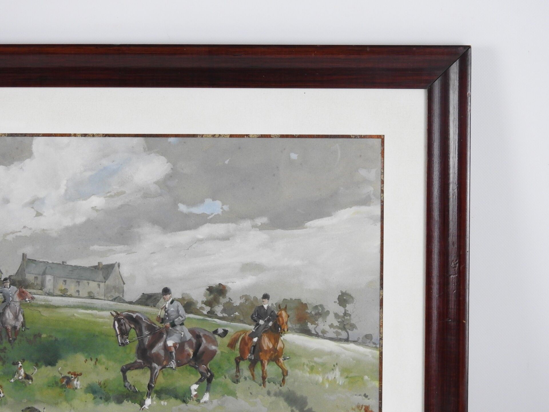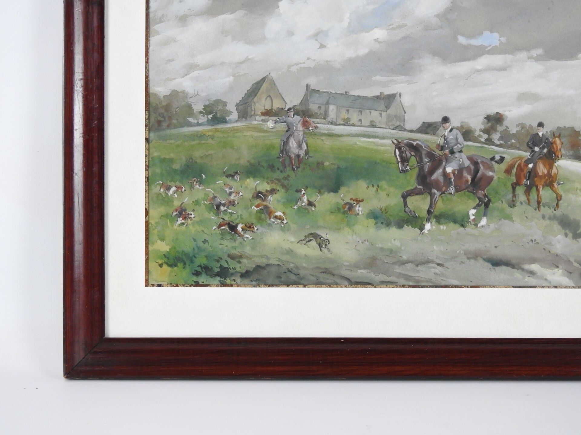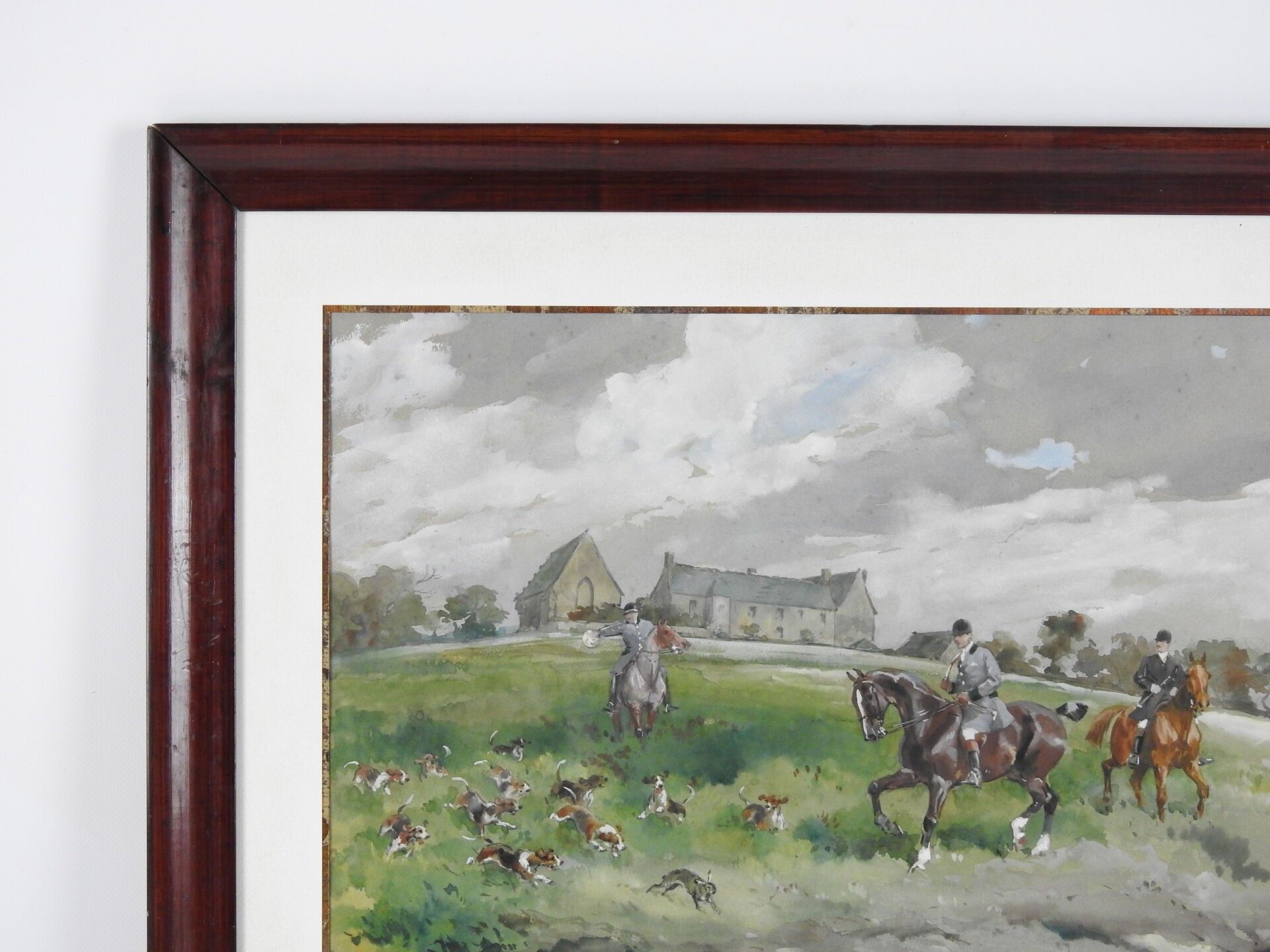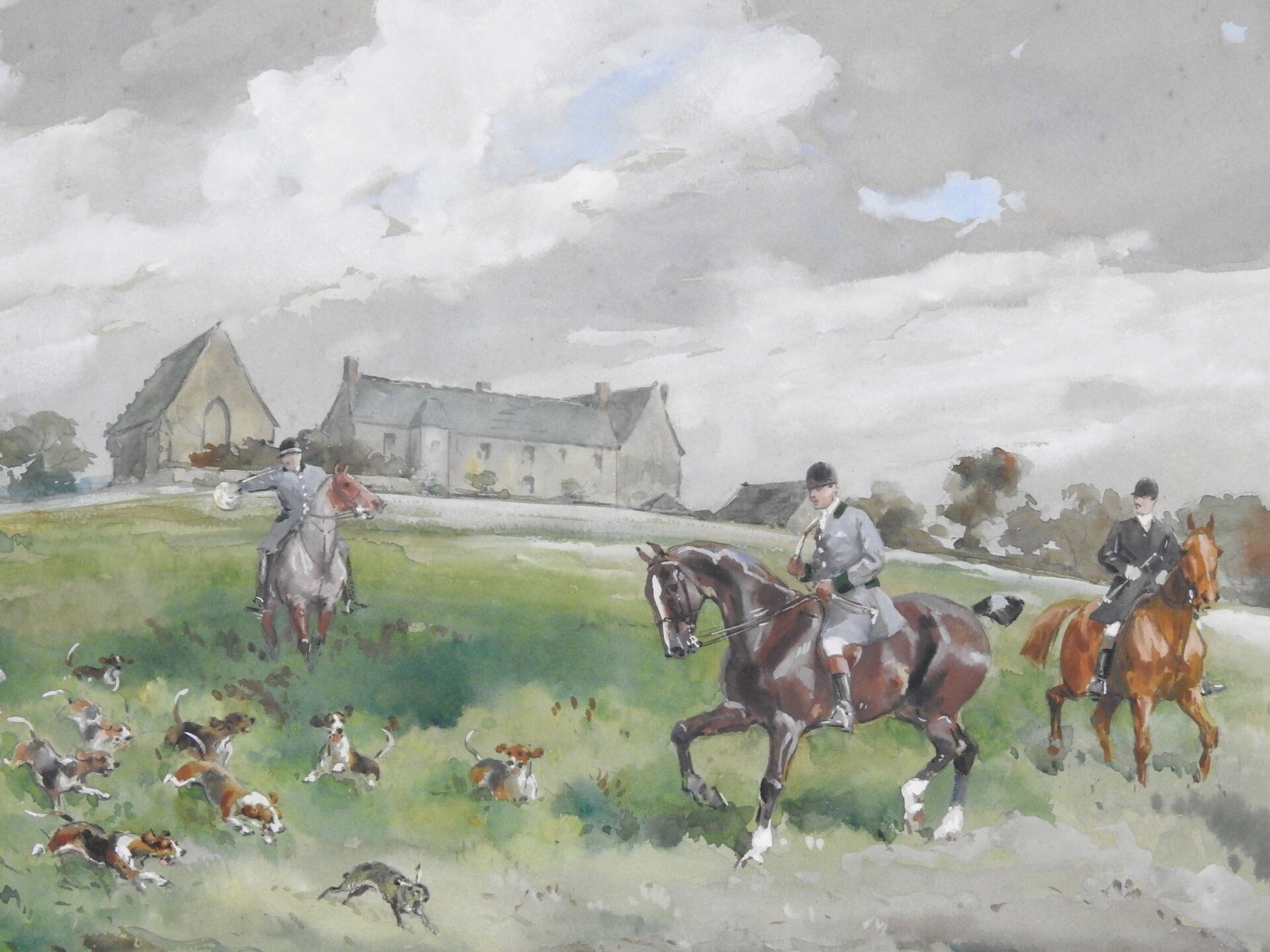 Baron Karl REILLE (Paris, 1886 - Cerelles, 1975 ) : Hallali au lièvre, the cloister. Rallye Baudry. Watercolour. Signed lower right, titled on the back. Label of the publisher Neuville et Vivien faubourg Saint Honoré in Paris. 30.5 x 49 cm at sight. 49.5 x 66 cm.