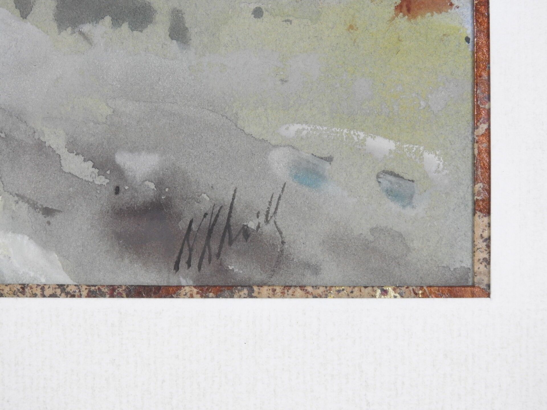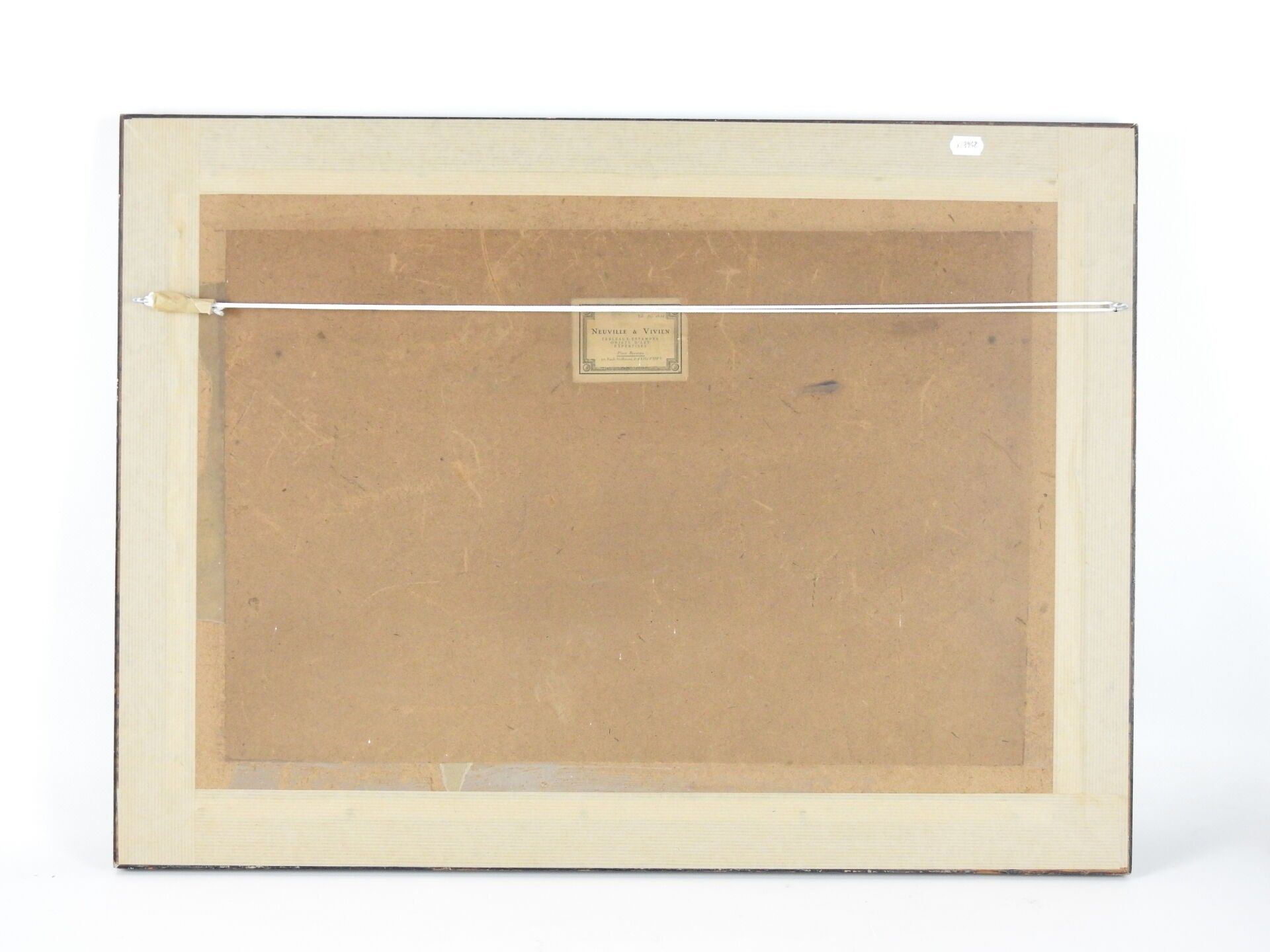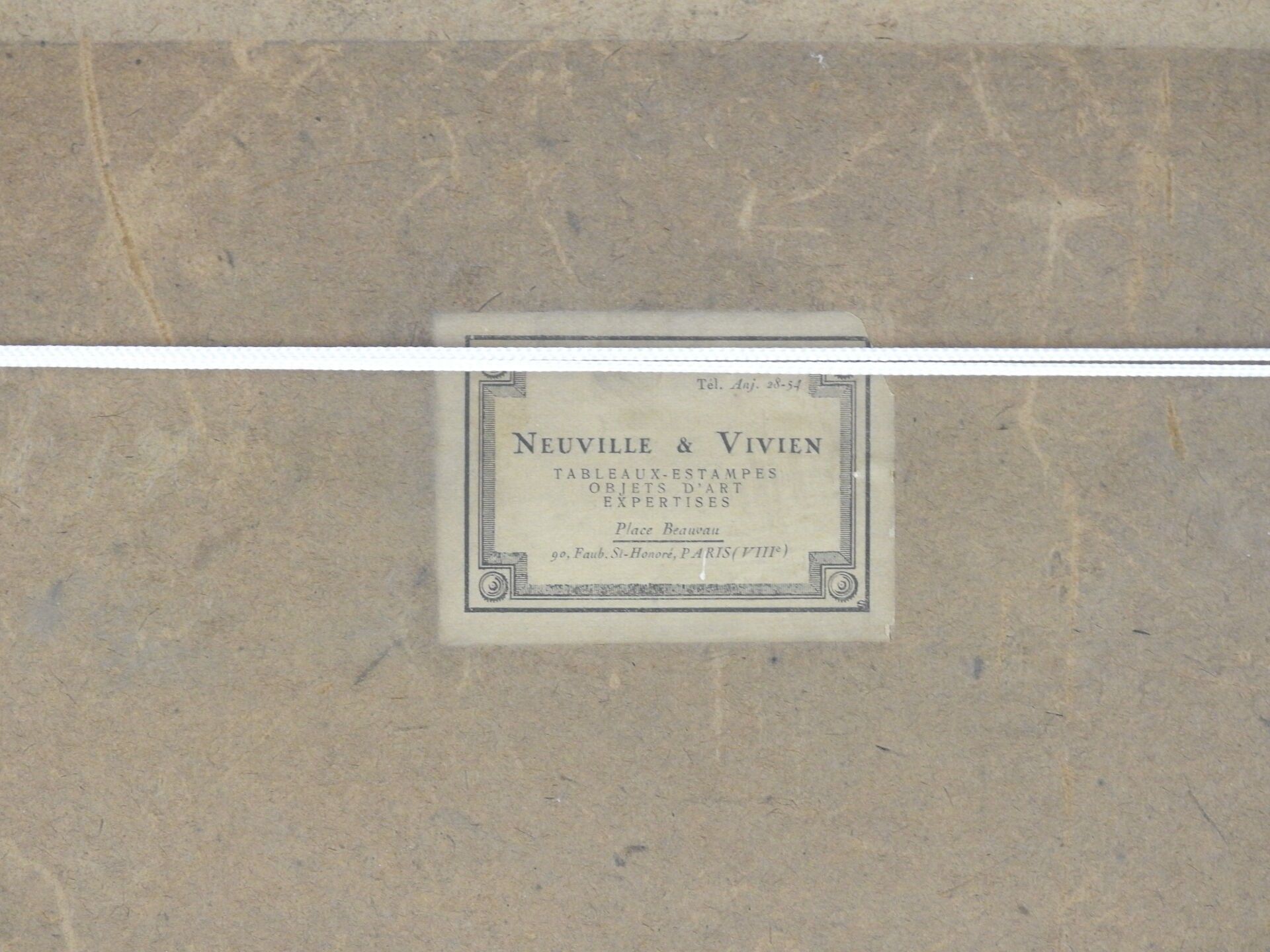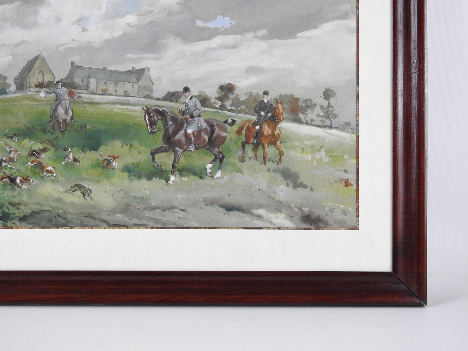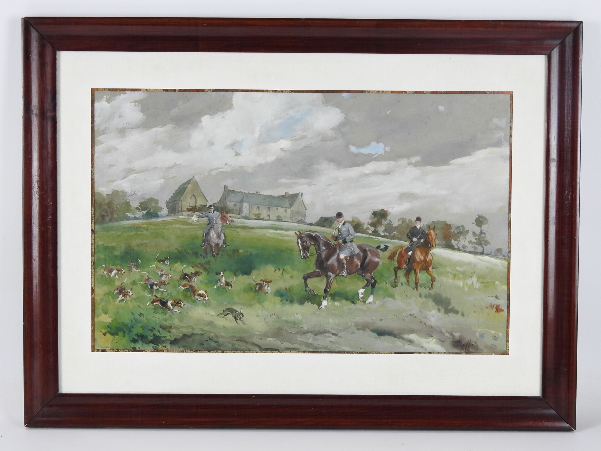 Baron Karl REILLE (Paris, 1886 - Cerelles, 1975 ) : Hallali au lièvre, the cloister. Rallye Baudry. Watercolour. Signed lower right, titled on the back. Label of the publisher Neuville et Vivien faubourg Saint Honoré in Paris. 30.5 x 49 cm at sight. 49.5 x 66 cm.