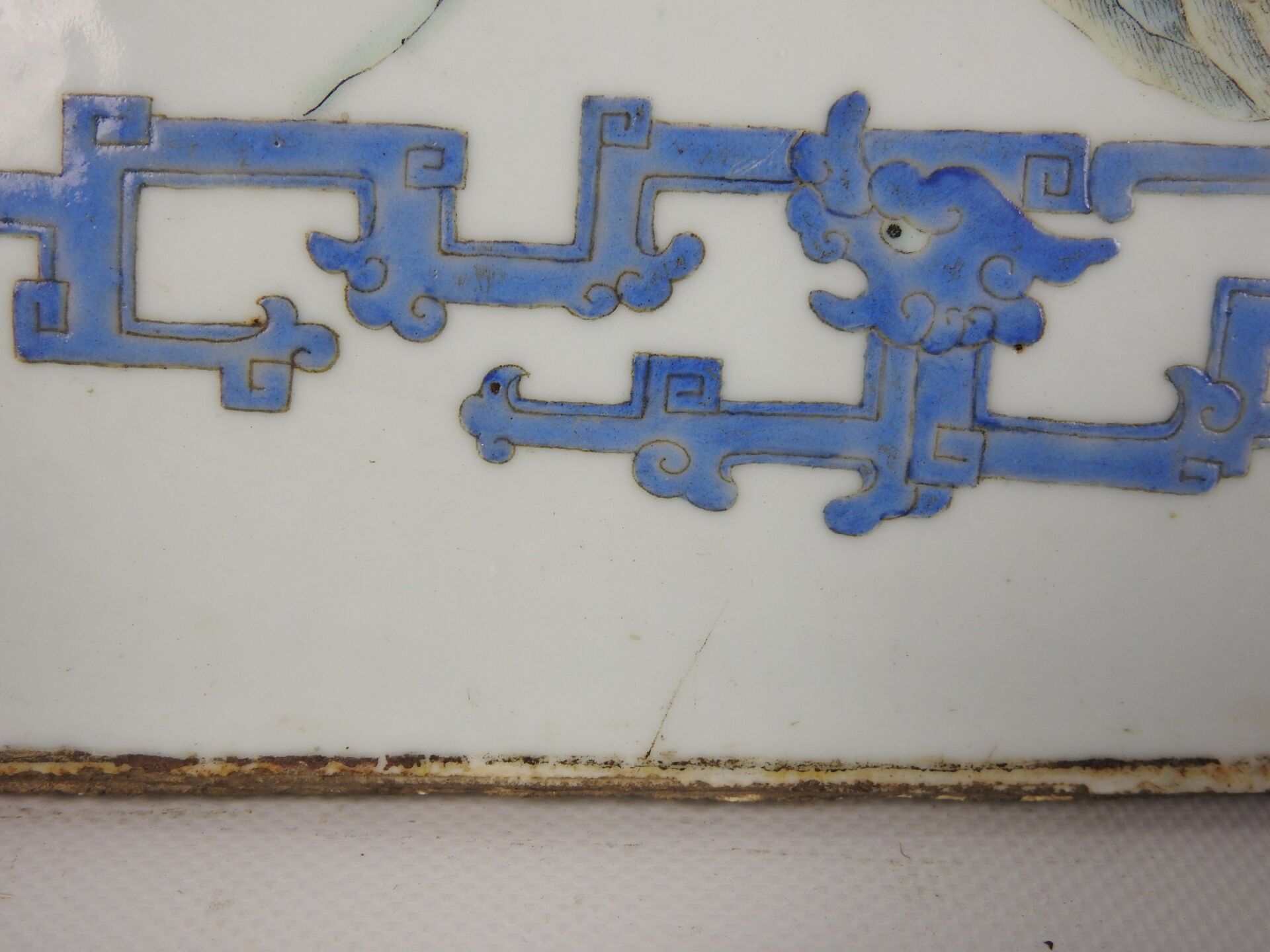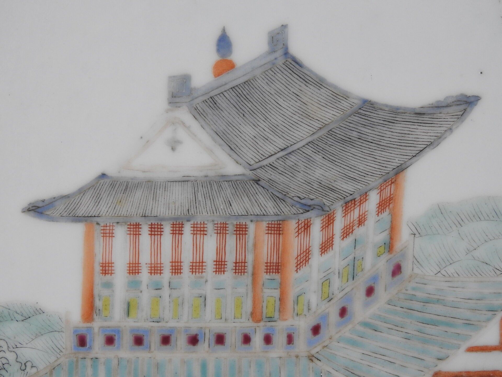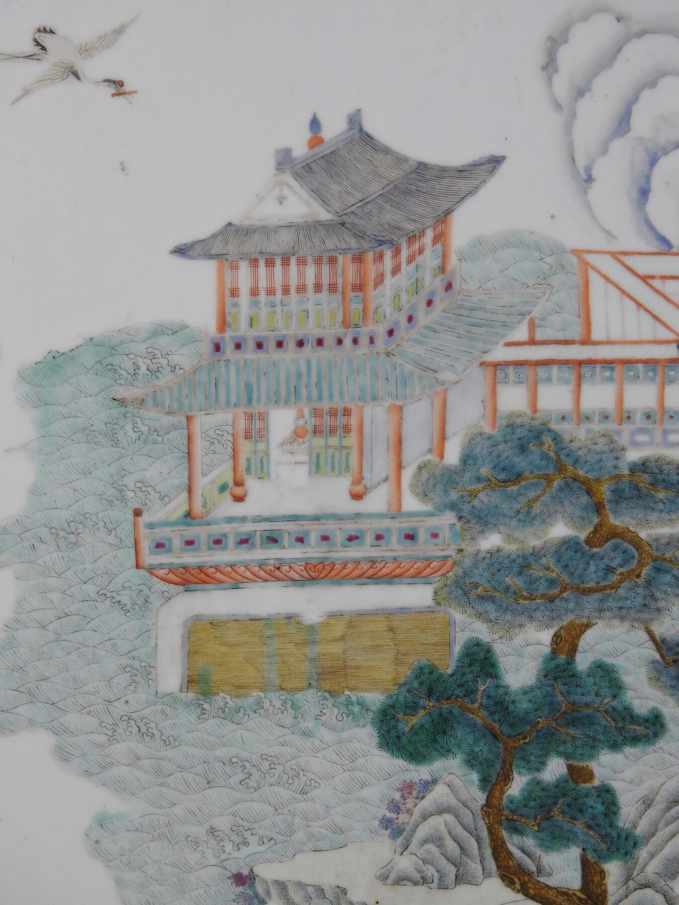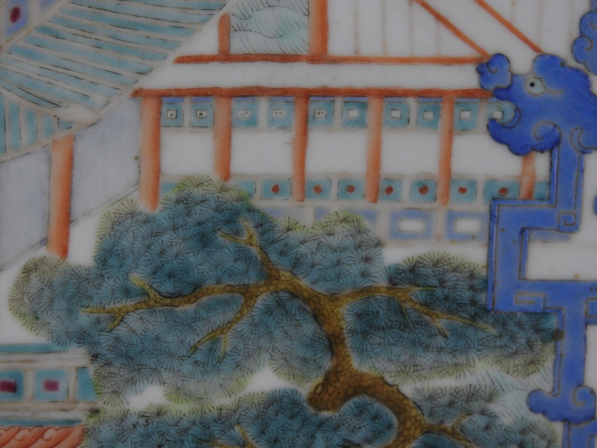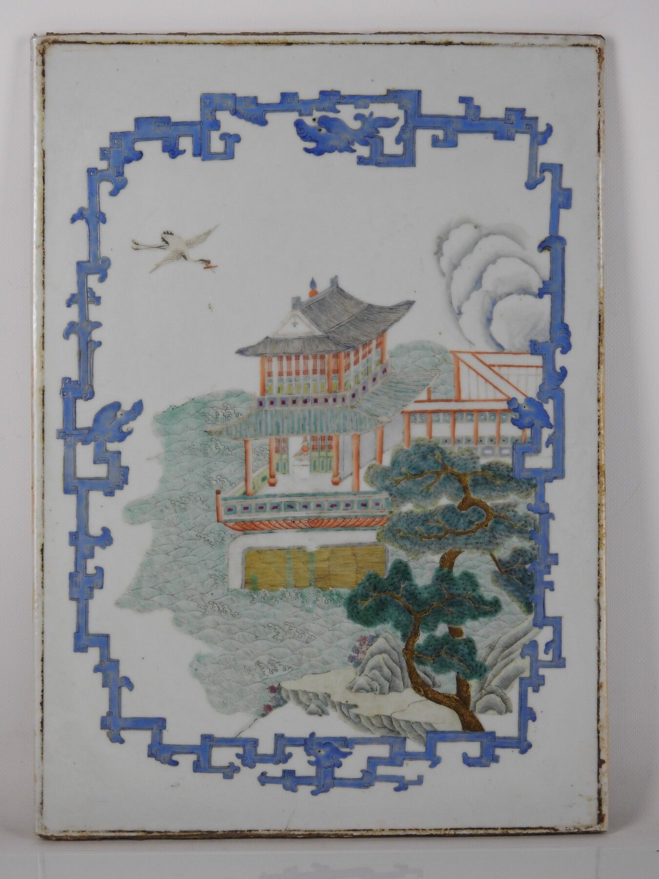 CHINA: Rectangular porcelain plate with polychrome decoration of a pagoda near rocks and pine trees. Mark in black ink on the reverse. Qing period (1644 - 1911). 47 x 34 cm (small crack at the bottom).