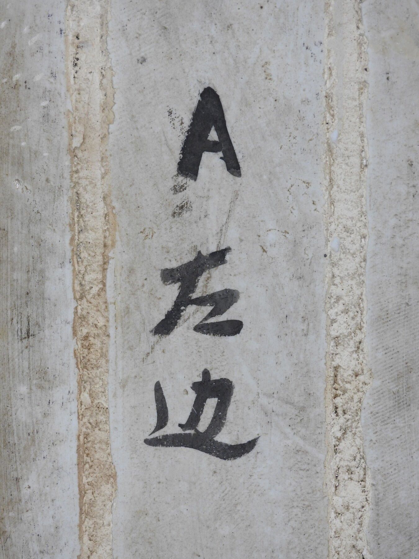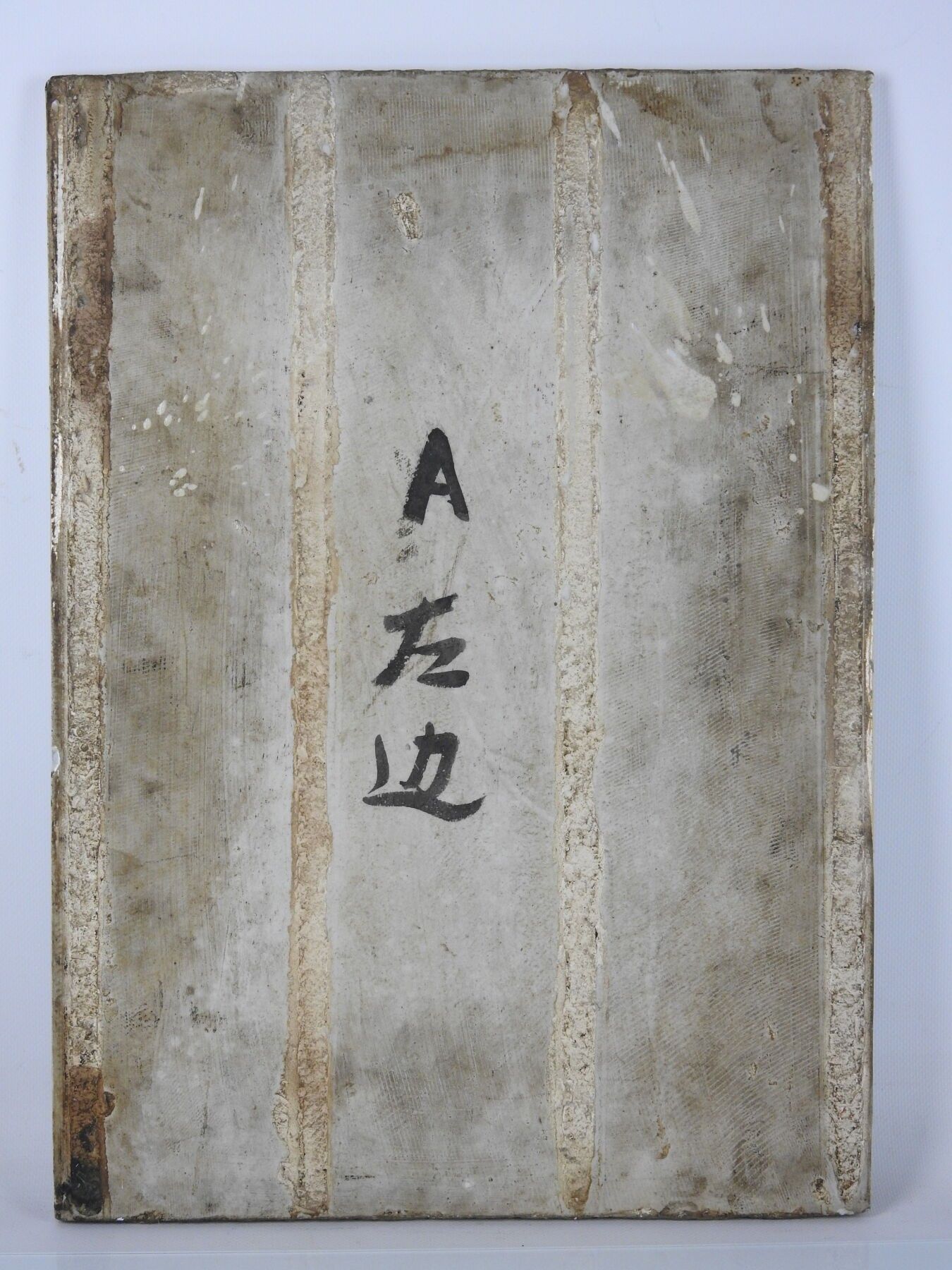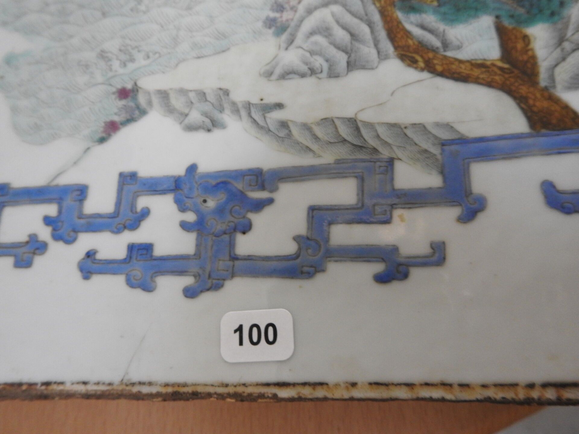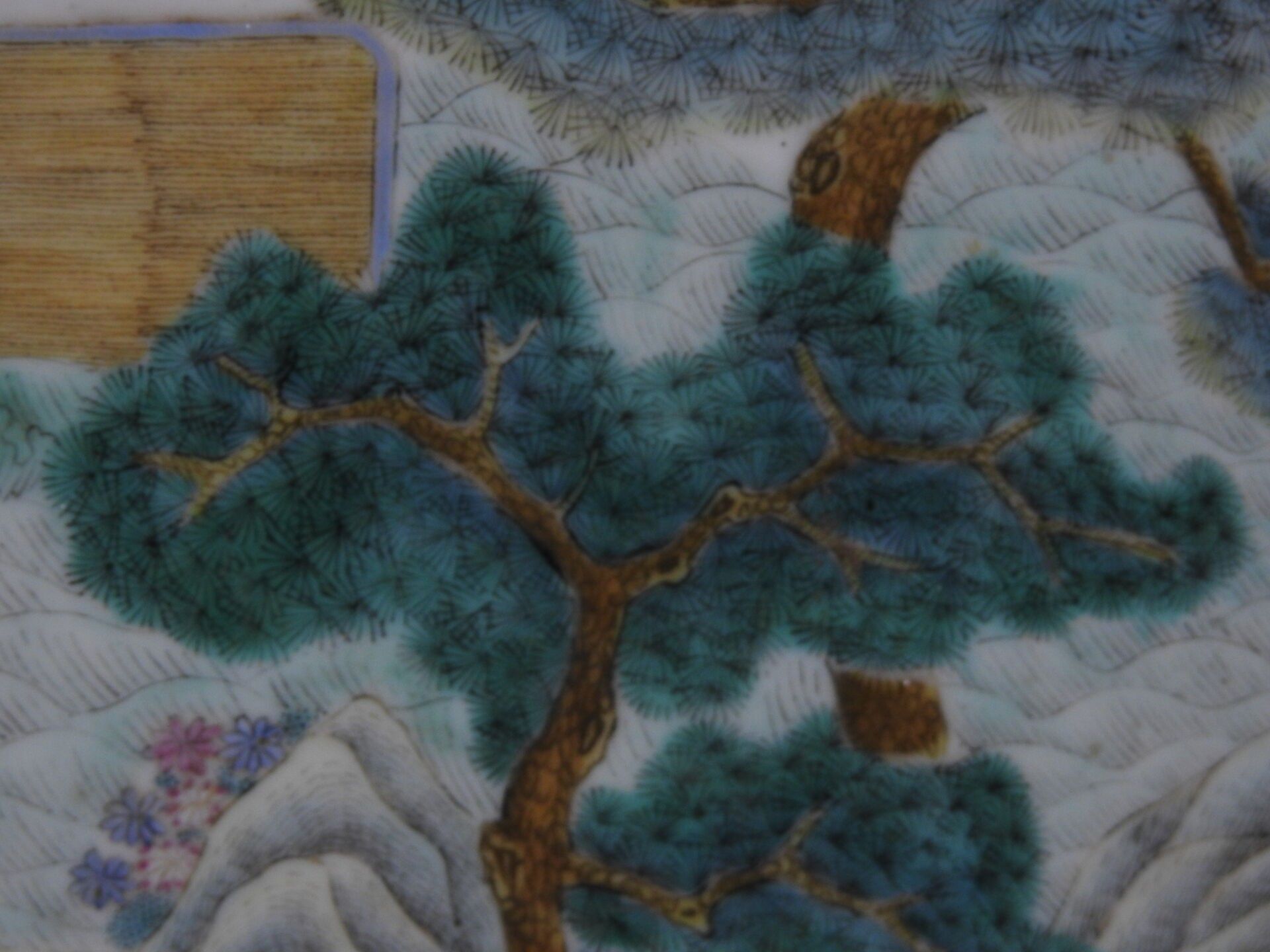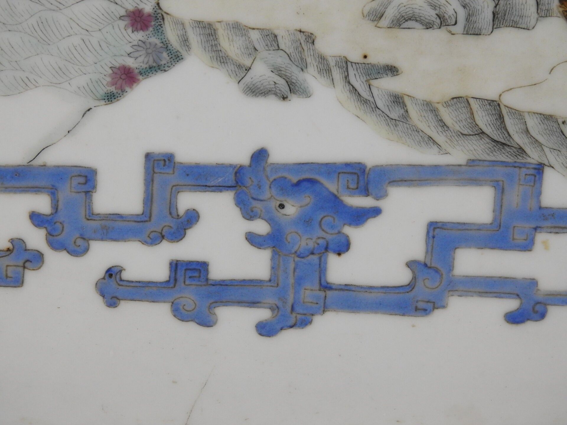 CHINA: Rectangular porcelain plate with polychrome decoration of a pagoda near rocks and pine trees. Mark in black ink on the reverse. Qing period (1644 - 1911). 47 x 34 cm (small crack at the bottom).