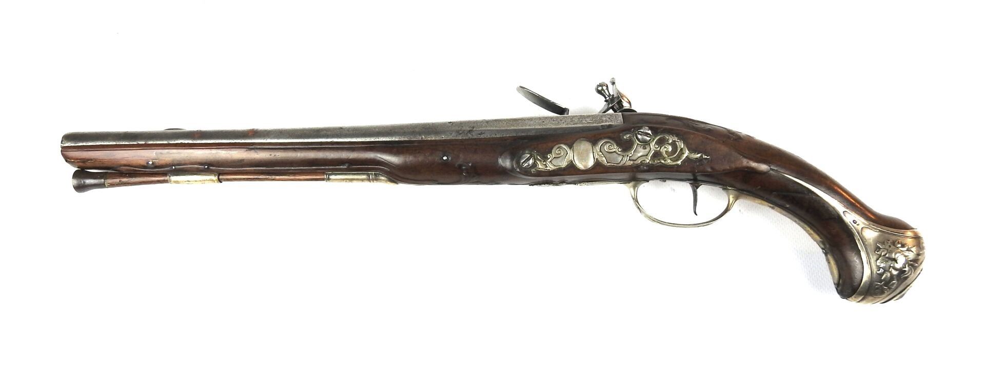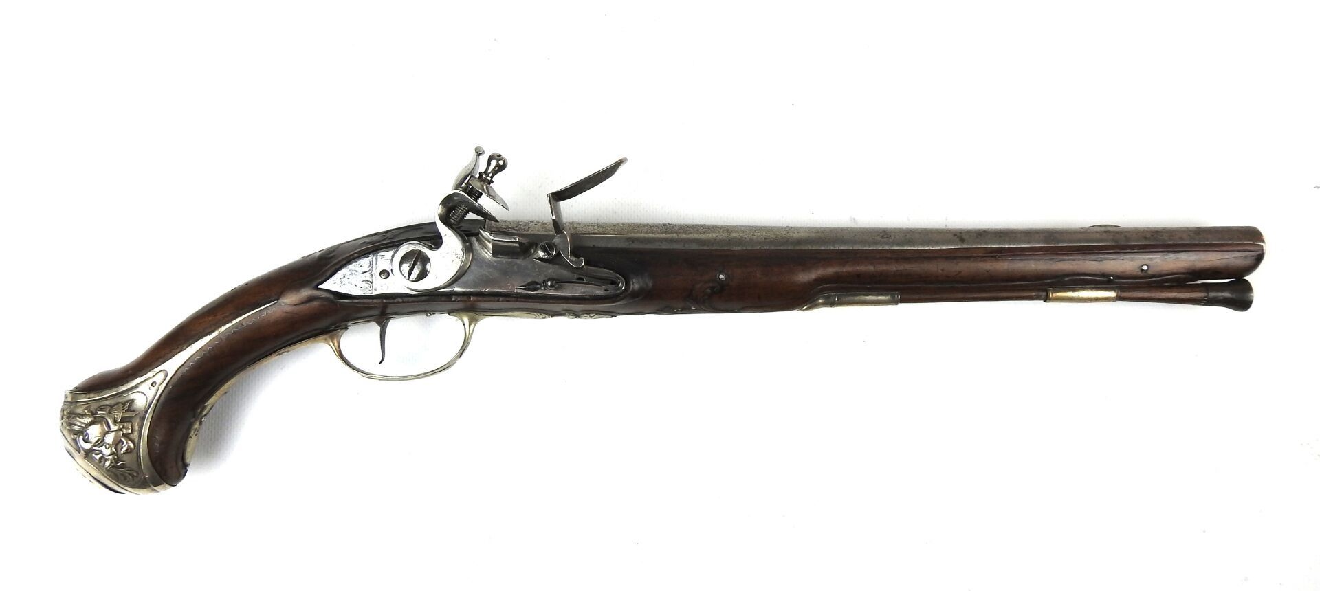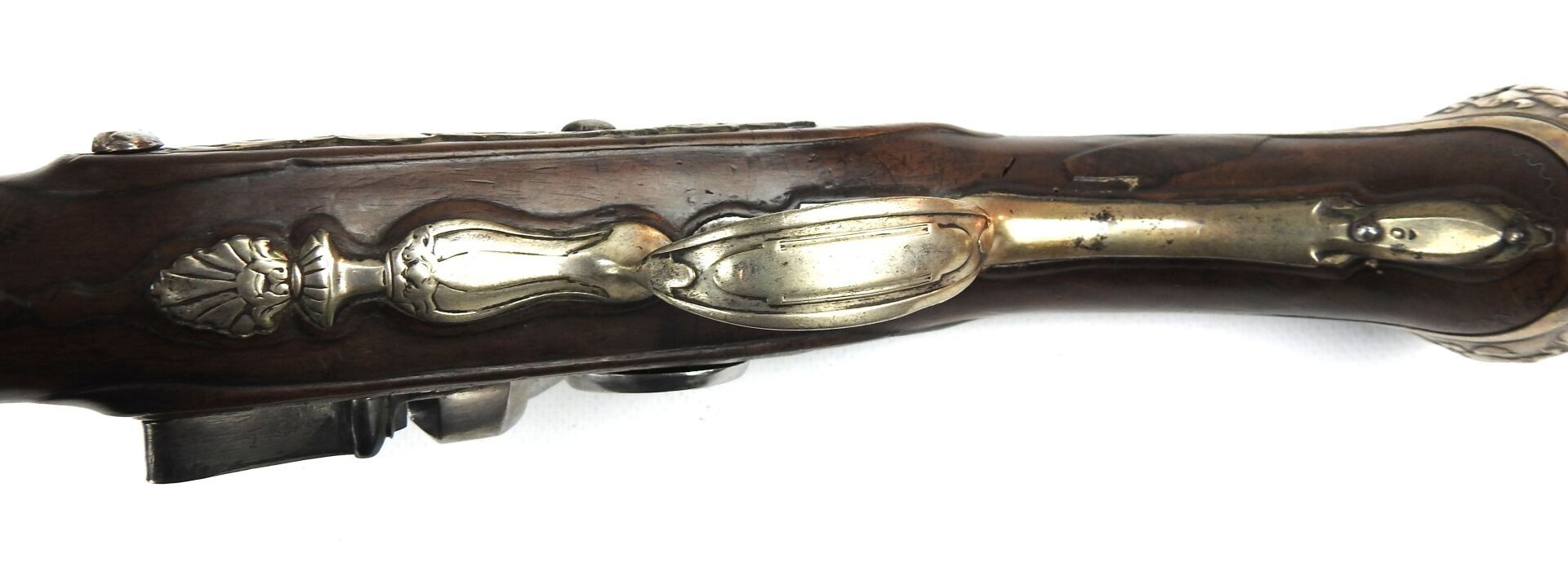 LONG flintlock ARCON PISTOL with walnut frame, iron and silver fittings, flat-body lock with swan-neck hammer, iron bassoon, round barrel with thunderbolts, Long tailed hallmarked silver cap decorated with trophies of musical instruments and arms, the central part of which depicts a knight with a helmet emblazoned with a coat of arms, carved silver counterplate decorated with foliage, silver trigger guard with palmette shaped tip, wooden ramrod with iron head and silver ramrod holders. Marks of discharge of the small works, Paris, 1722-1727. L: 51 cm, barrel: 33 cm. Louis XIV period. BE
