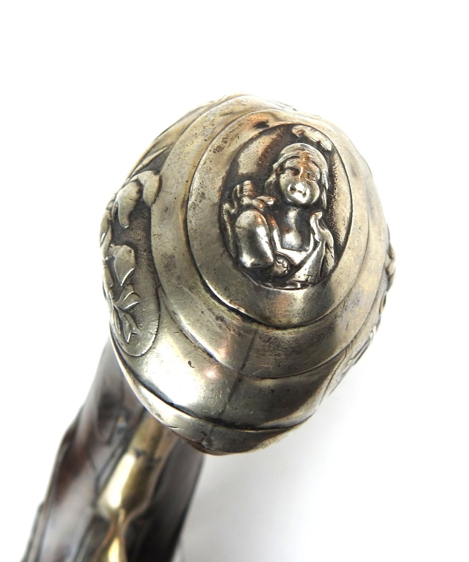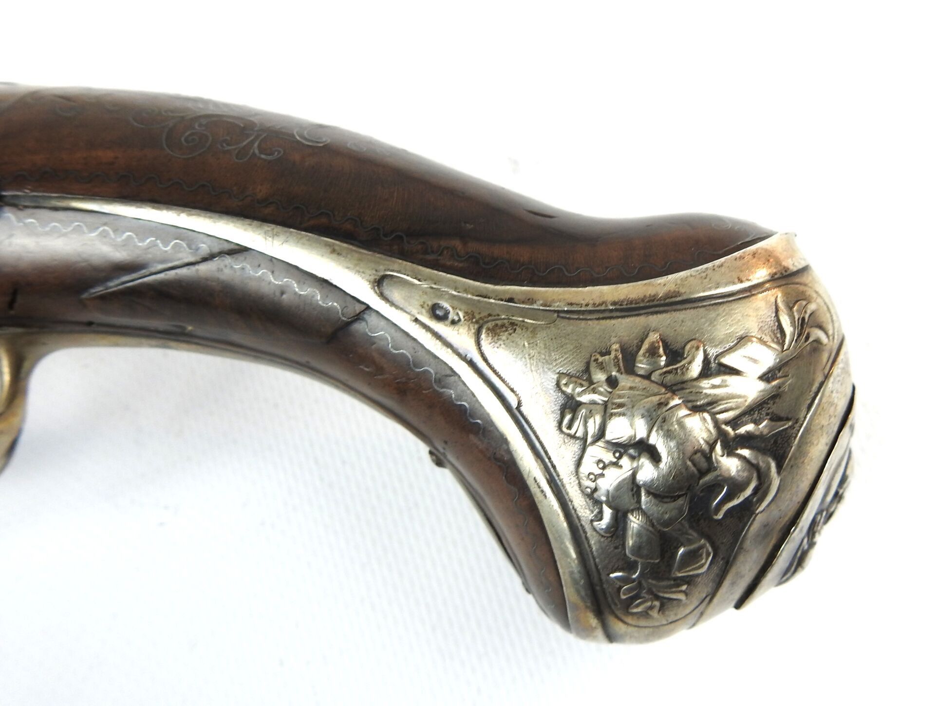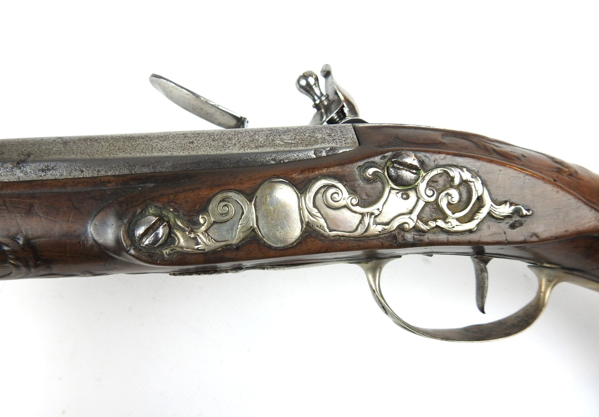 LONG flintlock ARCON PISTOL with walnut frame, iron and silver fittings, flat-body lock with swan-neck hammer, iron bassoon, round barrel with thunderbolts, Long tailed hallmarked silver cap decorated with trophies of musical instruments and arms, the central part of which depicts a knight with a helmet emblazoned with a coat of arms, carved silver counterplate decorated with foliage, silver trigger guard with palmette shaped tip, wooden ramrod with iron head and silver ramrod holders. Marks of discharge of the small works, Paris, 1722-1727. L: 51 cm, barrel: 33 cm. Louis XIV period. BE