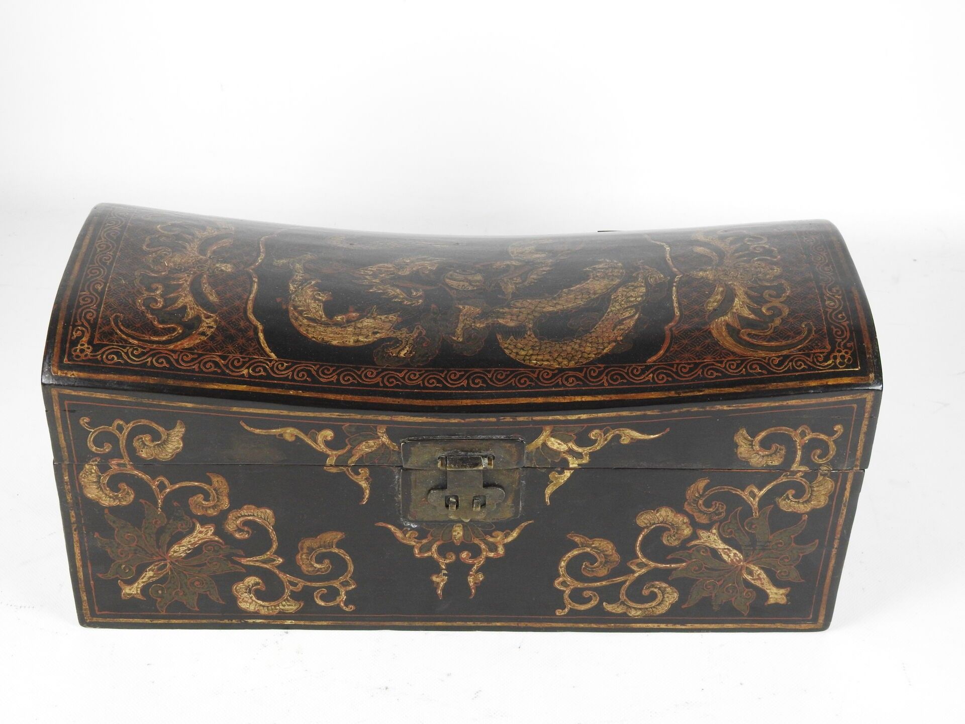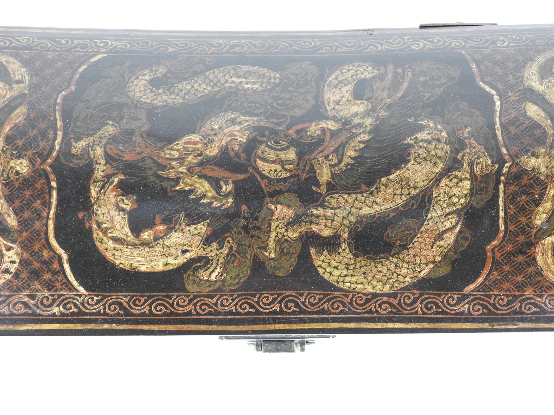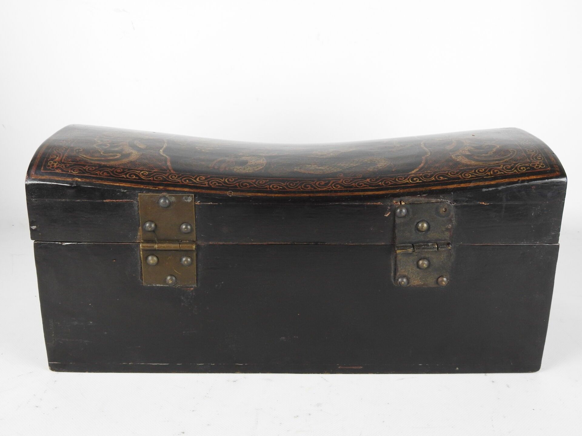 CHINA: Lacquered wood neck rest decorated with dragons chasing the sacred pearl. Late 19th century. 20 x 49 x 22 cm