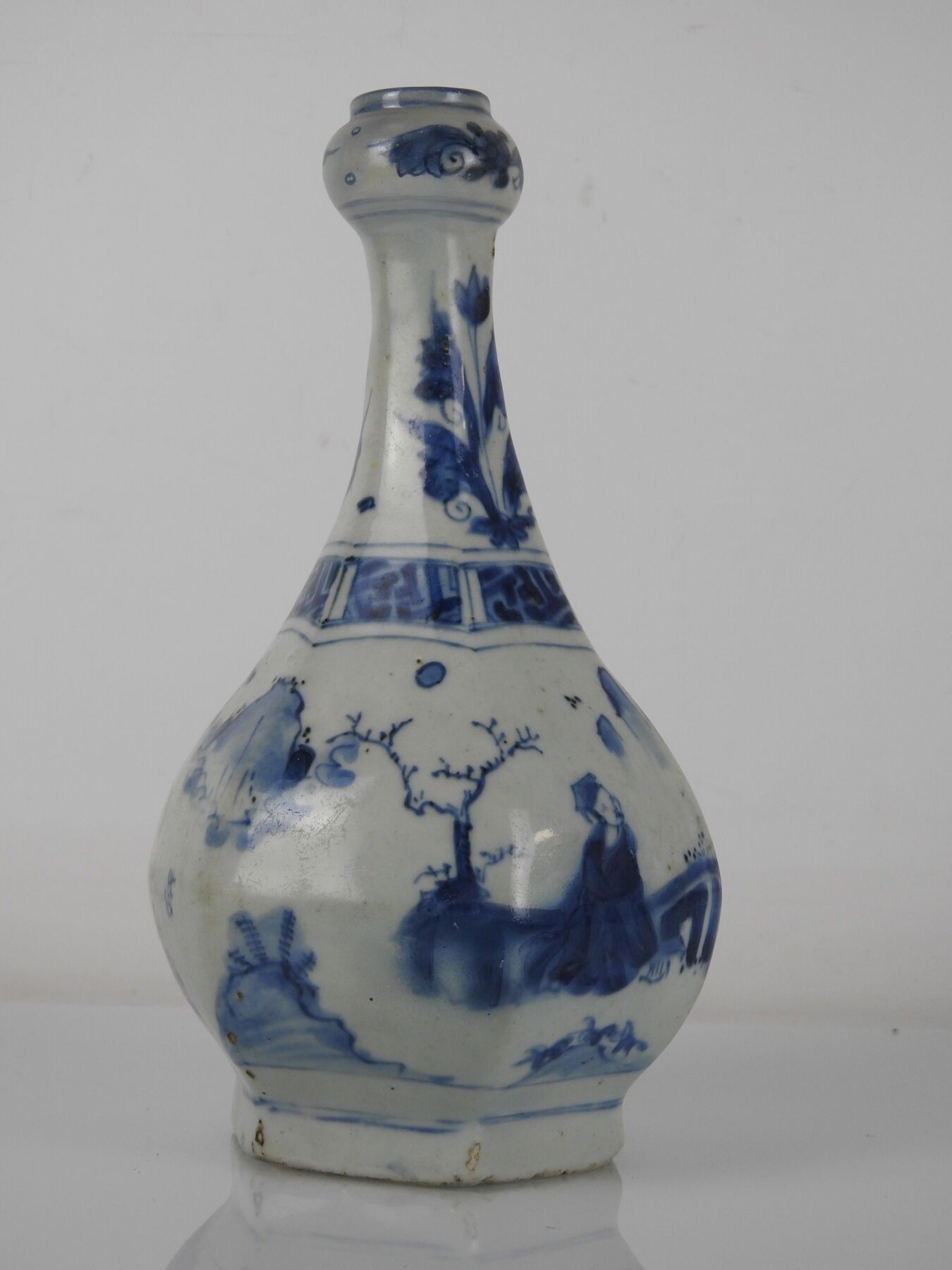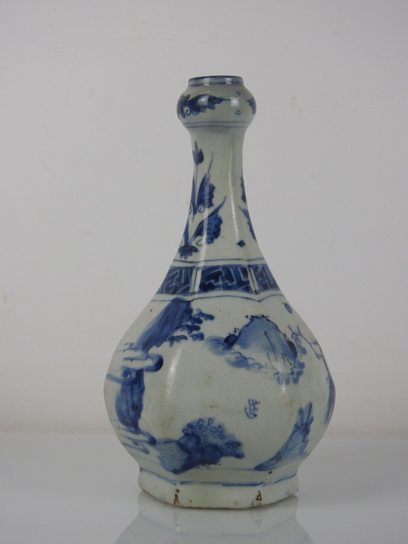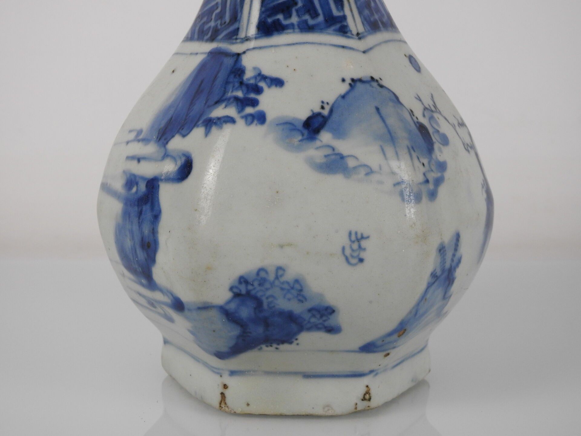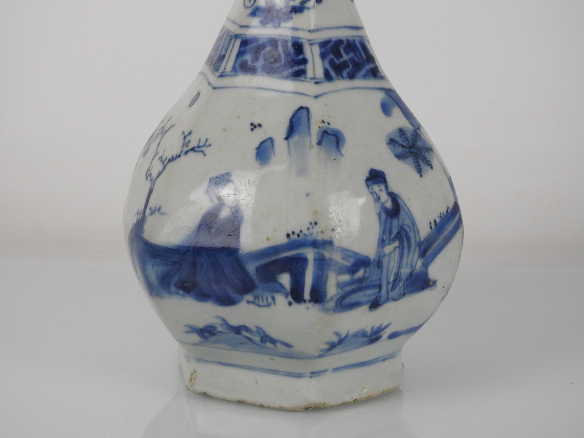 CHINA: A porcelain vase with a low cutaway body and bulbous neck decorated in blue with two figures and a mountain. H: 28 cm (wear)