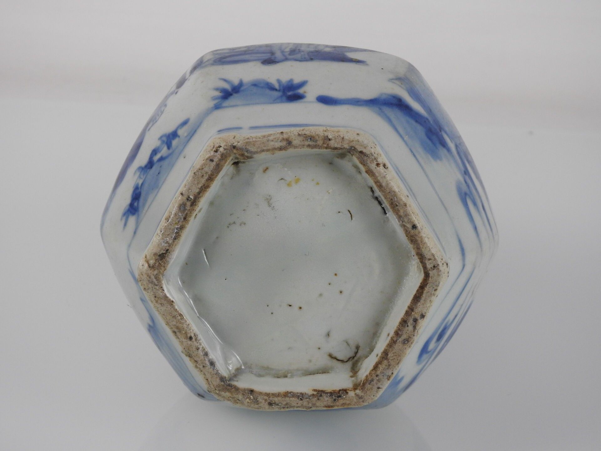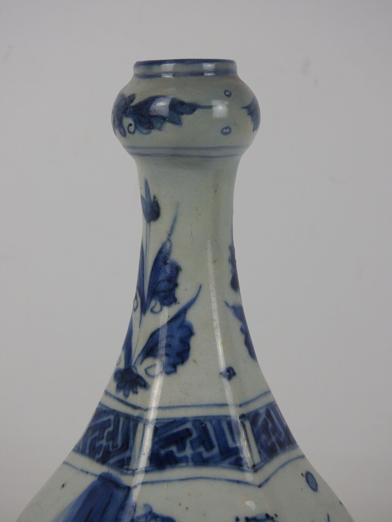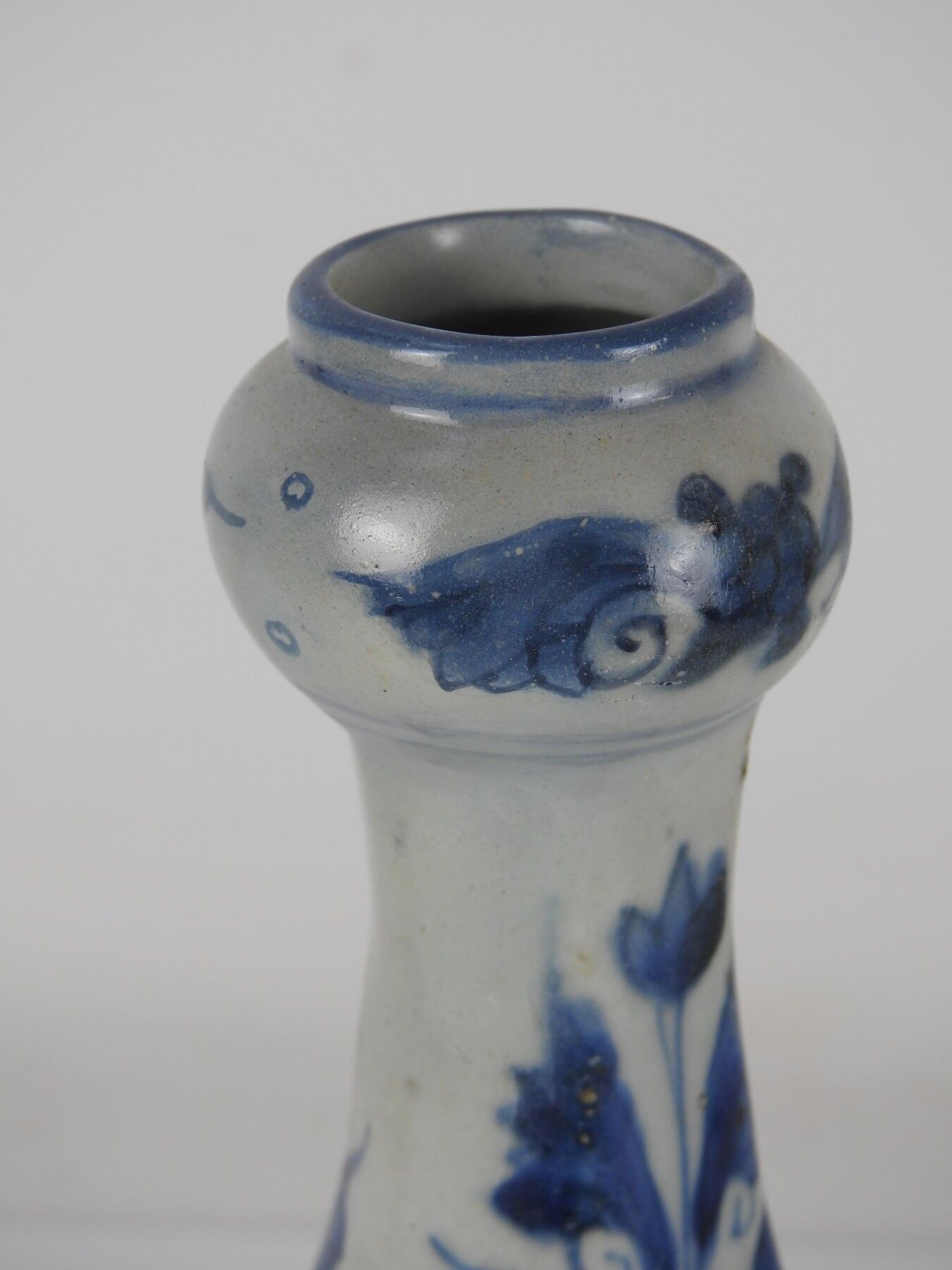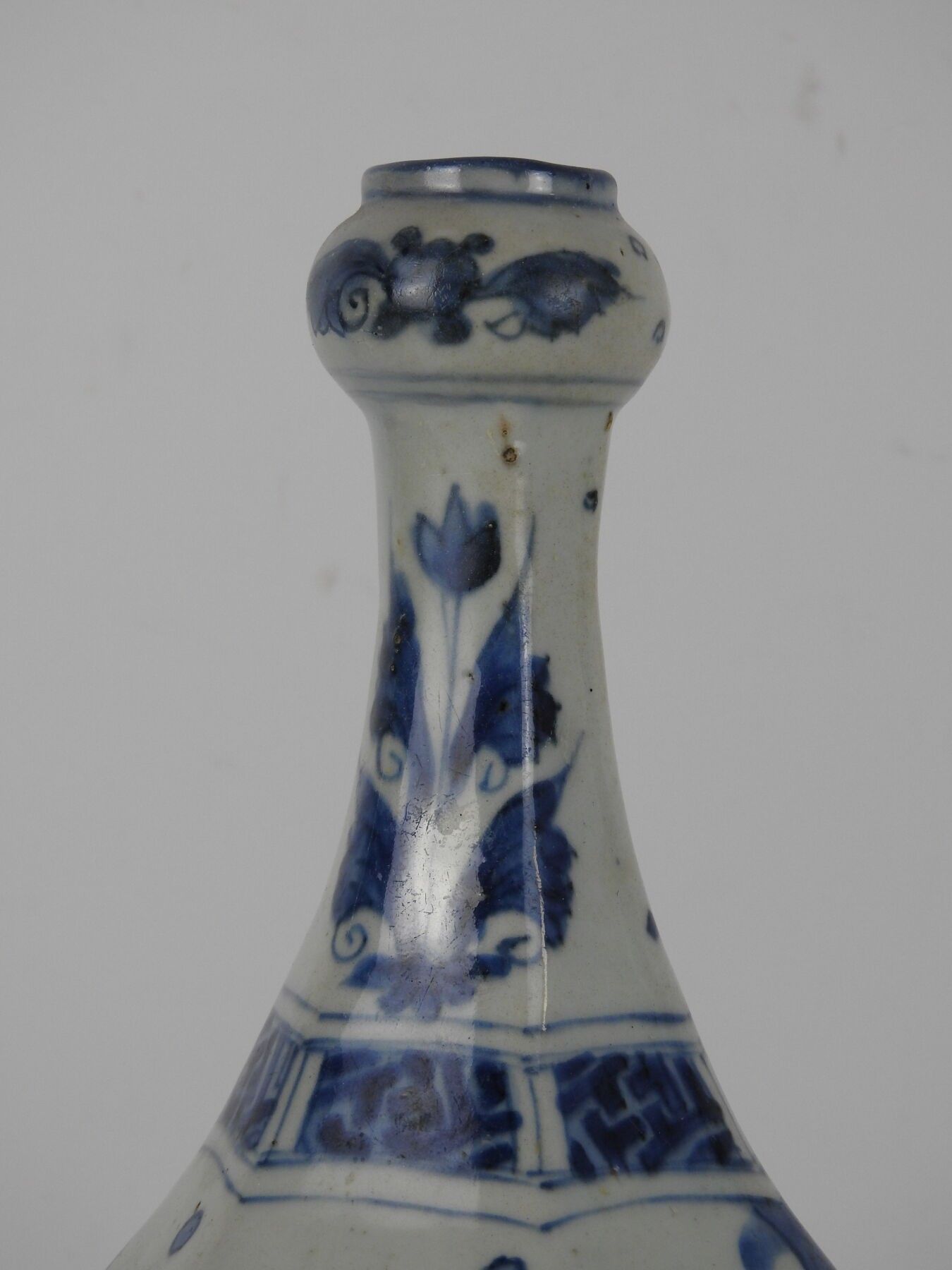 CHINA: A porcelain vase with a low cutaway body and bulbous neck decorated in blue with two figures and a mountain. H: 28 cm (wear)