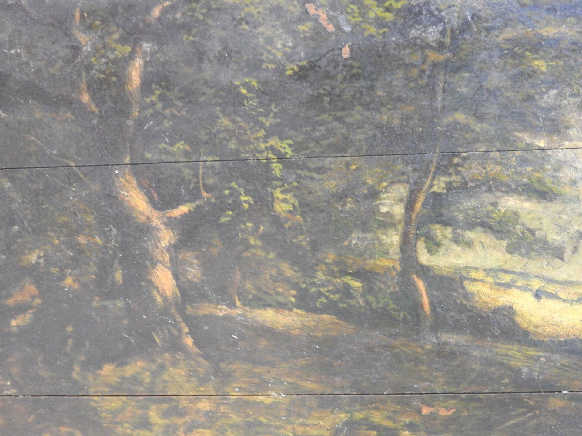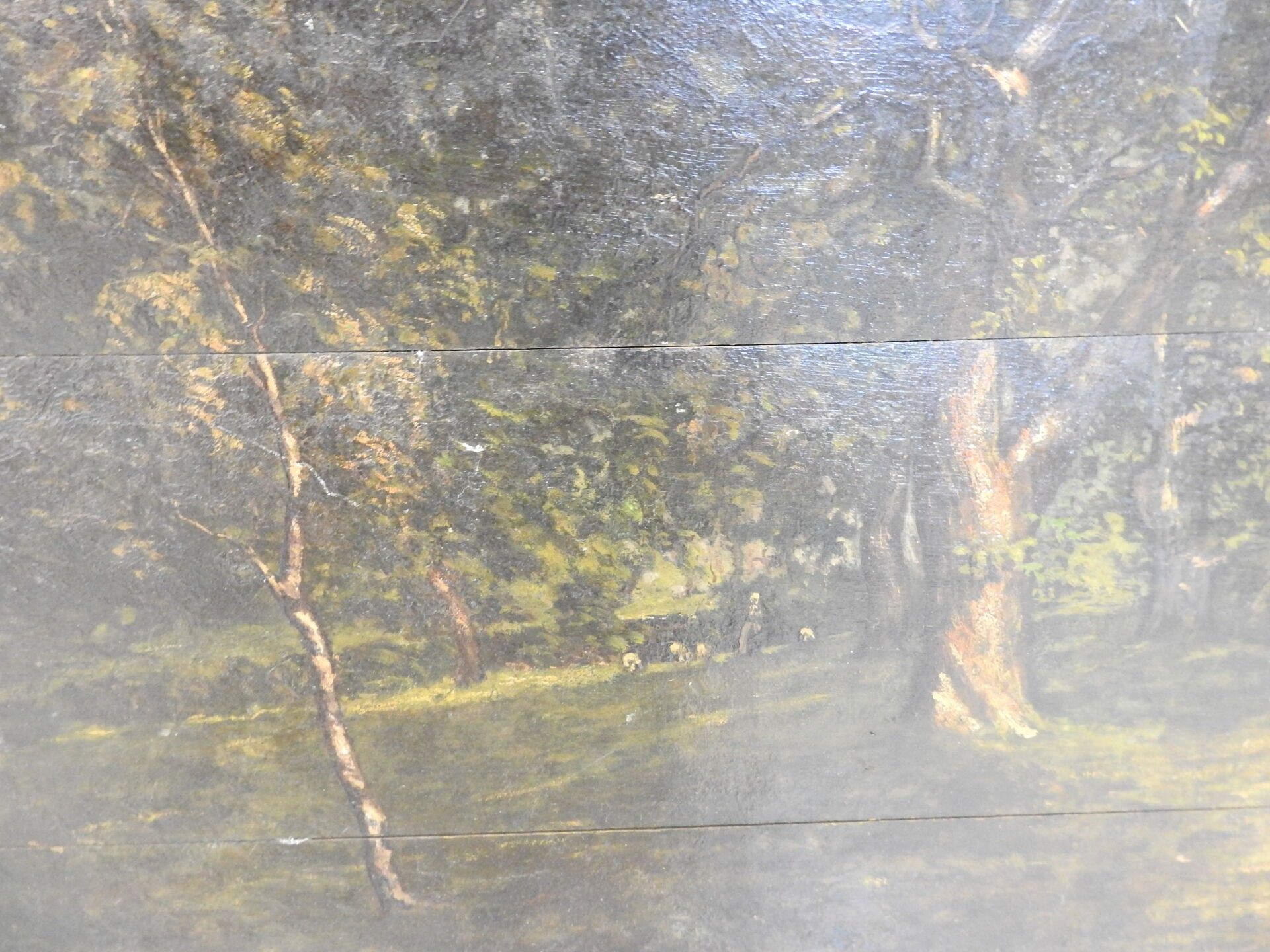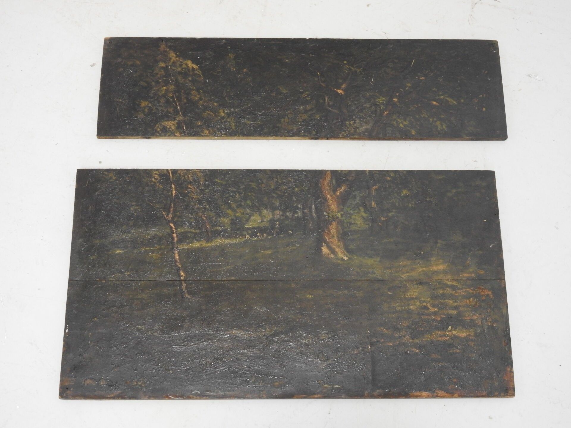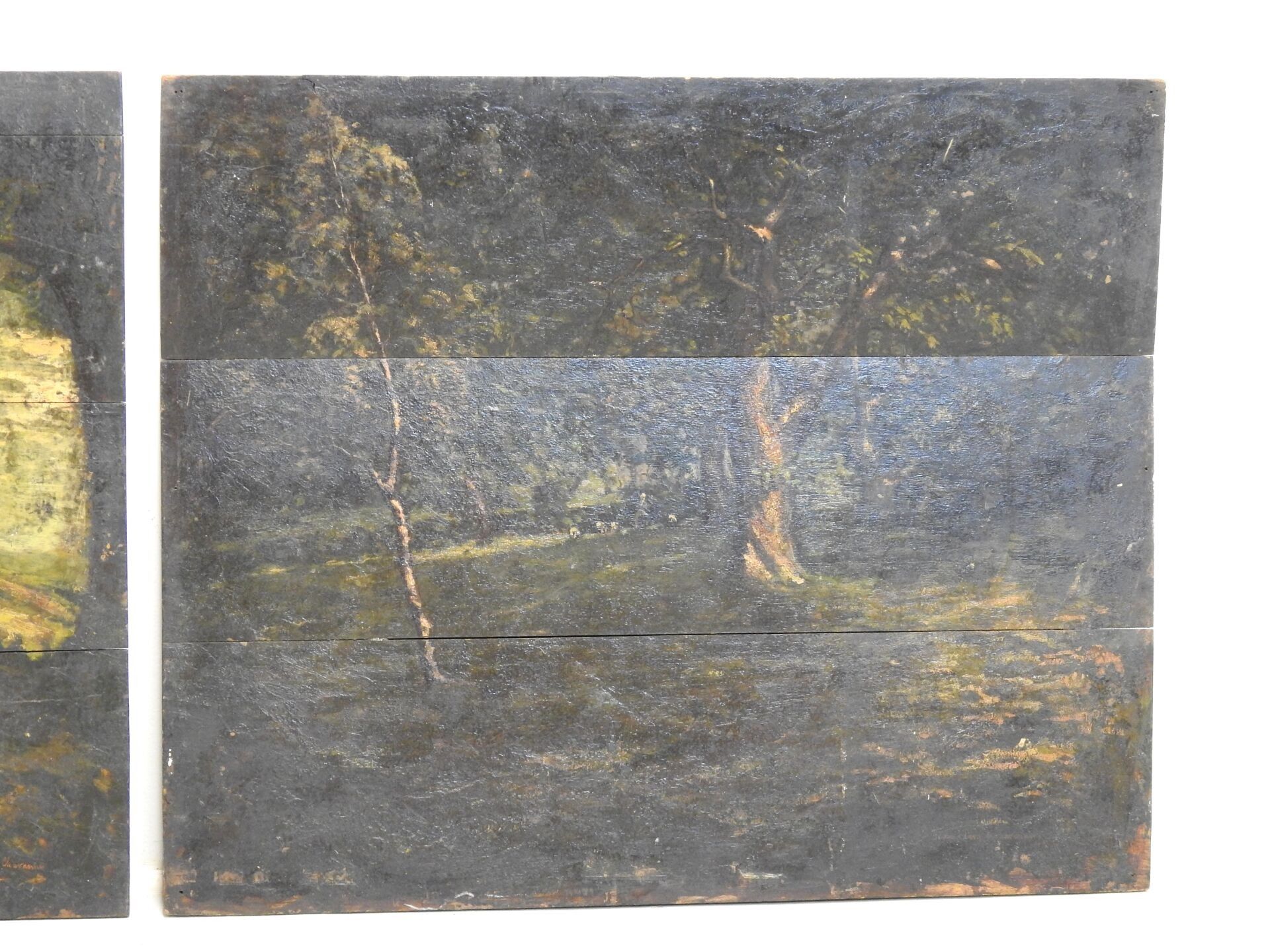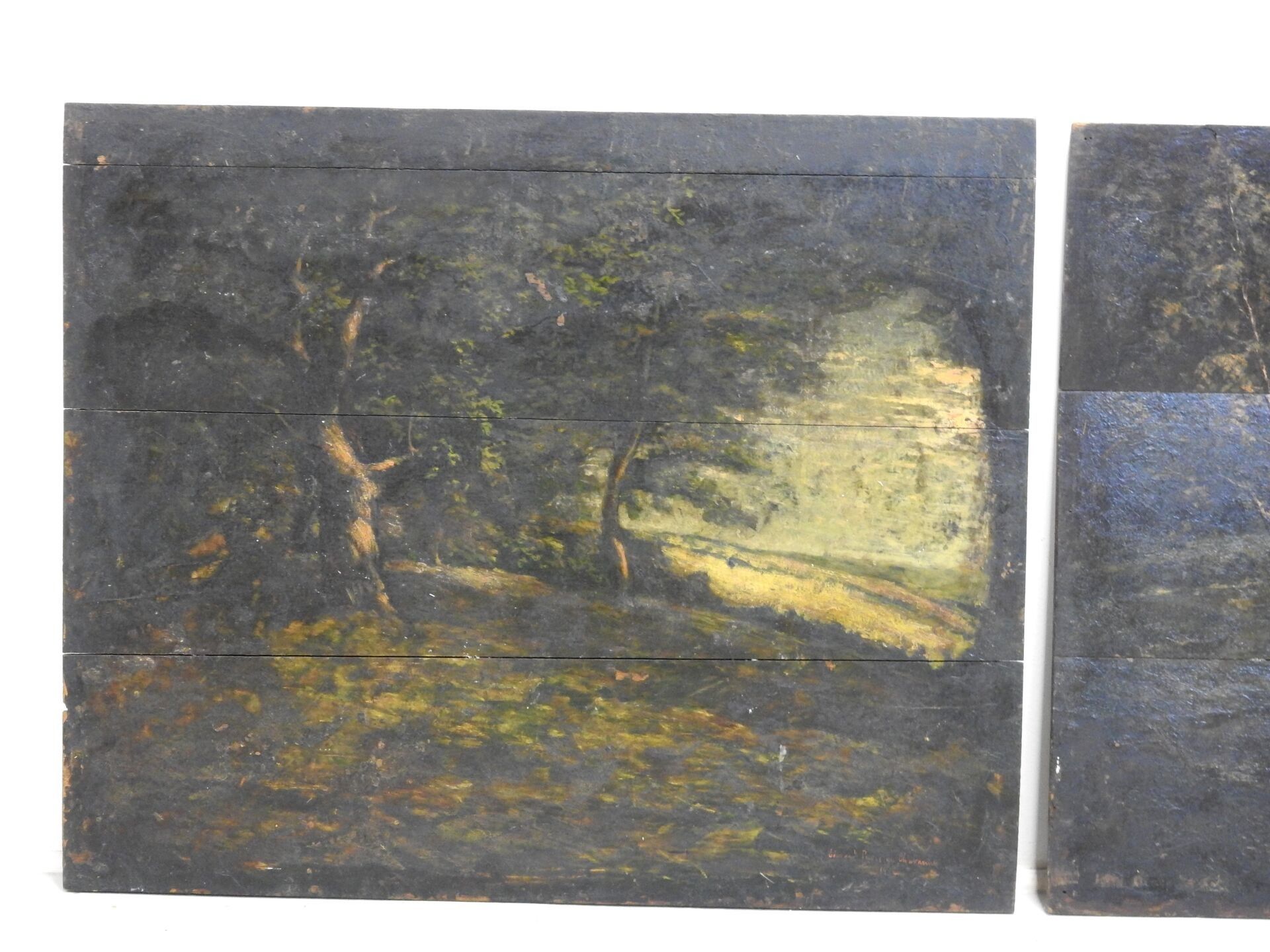 Édouard PUVIS de CHAVANNES (1884-1924). Under wood. Two oil paintings on panel (3 plates). Signed lower right. One dated 1912. 46 x 56 cm. Accidents: one board detached.