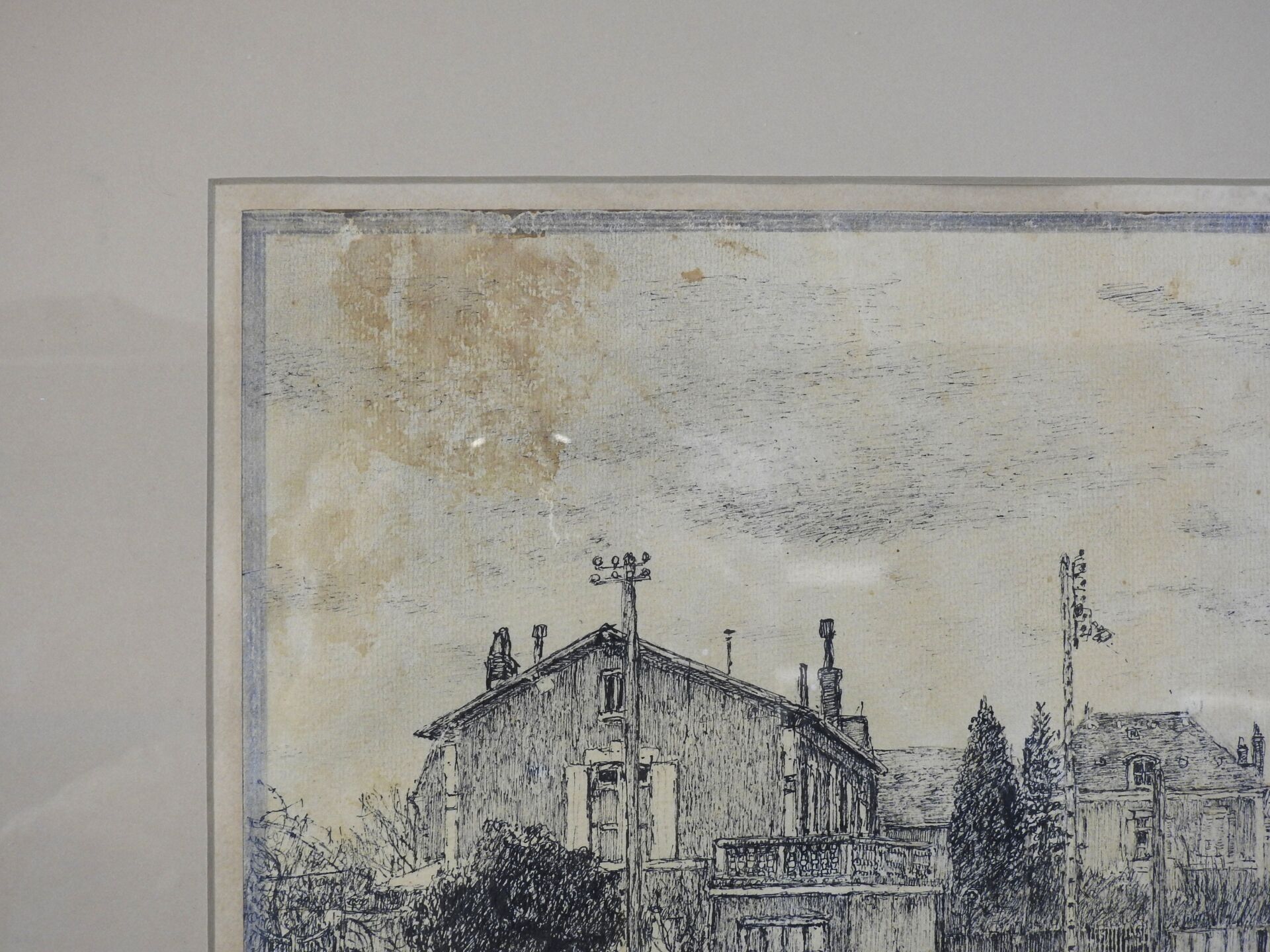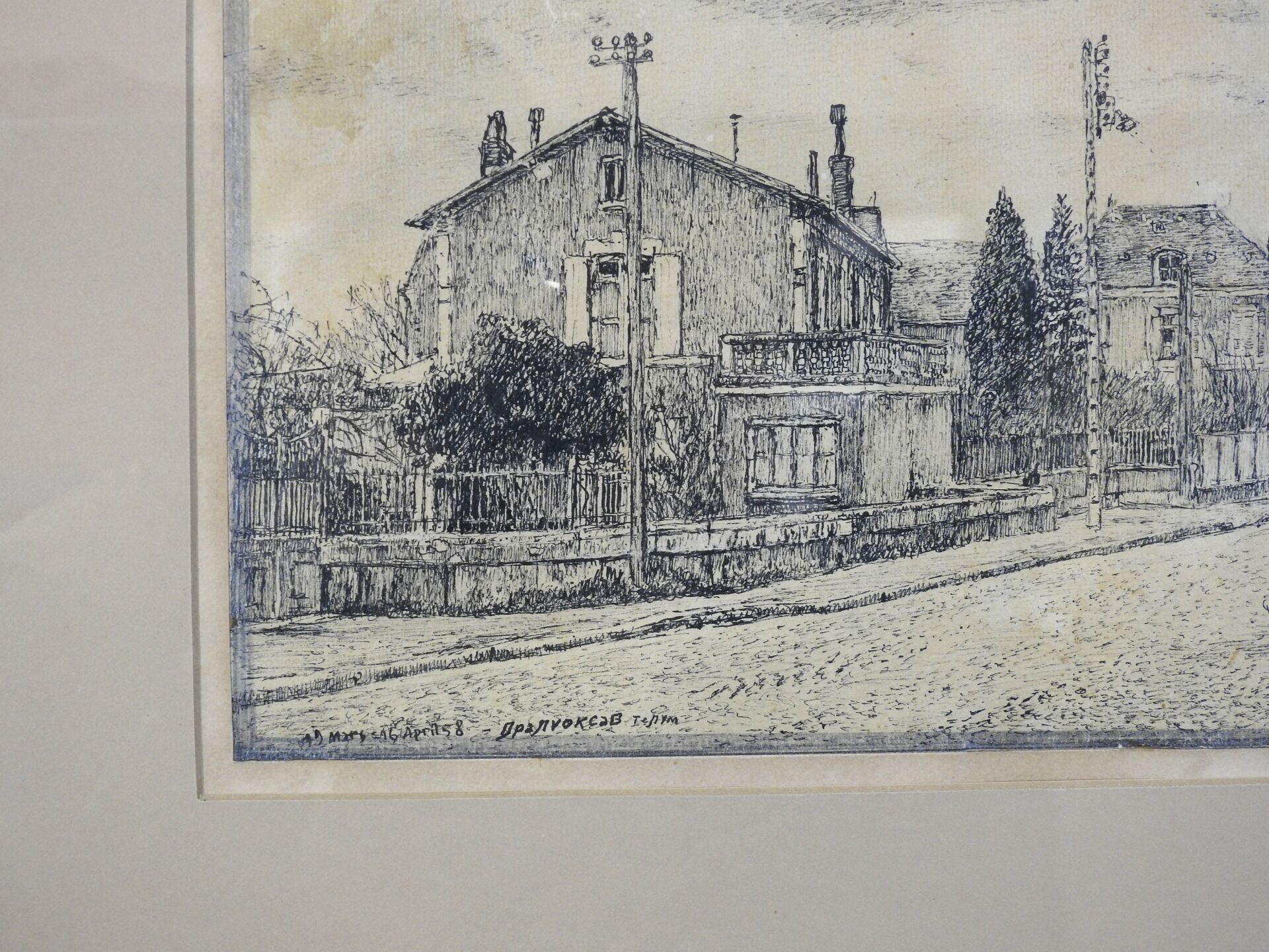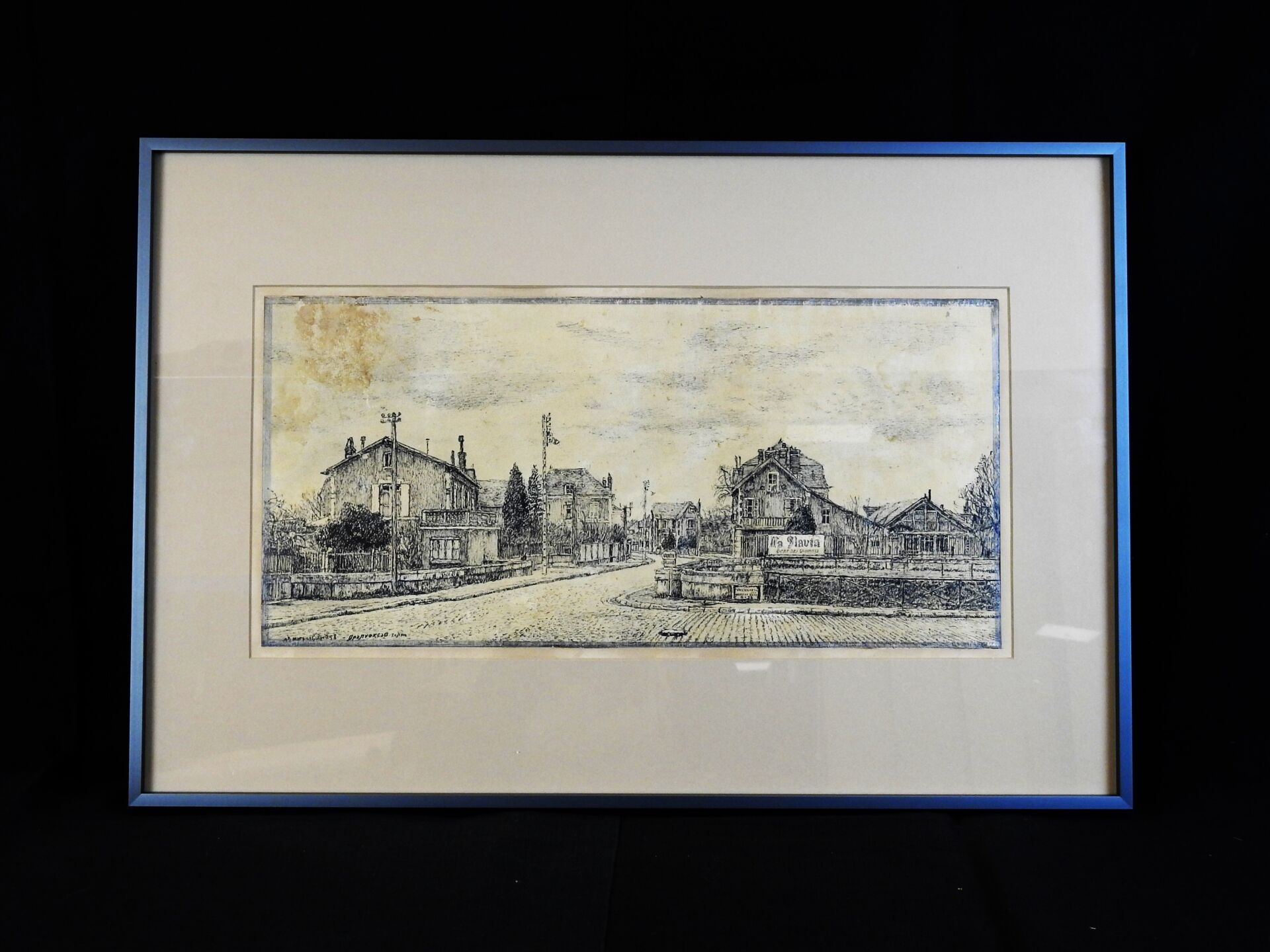 Marcel BASCOULARD (1913-1978): Avenue des Près le Roy. Ink on paper. Signed in Cyrillic lower left and dated 19 March - 16 April 1958. 46 x 22 cm. Size (Nielsen frame): 60 x 40 cm (foxing)