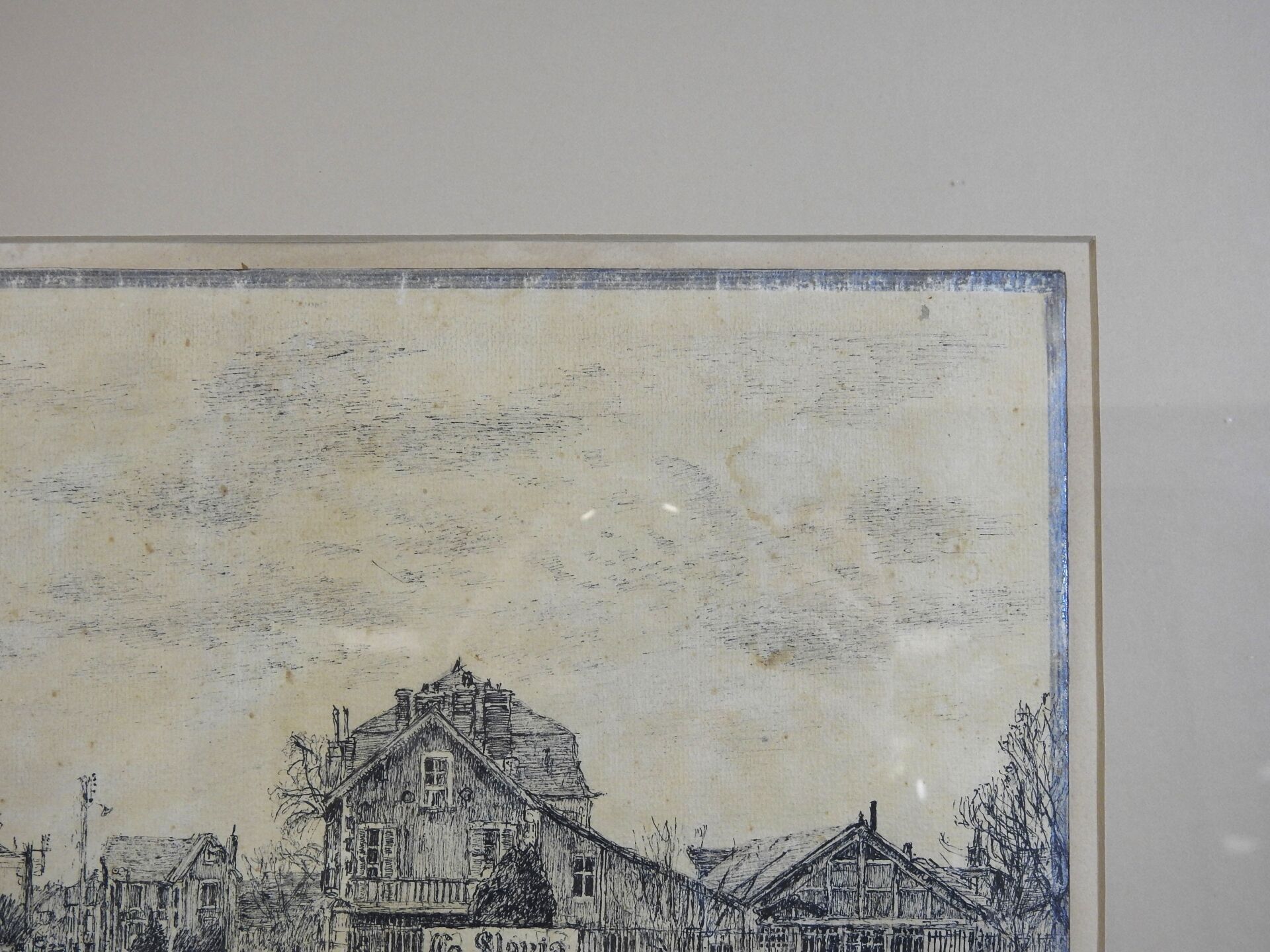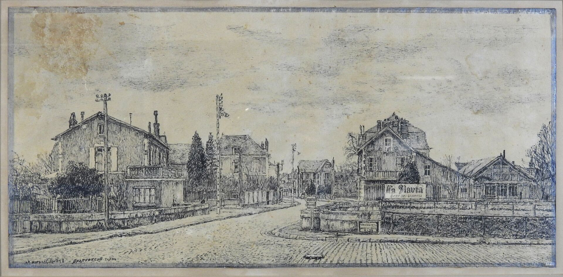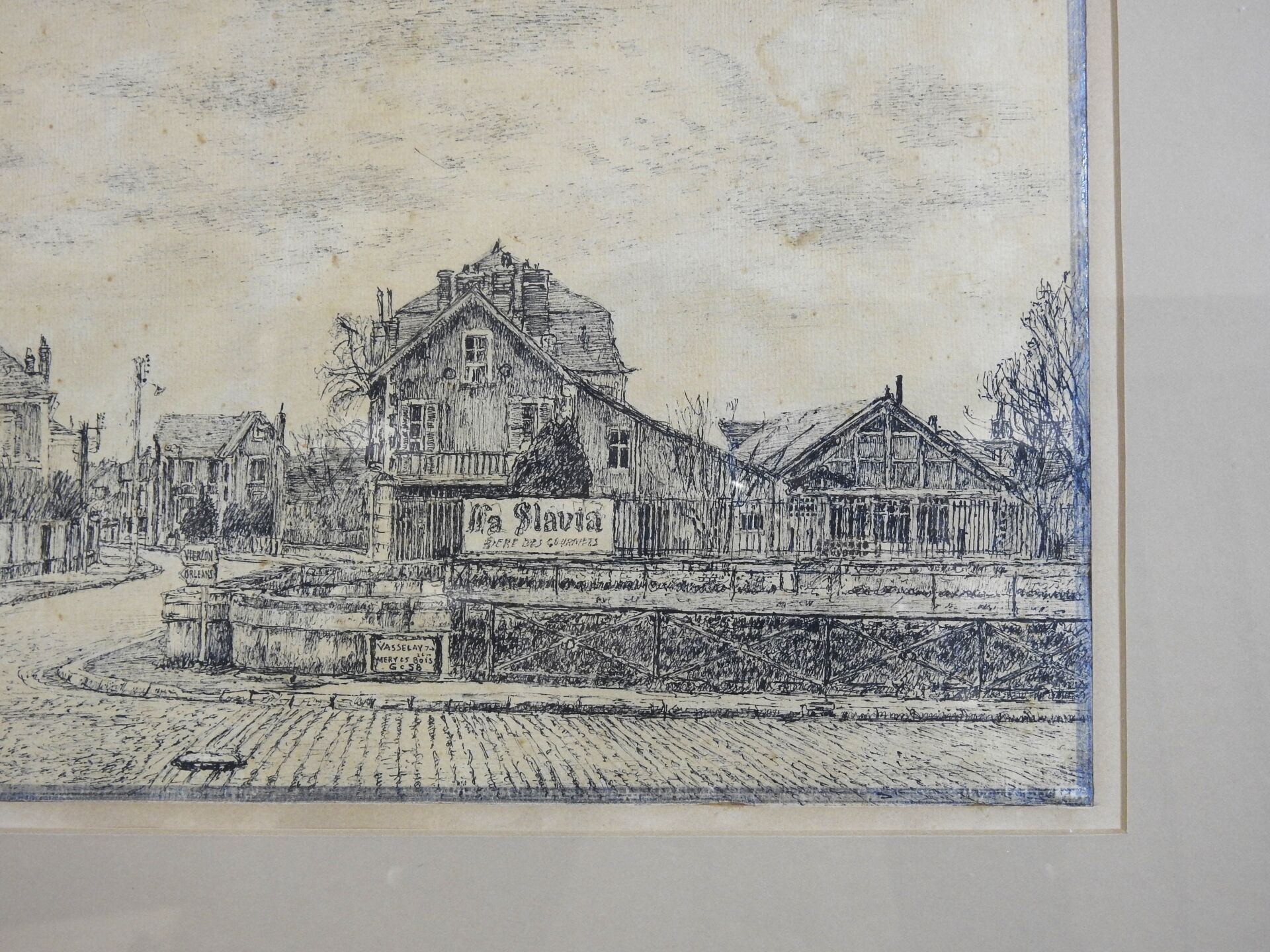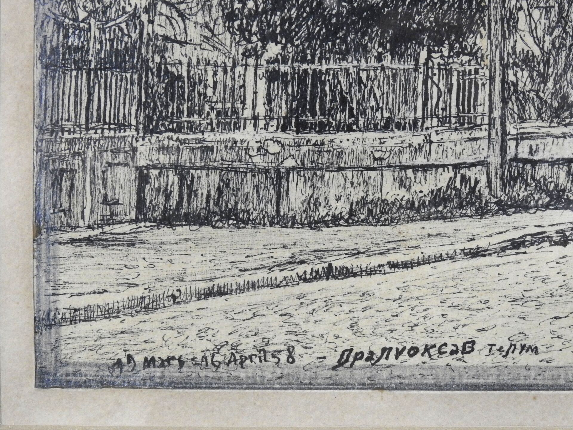 Marcel BASCOULARD (1913-1978): Avenue des Près le Roy. Ink on paper. Signed in Cyrillic lower left and dated 19 March - 16 April 1958. 46 x 22 cm. Size (Nielsen frame): 60 x 40 cm (foxing)