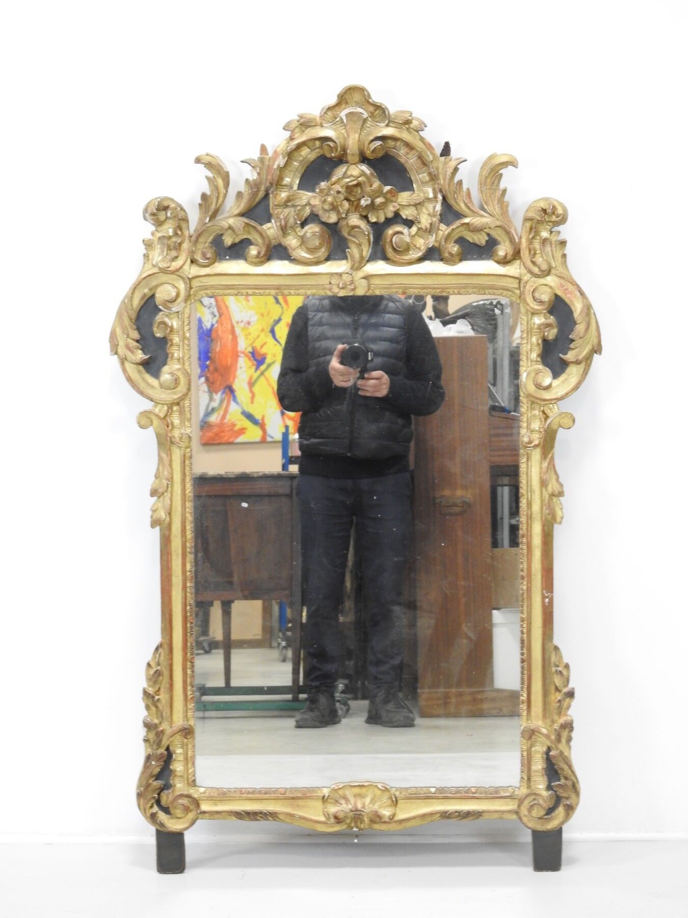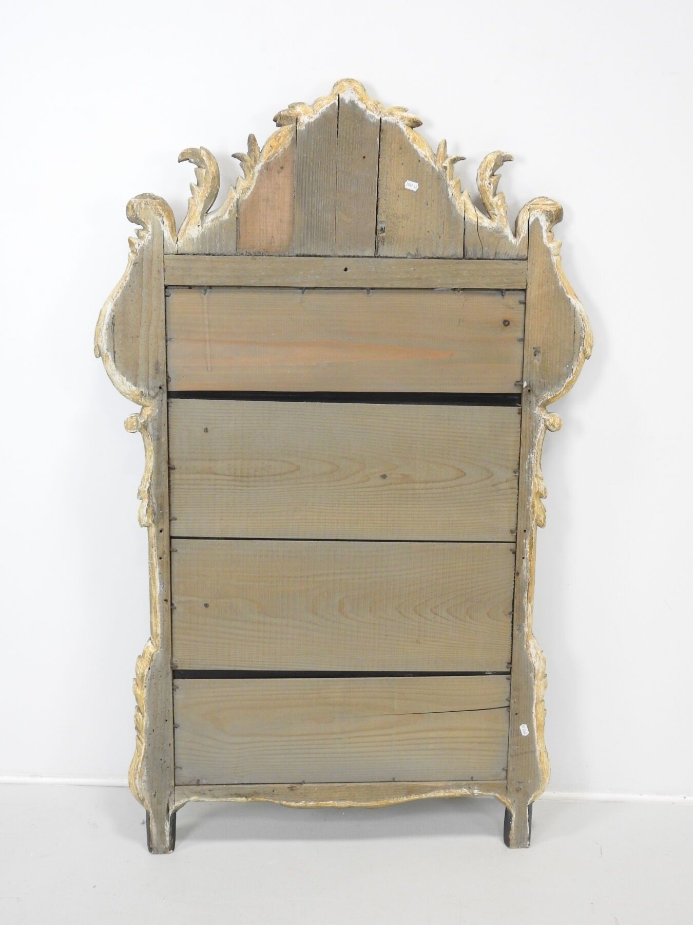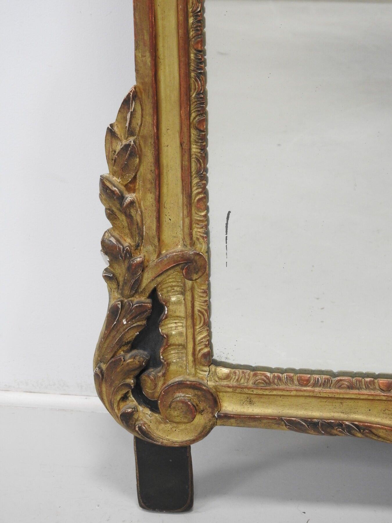 Wood and gilded stucco MIRROR, the pediment decorated with shells and foliage. 19th century. 130 x 80 cm (small missing pieces)