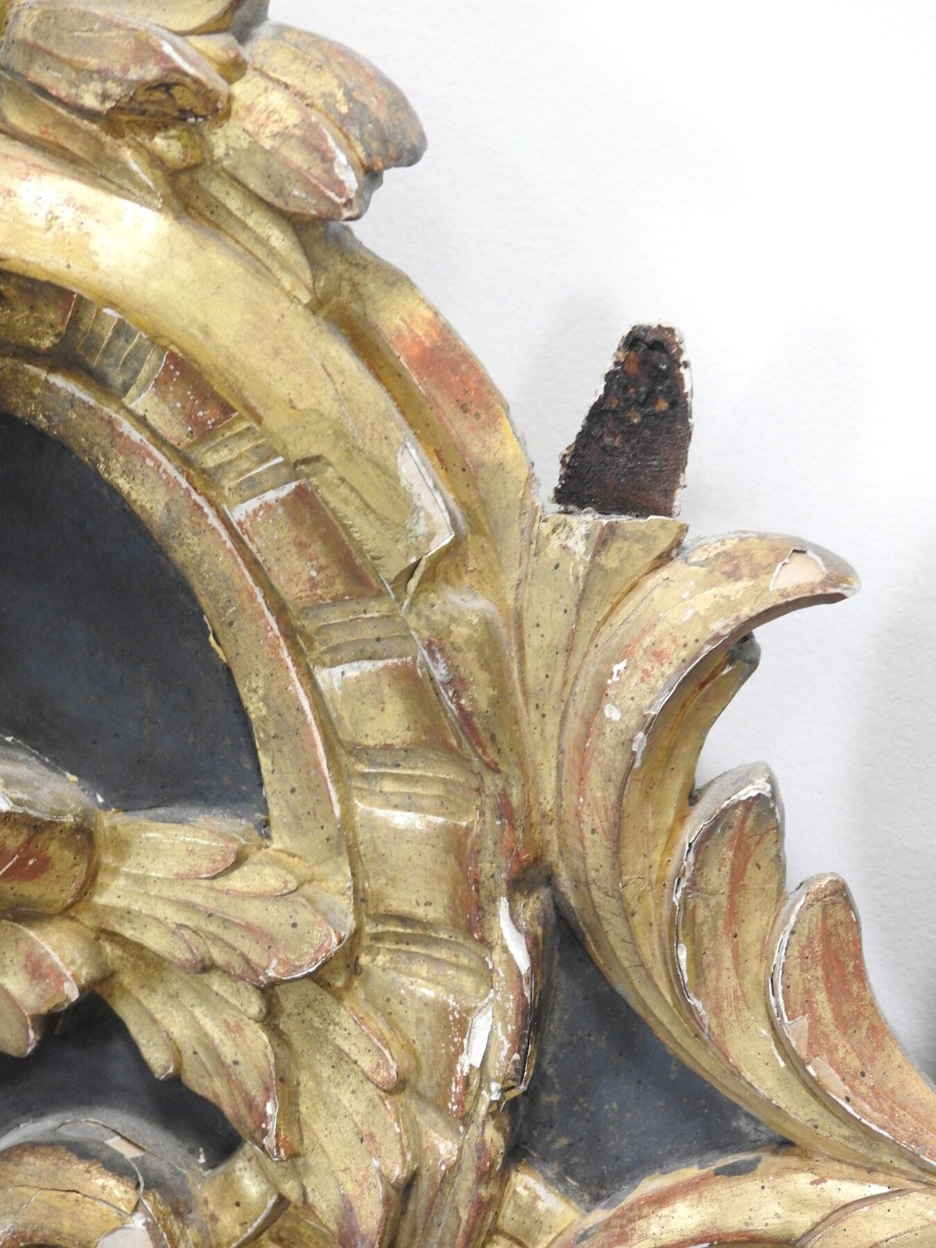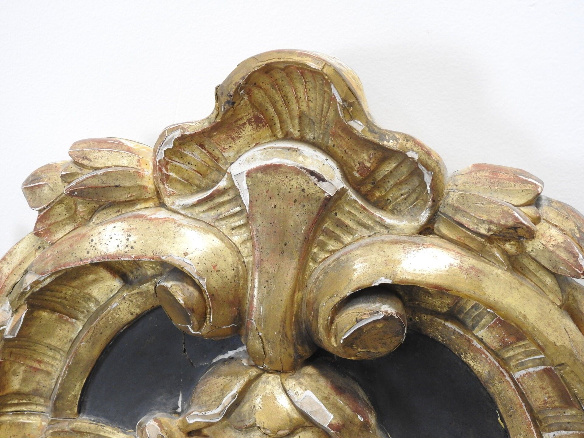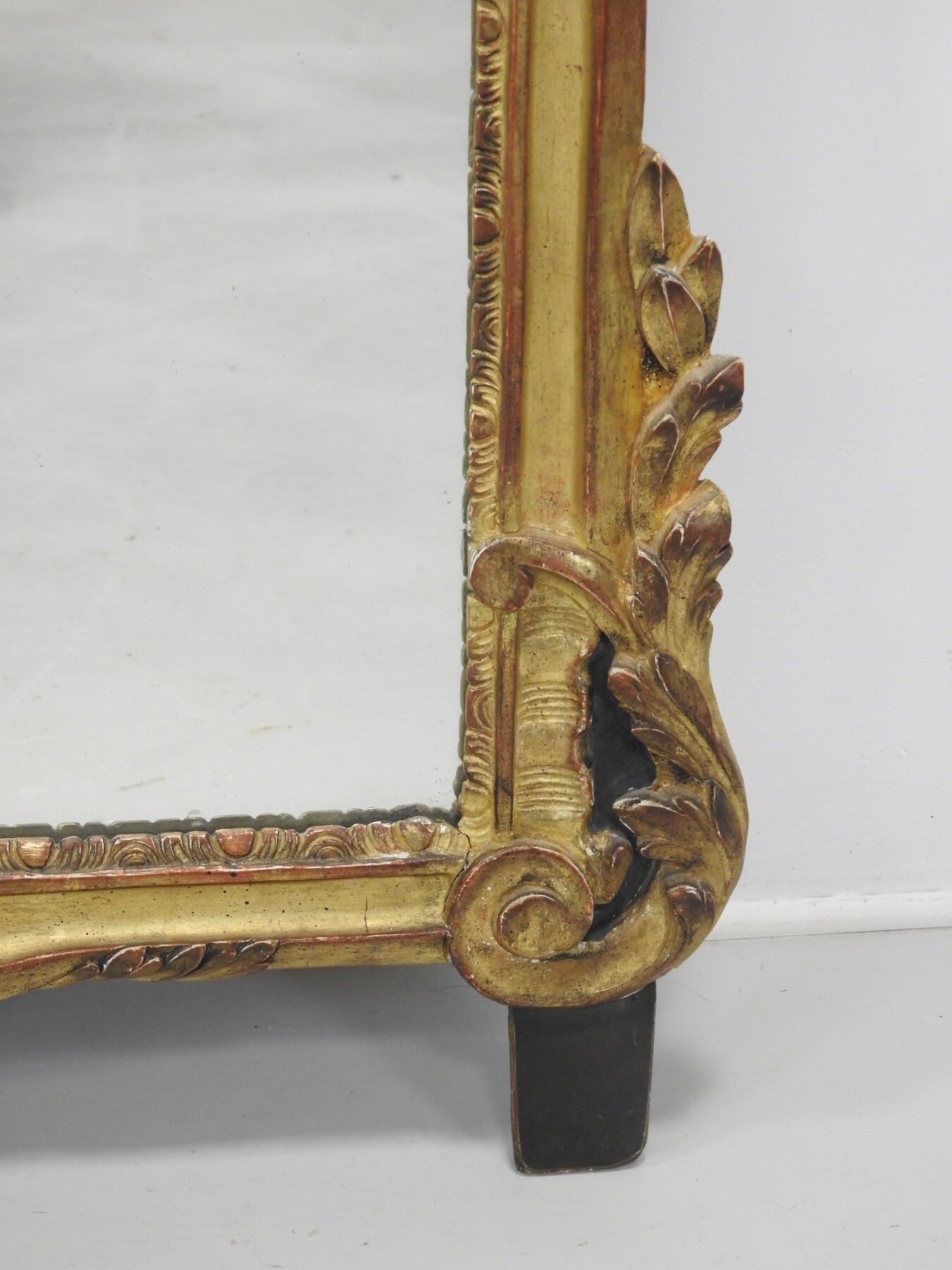 Wood and gilded stucco MIRROR, the pediment decorated with shells and foliage. 19th century. 130 x 80 cm (small missing pieces)