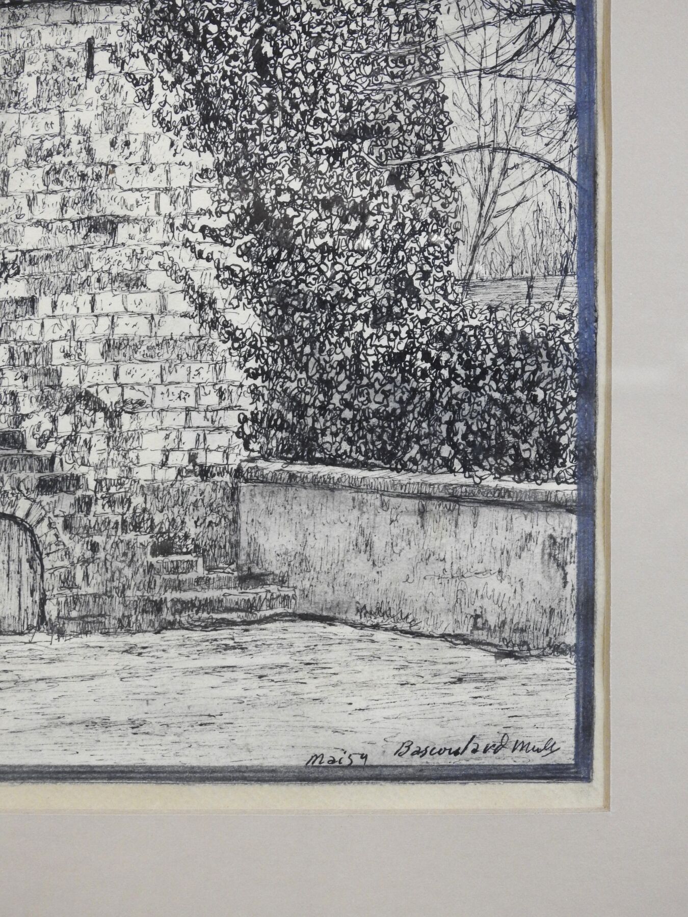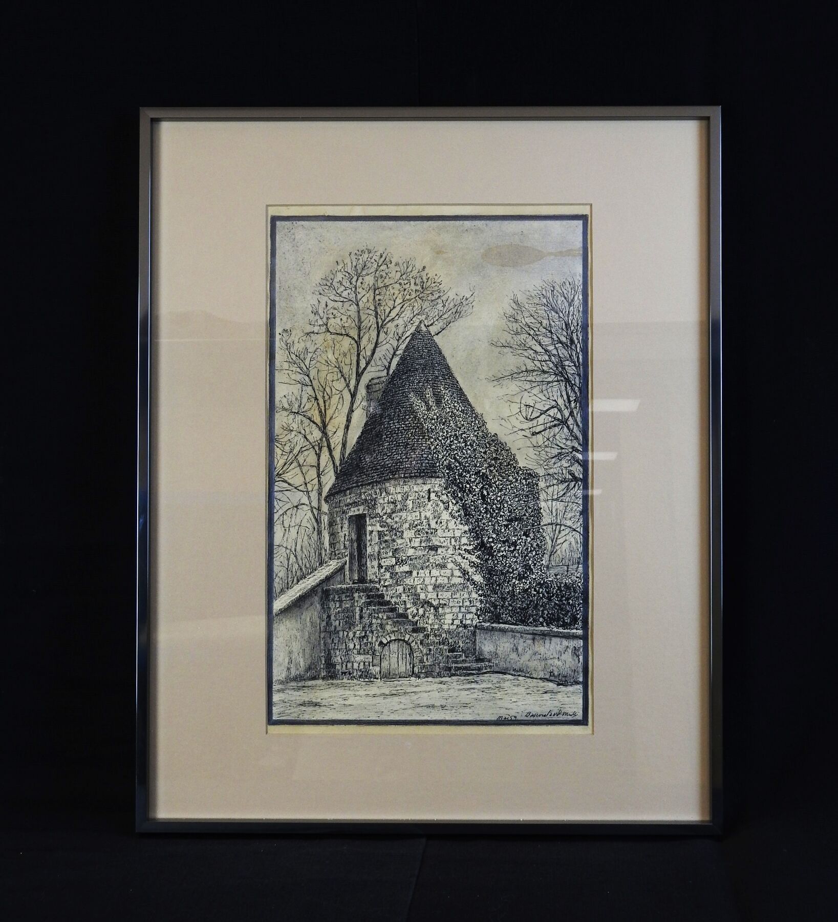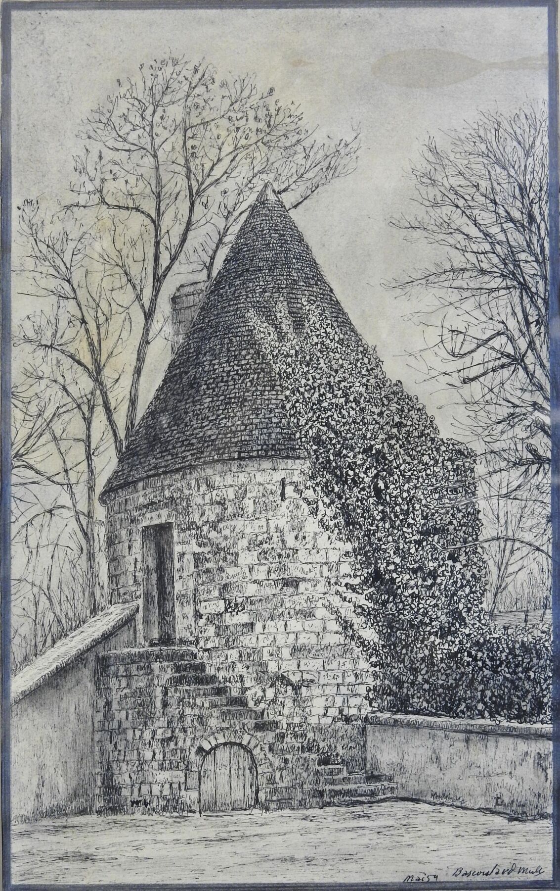 Marcel BASCOULARD (1913-1978): The gunpowder tower, boulevard Lamarck in Bourges (with foliage). Ink and wash. Signed and dated May 57 at bottom. 36 x 23 cm. Size (Nielsen frame): 50 x 40 cm.