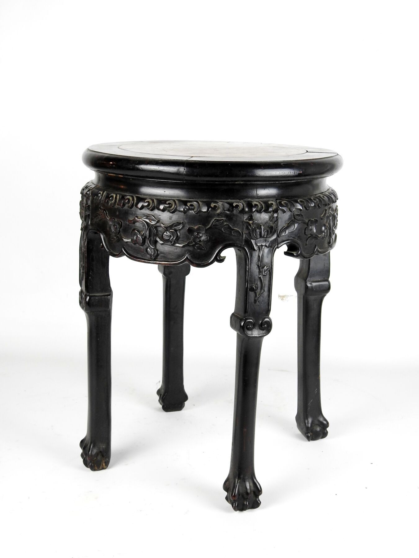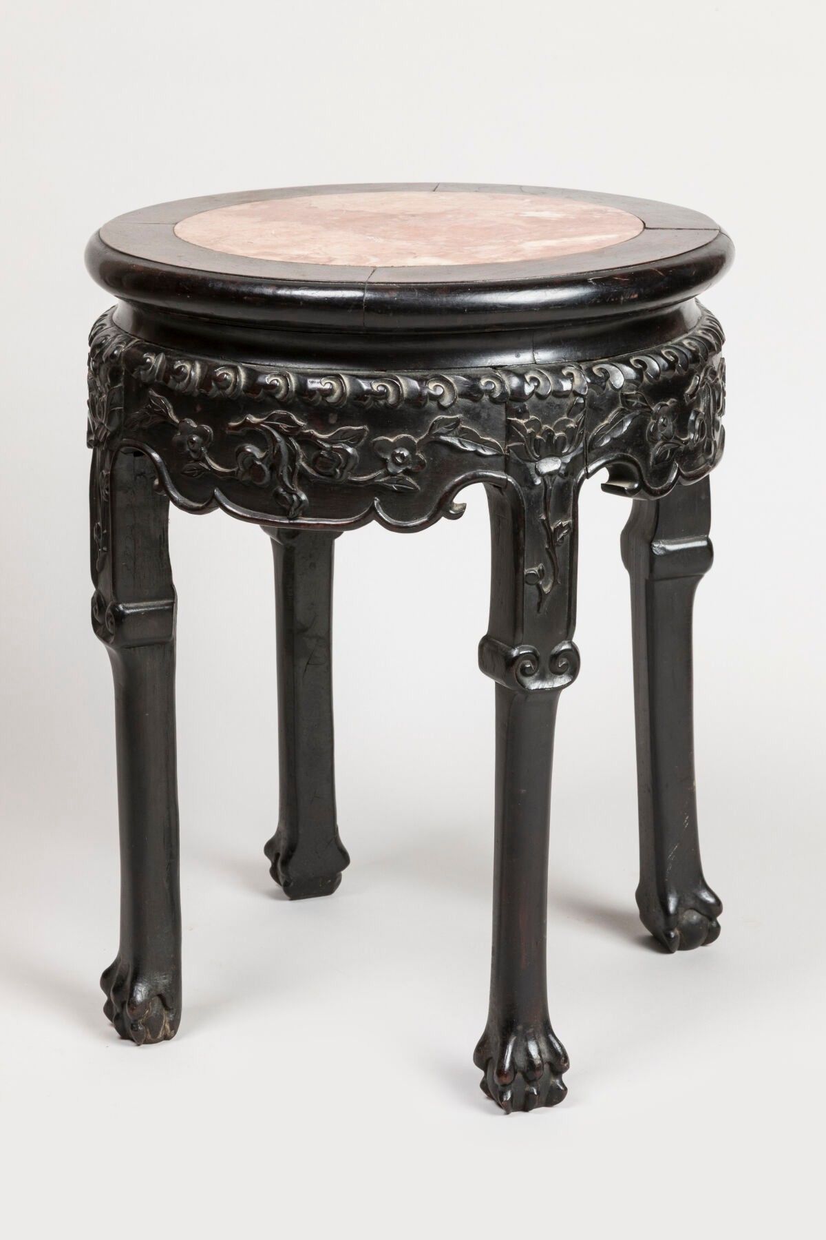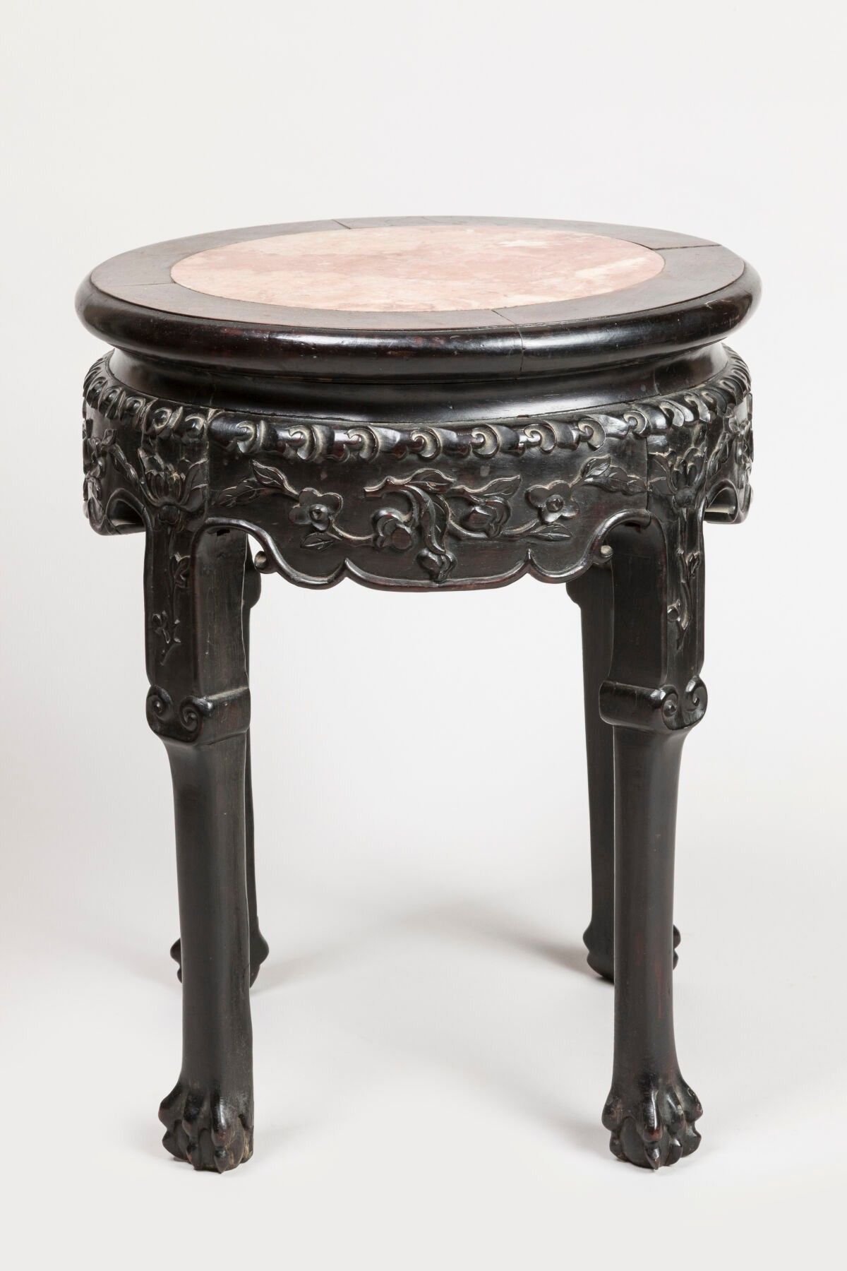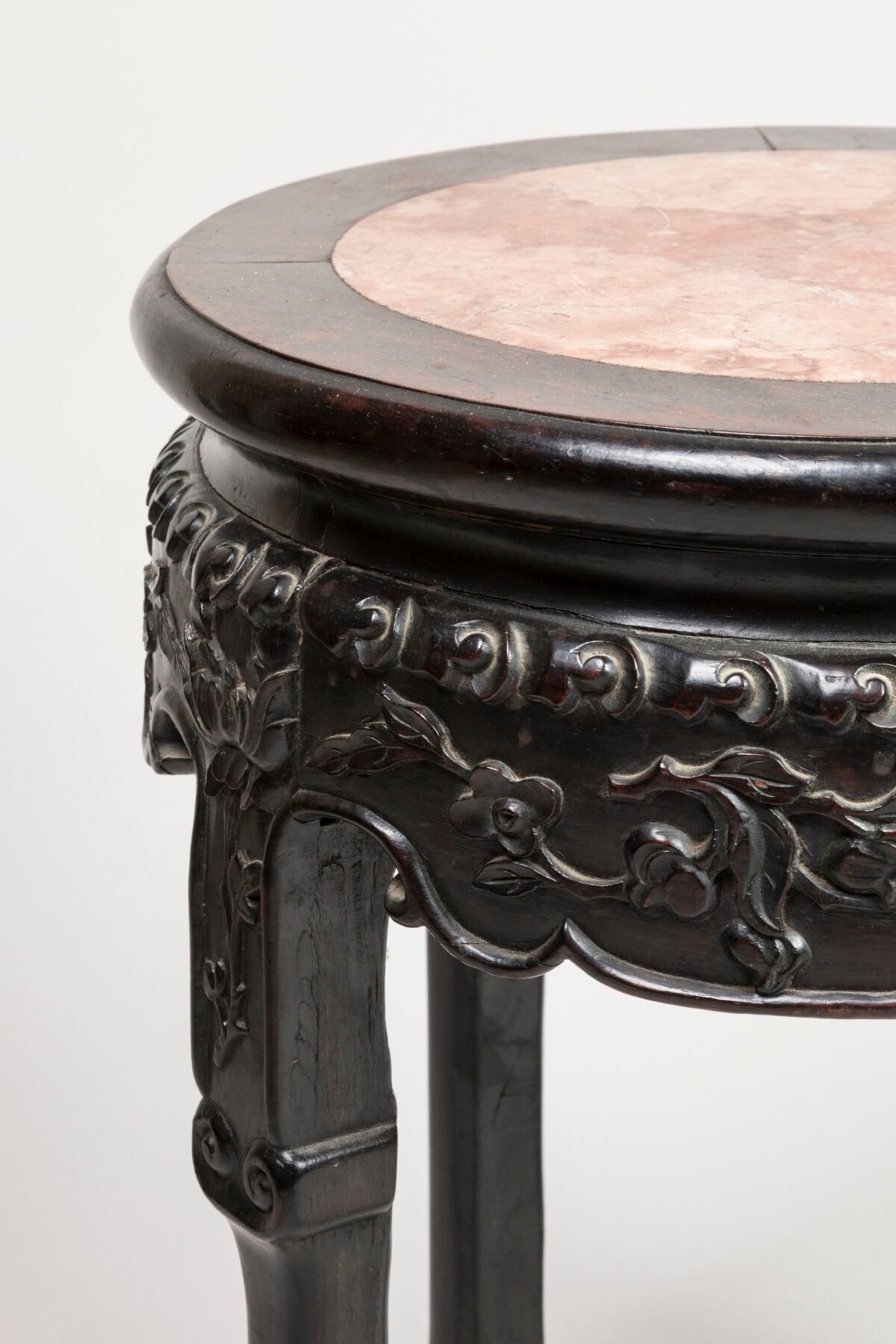 INDOCHINA or CHINA: A four-legged stool in carved exotic wood, the circular top in pink marble. Late 19th century. H. 44 - Diam. 35 cm. Minor wear.