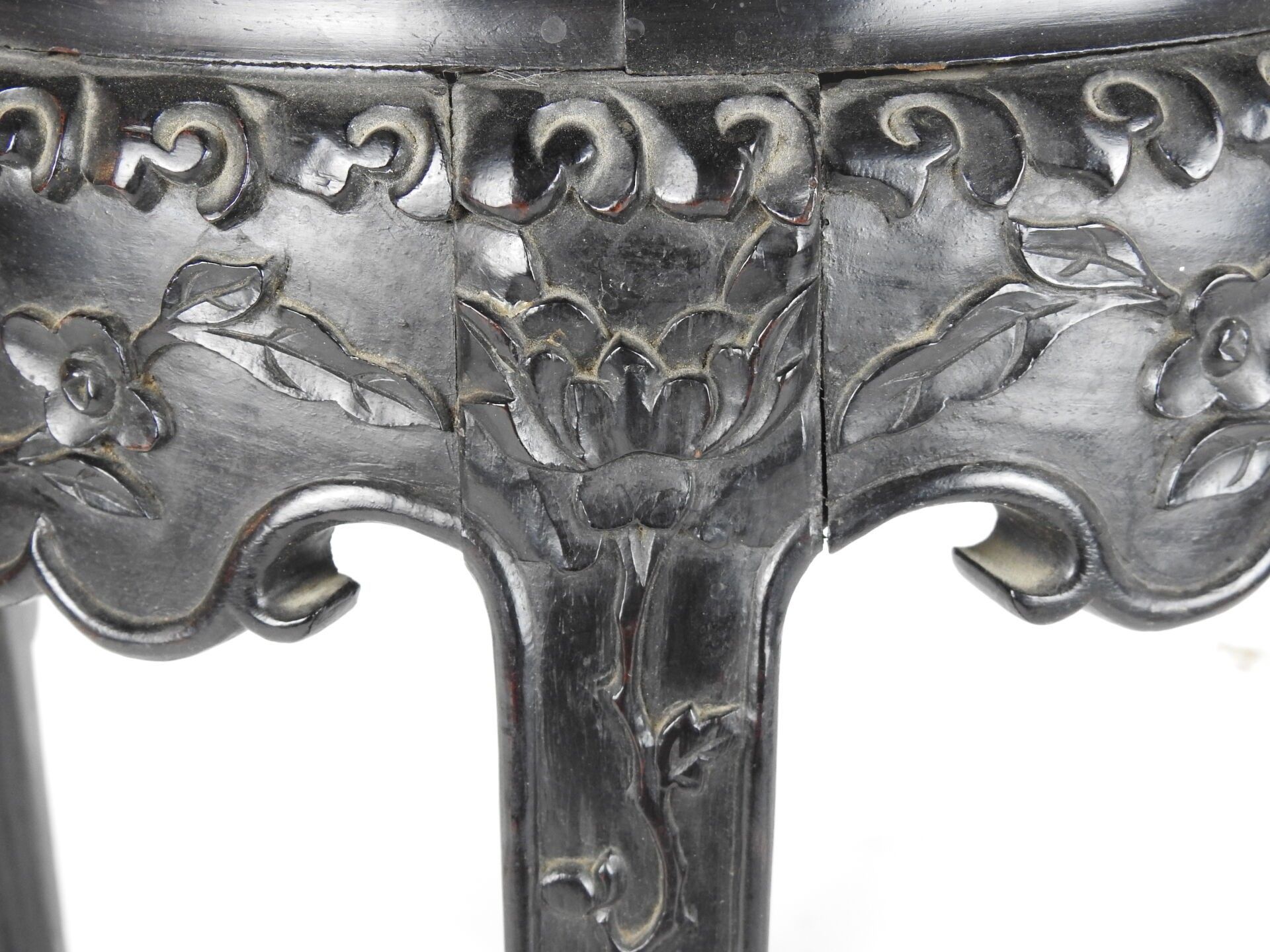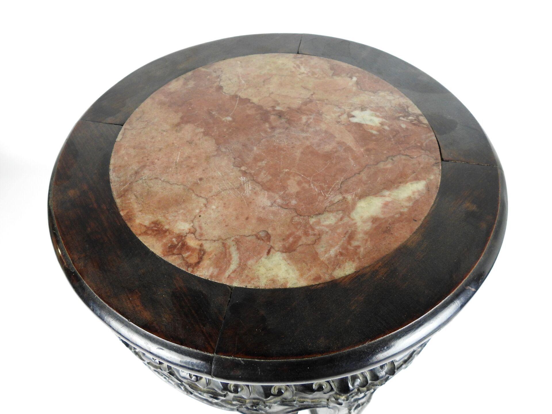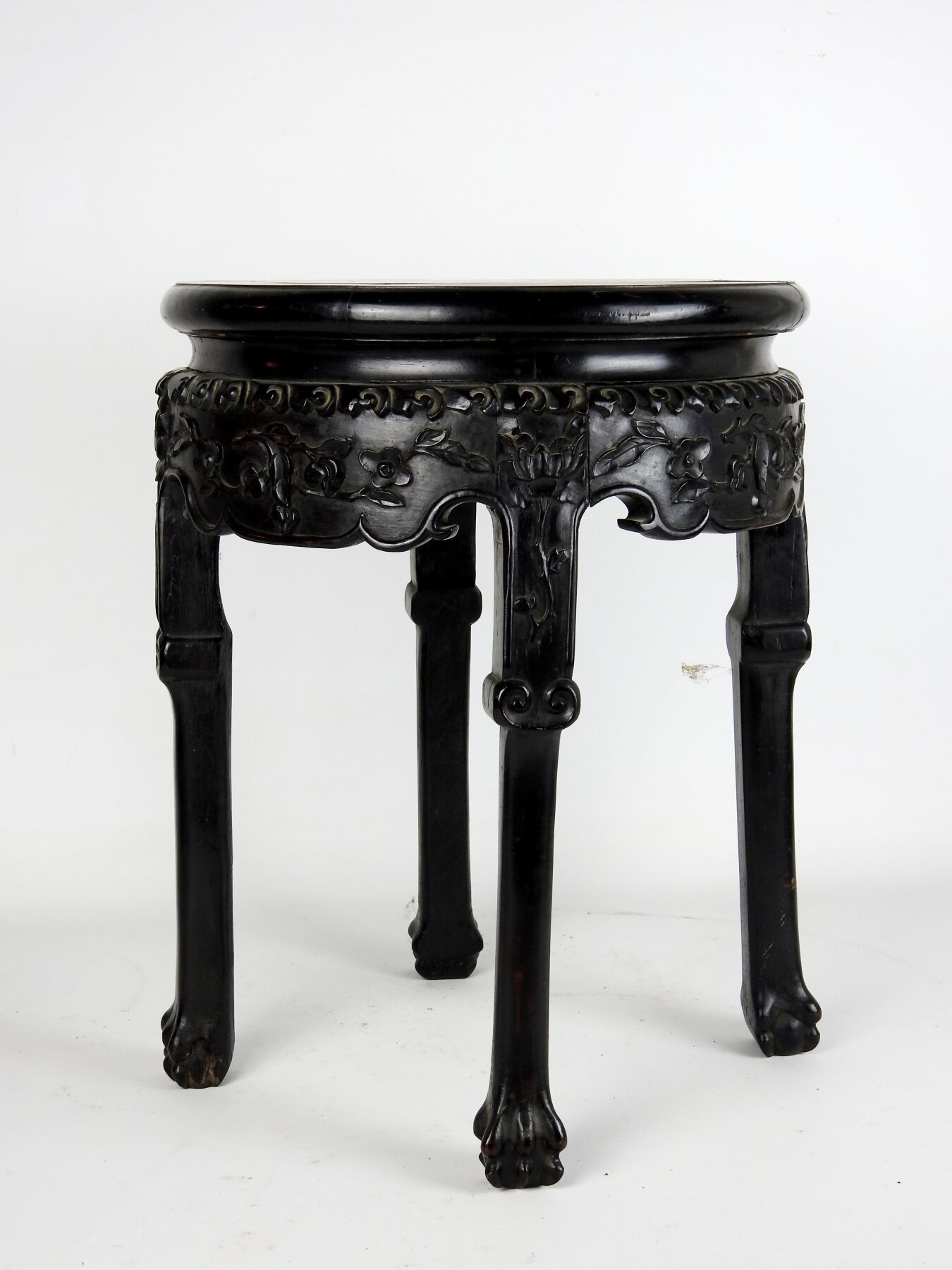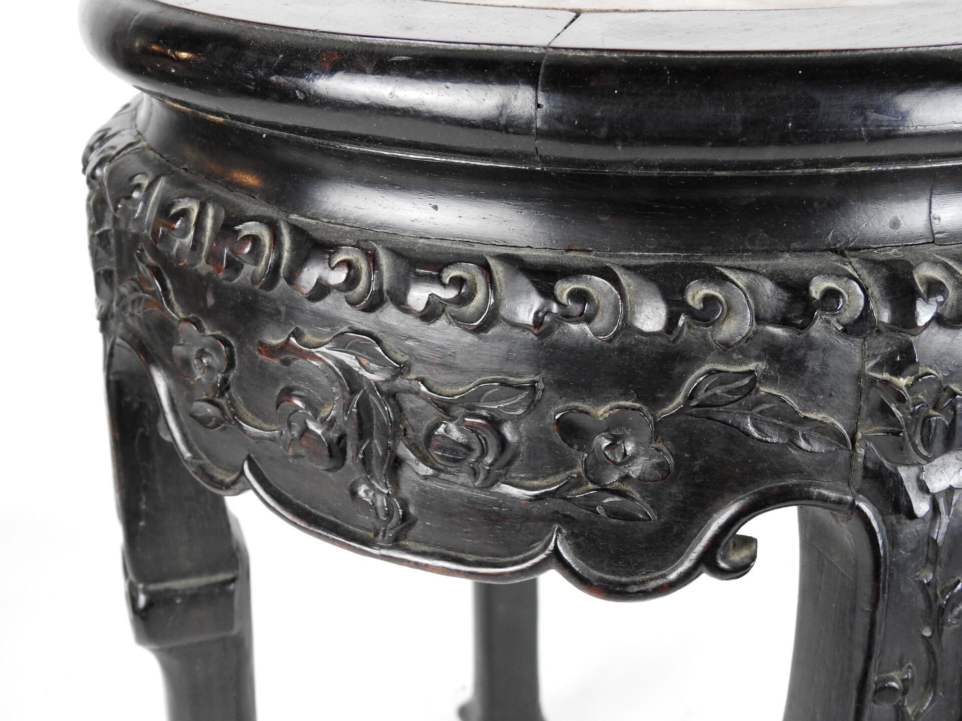 INDOCHINA or CHINA: A four-legged stool in carved exotic wood, the circular top in pink marble. Late 19th century. H. 44 - Diam. 35 cm. Minor wear.