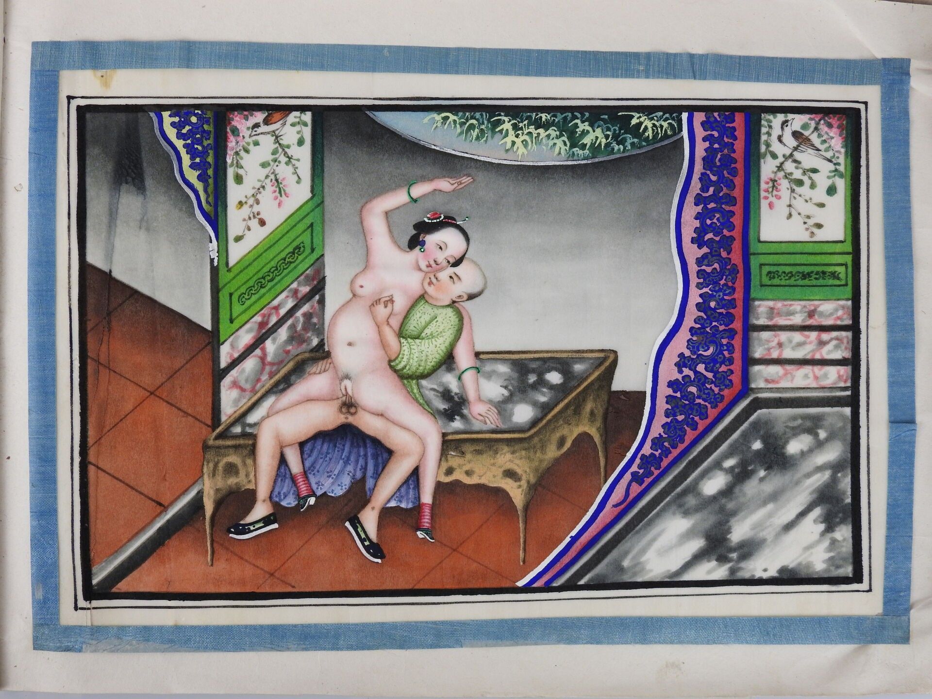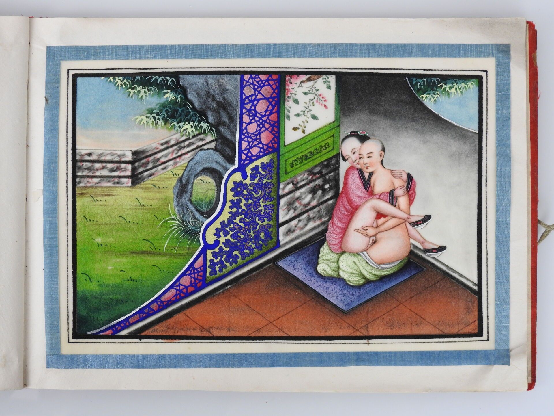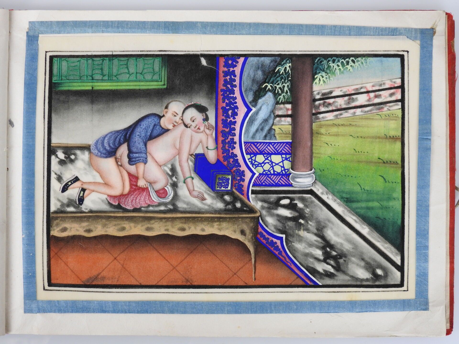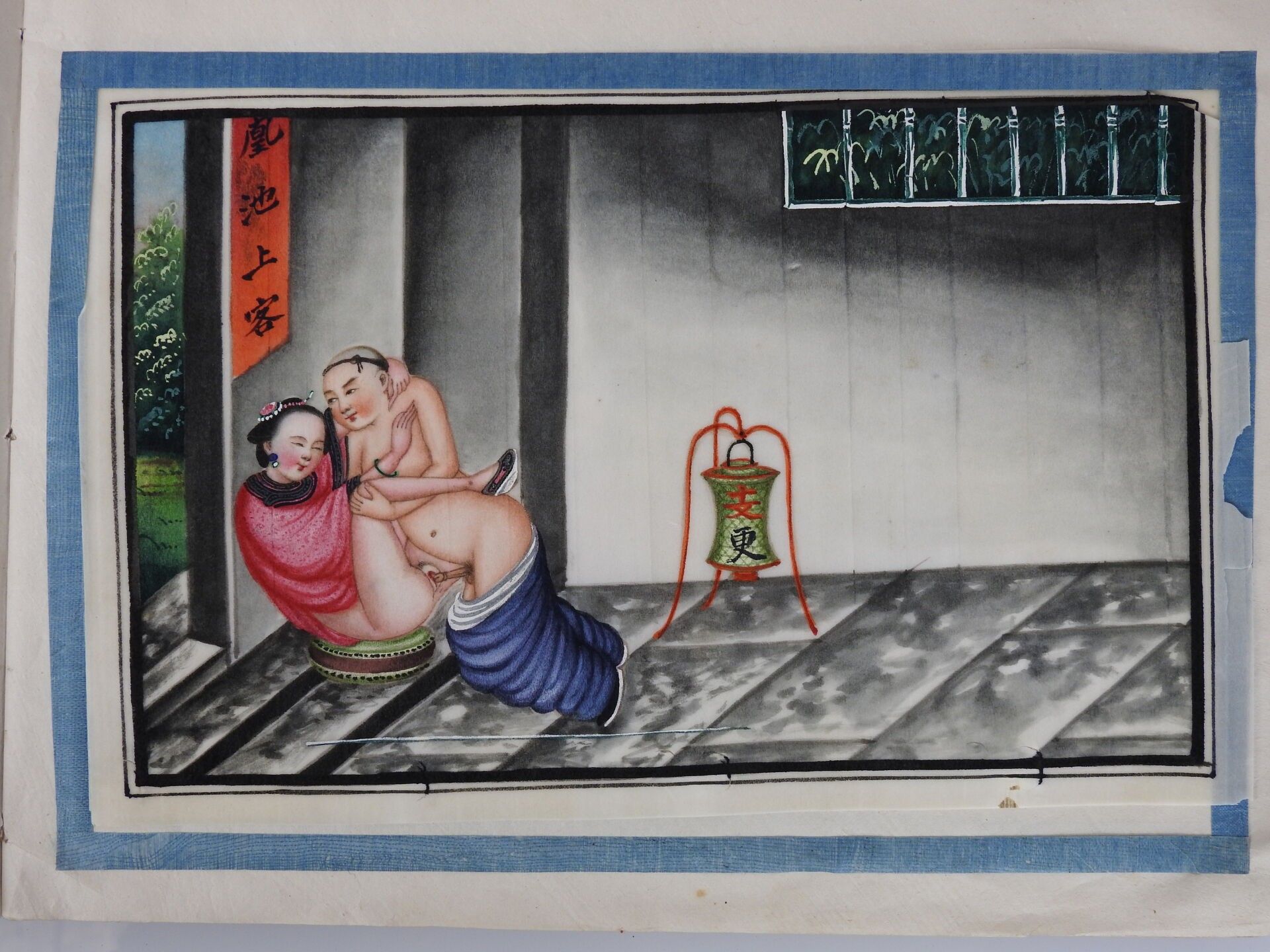 CANTON: Album containing twelve gouaches on paper depicting erotic scenes. Late 19th century. Size (photos): 23 x 15 cm. Size (Italian format): 21 x 29 cm