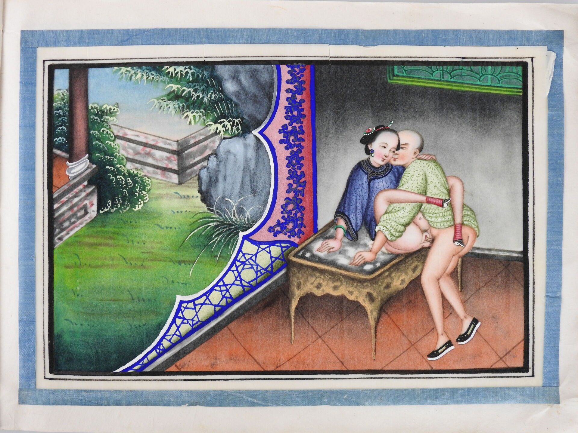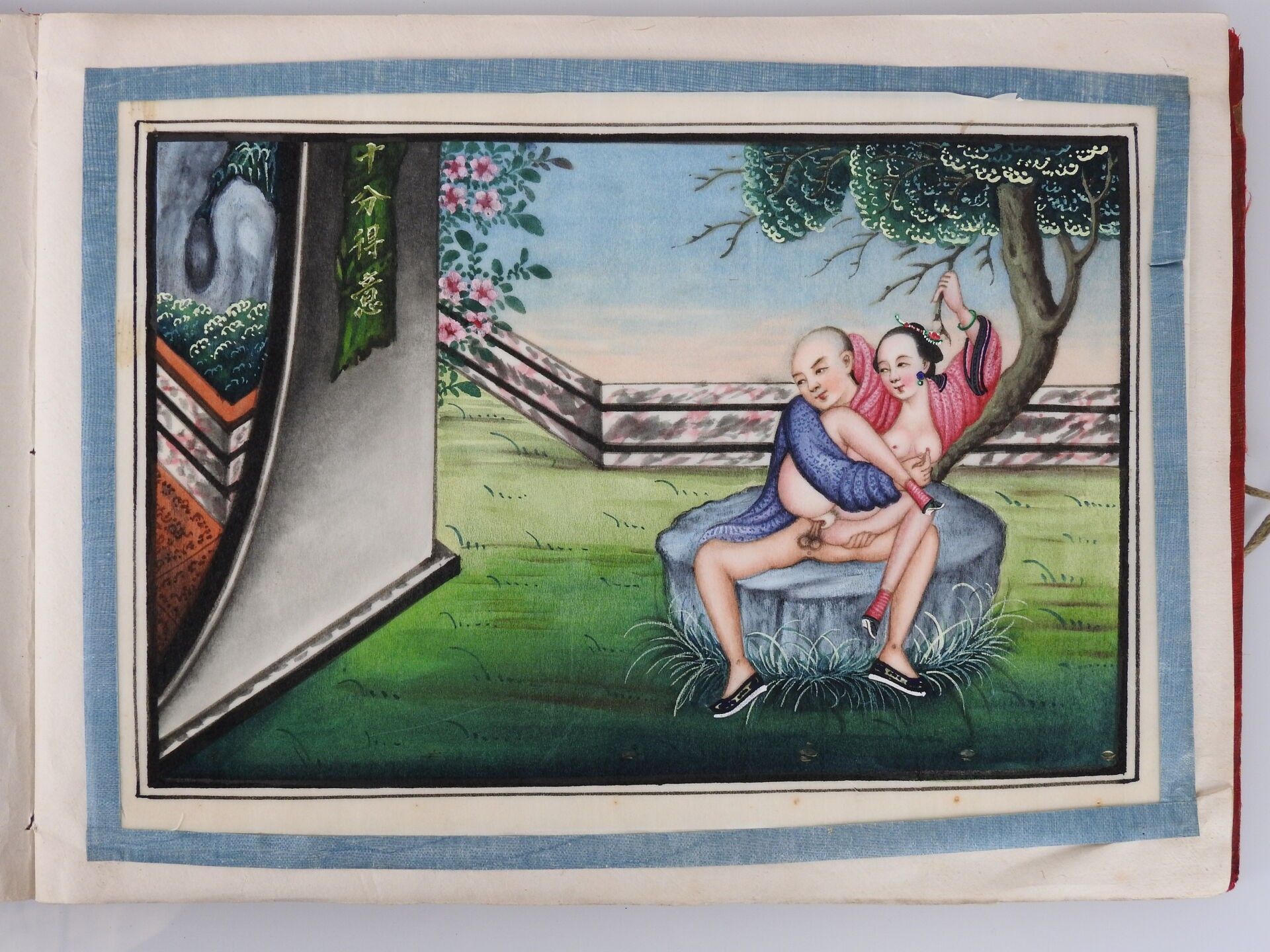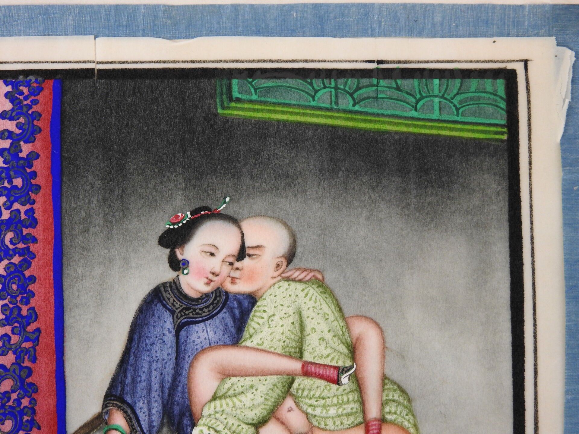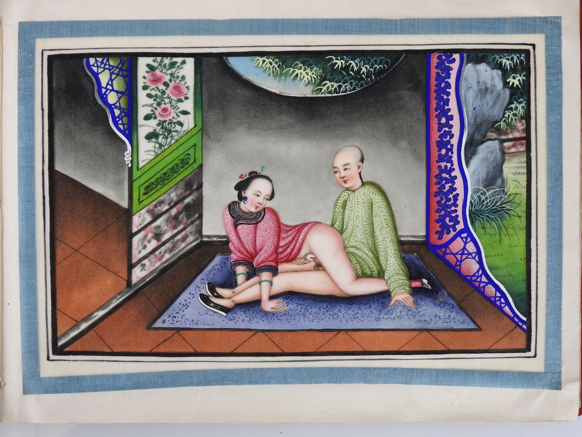 CANTON: Album containing twelve gouaches on paper depicting erotic scenes. Late 19th century. Size (photos): 23 x 15 cm. Size (Italian format): 21 x 29 cm
