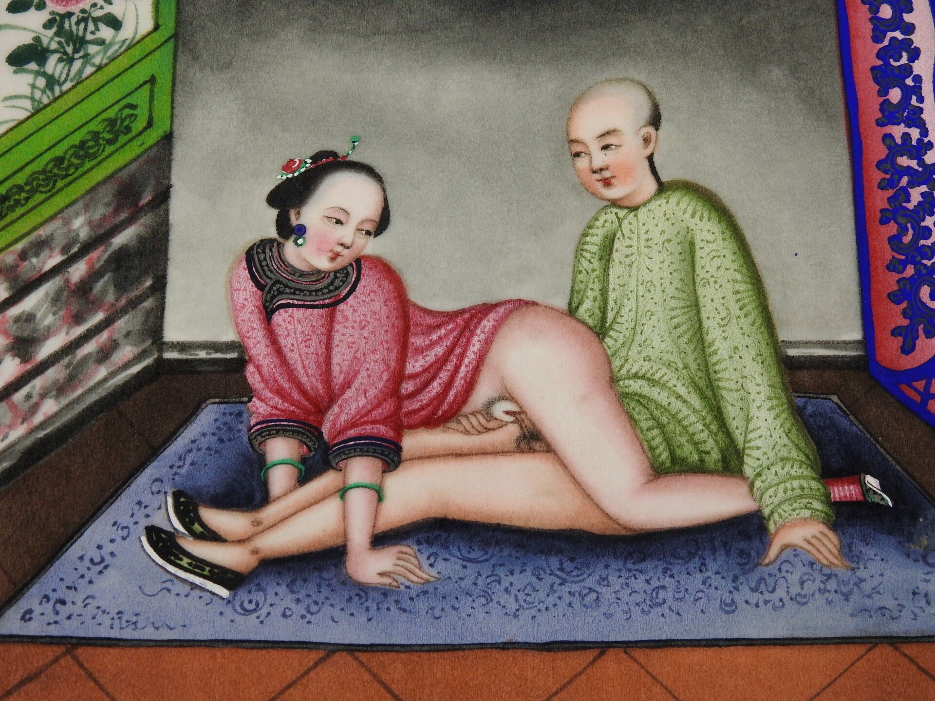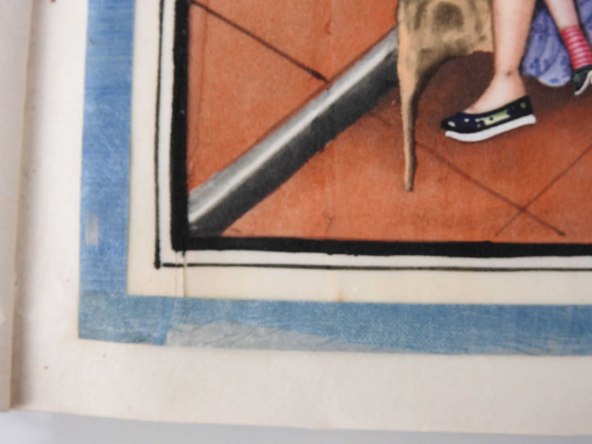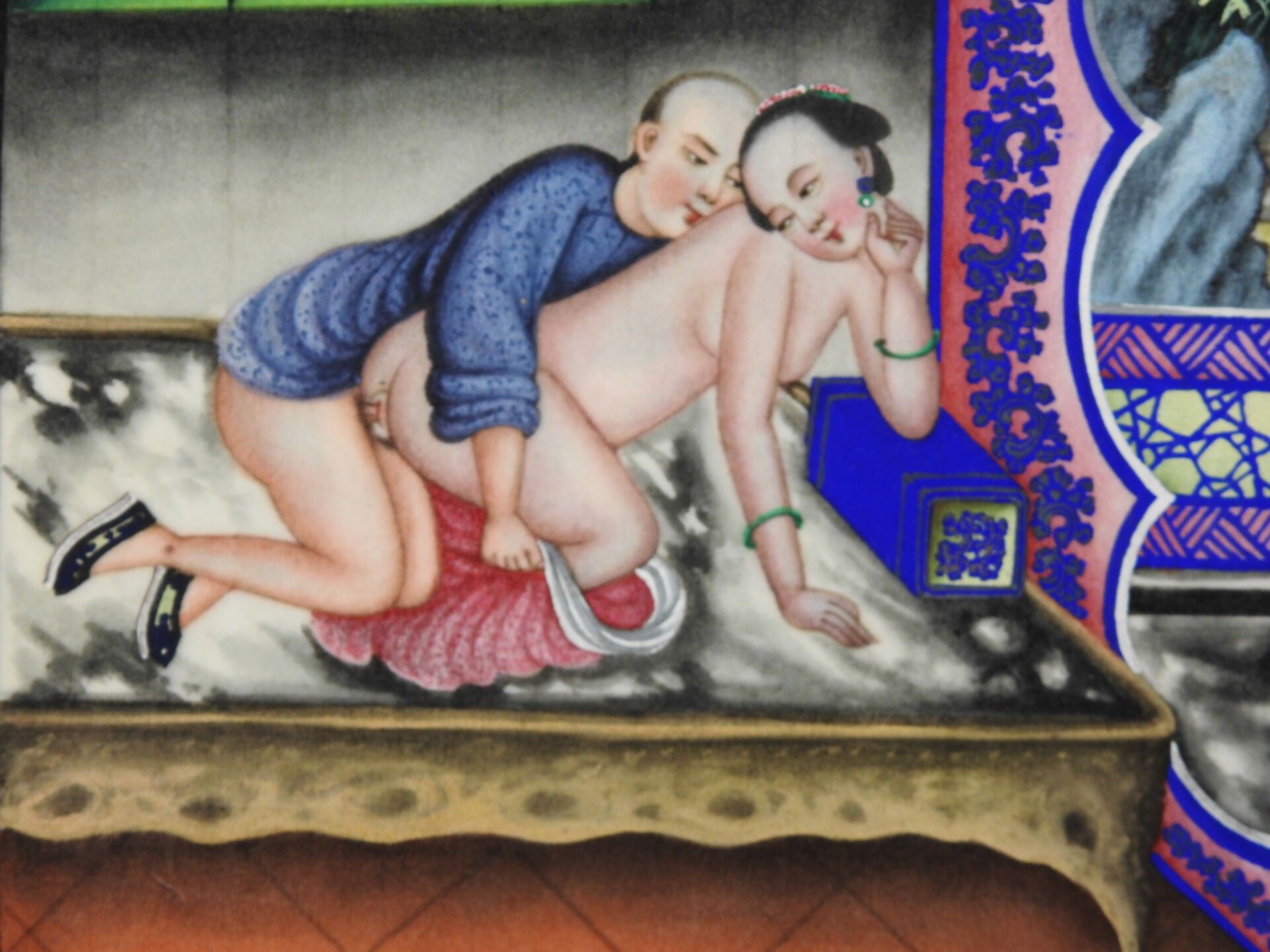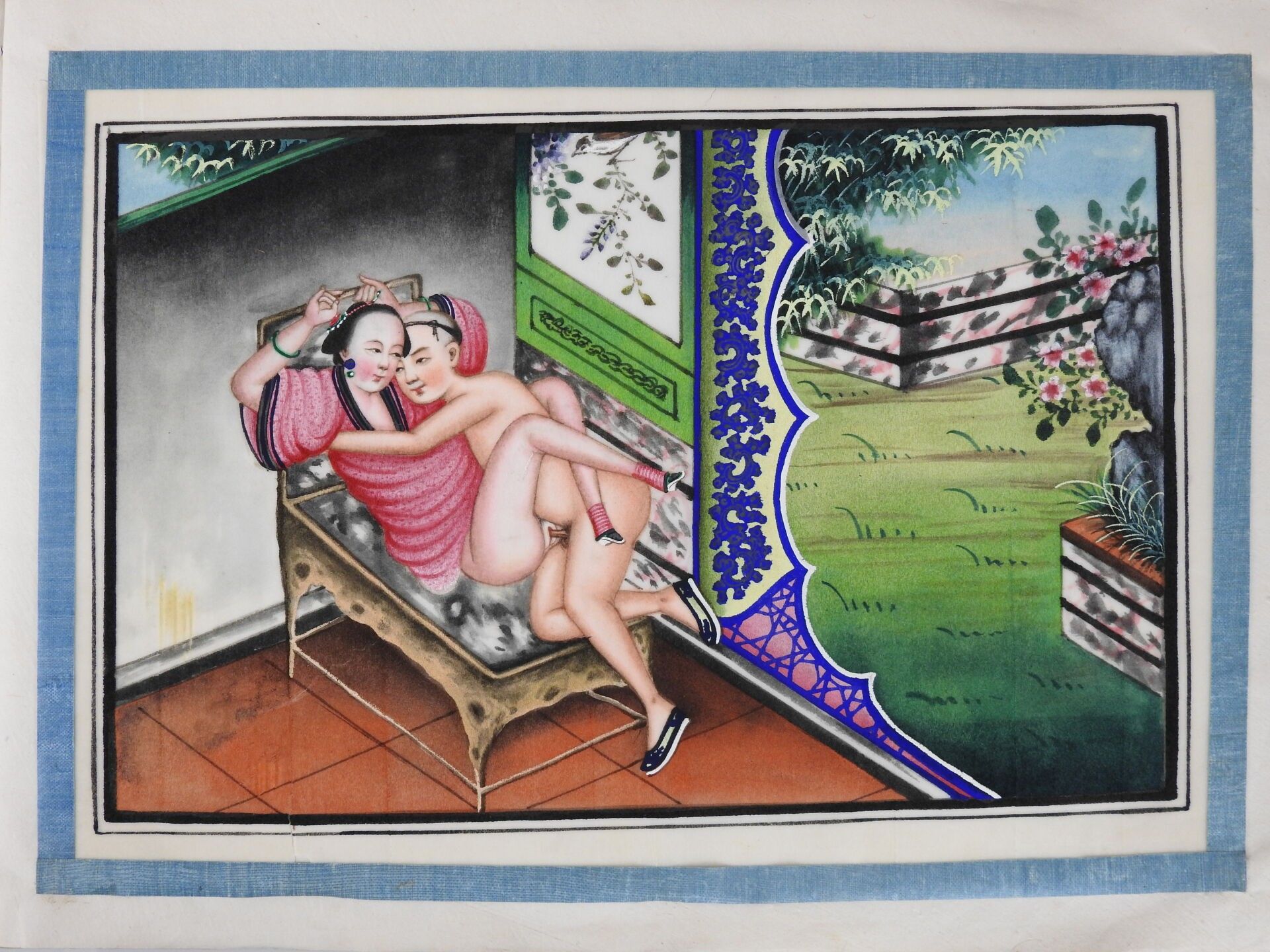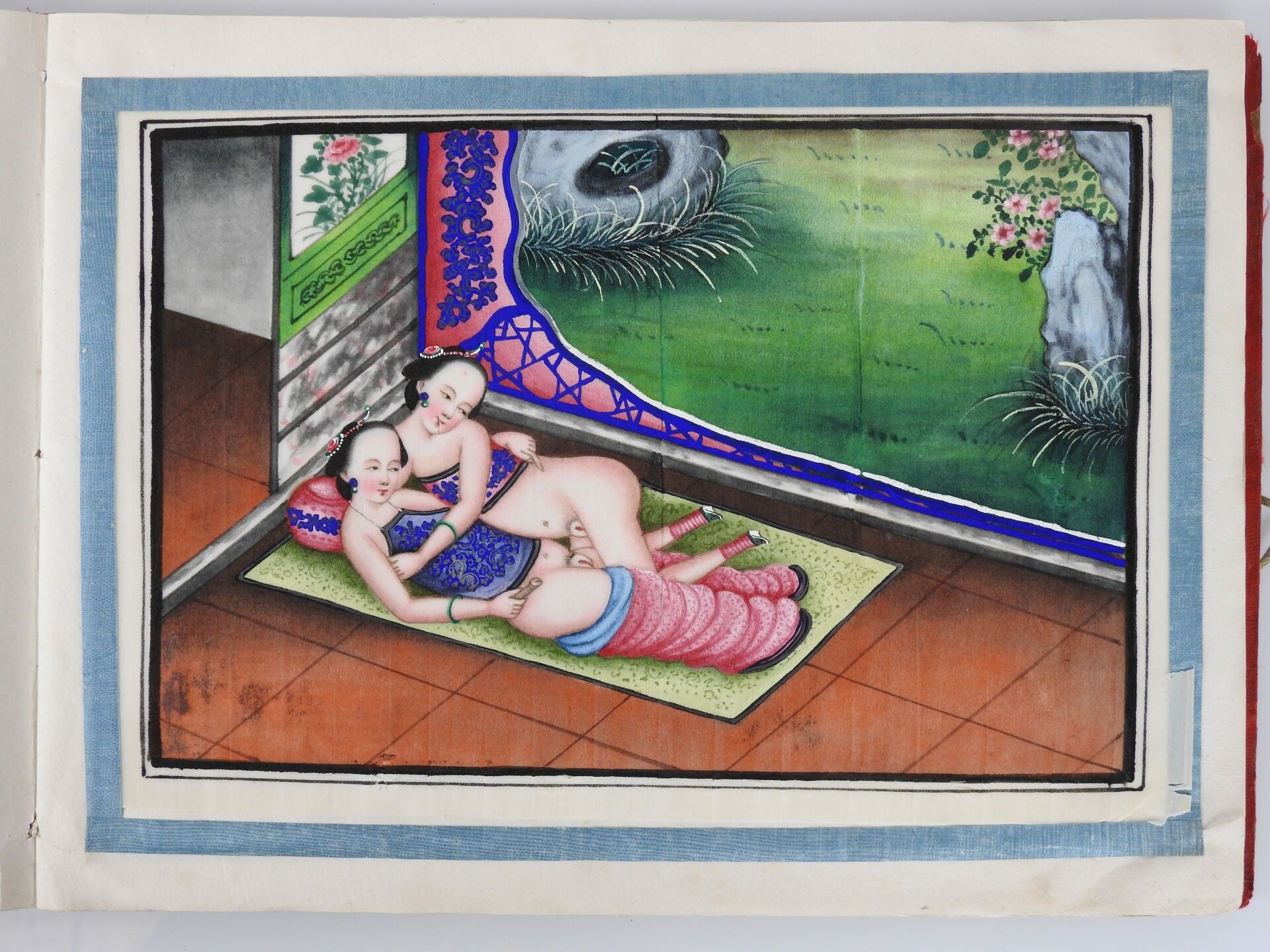 CANTON: Album containing twelve gouaches on paper depicting erotic scenes. Late 19th century. Size (photos): 23 x 15 cm. Size (Italian format): 21 x 29 cm