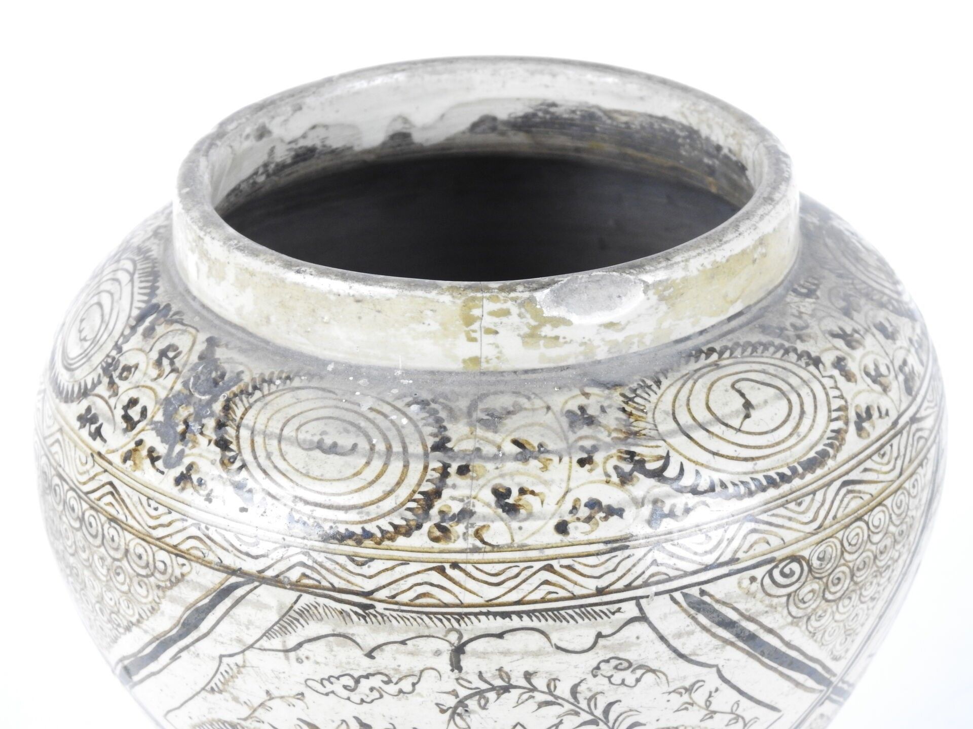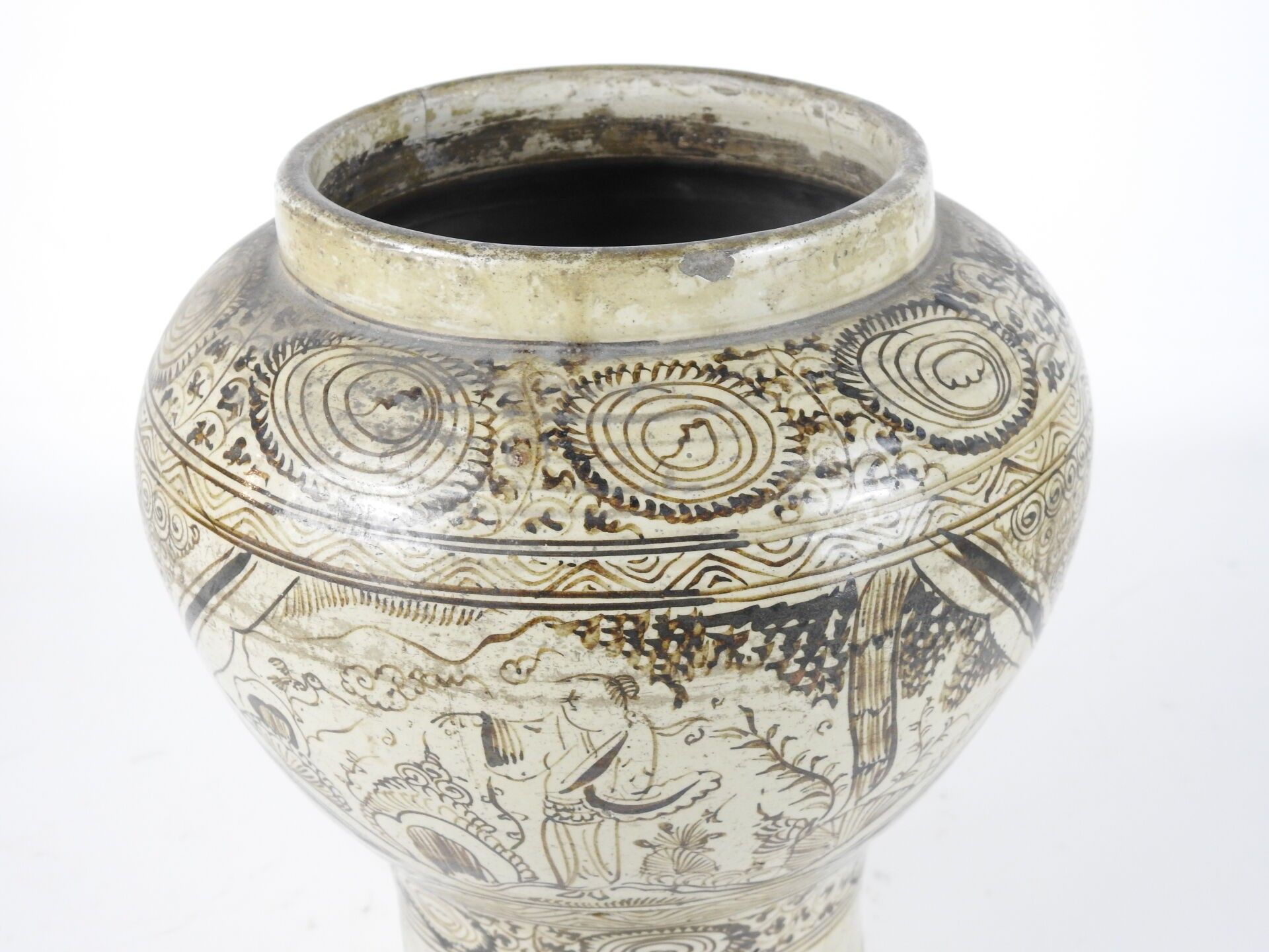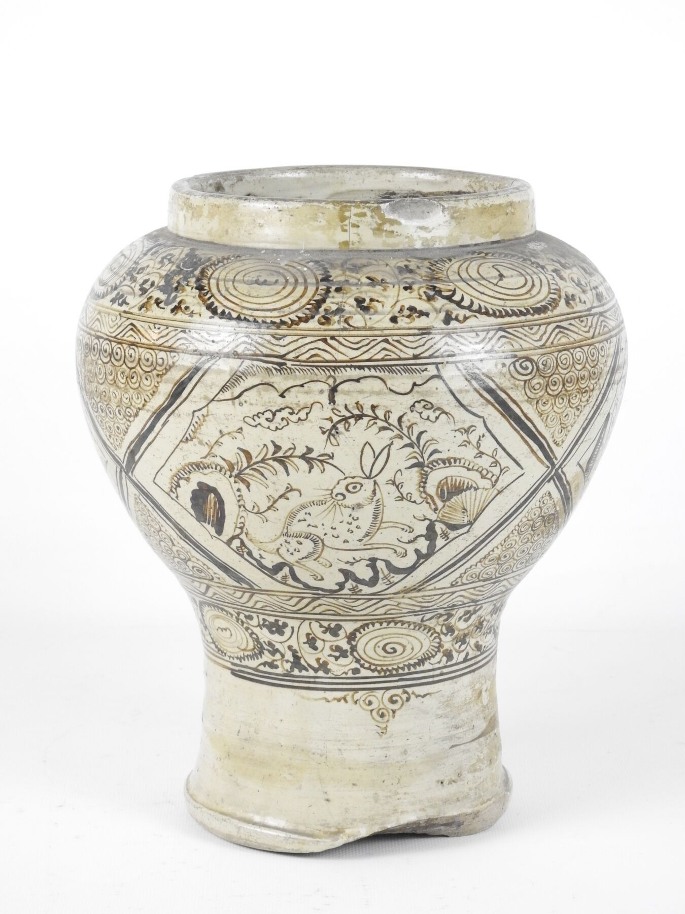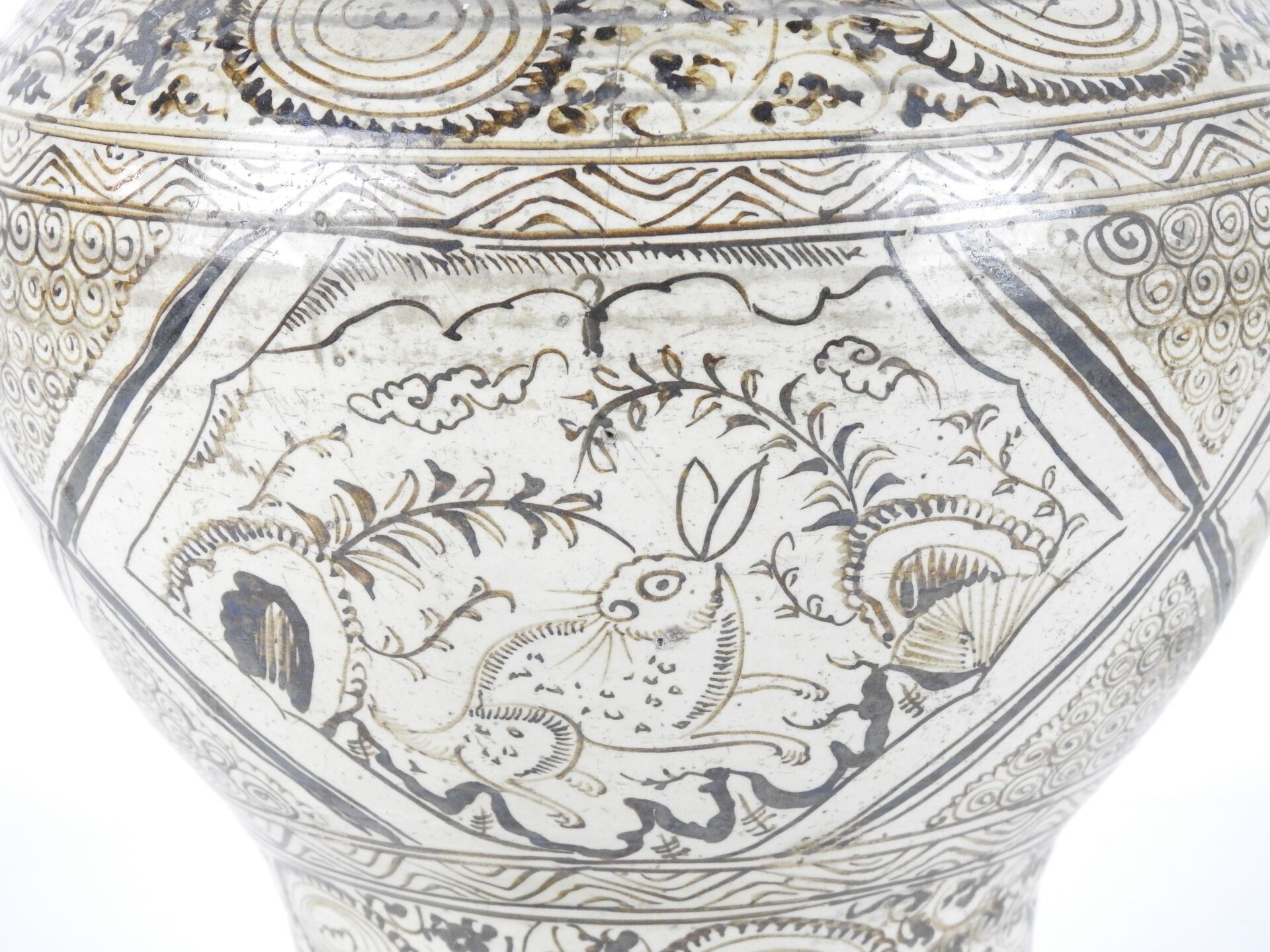 A Cizhou stoneware vase of Meiping form, the body decorated in black slip on a cream ground with rabbits, birds and human figures in four-lobed reserves standing out against a background of dense swirls.